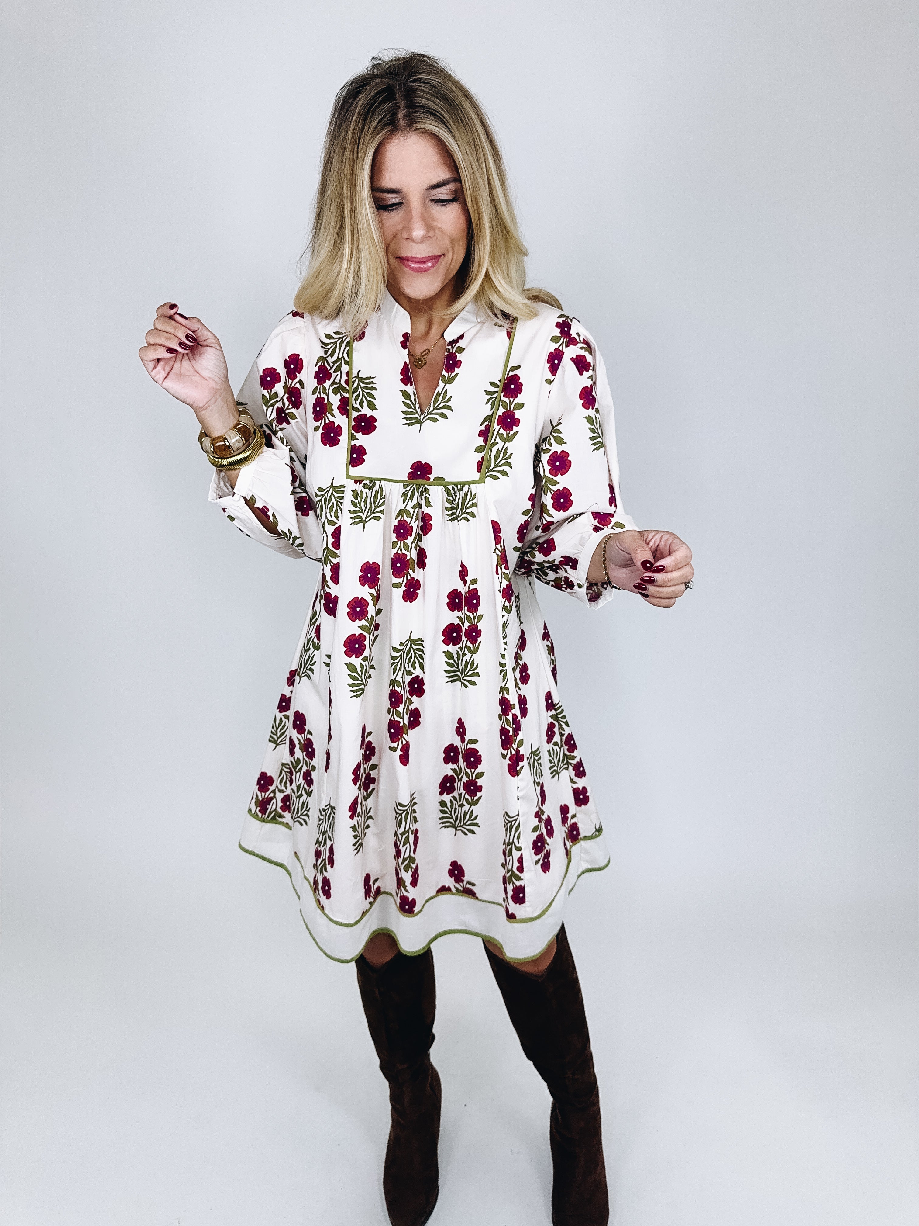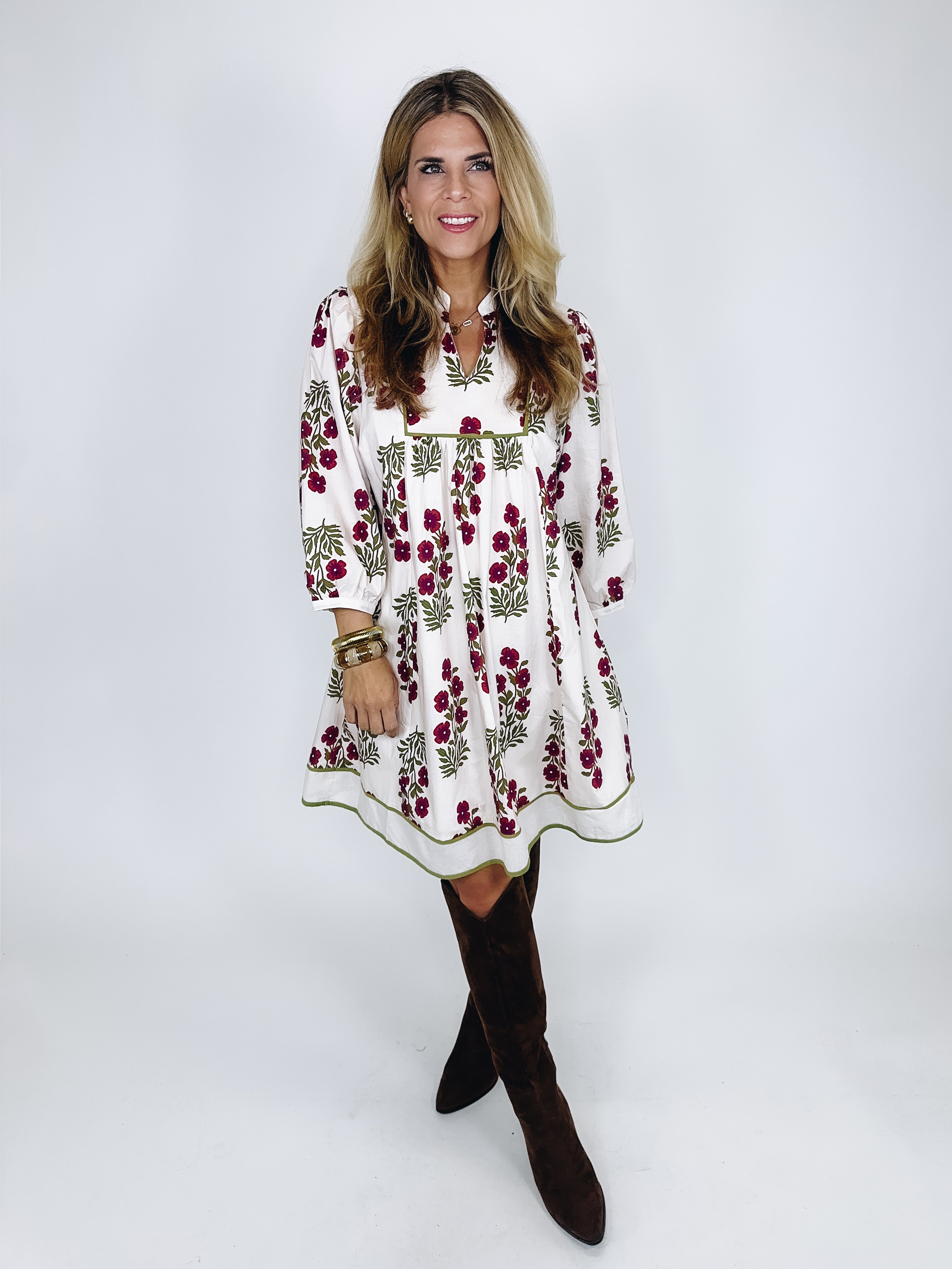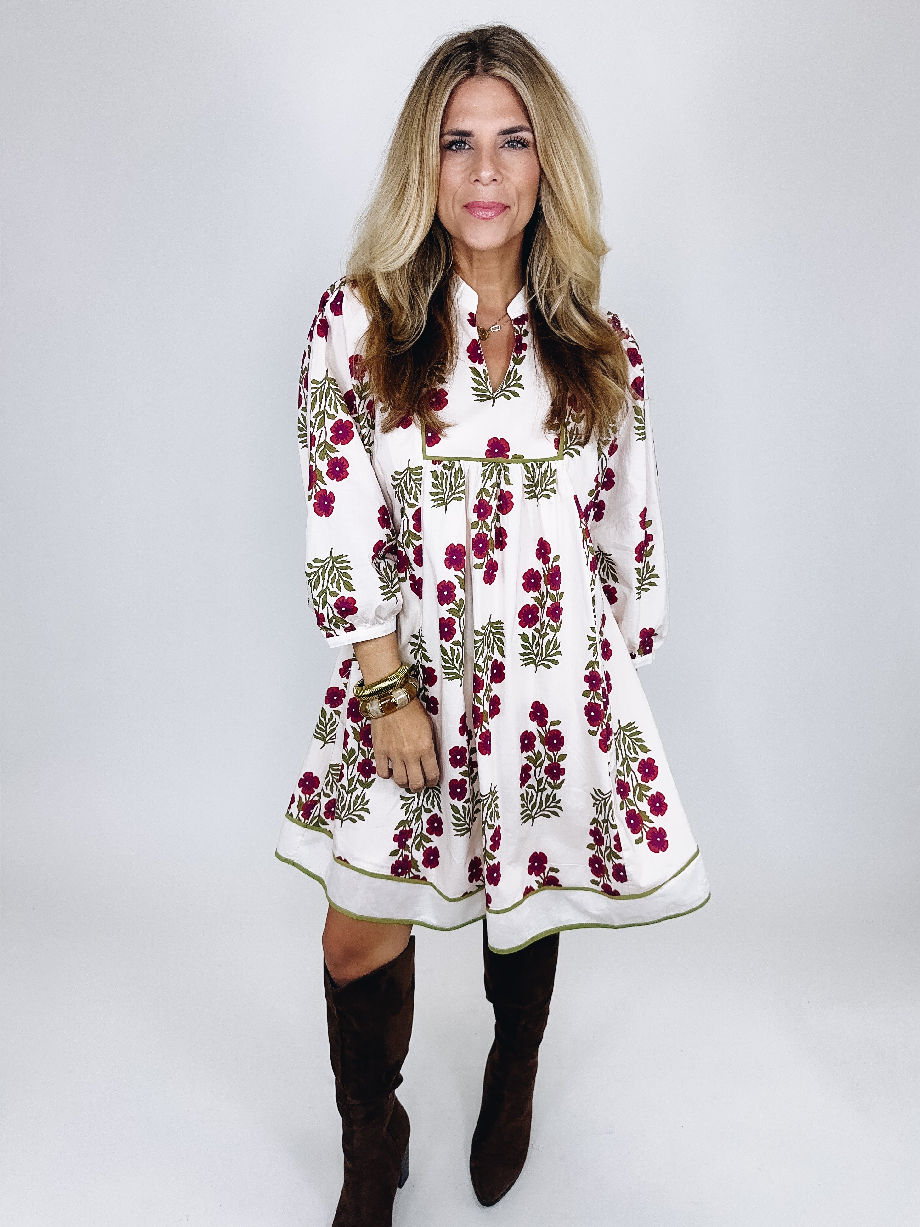 The Lainey Dress is a darling mini dress. This cream dress features a fun burgundy floral print with sage green trim,3/4 sleeves and a flowy hem. Style with flats, heels, wedges, boots, sandals and even sneakers! Dress up or down. Lined. Fits true to size.