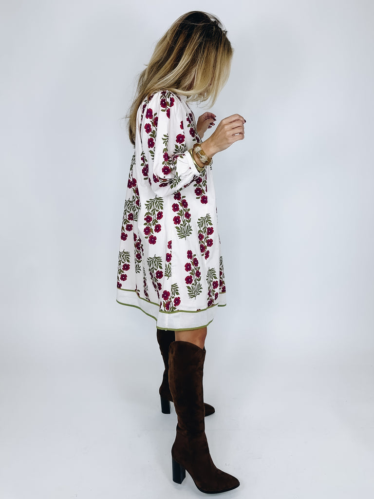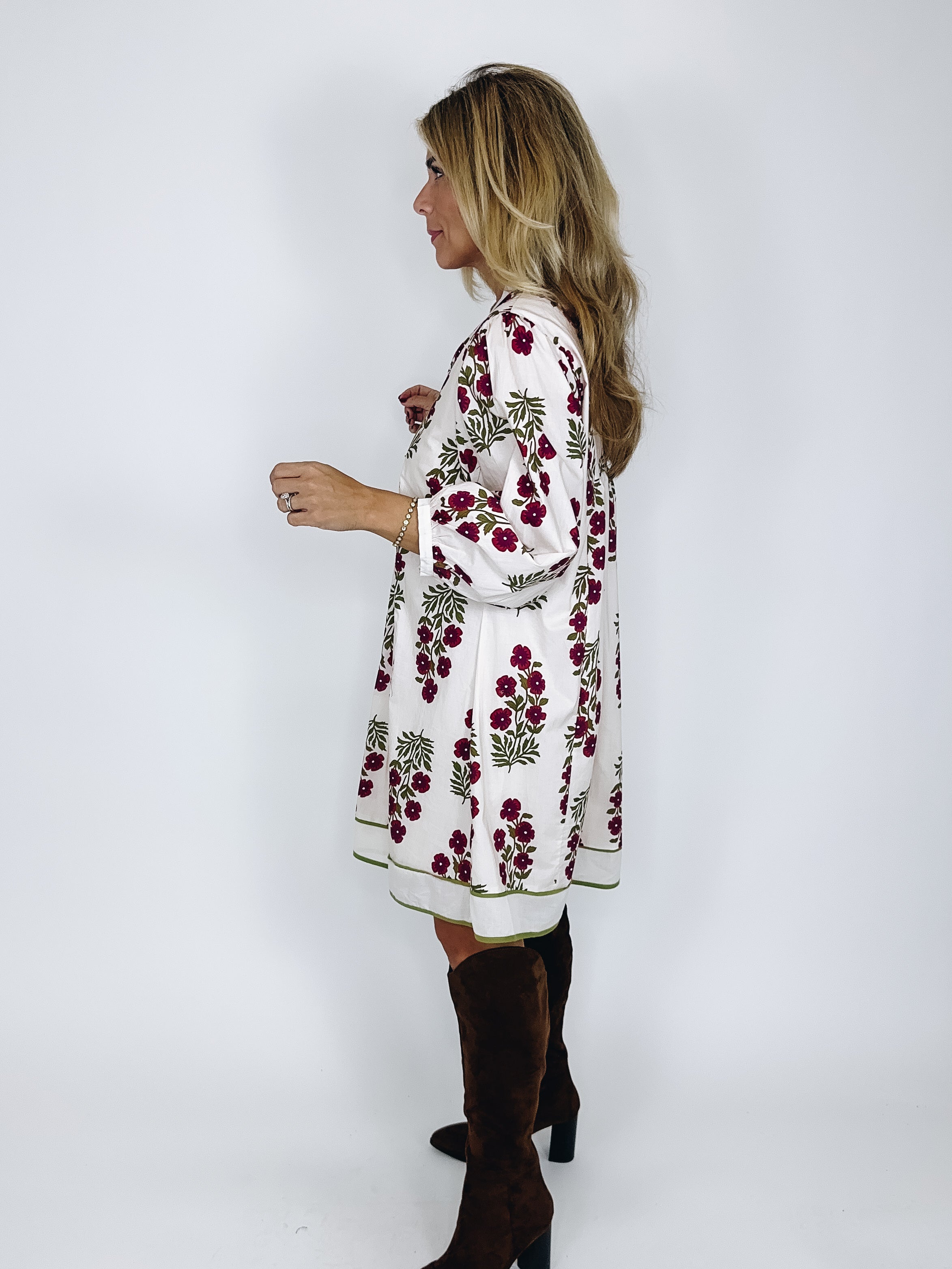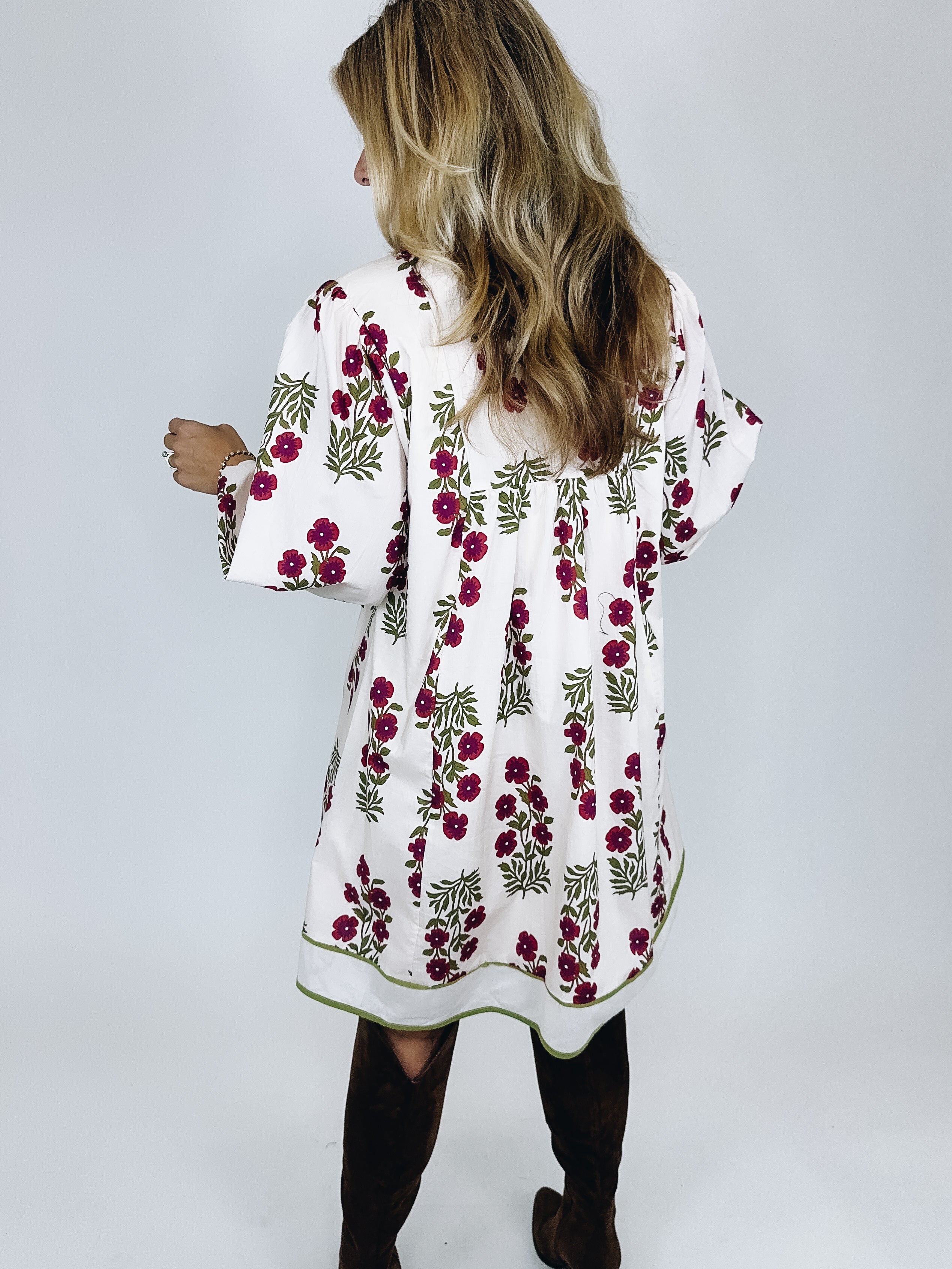 The Lainey Dress is a darling mini dress. This cream dress features a fun burgundy floral print with sage green trim,3/4 sleeves and a flowy hem. Style with flats, heels, wedges, boots, sandals and even sneakers! Dress up or down. Lined. Fits true to size.