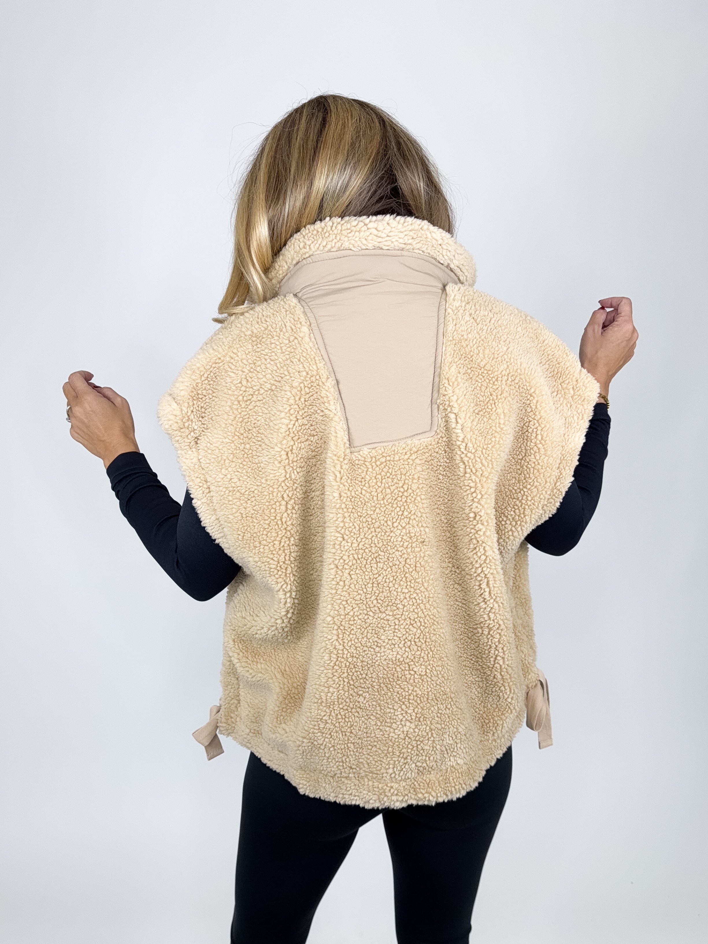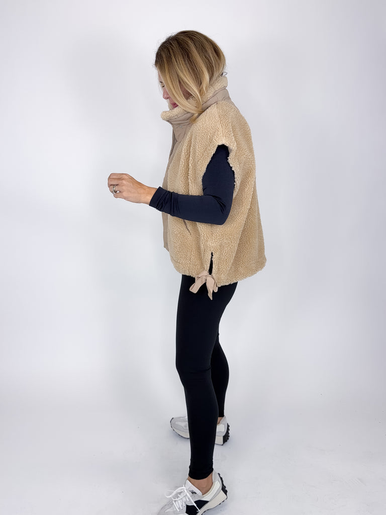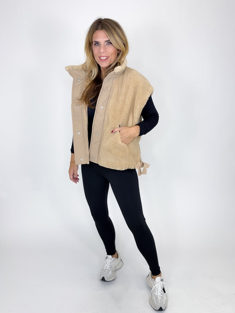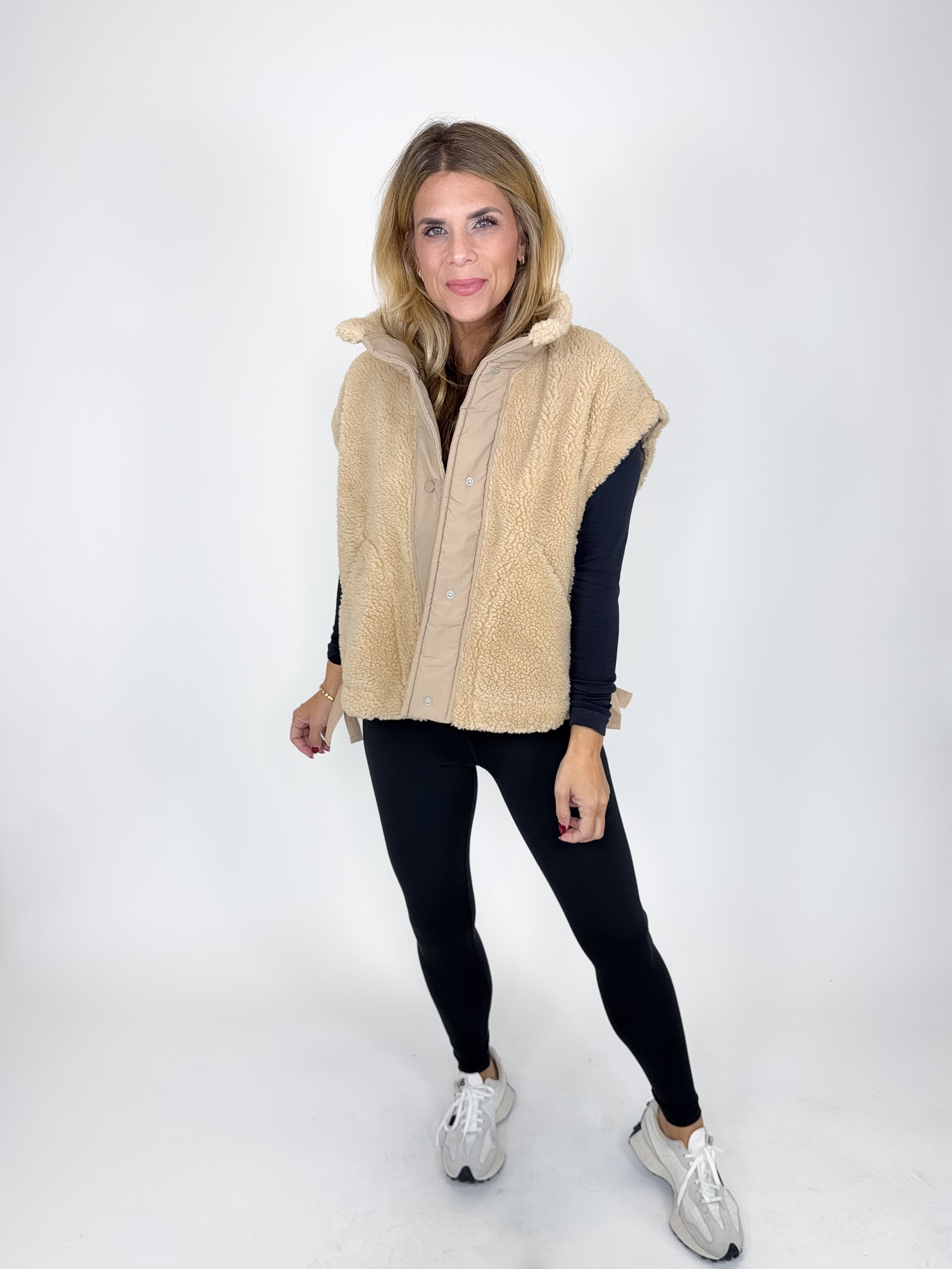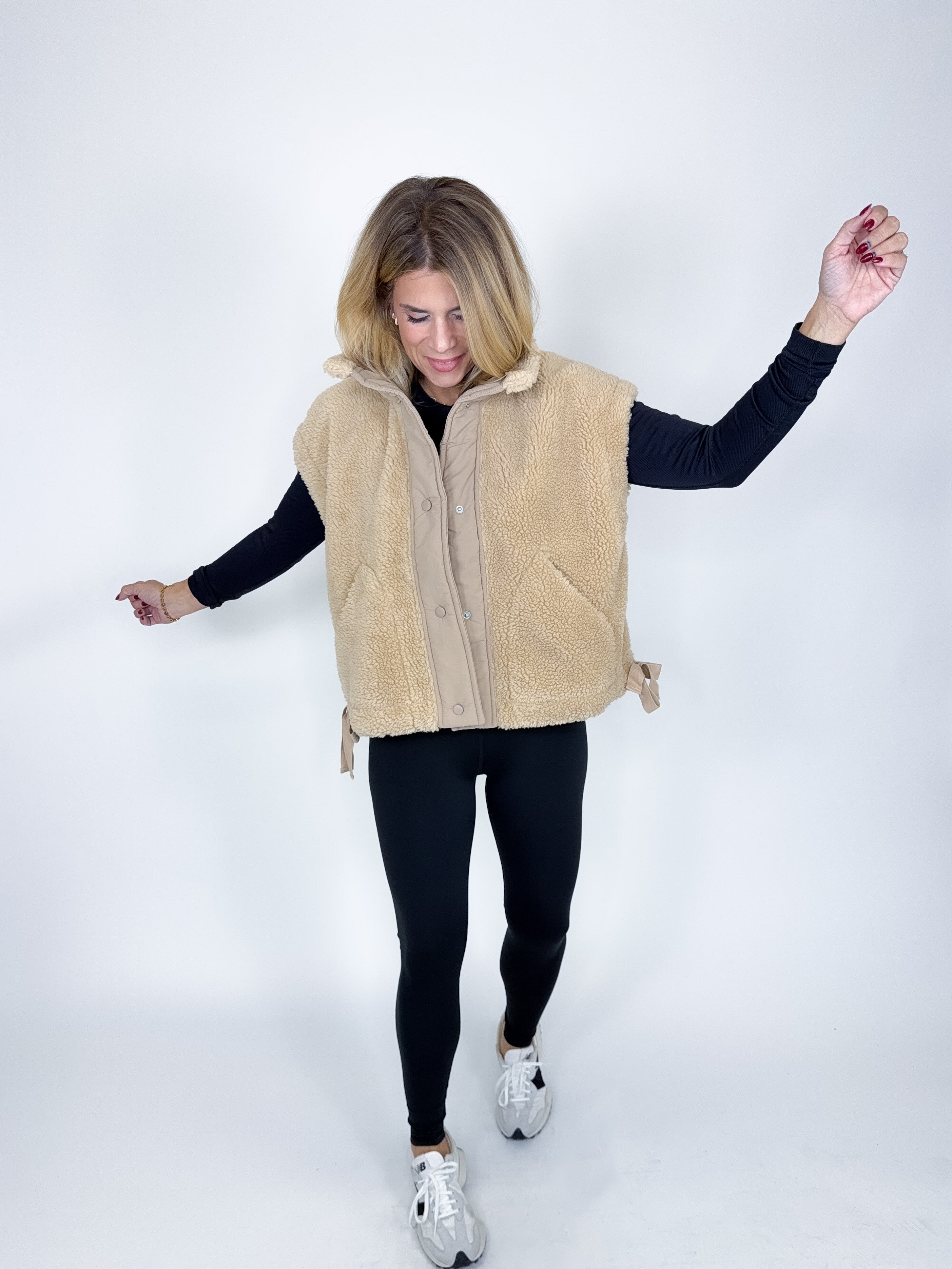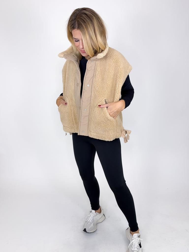 The Lawson Vest is such a fun top layer! This lightweight beige sherpa vest features a button front, collar, relaxed fit and pockets! Pairs well with denim, athleisure, sneakers, flats, boots and more! Fits true to size.