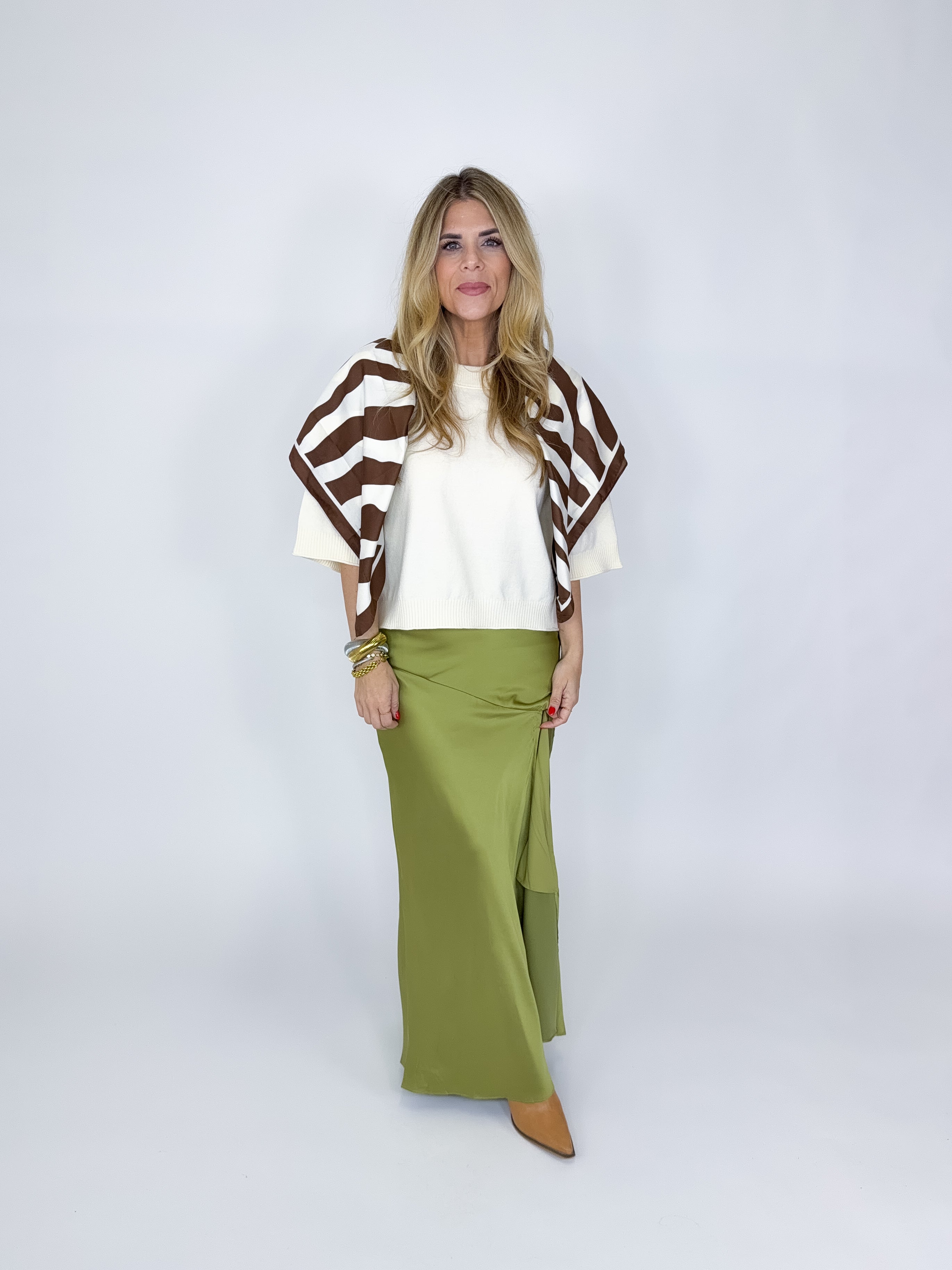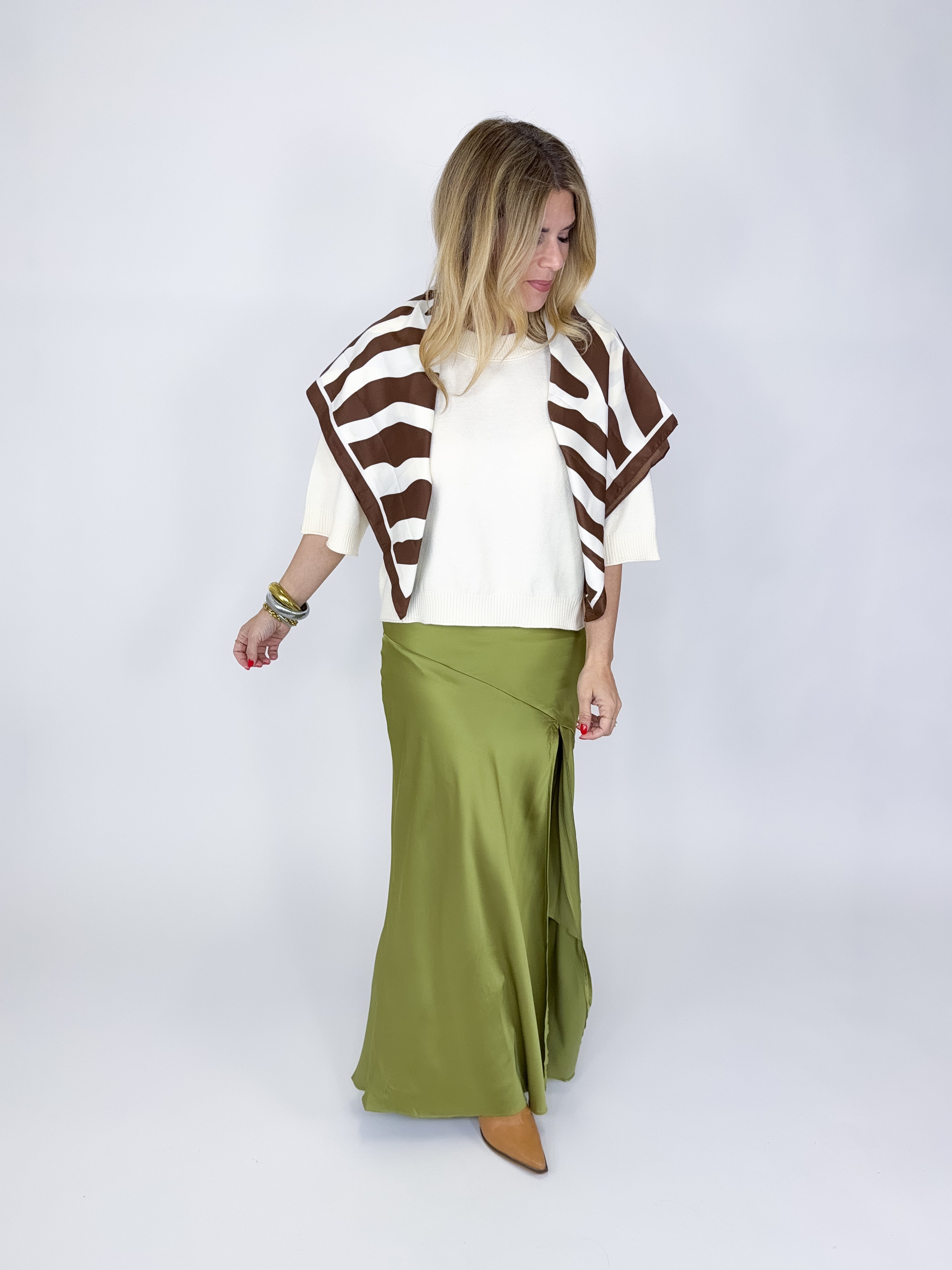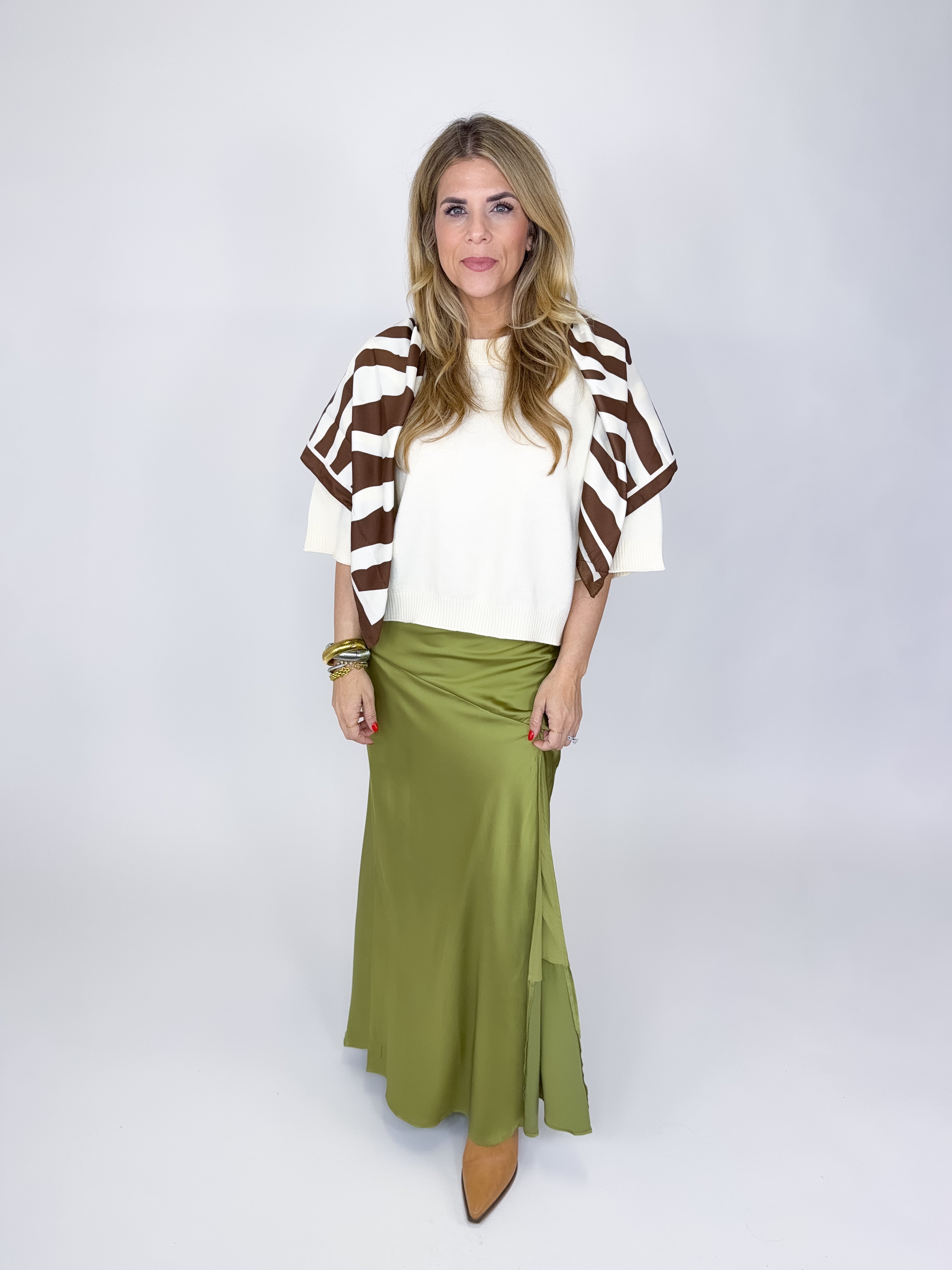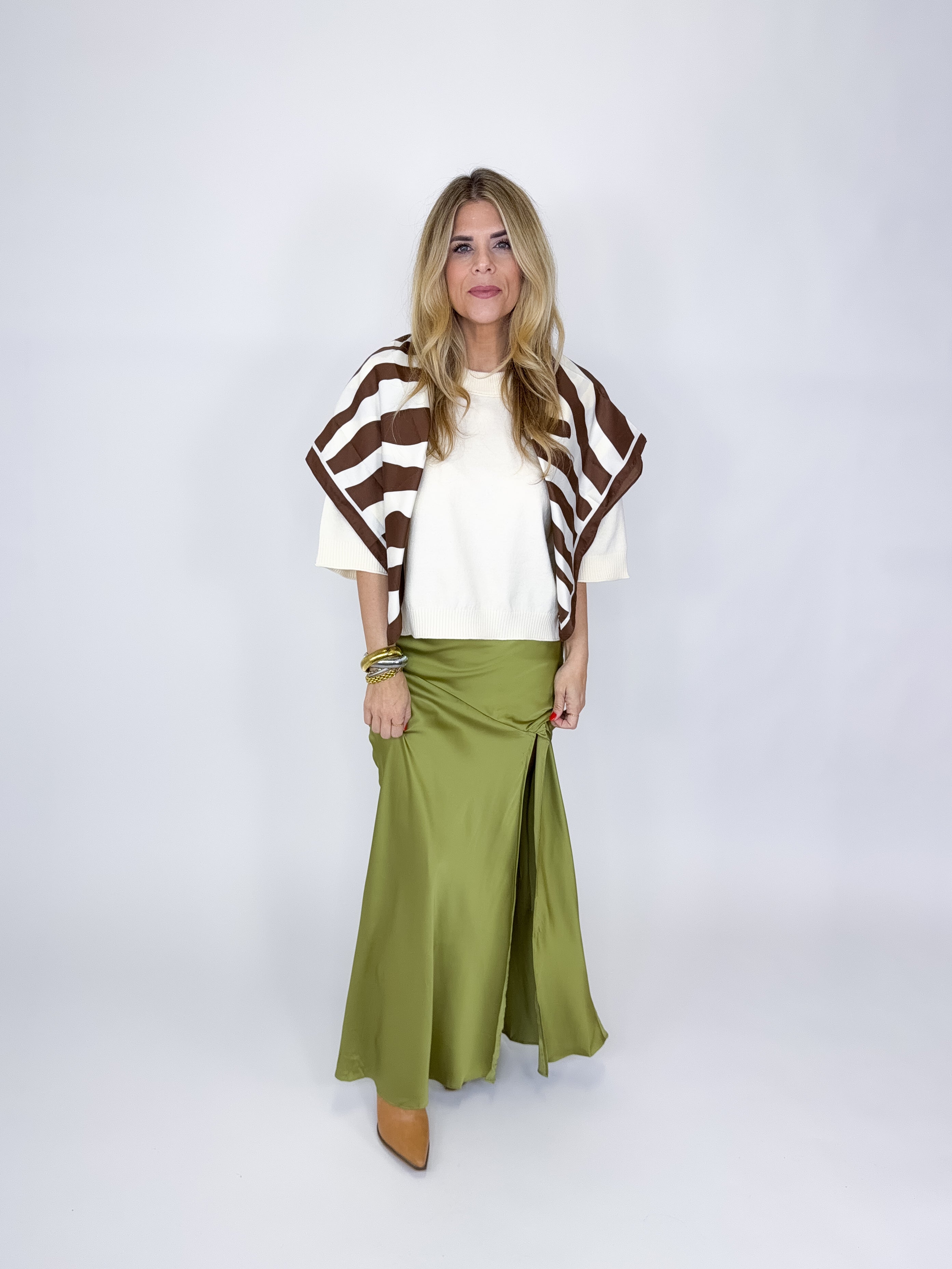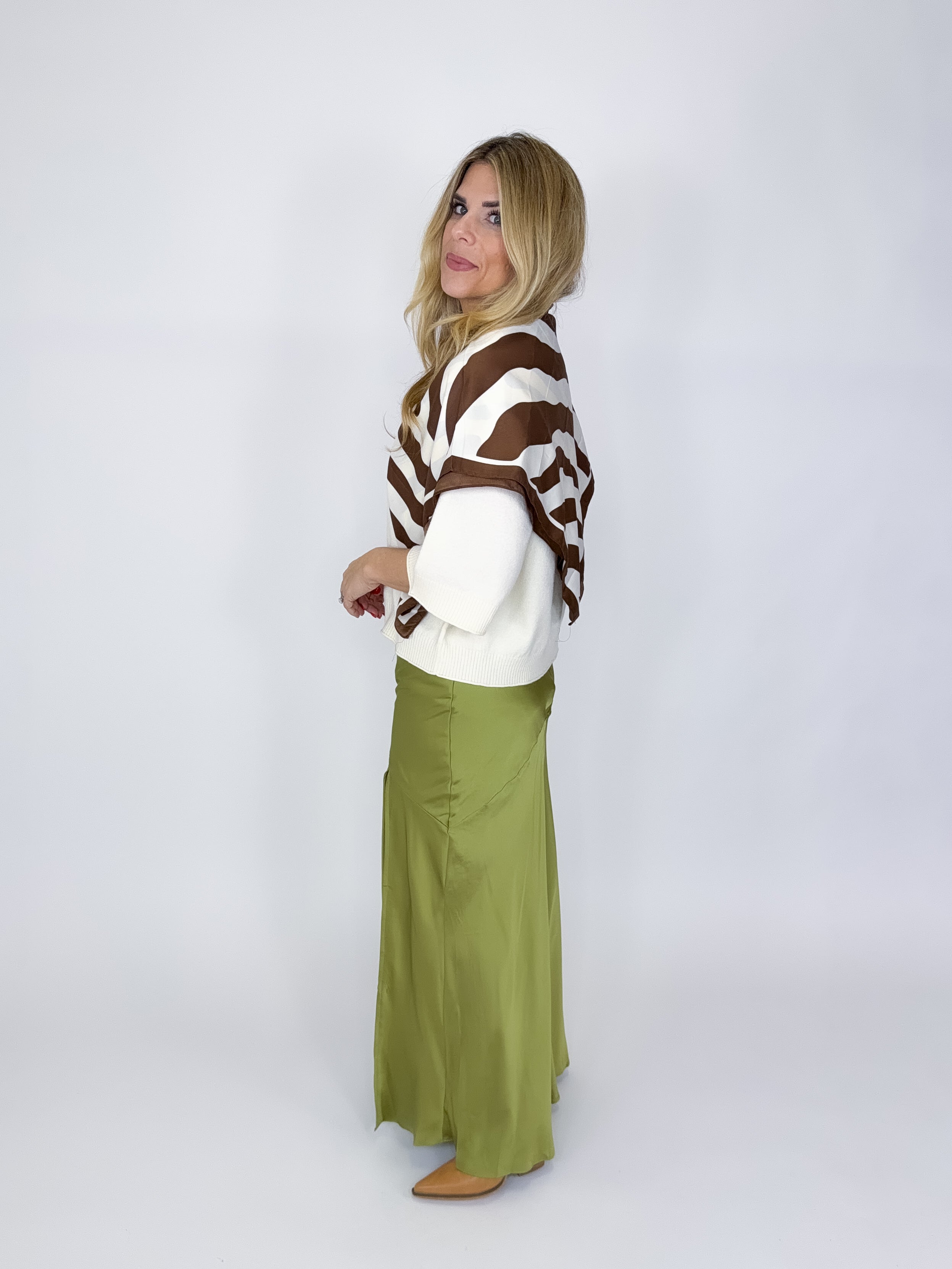The Leah Skirt is a beautiful green satin slip maxi skirt. It features a high elastic waist, asymmetrical seam, side slit and back zipper. Lined. Dress it up or down. Style with blouses, tees, heels and sandals. Fits true to size.