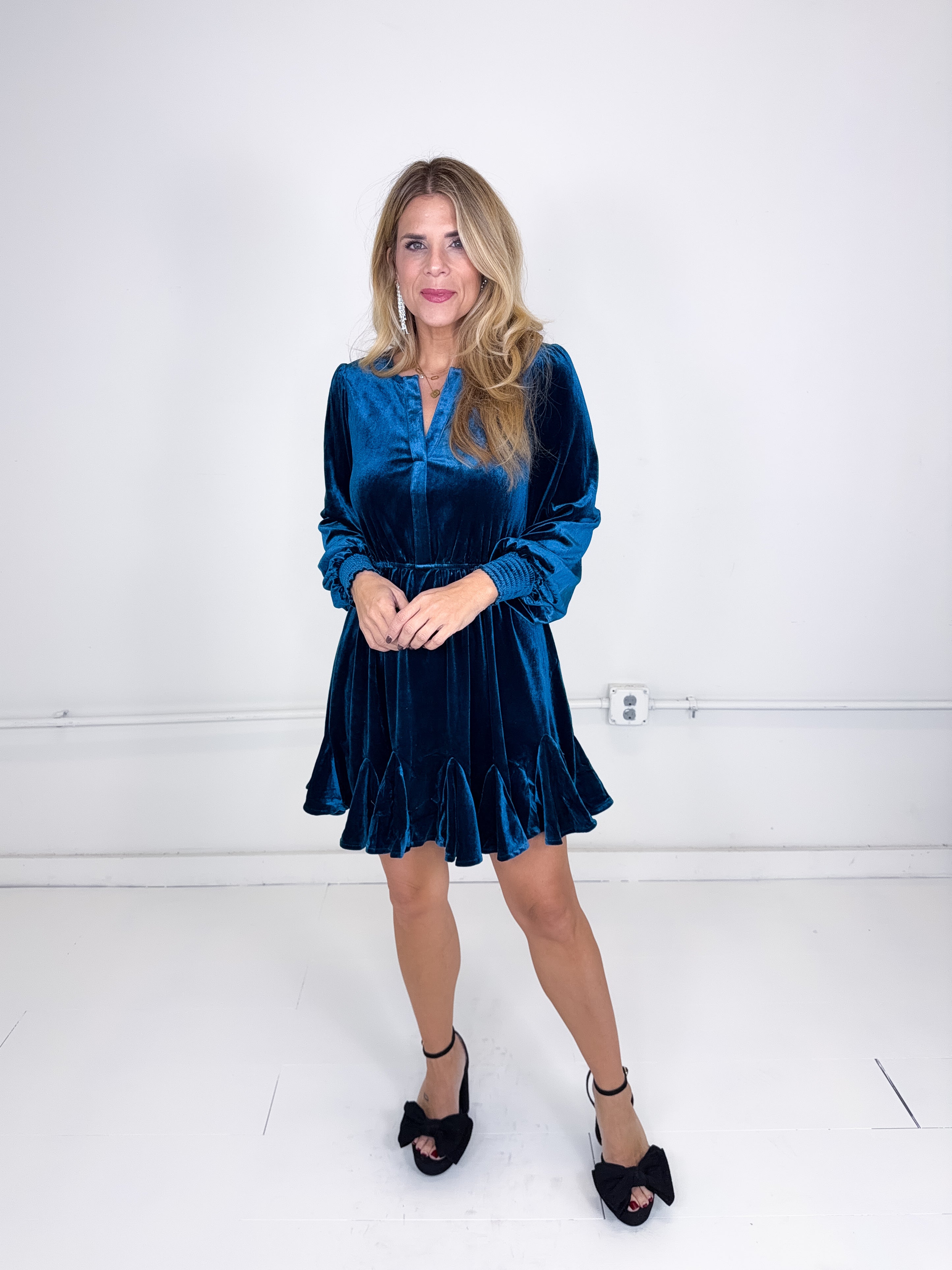 The Lennon Dress is darling! This dark teal velvet mini dress features a v neck, long balloon sleeves with a cuff, elastic waist and a ruffle skirt. Lined. This one feels so luxe! Style with flats or heels. Fits true to size.