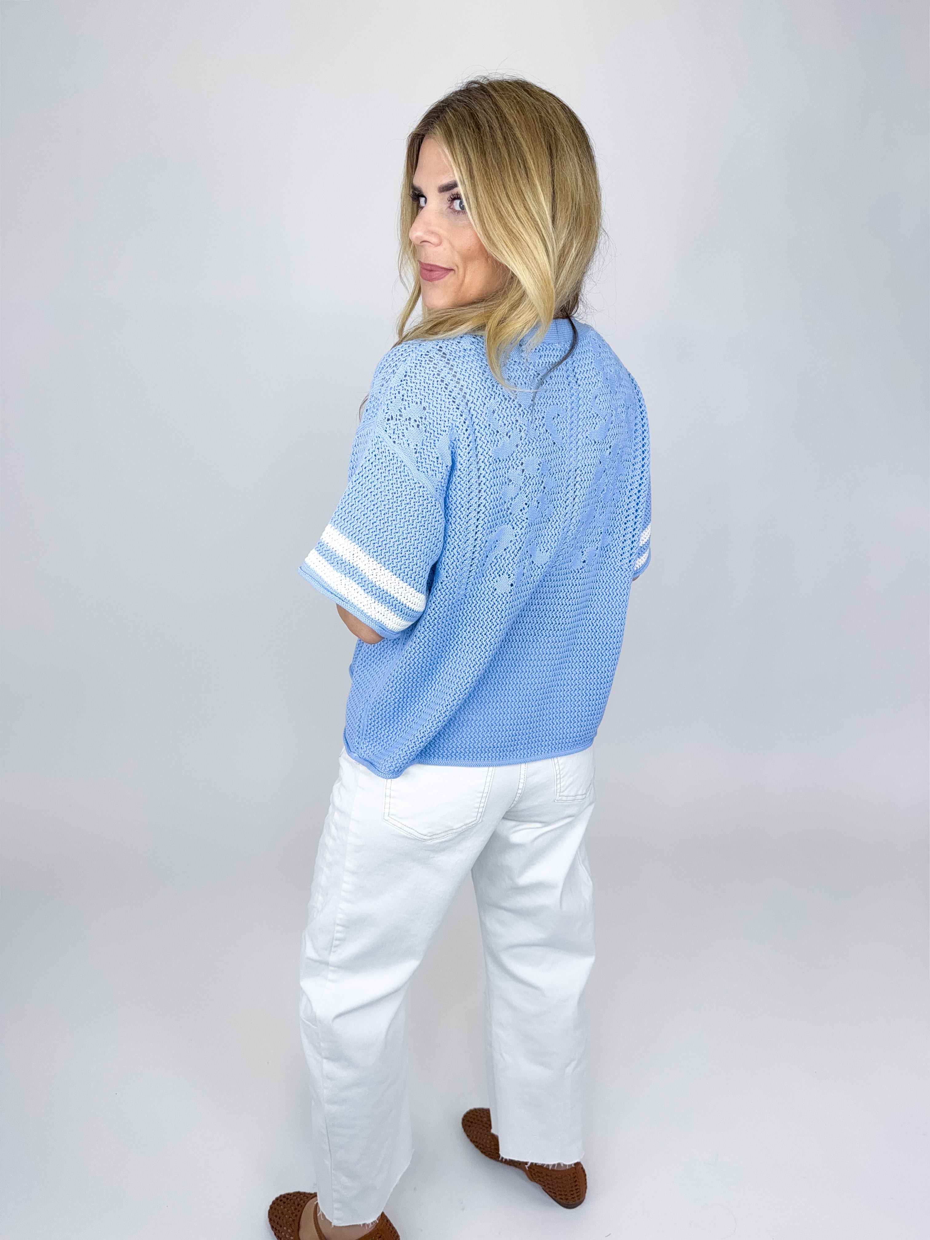 The Lila Top is an absolute must in every closet! This light blue knit top features a v-neck with a contrast stripe trim, short drop shoulder sleeves and a floral crochet pattern. Pairs well with everything from denim, flats, heels, skirts, sneakers, shorts and more!