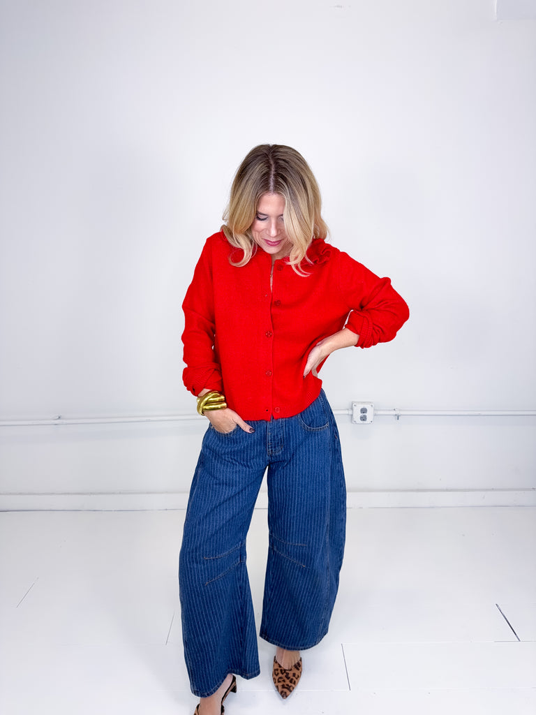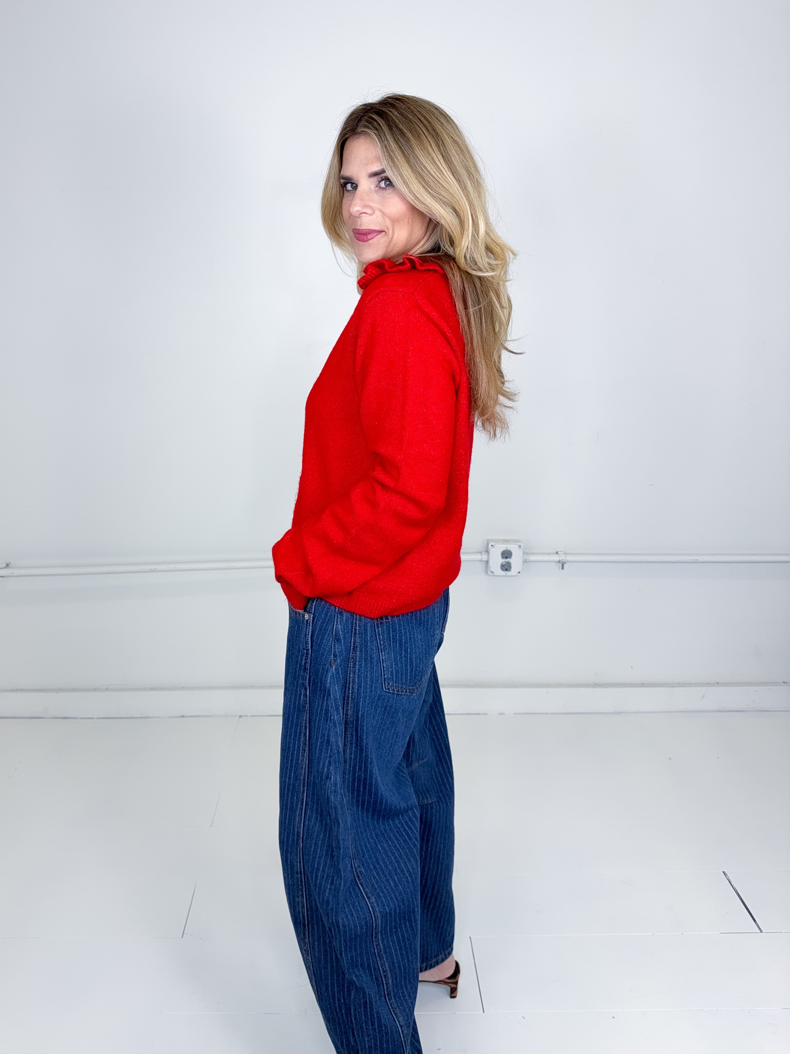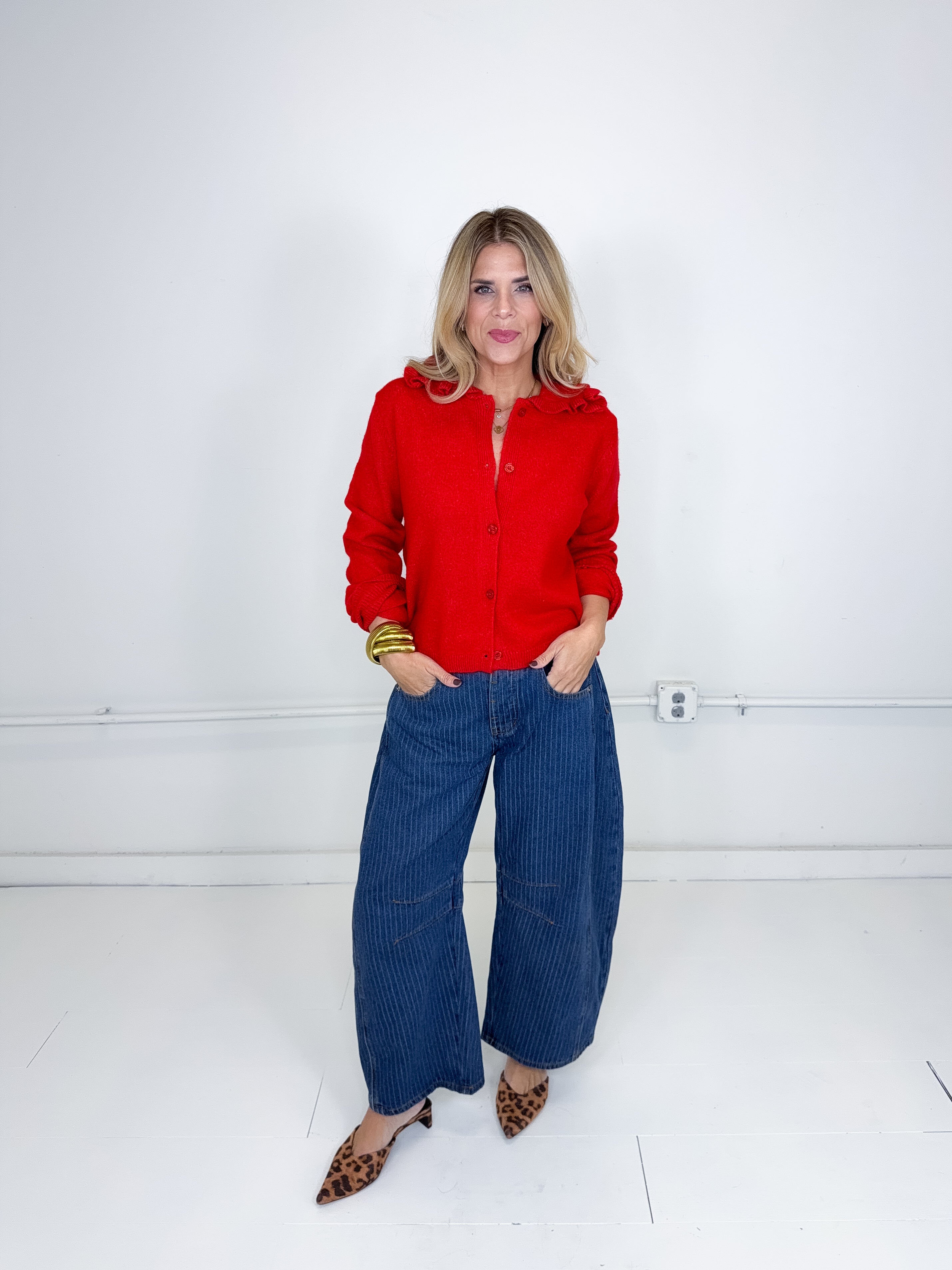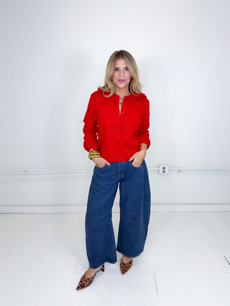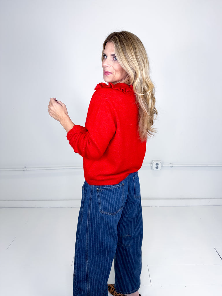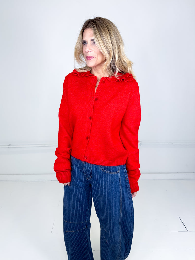 The Meri Cardigan will be the one you reach for over and over! This red knit cardigan features a classic fit, button front and a fun ruffle collar. Pairs well with everything from denim, flats, heels, dress pants, boots and more! Great fit! Fits true to size.