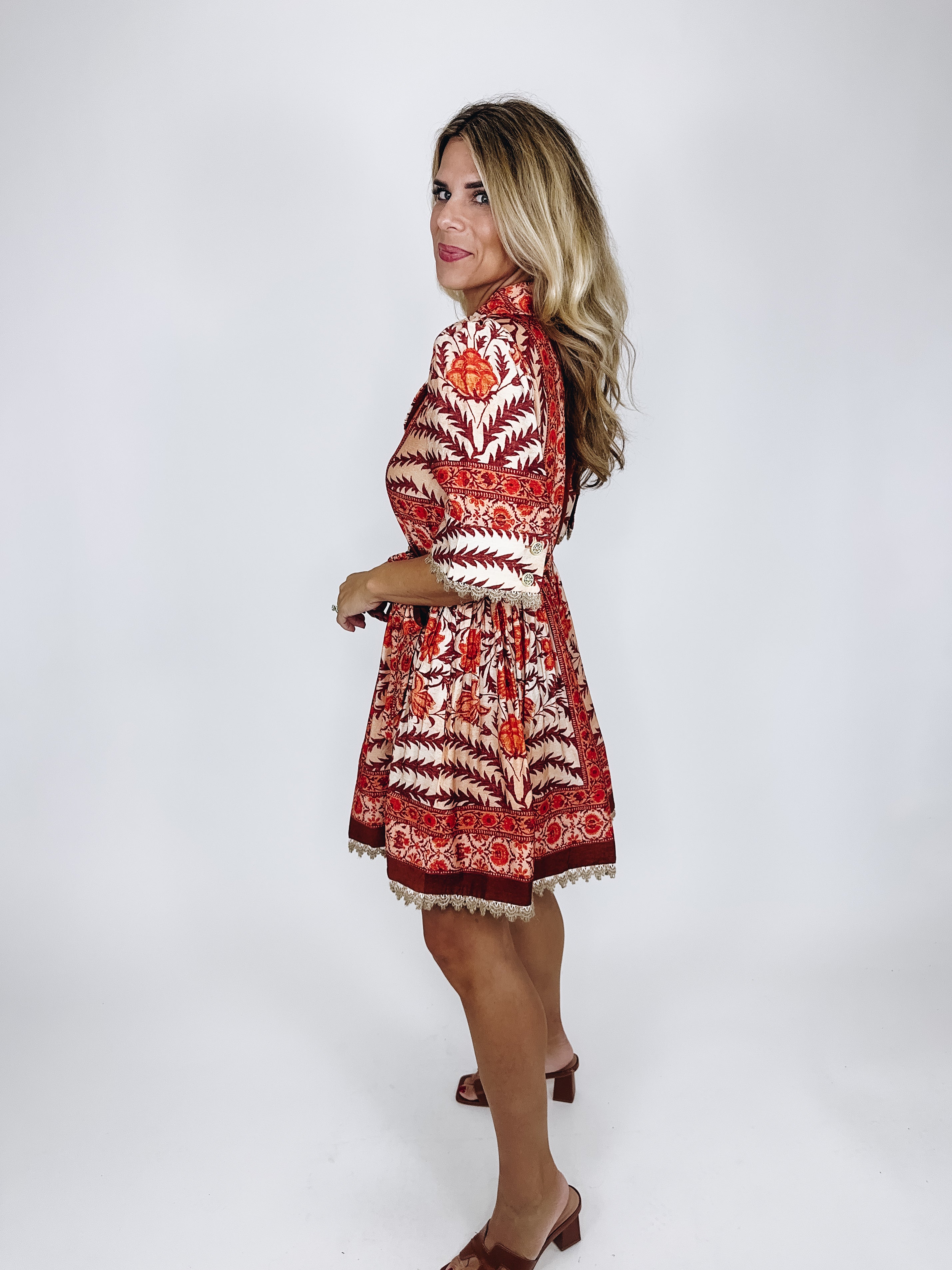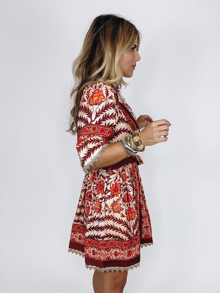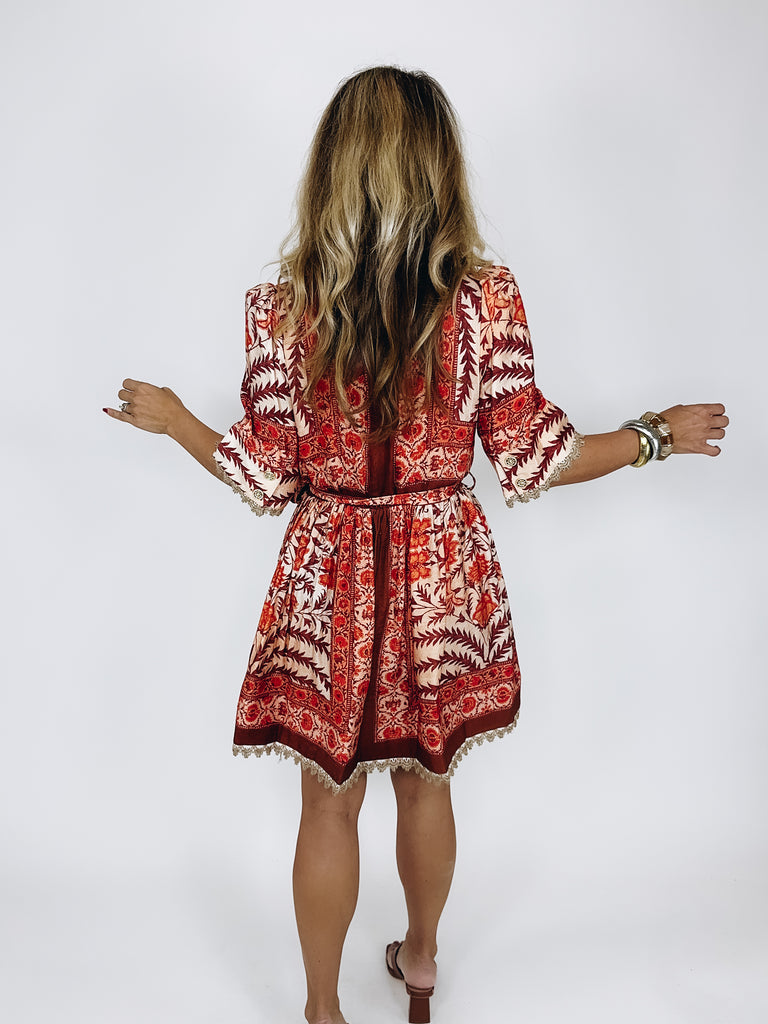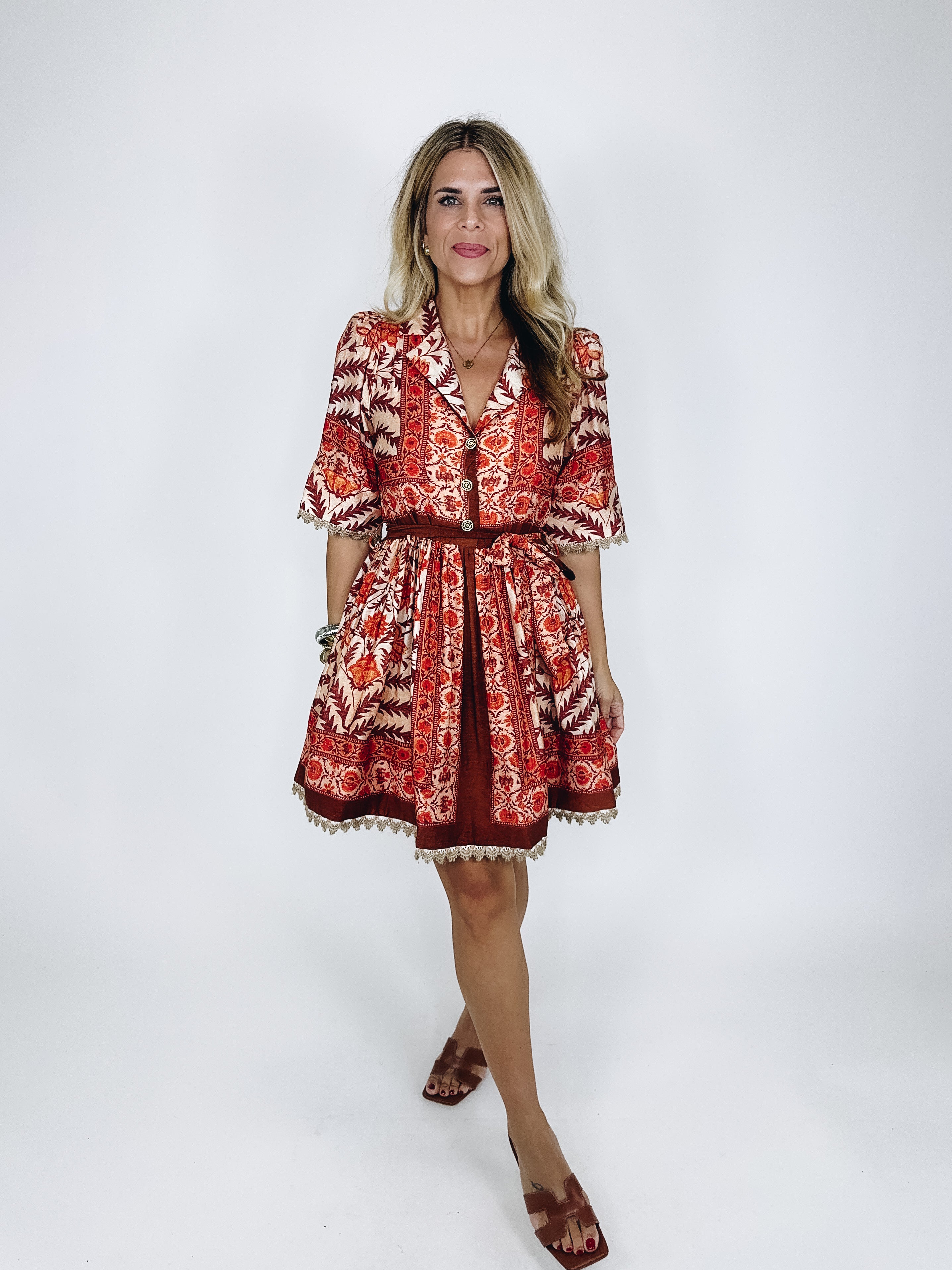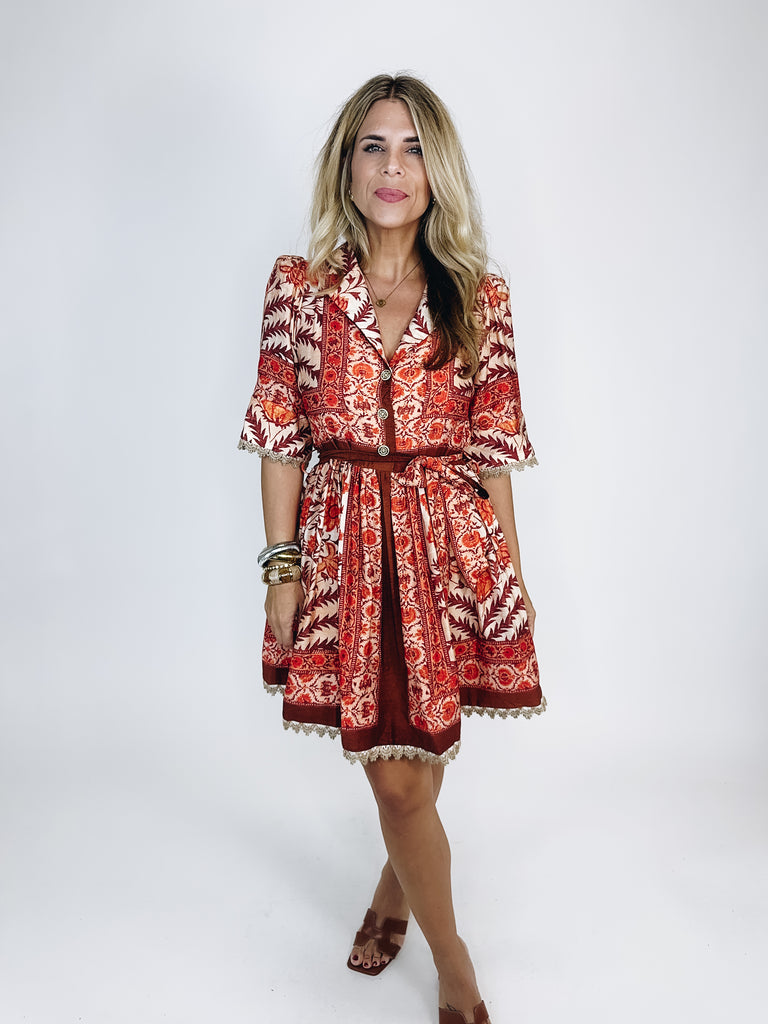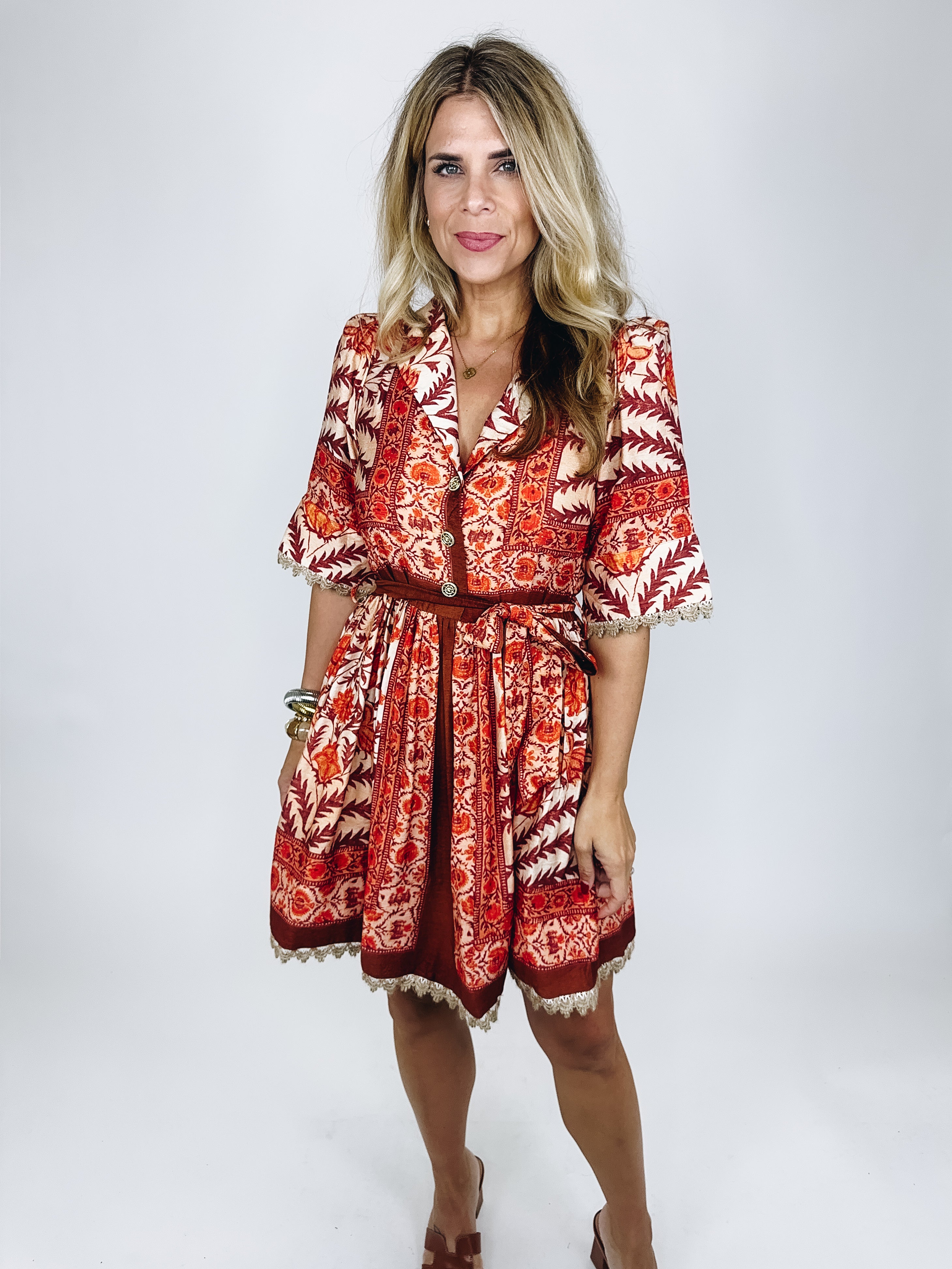 The Morgan Dress is a showstopper! This rust boho print mini dress features button front with a collar, short puff sleeves with a natural lace trim, tie belt and fun flutter skirt with natural lace trim. Pockets. Lined. Style with flats, heels, wedges or sneakers. Fits true to size.