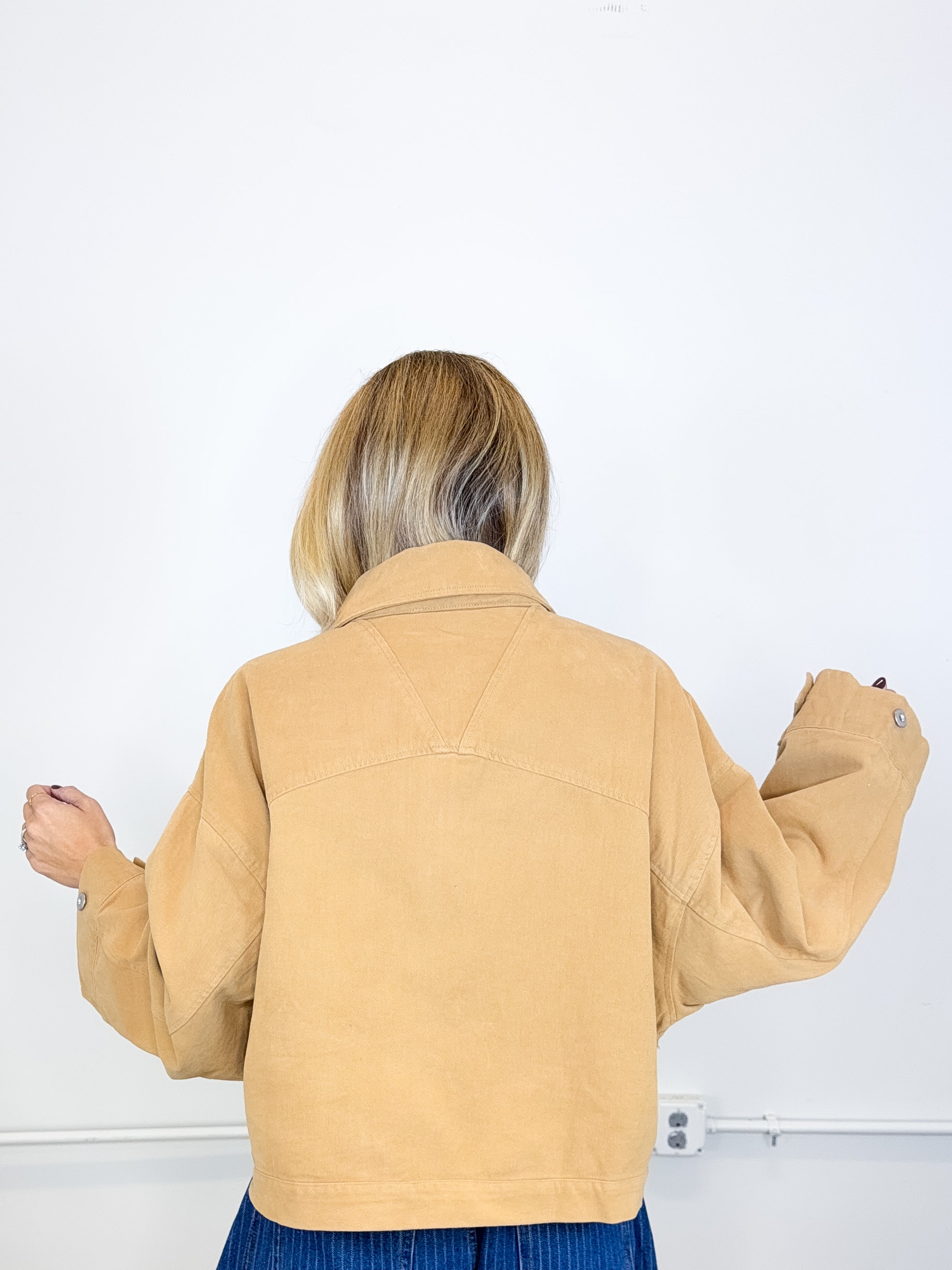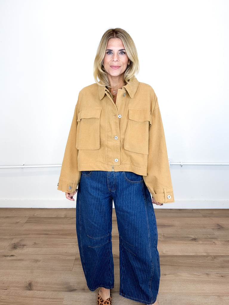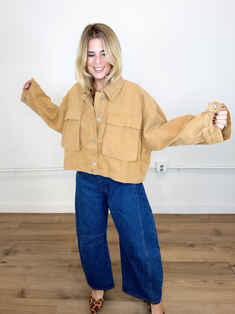 The Nash Jacket is such an everyday fall staple! This camel colored jacket features a brushed twill base with a collar, button front and front cargo style pockets. Pair with pants, dresses, skirts, and more!