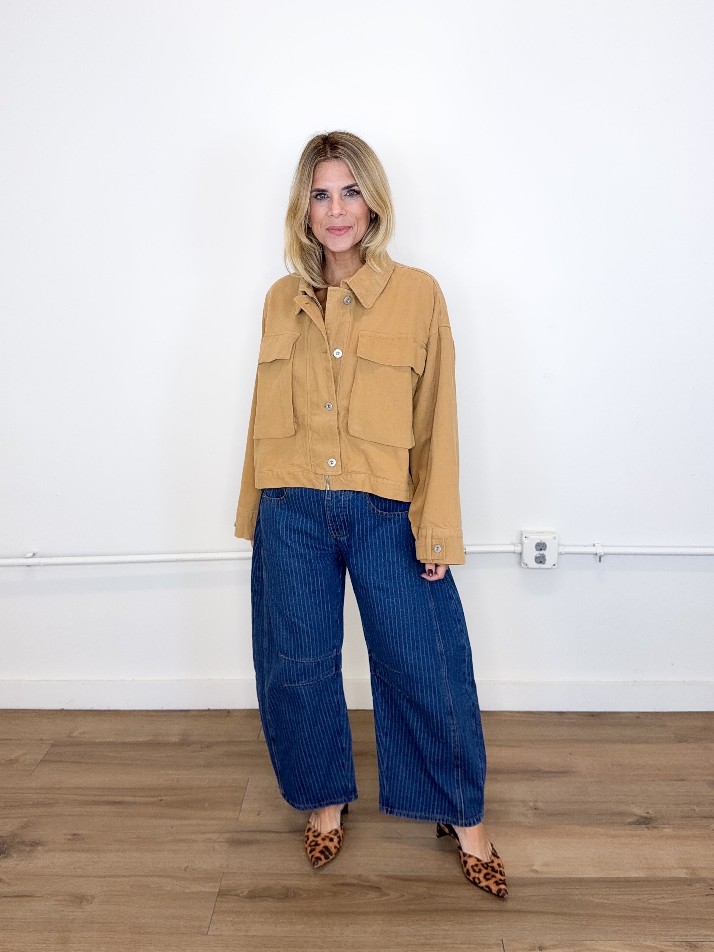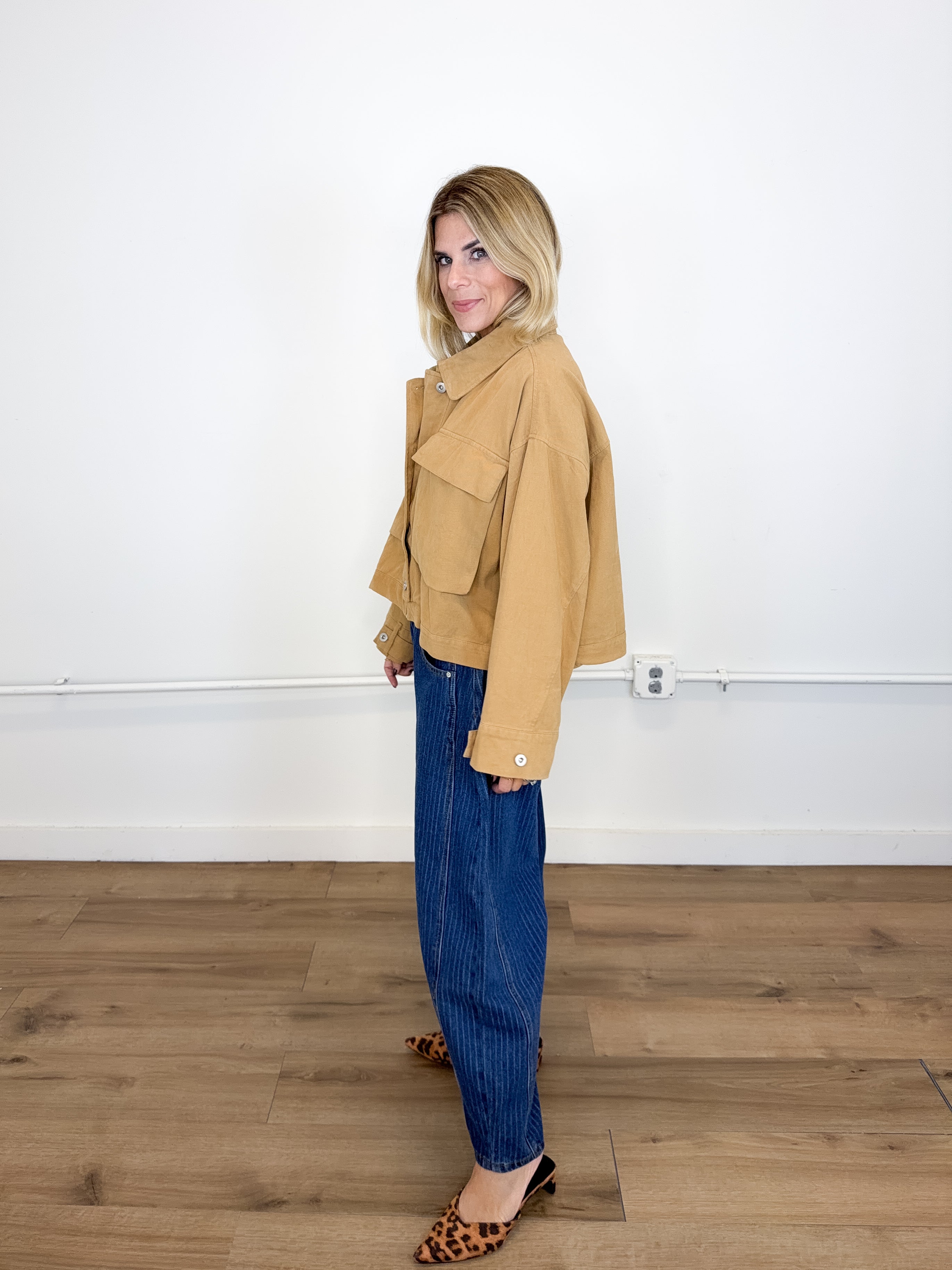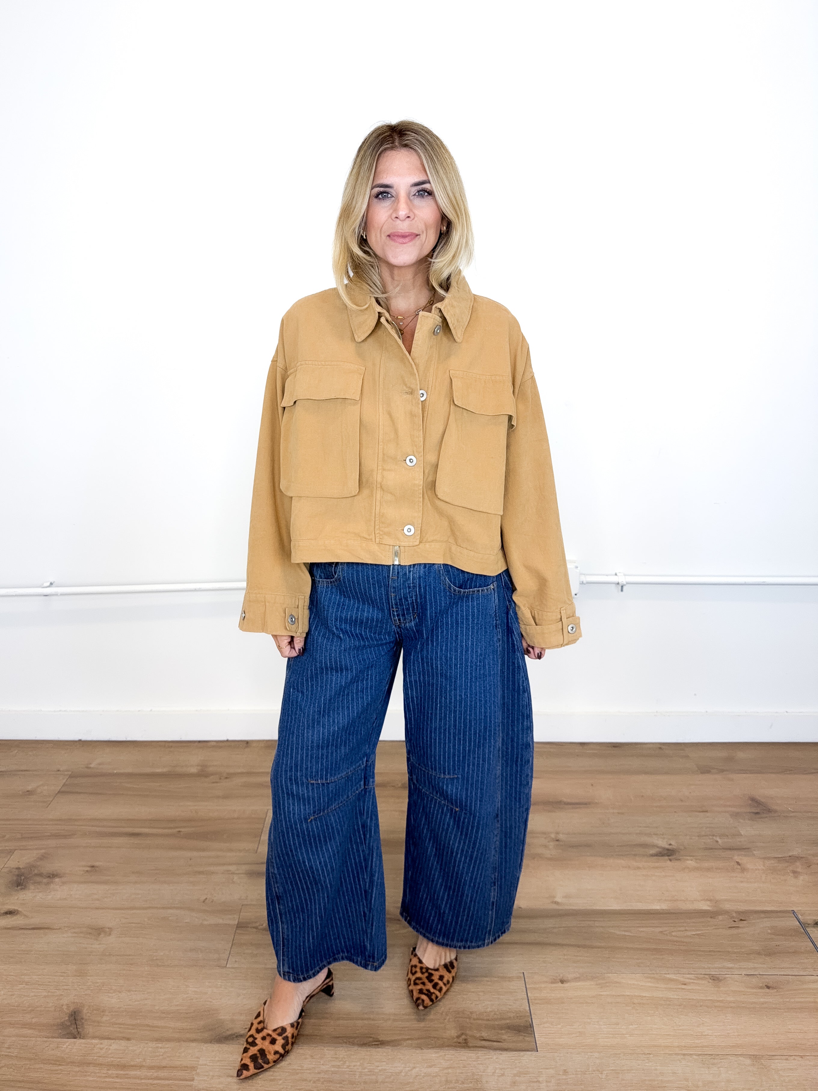 The Nash Jacket is such an everyday fall staple! This camel colored jacket features a brushed twill base with a collar, button front and front cargo style pockets. Pair with pants, dresses, skirts, and more!
