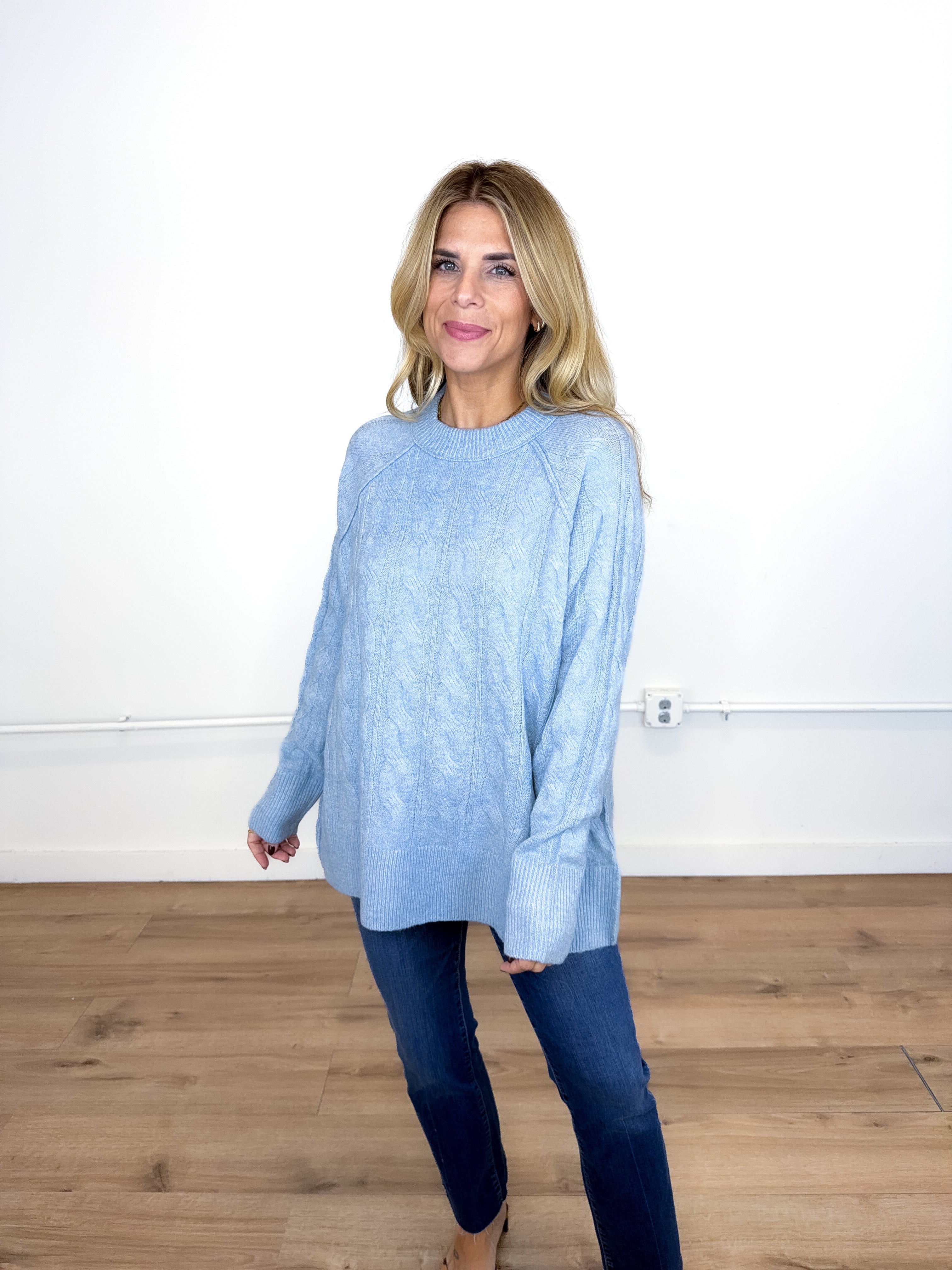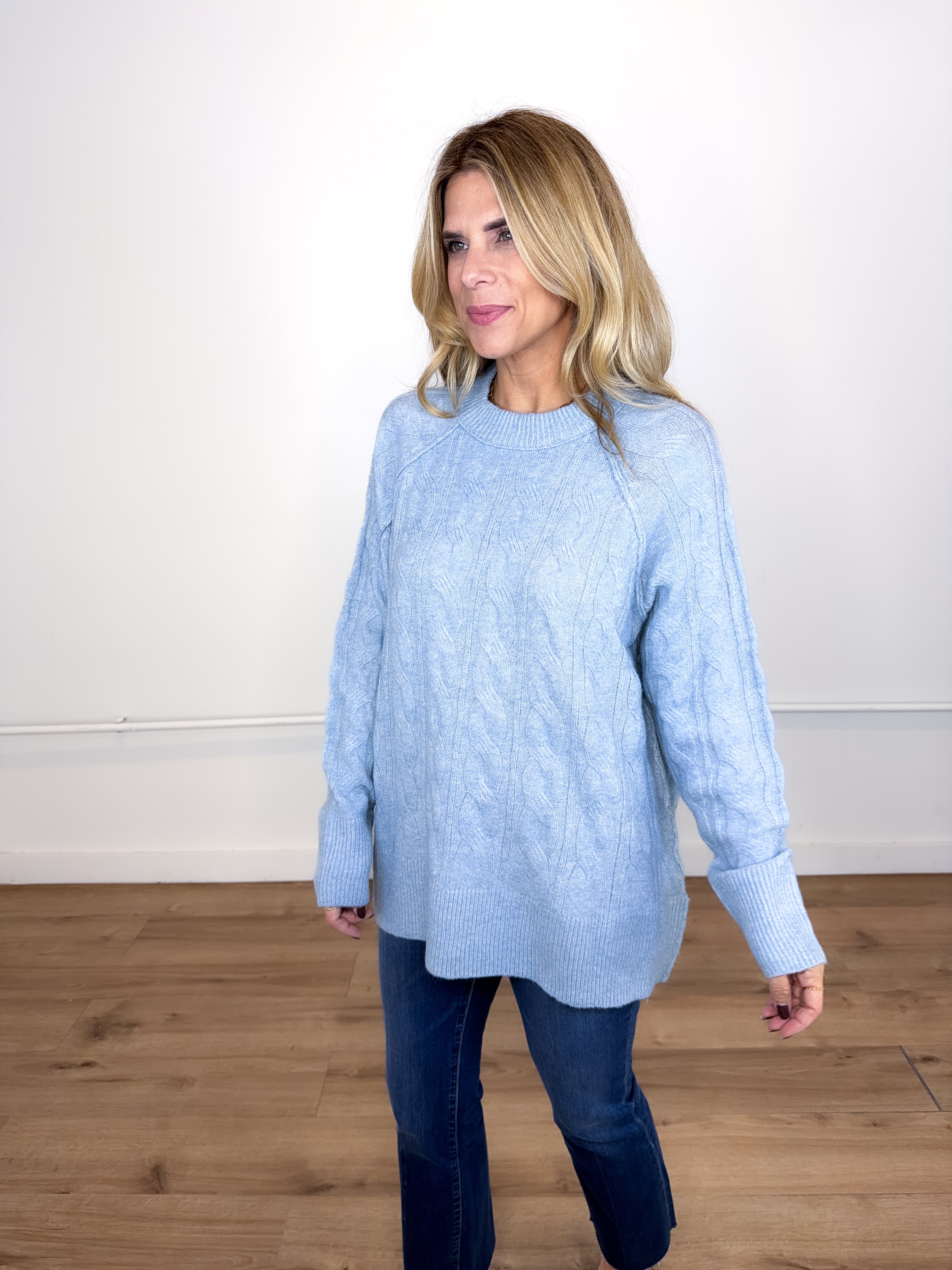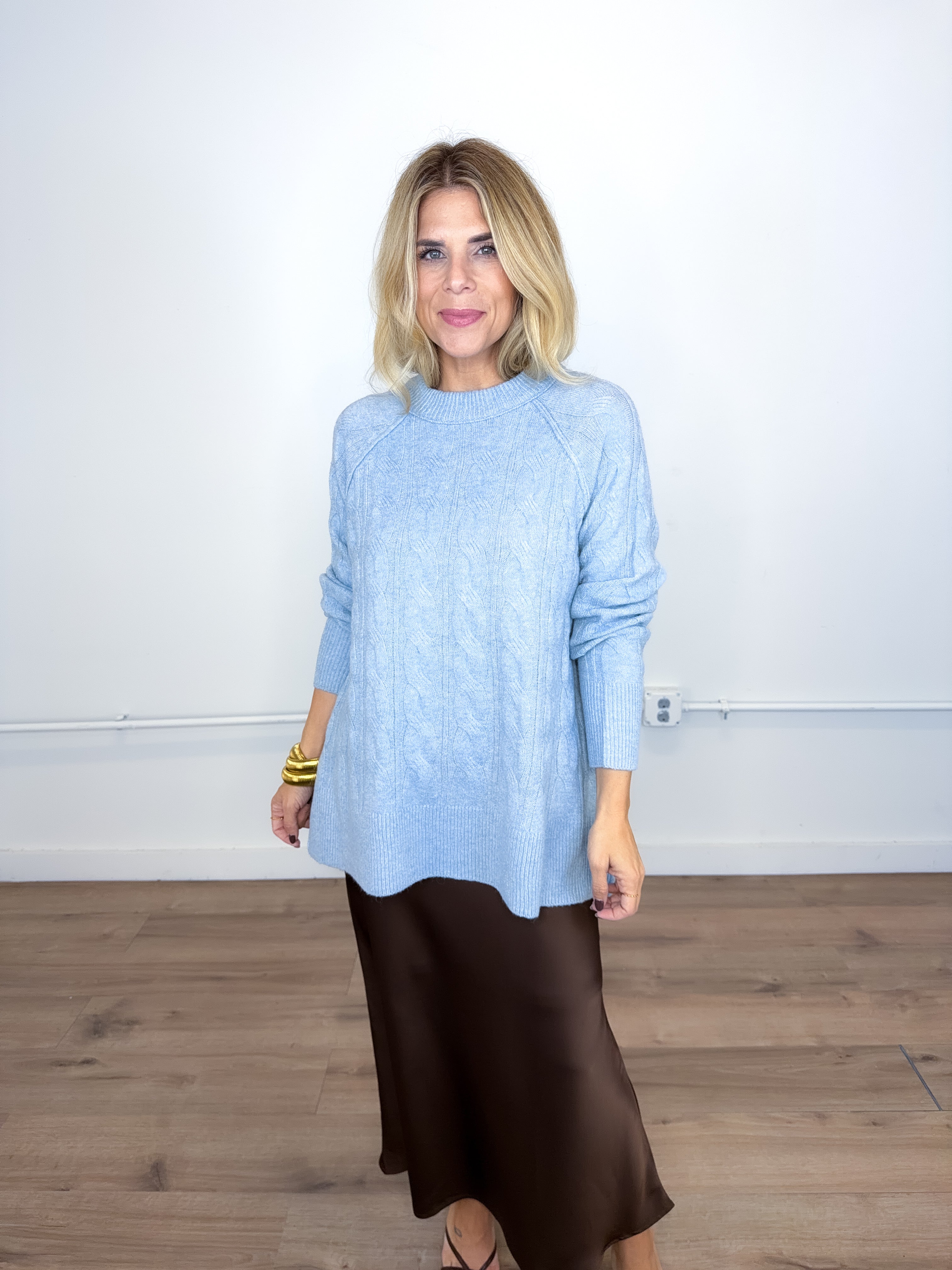 The Nellie Sweater is a perfect everyday sweater. This sky blue cable knit sweater features a crew neck and an oversized relaxed fit. Pair with denim, boots, flats, skirts, dress pants and sneakers. Fits true to size.