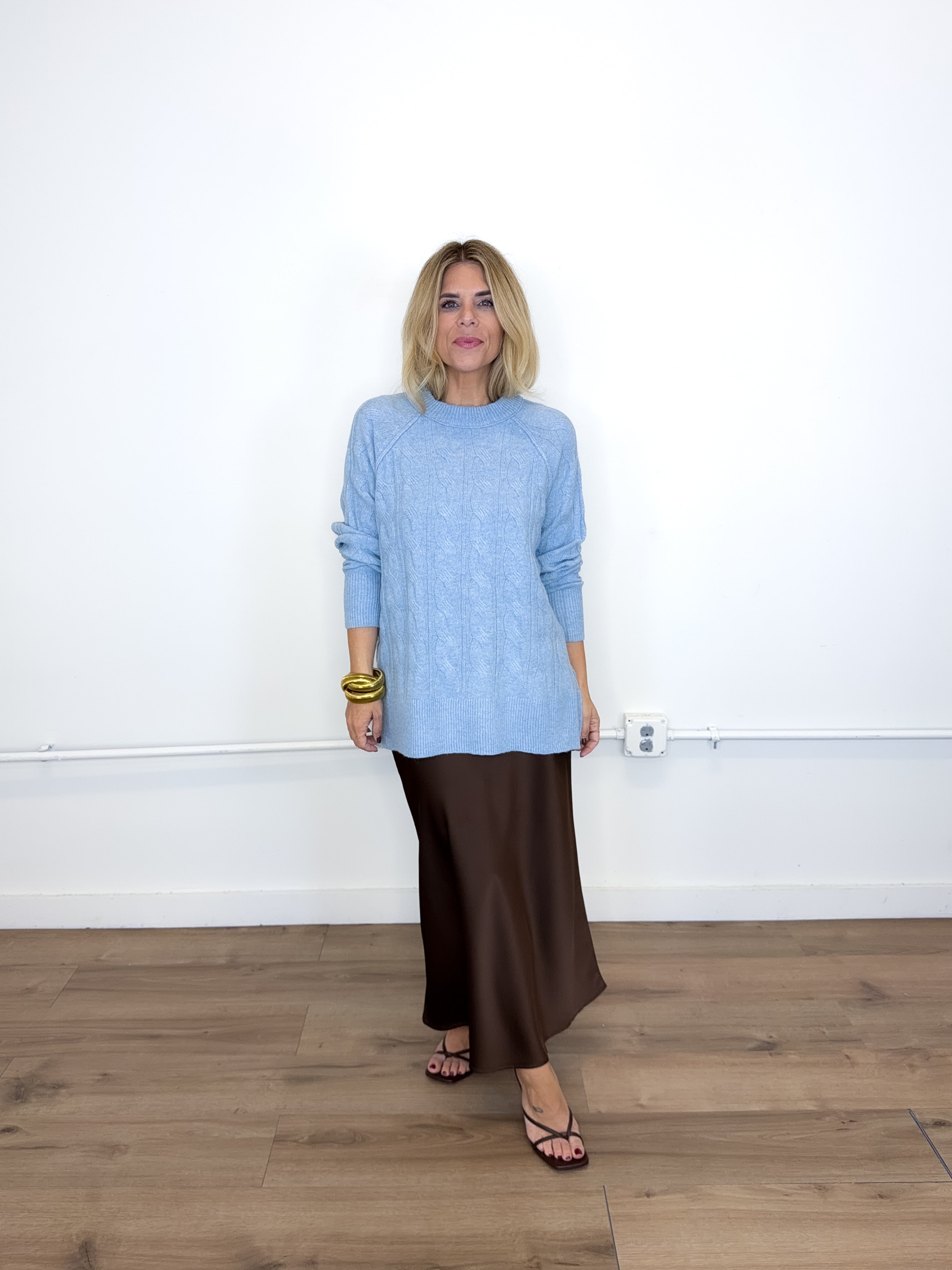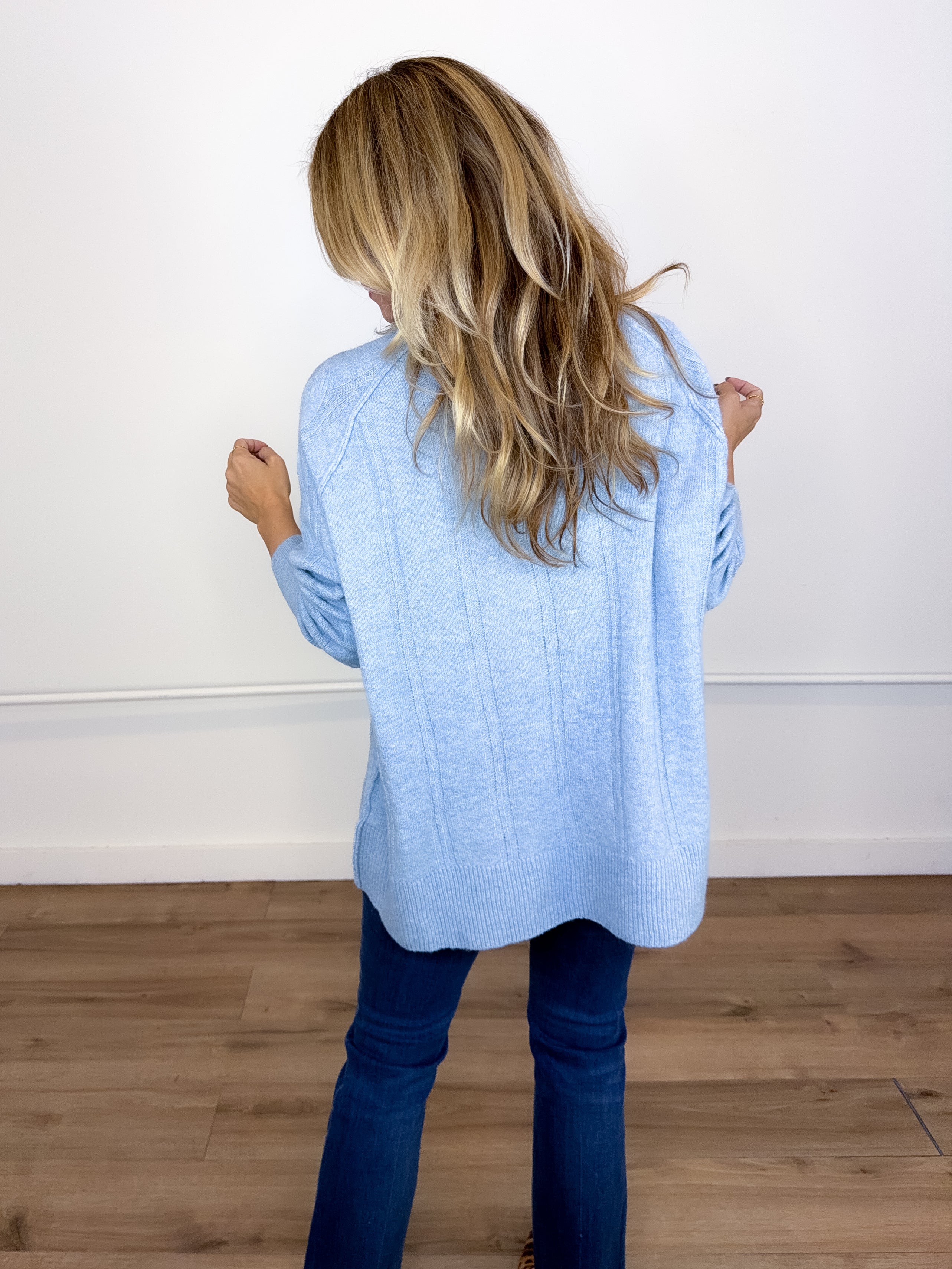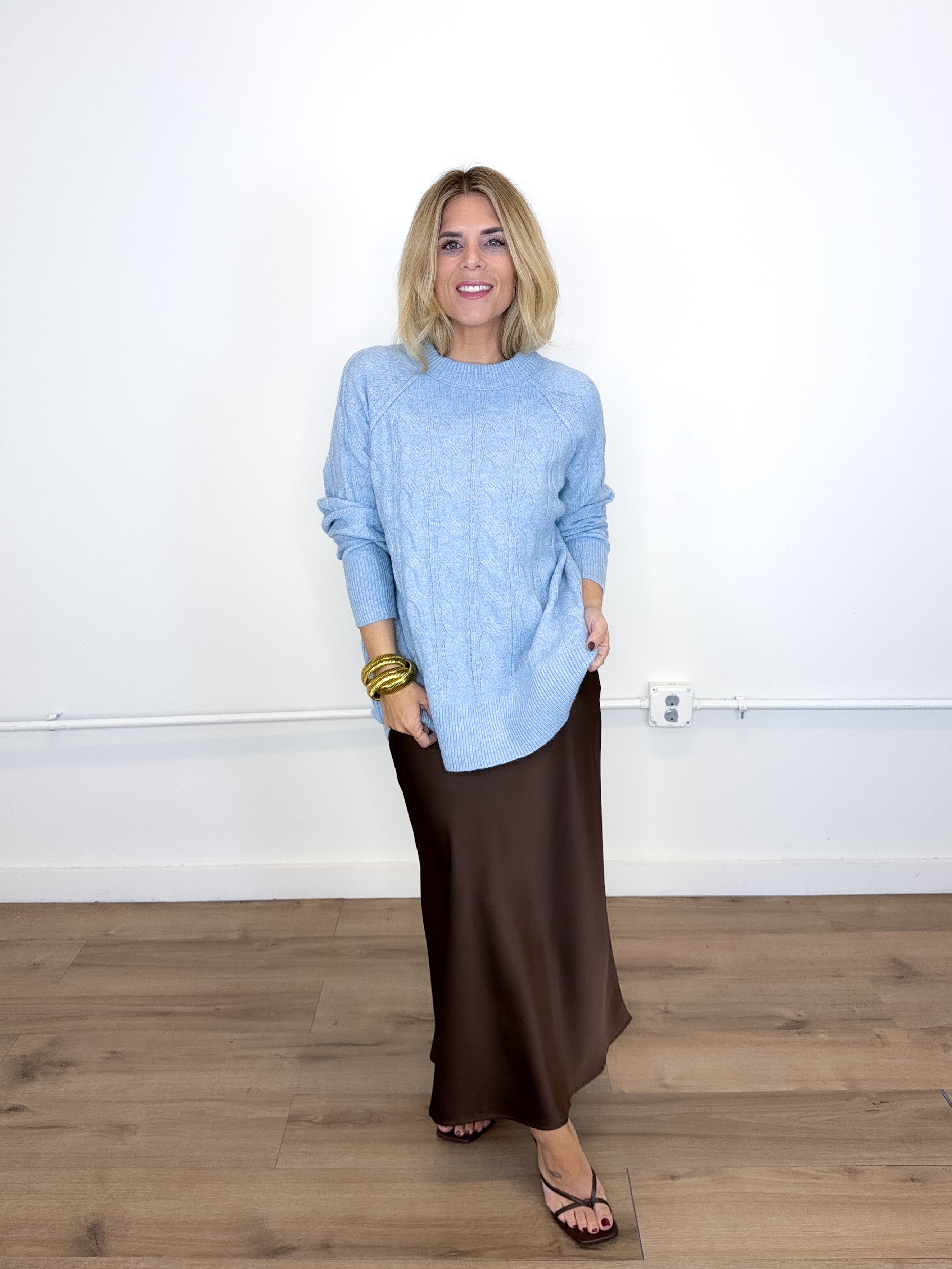The Nellie Sweater is a perfect everyday sweater. This sky blue cable knit sweater features a crew neck and an oversized relaxed fit. Pair with denim, boots, flats, skirts, dress pants and sneakers. Fits true to size.