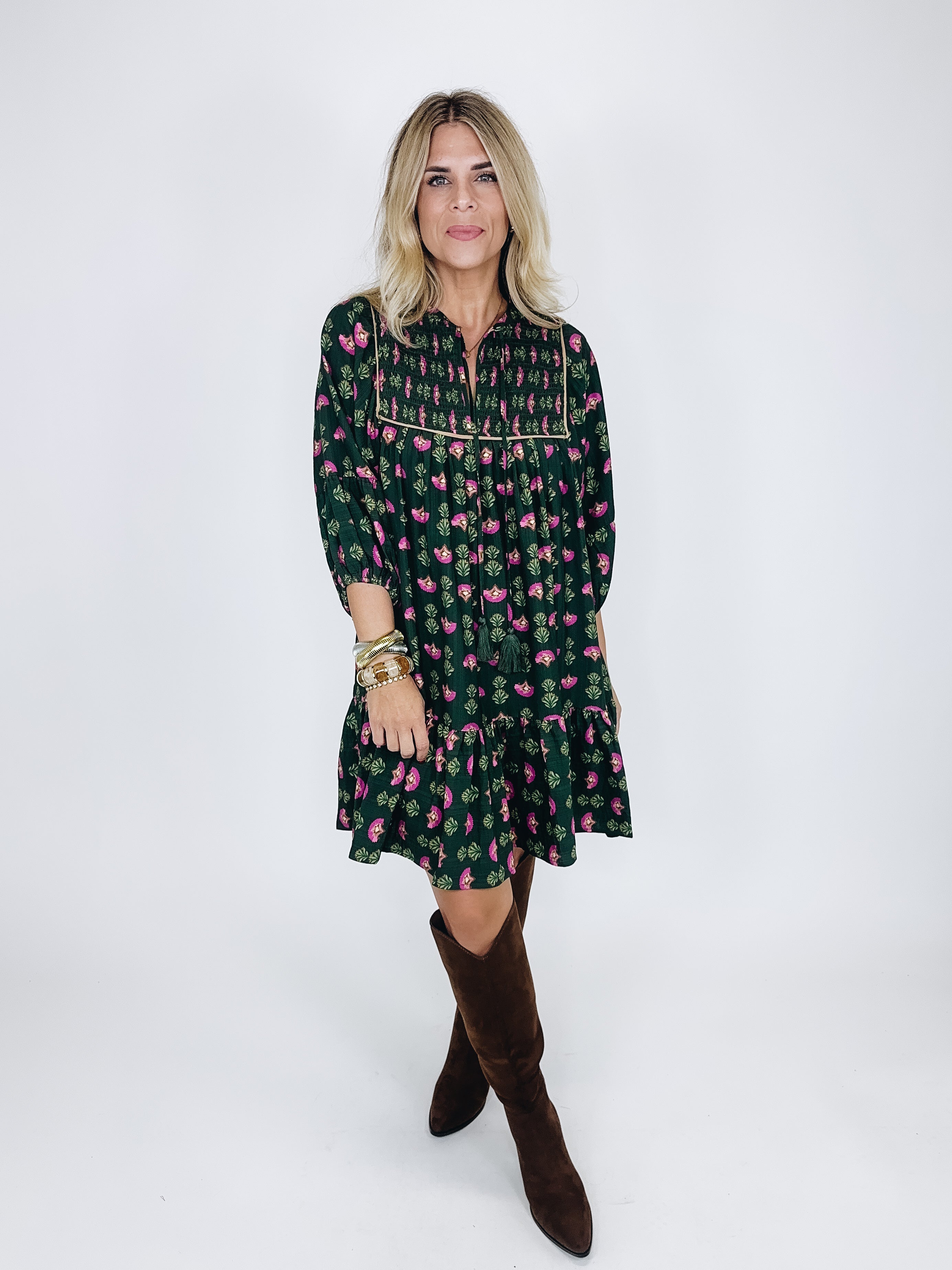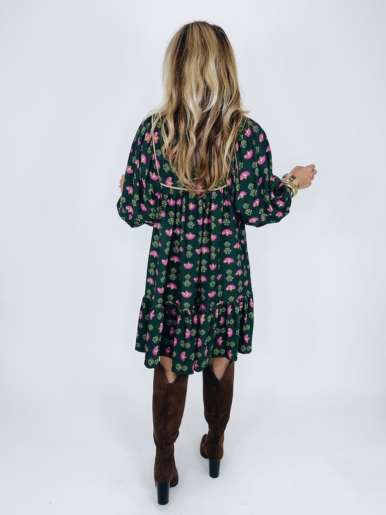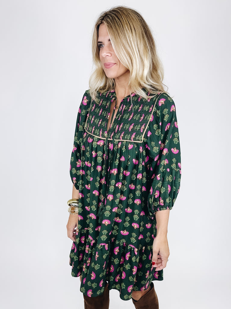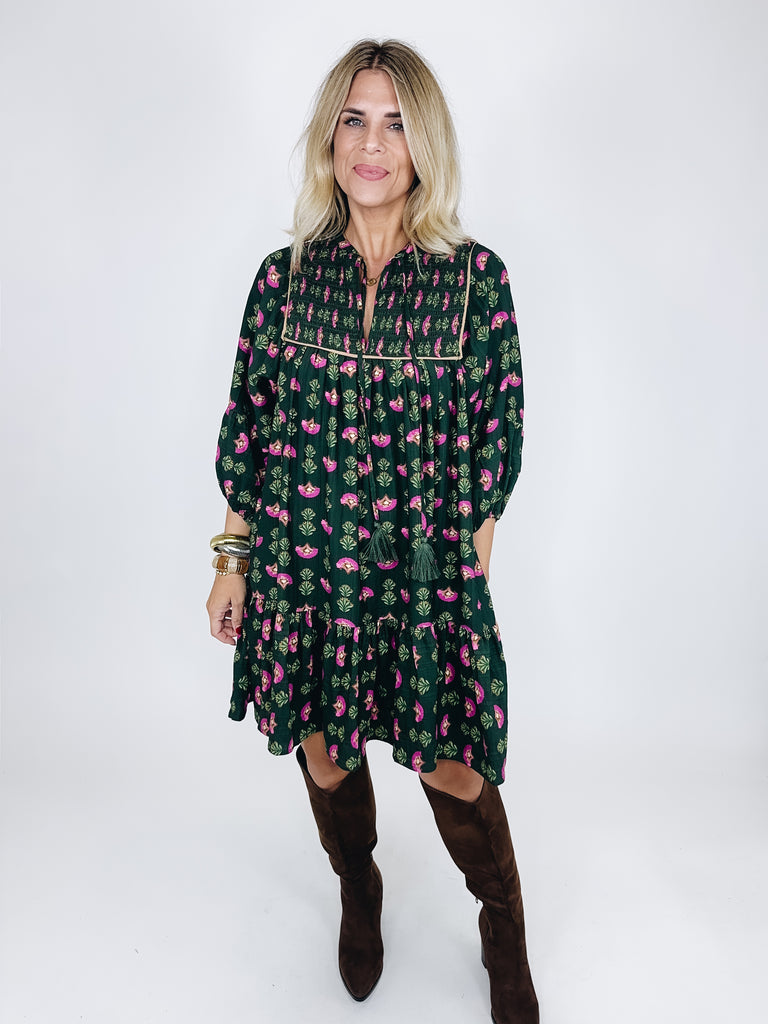 The Riley Dress is a darling mini dress. This hunter green dress features a magenta floral print and camel trim details, smocked bodice, notched neck with tassel ties, 3/4 long sleeves and a flowy tier hem. Style with flats, heels, wedges, boots, sandals and even sneakers! Dress up or down. Lined. Fits true to size.