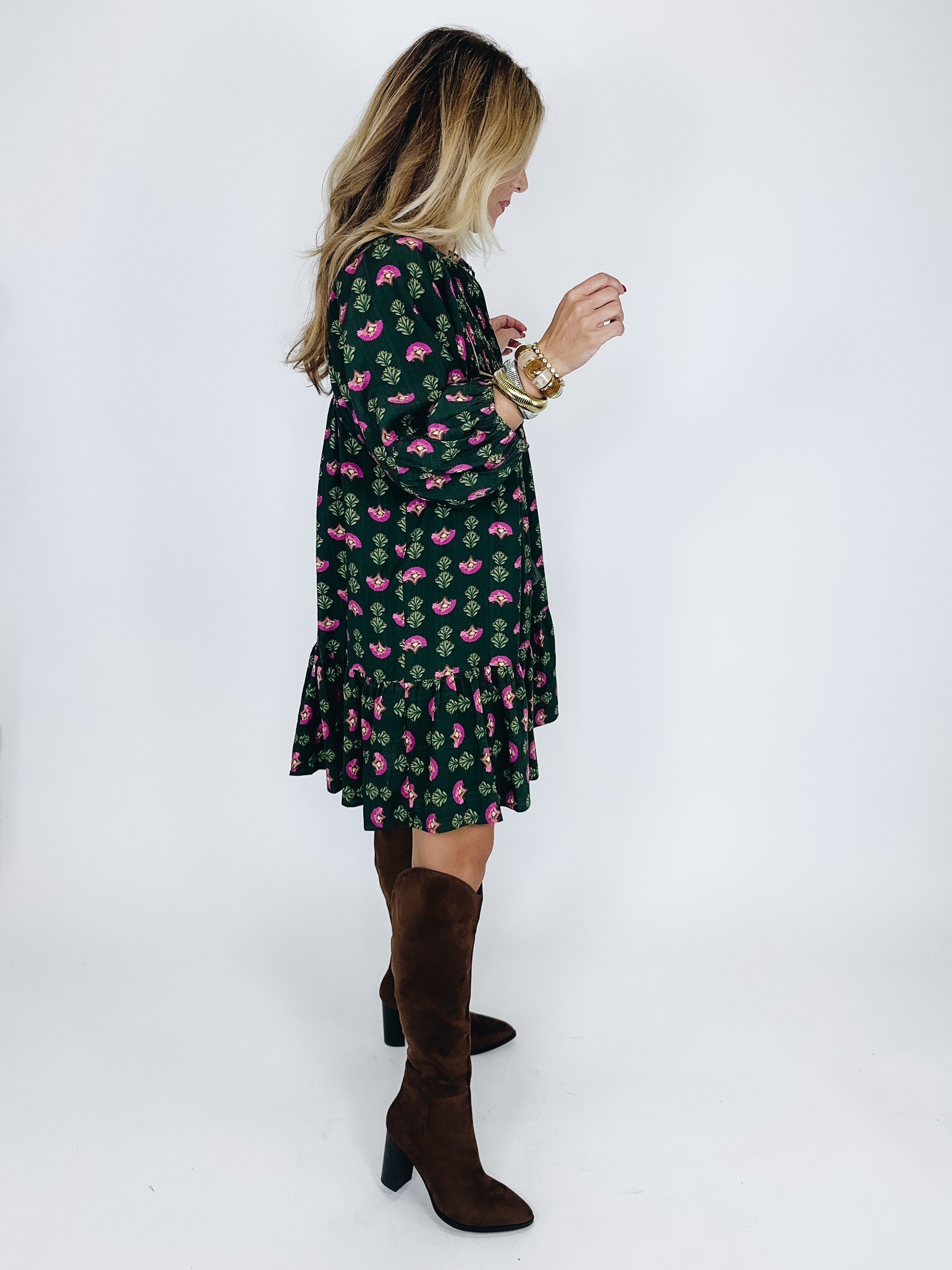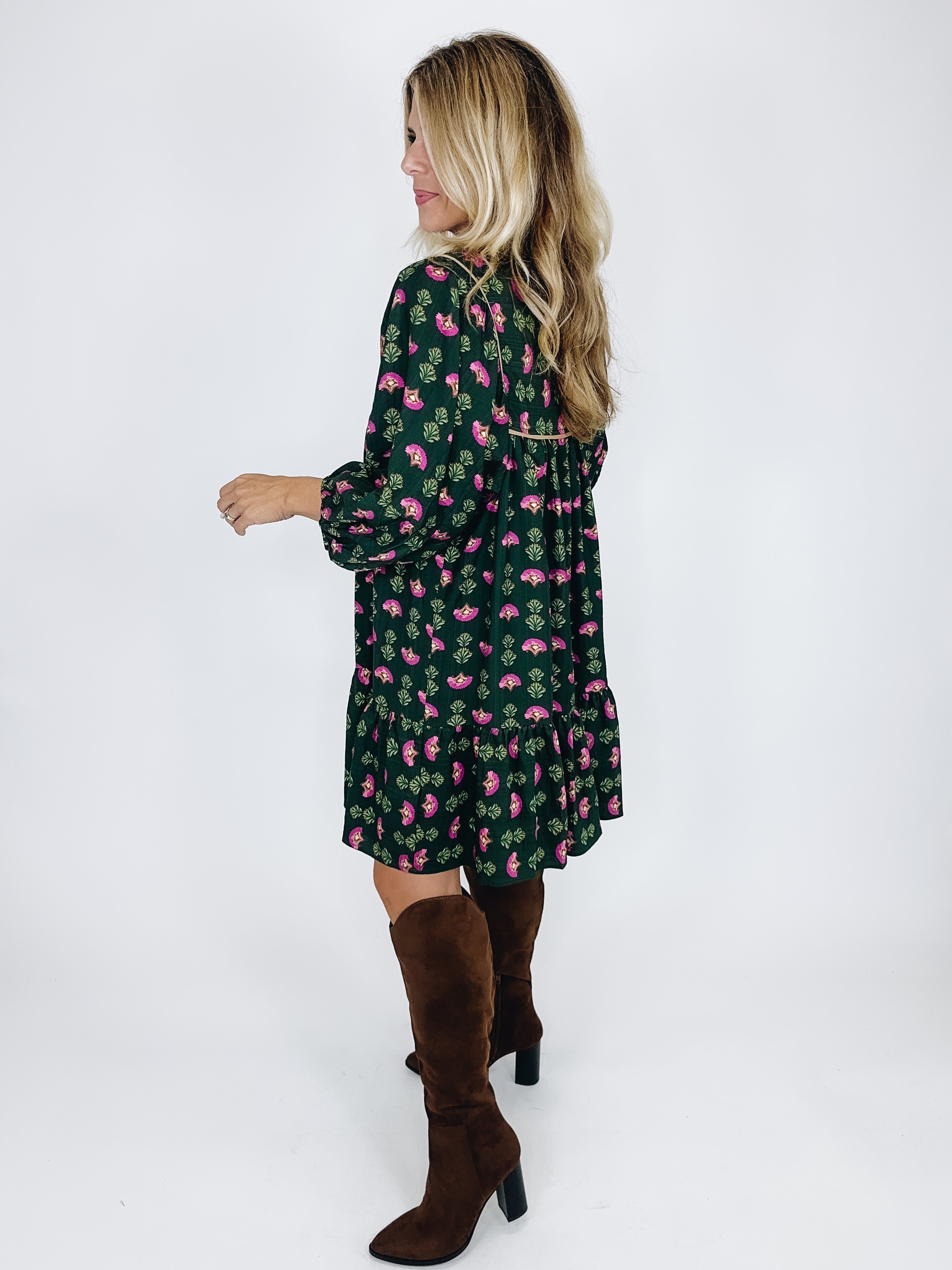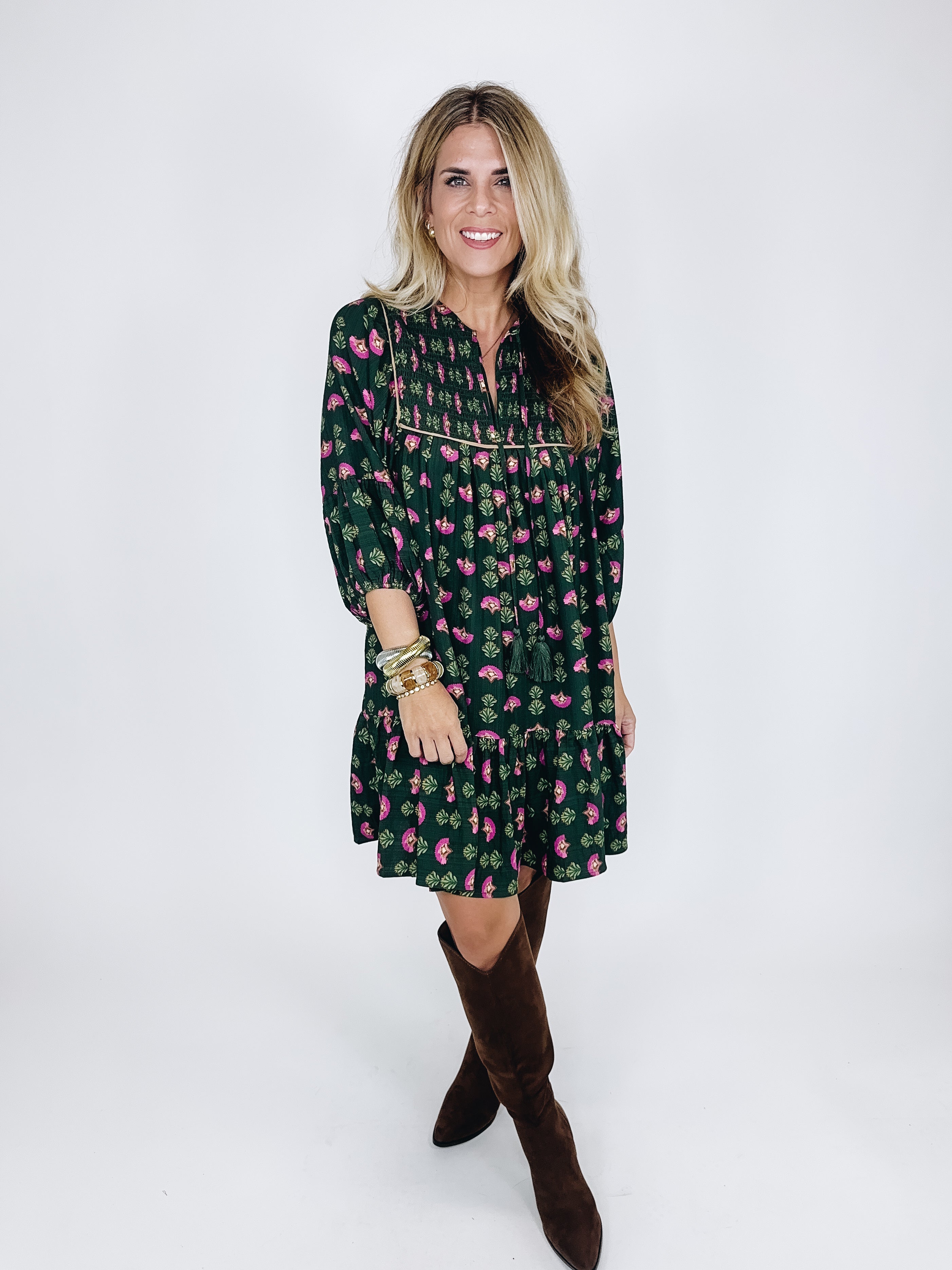 The Riley Dress is a darling mini dress. This hunter green dress features a magenta floral print and camel trim details, smocked bodice, notched neck with tassel ties, 3/4 long sleeves and a flowy tier hem. Style with flats, heels, wedges, boots, sandals and even sneakers! Dress up or down. Lined. Fits true to size.