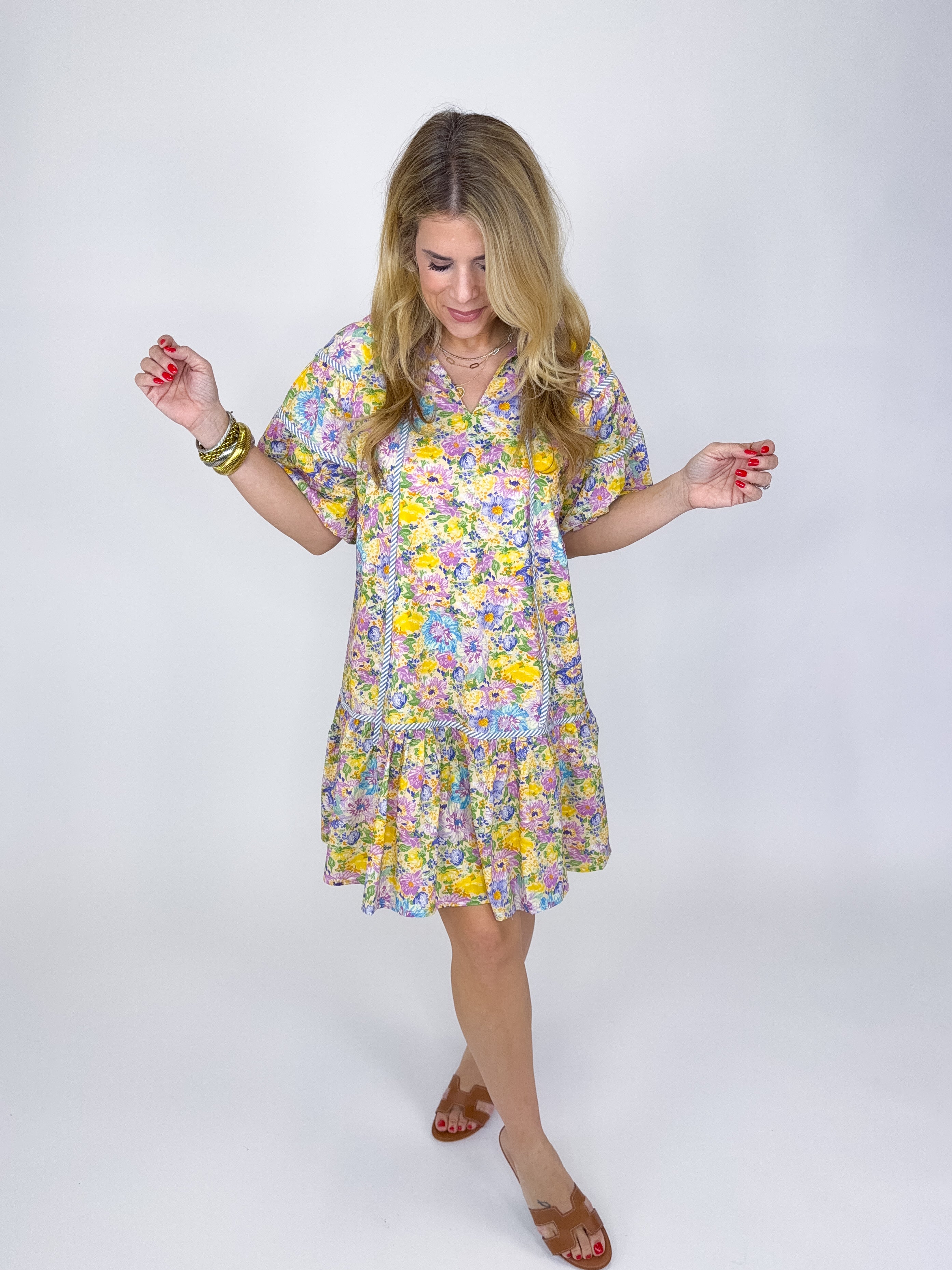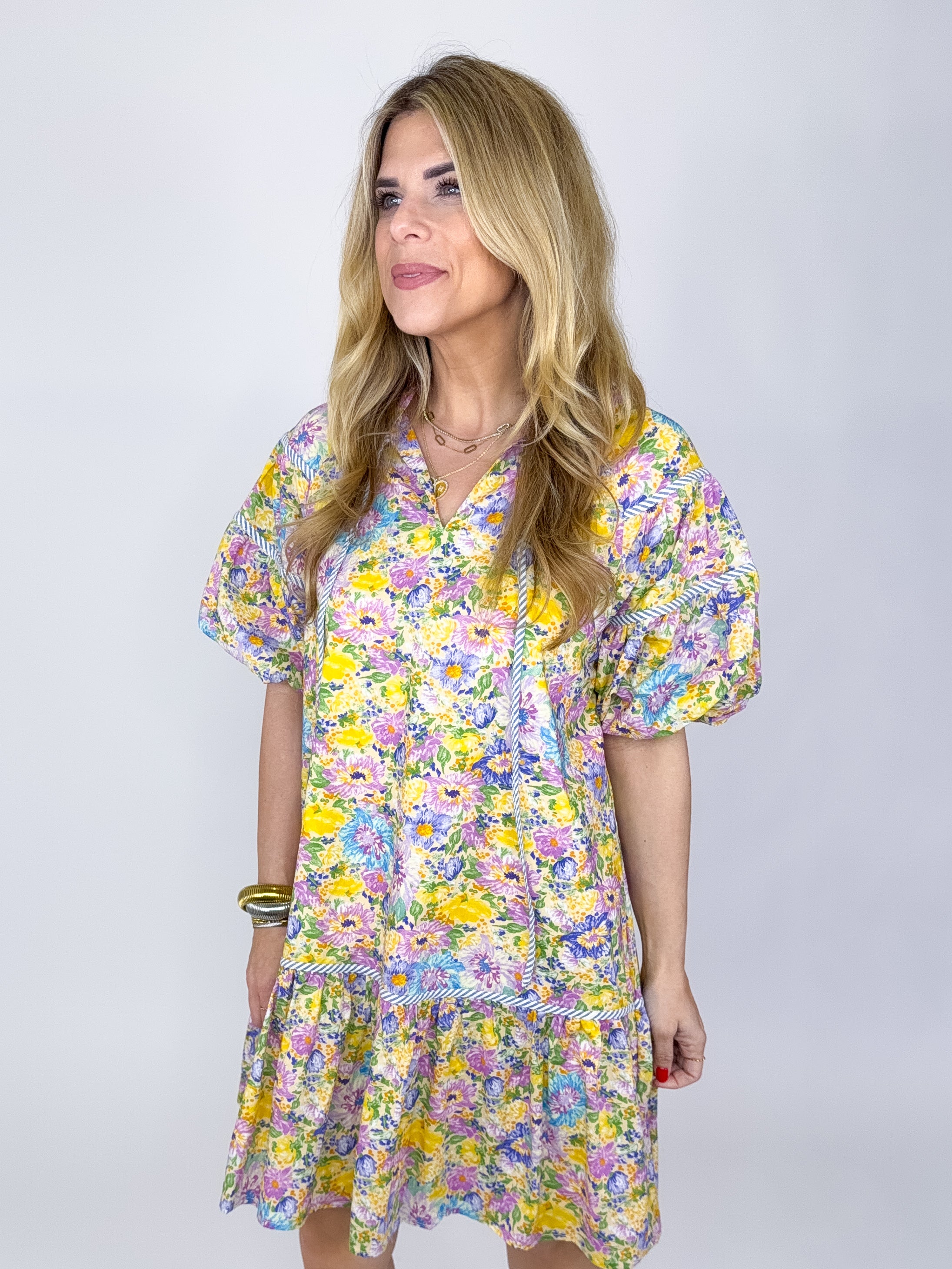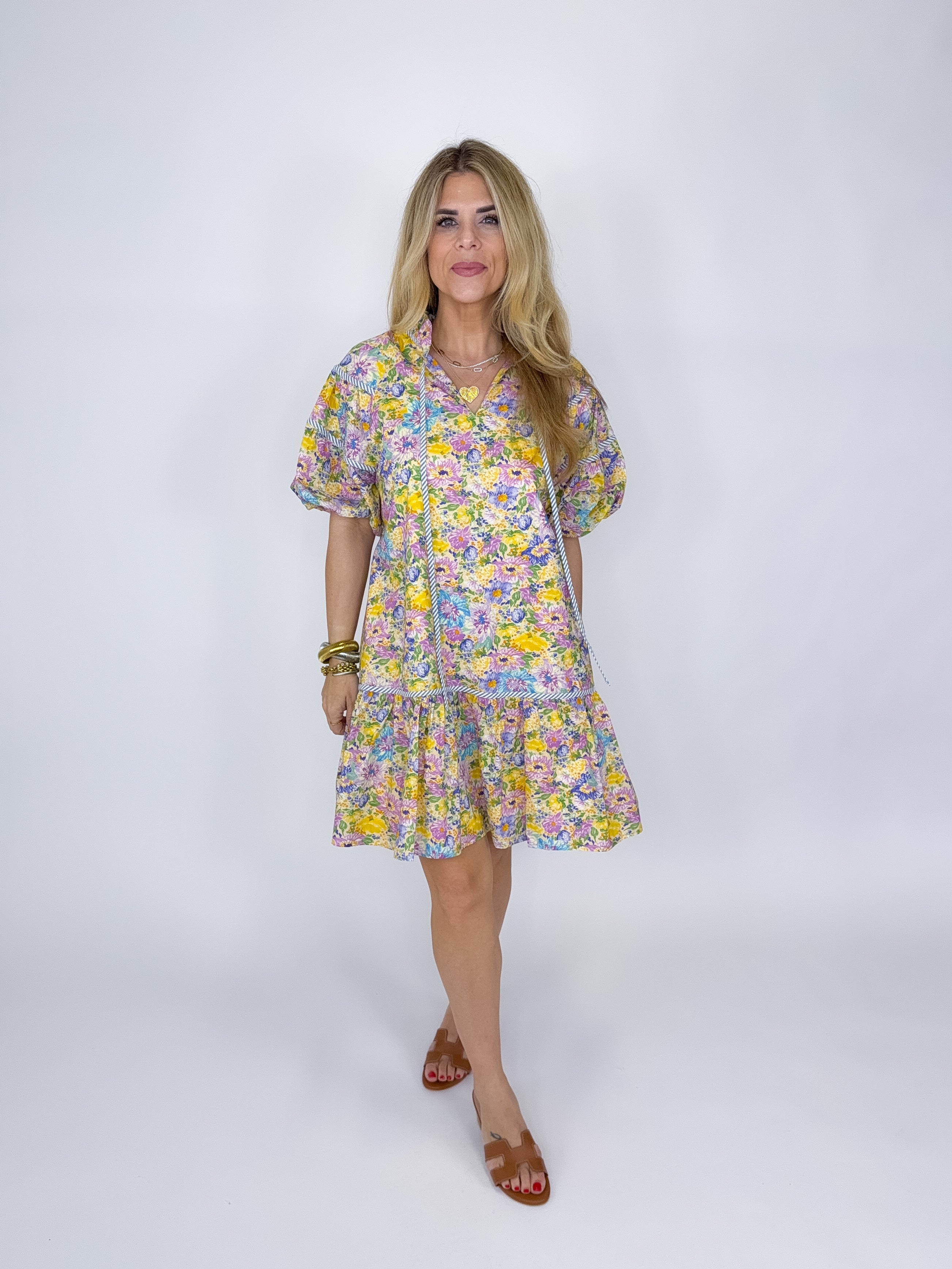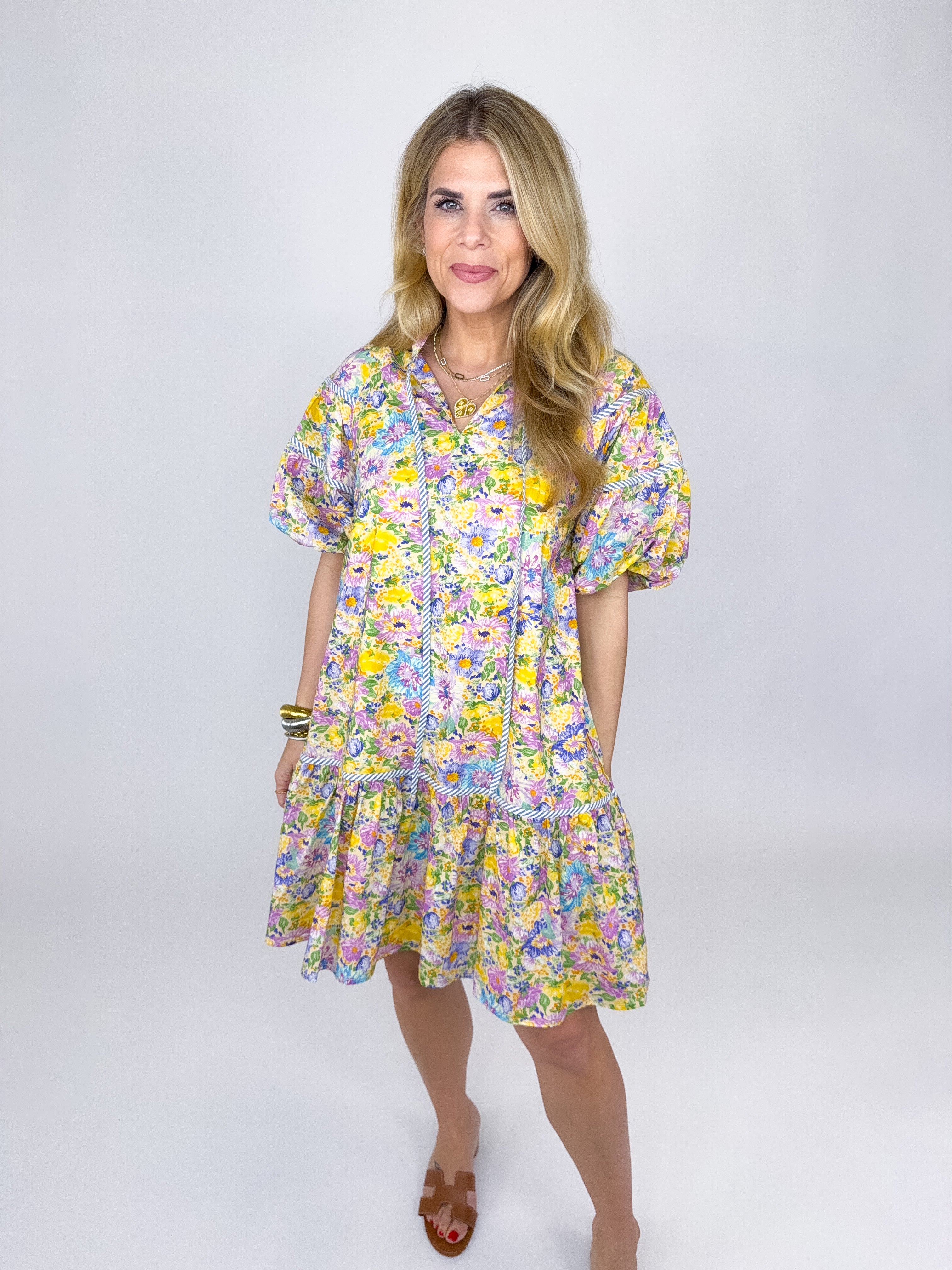 The Rowen Dress is a showstopper! This floral midi dress features a notched neck with a ruffle trim and ties, contrast stripe trim, short puff sleeves, and a tier ruffle hem. Lined. Pockets. Style with flats, heels, wedges or sneakers. Fits true to size.