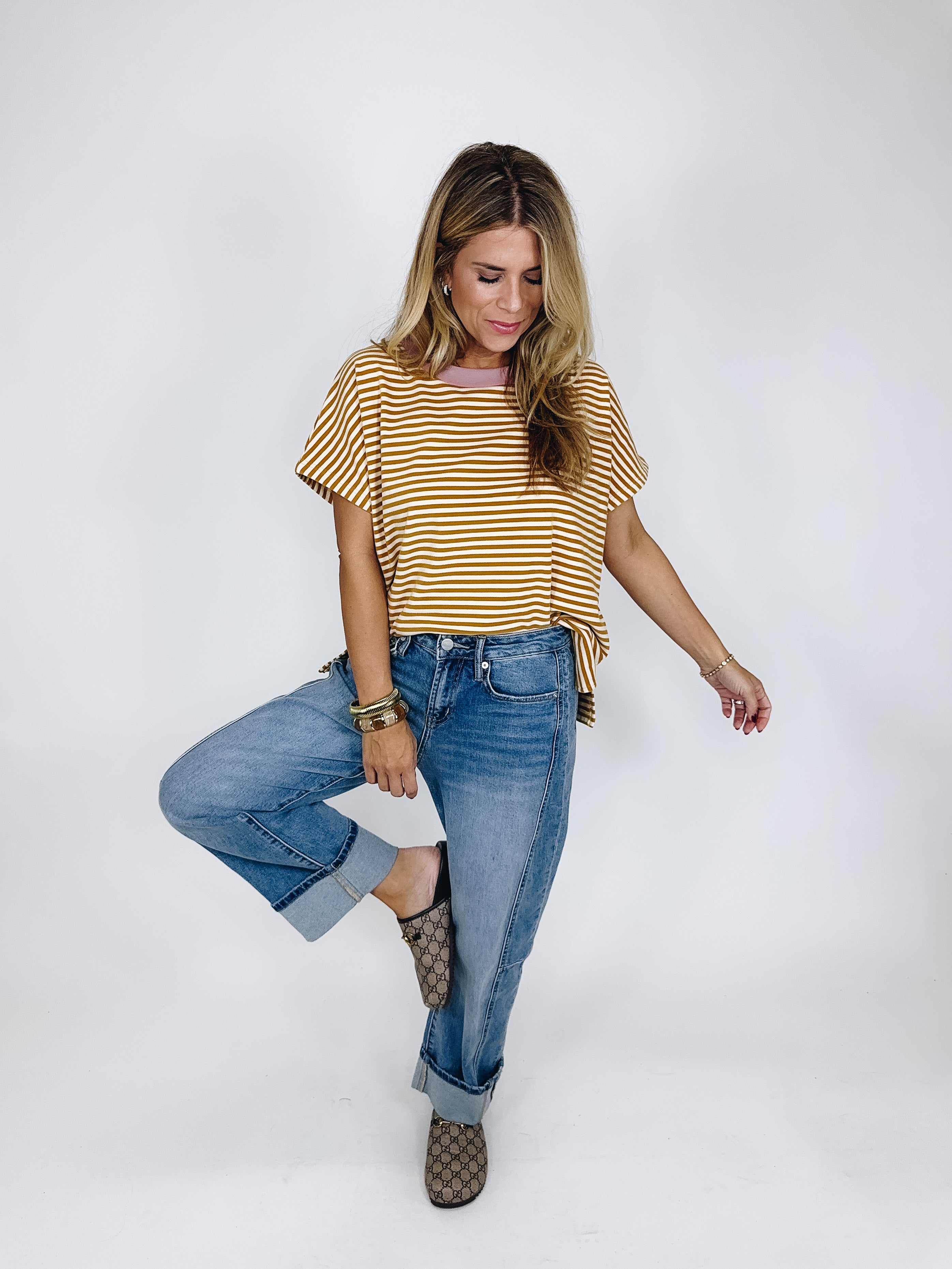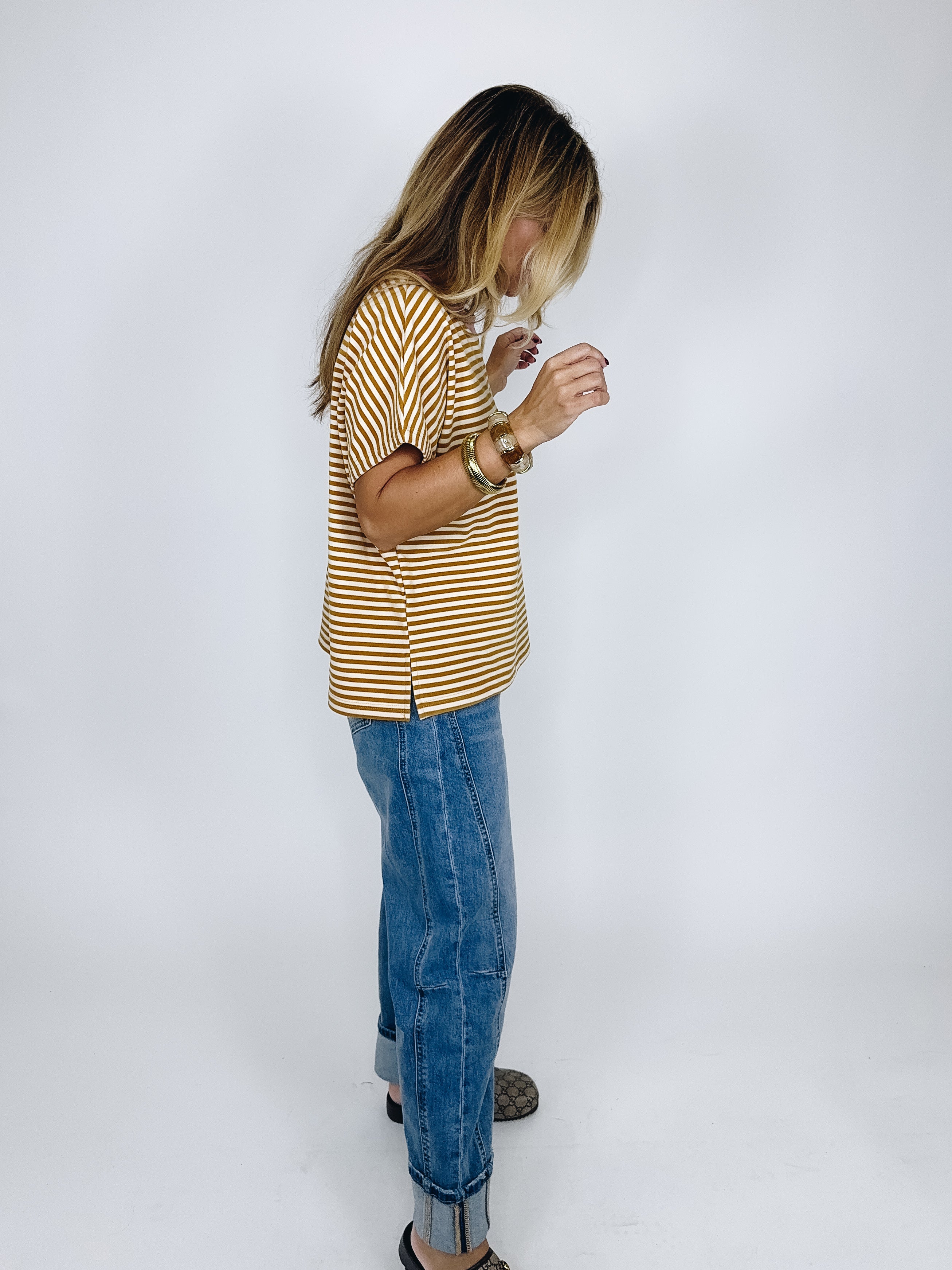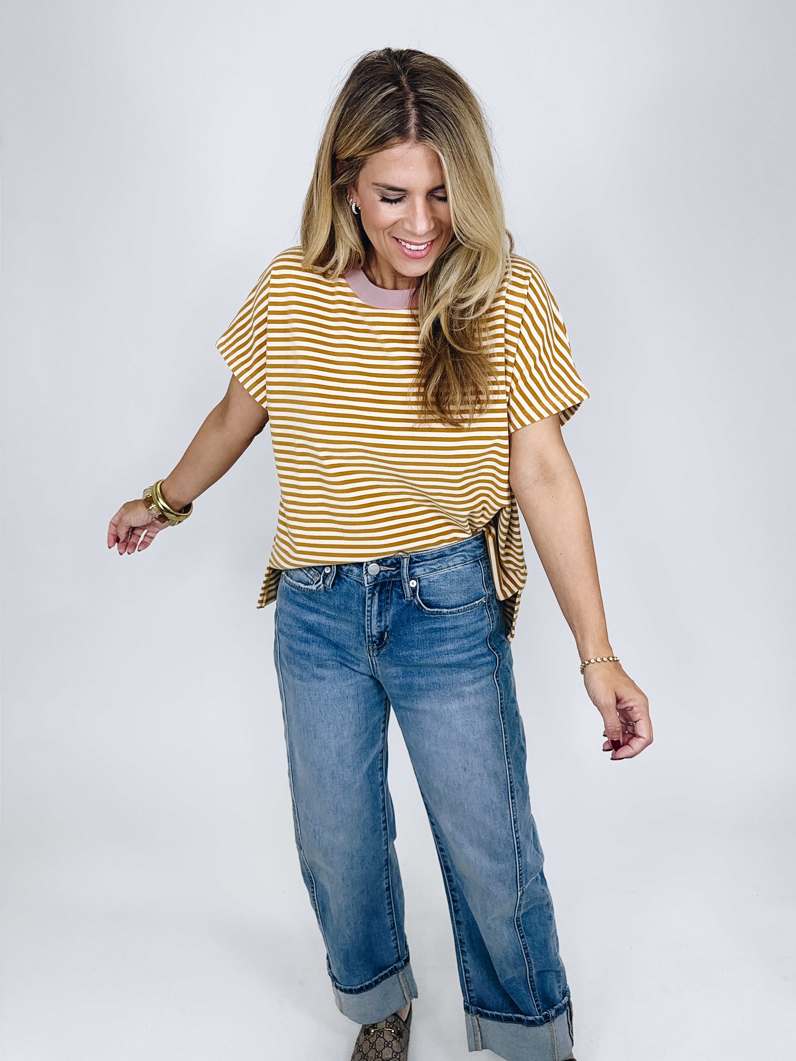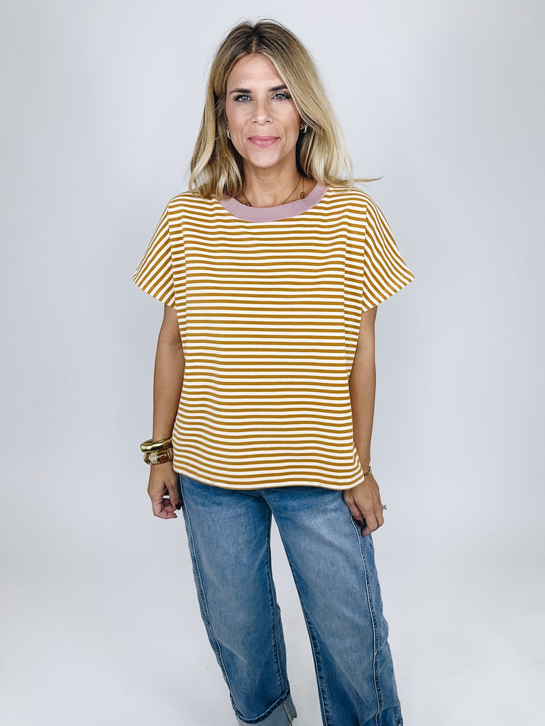 The Ruby Top is a great everyday top! This cream and mustard stripe soft brushed knit top features short dolman sleeves, a dusty pink crew neck and a side split hem. A must have! Pairs well with everything from denim, flats, heels, skirts and more! Feels so luxe! Fits true to size.