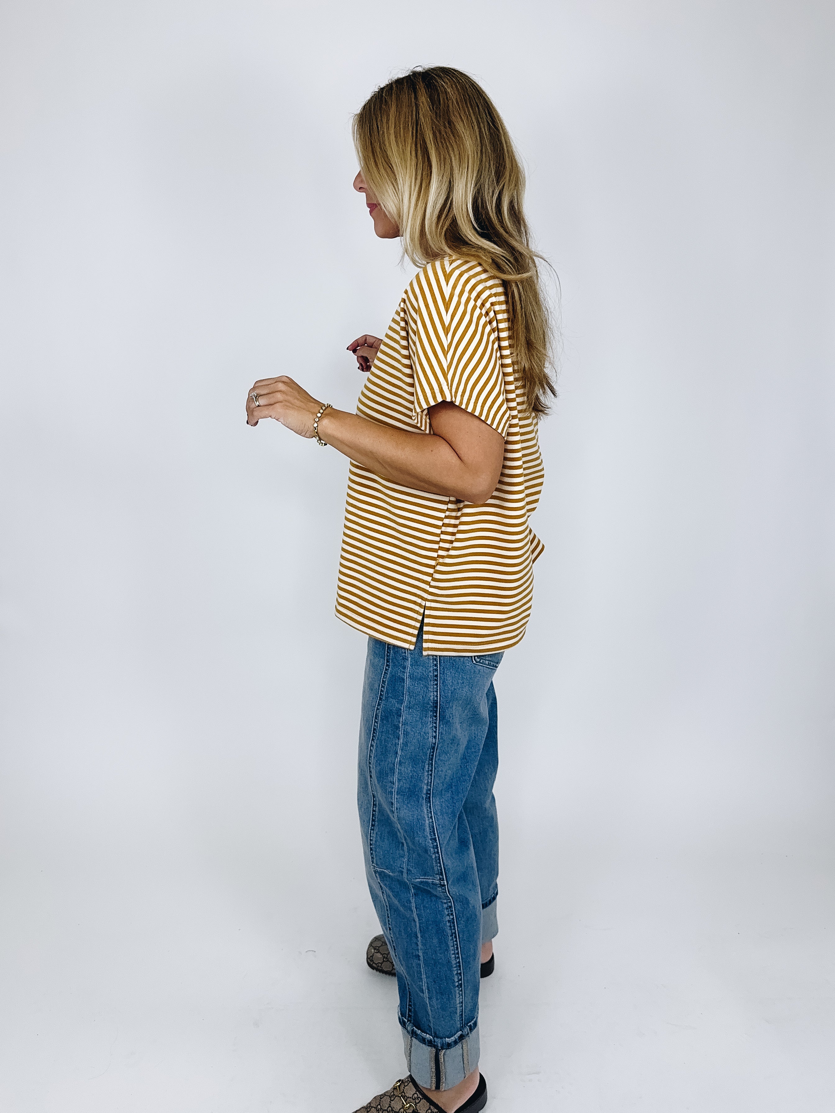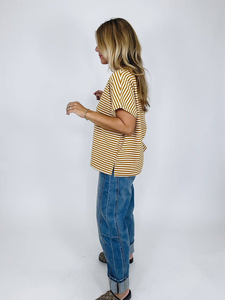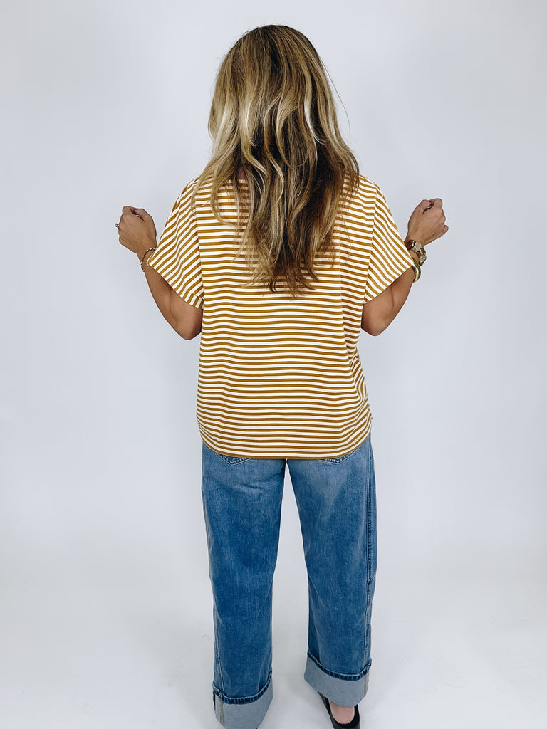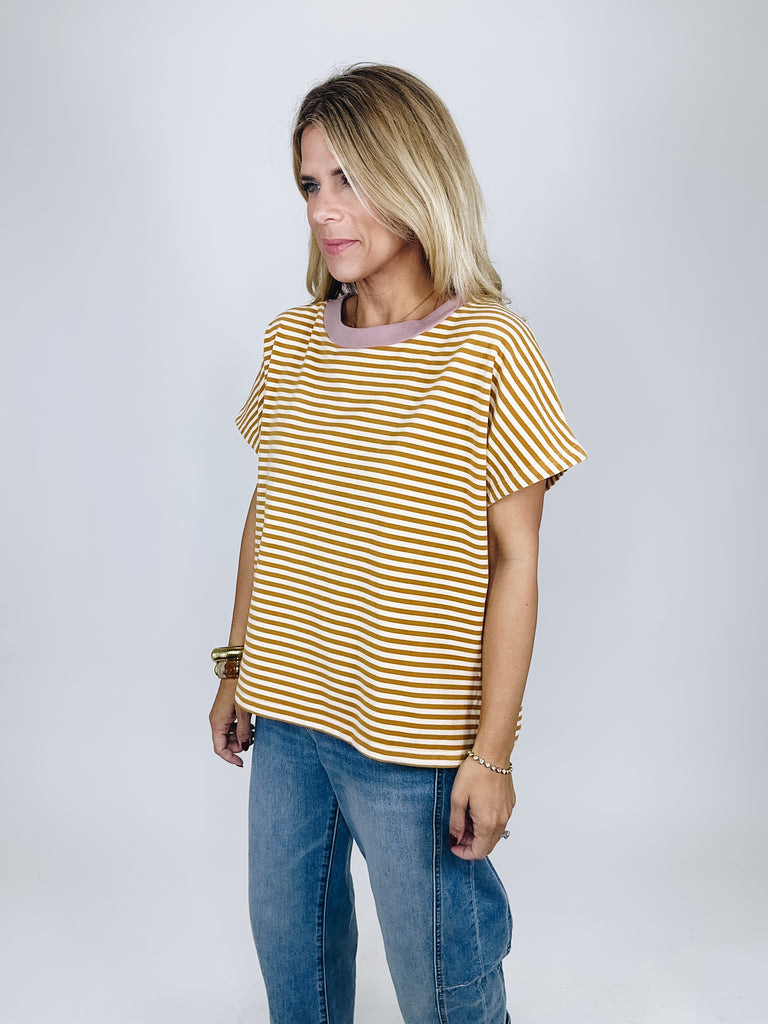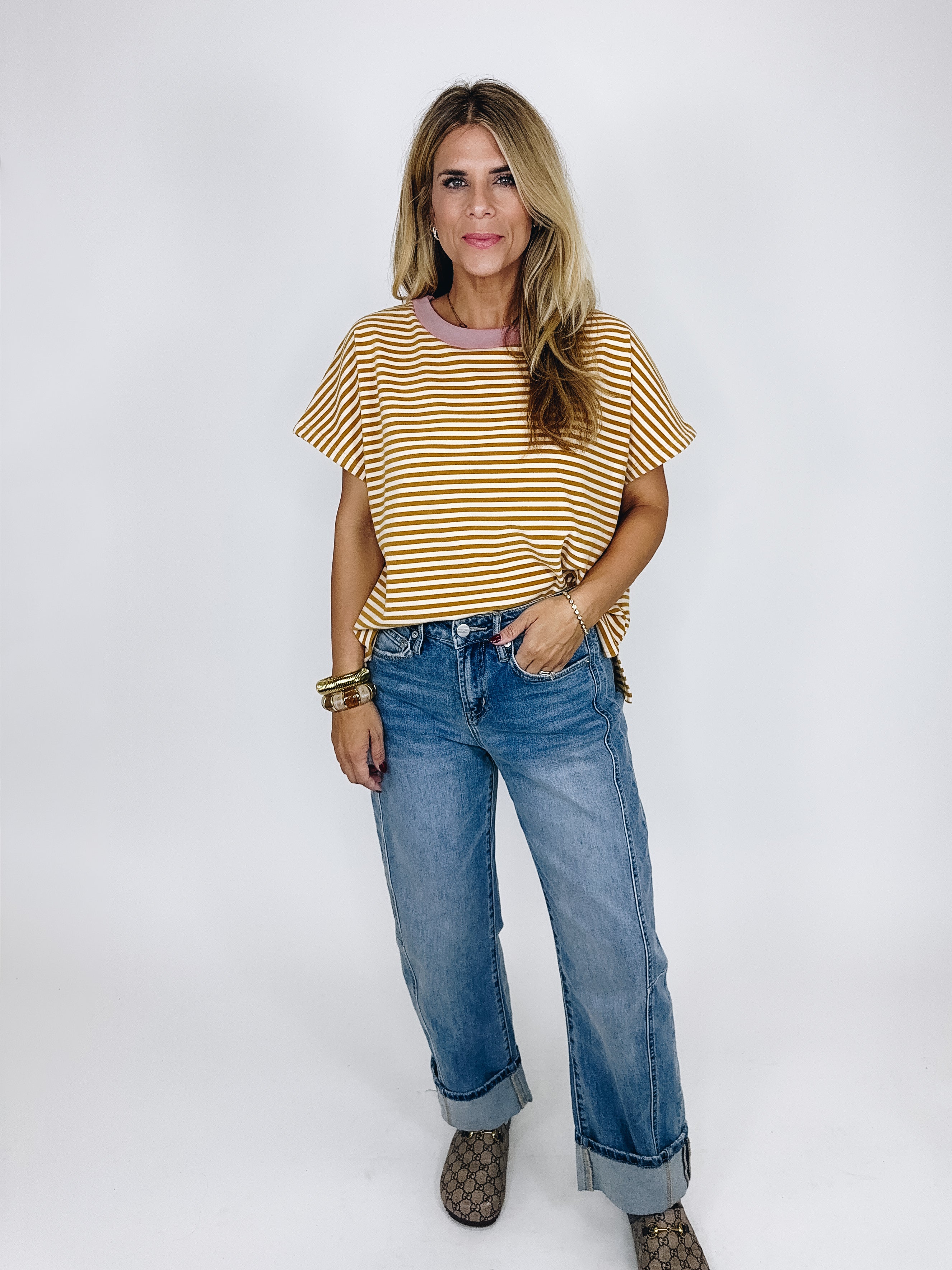 The Ruby Top is a great everyday top! This cream and mustard stripe soft brushed knit top features short dolman sleeves, a dusty pink crew neck and a side split hem. A must have! Pairs well with everything from denim, flats, heels, skirts and more! Feels so luxe! Fits true to size.