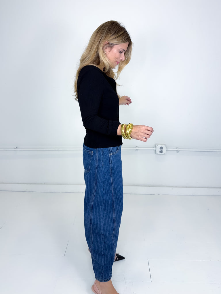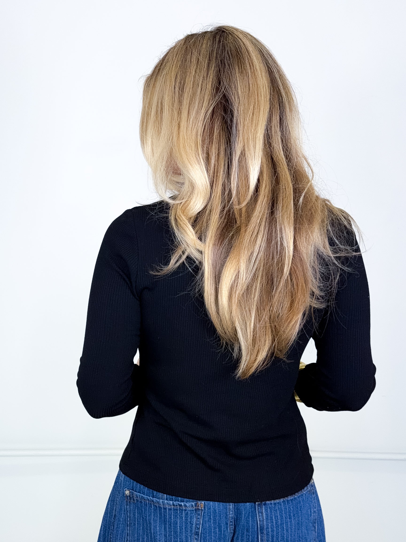 The Rue Top is a perfect everyday top. This black ribbed knit top features a round neck, button front and long sleeves. Pair with denim, boots, flats, skirts, dress pants and sneakers. Fits true to size.