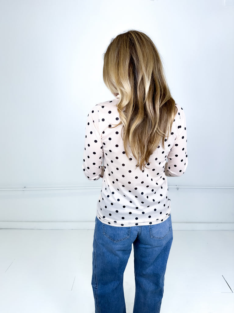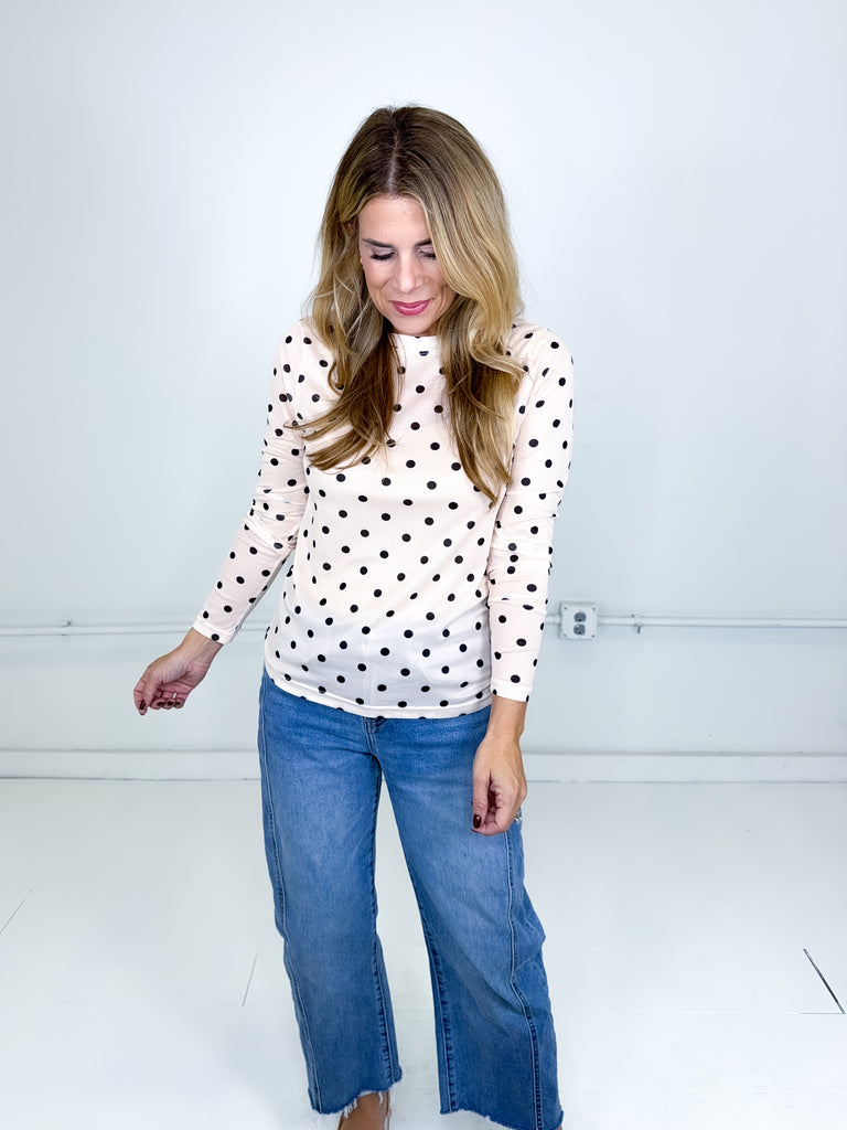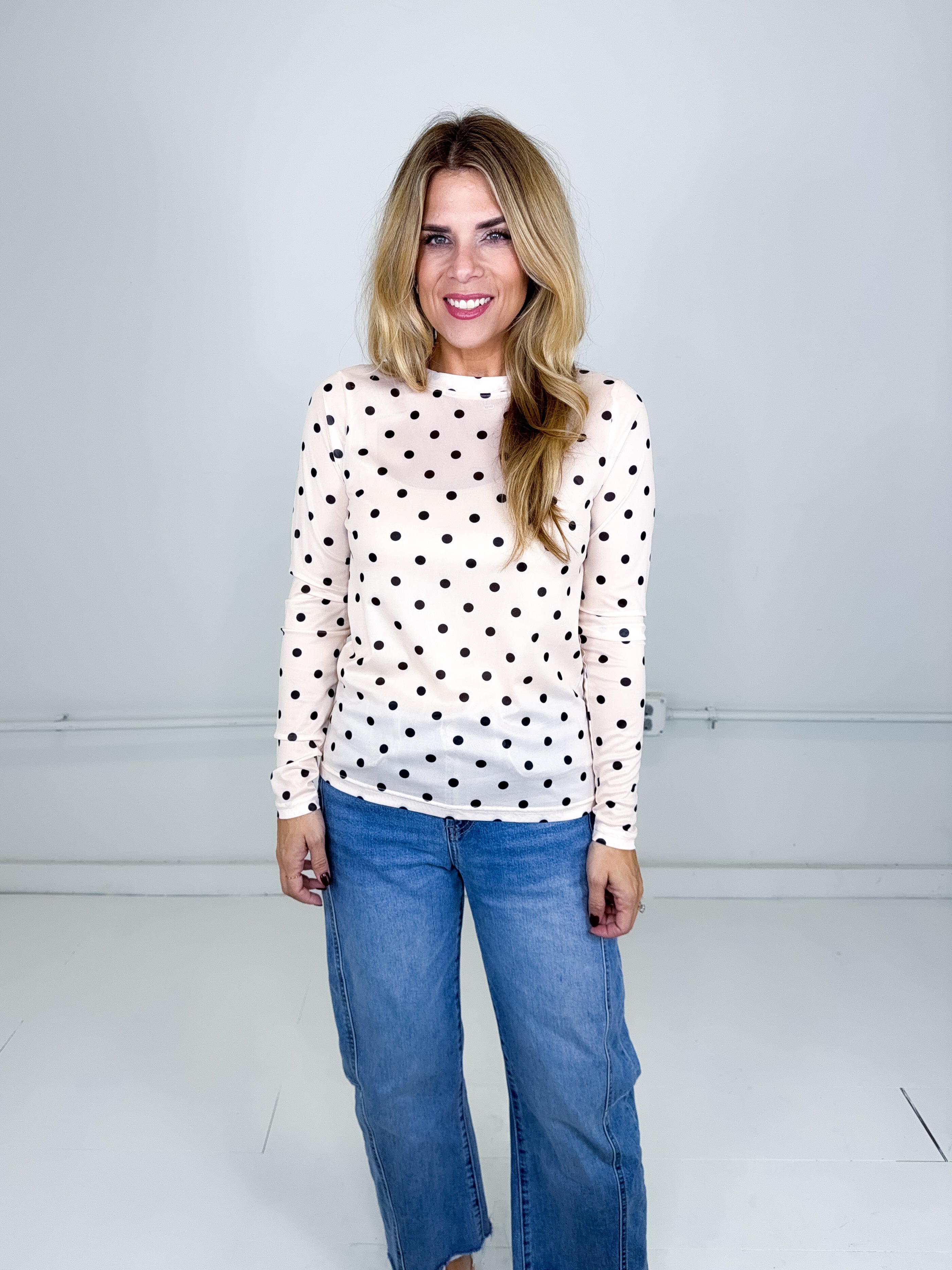 The Gigi Top is a perfect everyday top. This peach top features a polka dot pattern, sheer silhouette, crew neck, long sleeves and good length. Pair with denim, boots, flats, skirts, dress pants and sneakers. Fits true to size.