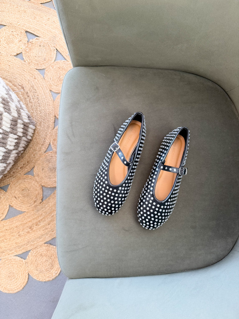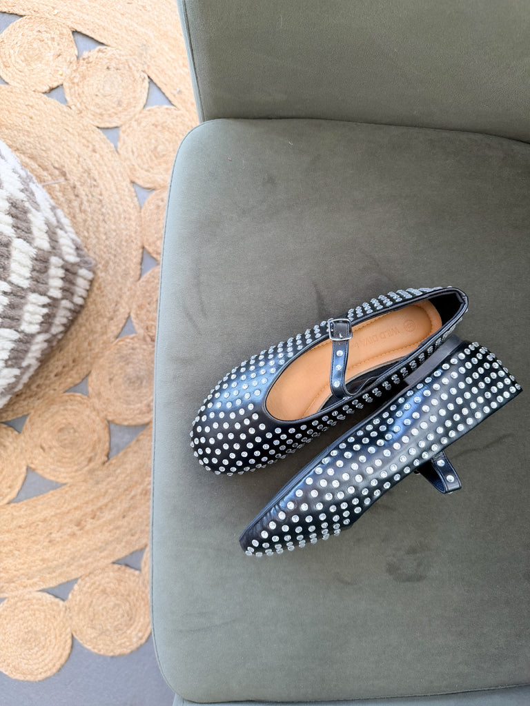 Stay on trend with our Sophia Rhinestone Flats. These lightweight black Maryjane style flats feature a slip on style, buckle strap, rhinestones and a round toe. Pair them with everything from jeans to dresses to skirts. Fit true to size.