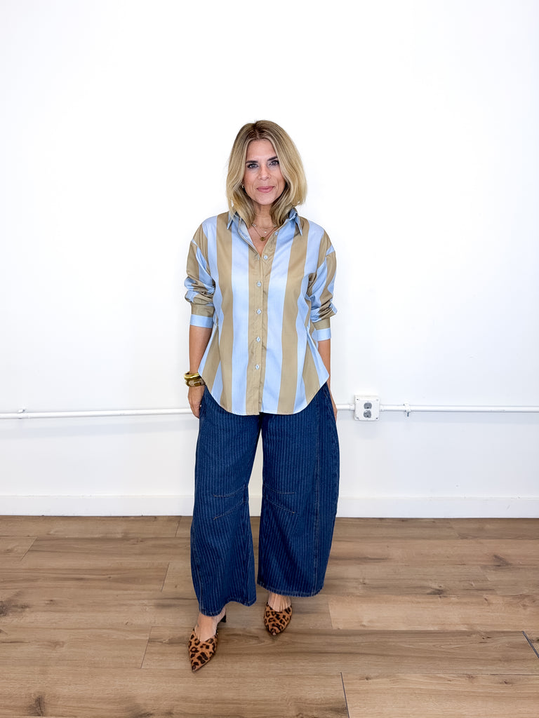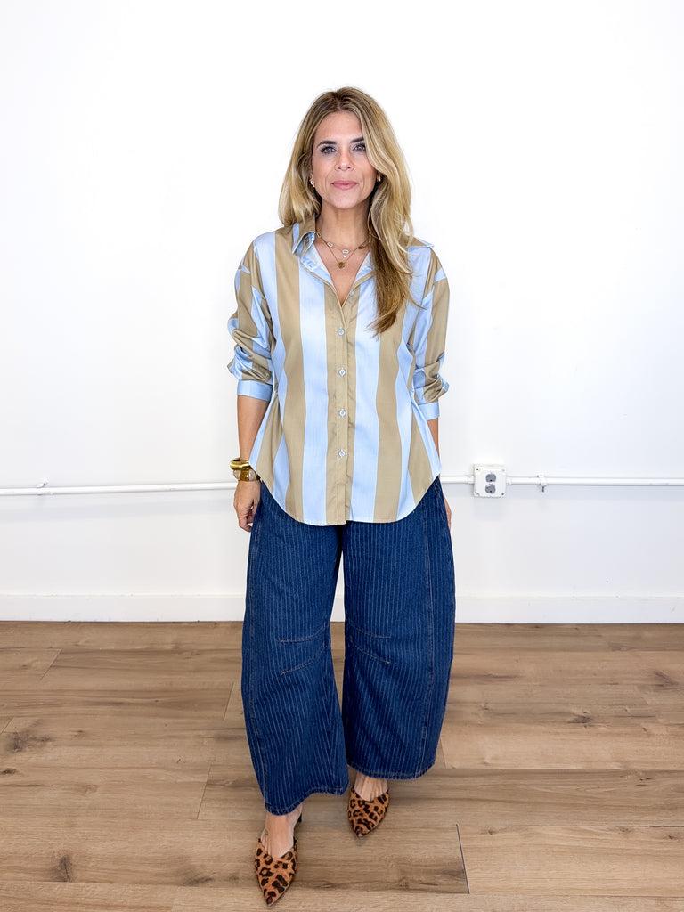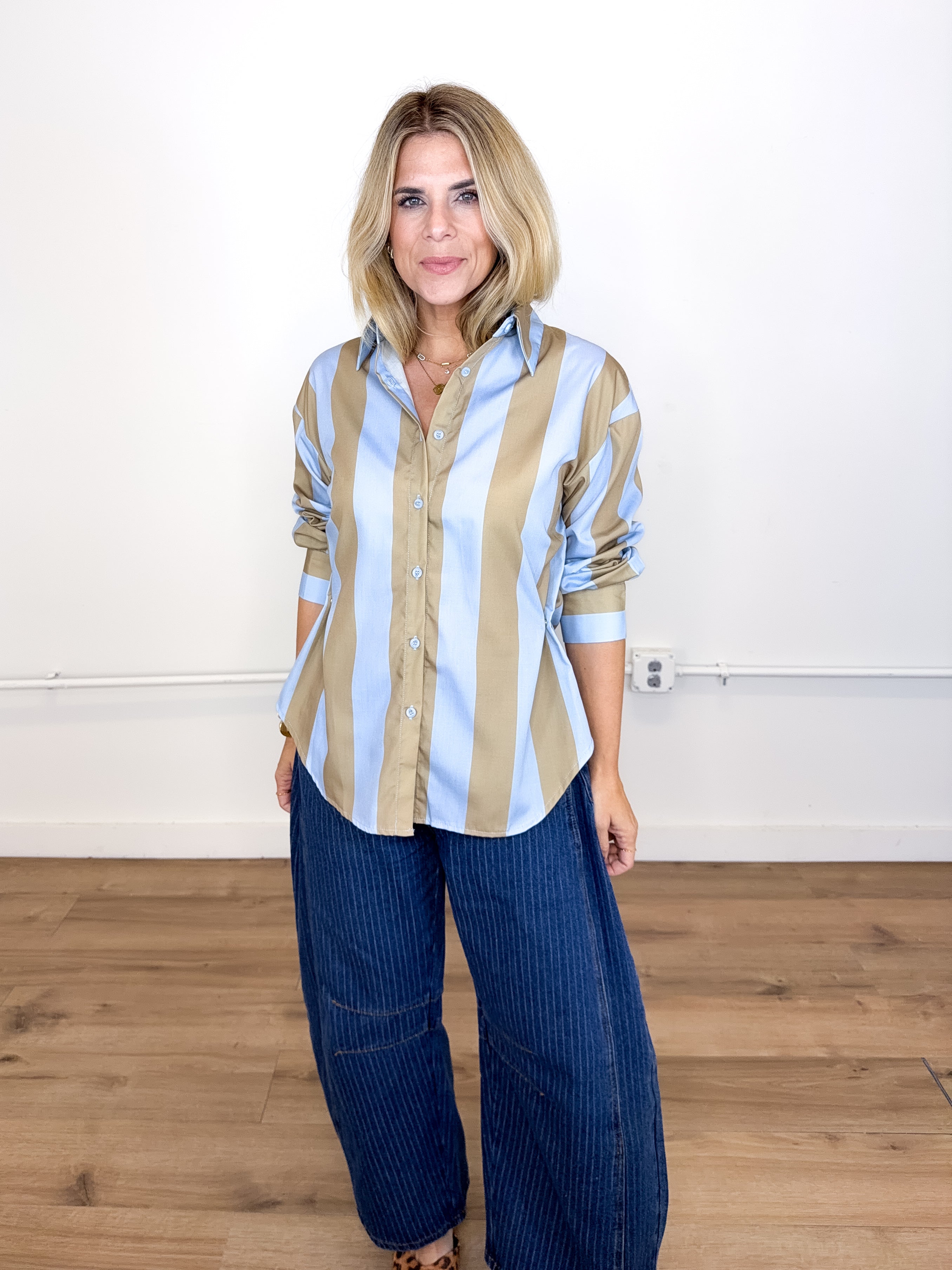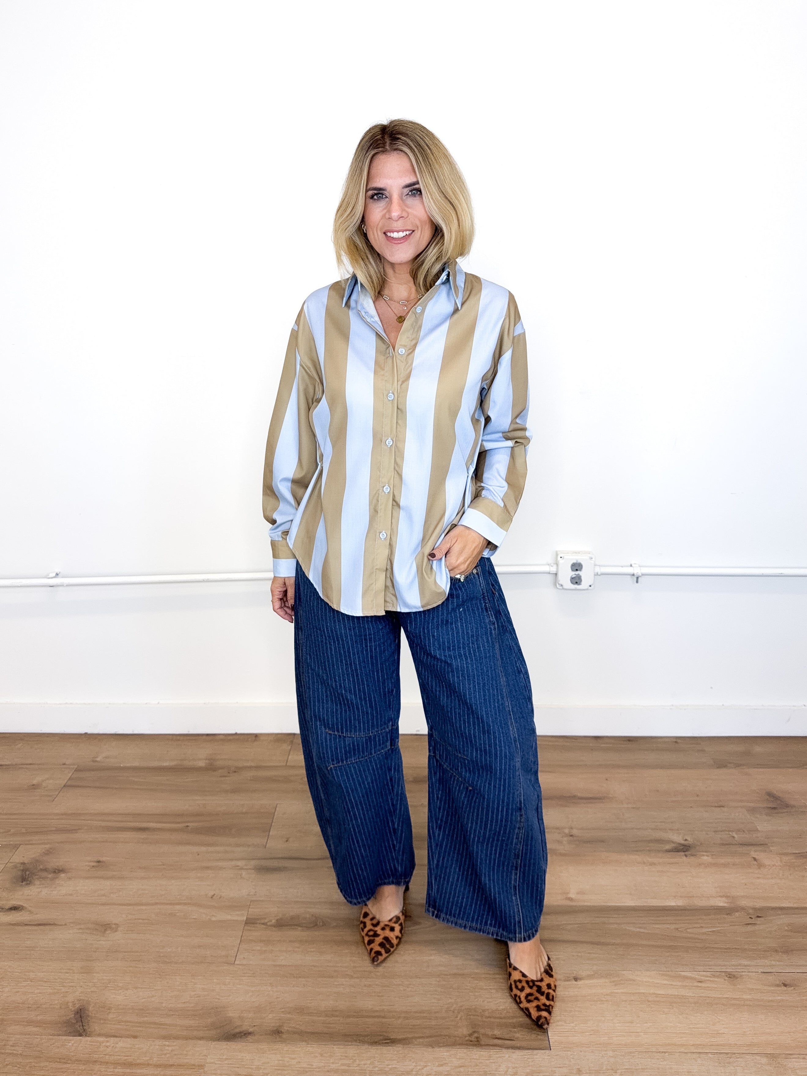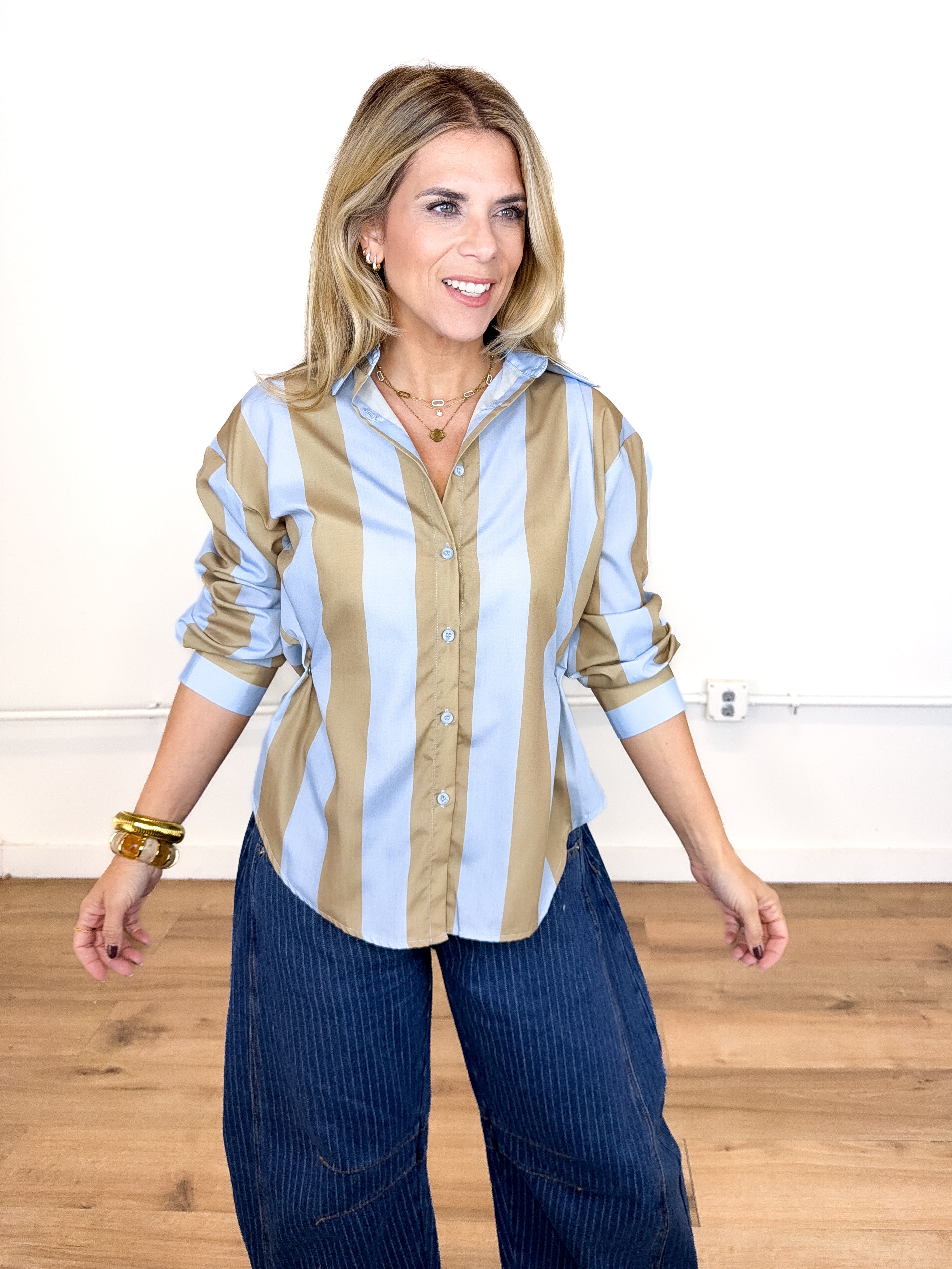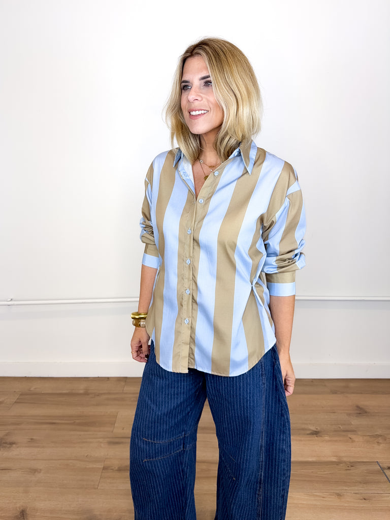 The Sterling Top will be the one you reach for over and over! This blue and camel stripe blouse features a collar, pocket front, button front, with side snaps for a tailored fit and long sleeves. Pairs well with everything from denim, flats, heels, dress pants, boots and more!