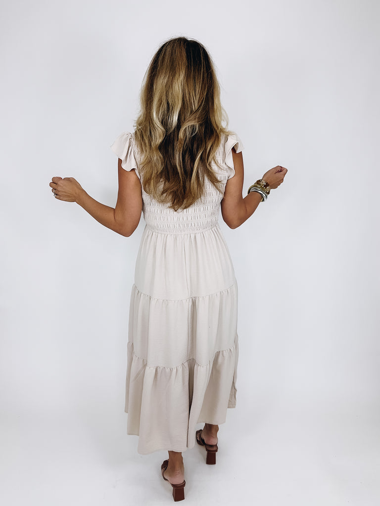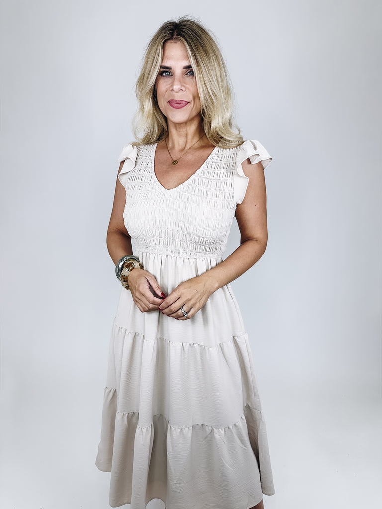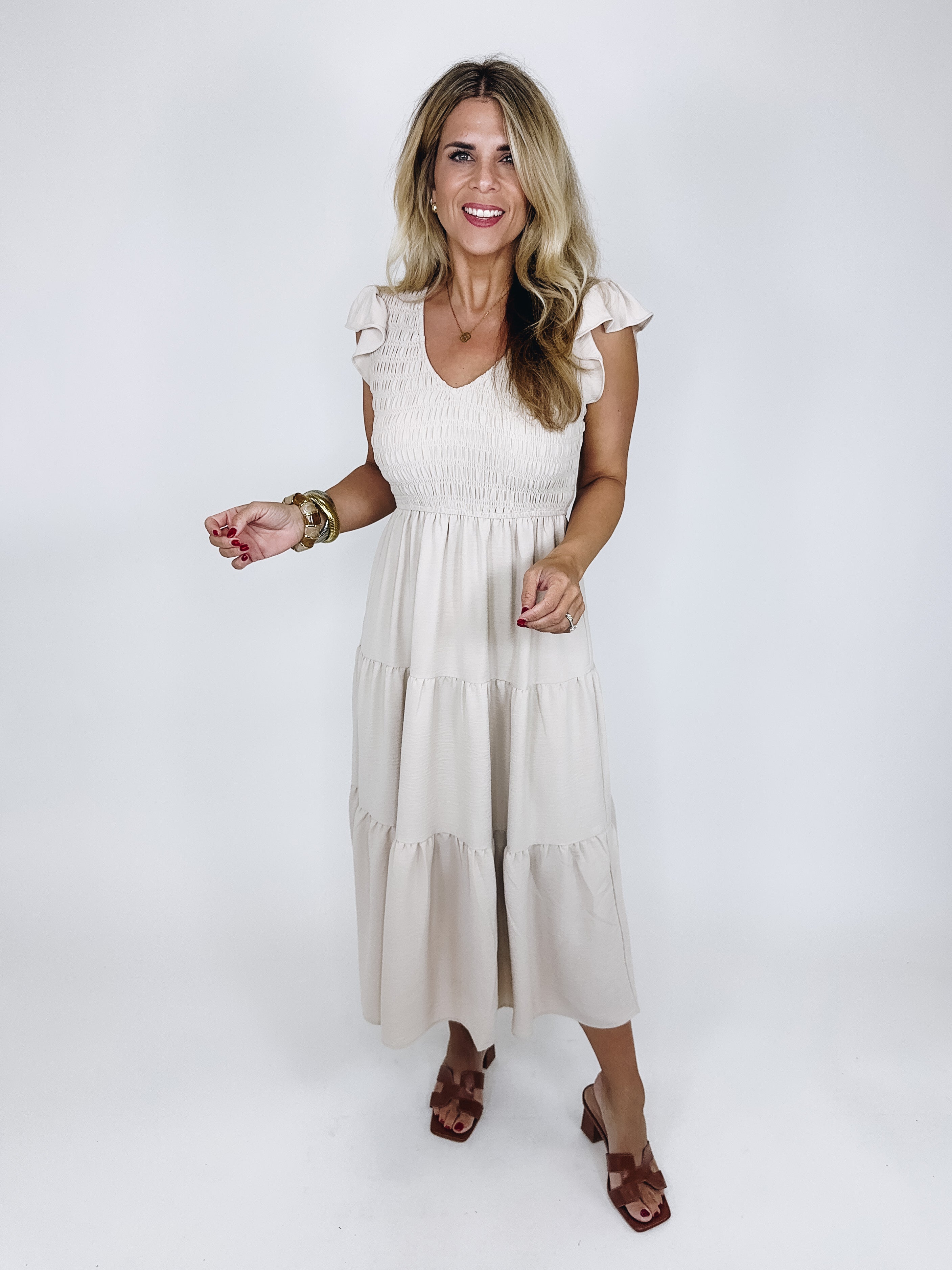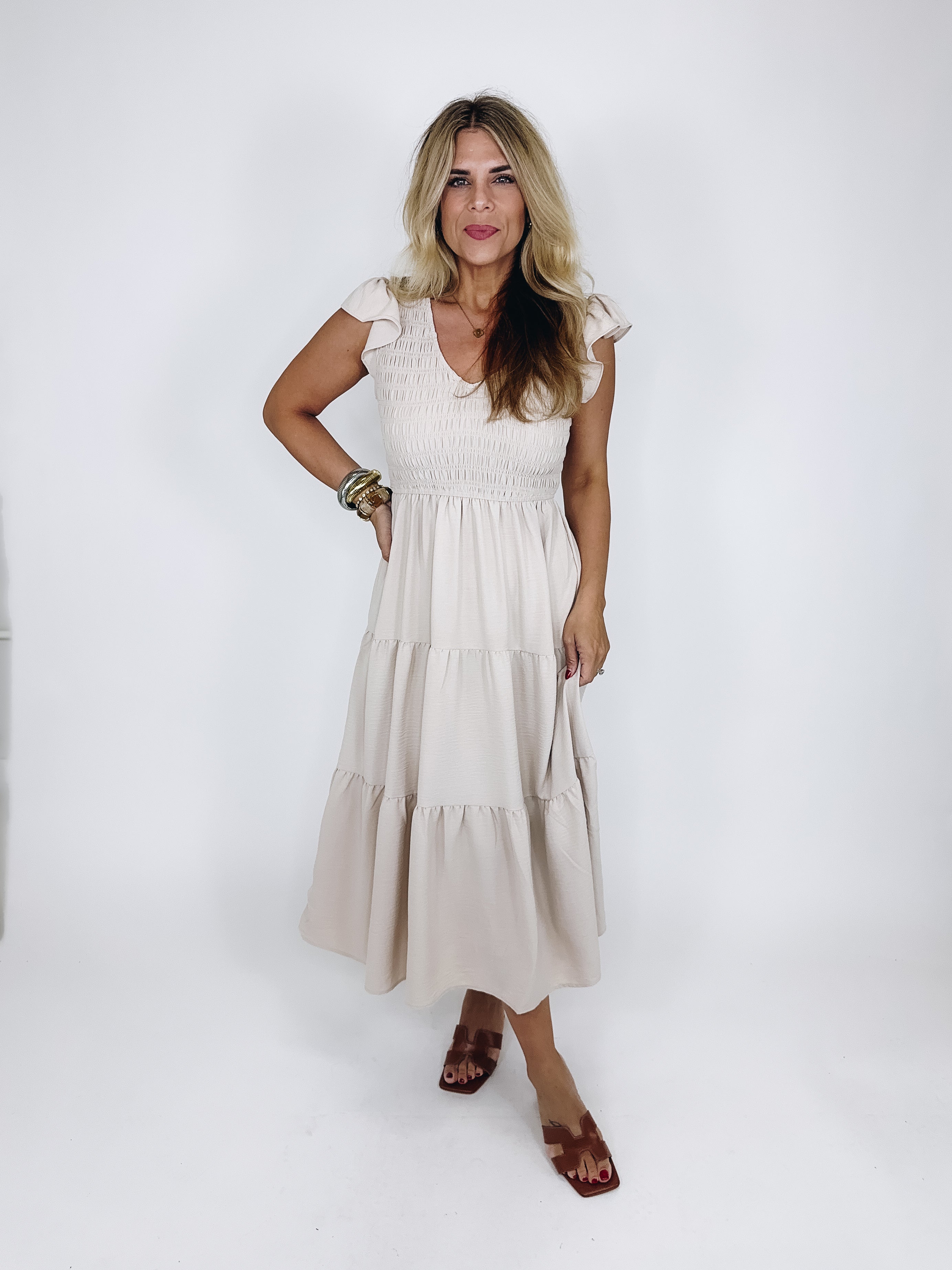 The Story Dress is darling! This khaki midi dress features v- neck, smocked bodice, flutter sleeves and tiered skirt. Lined. Style with flats, heels or sandals. Fits true to size.