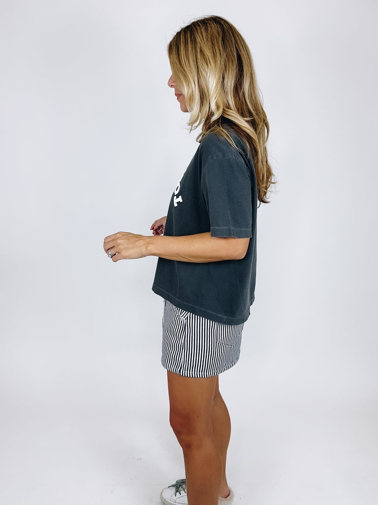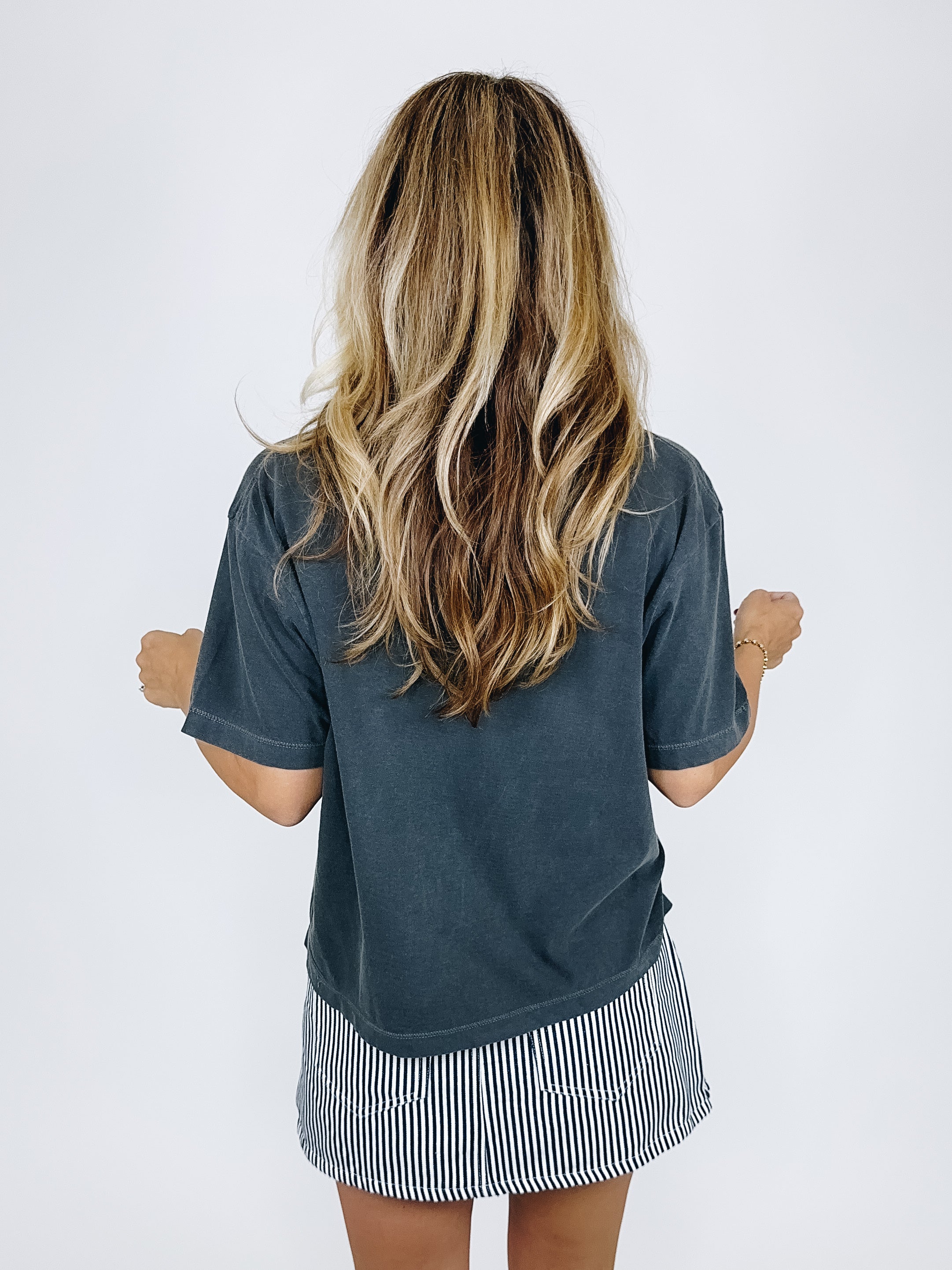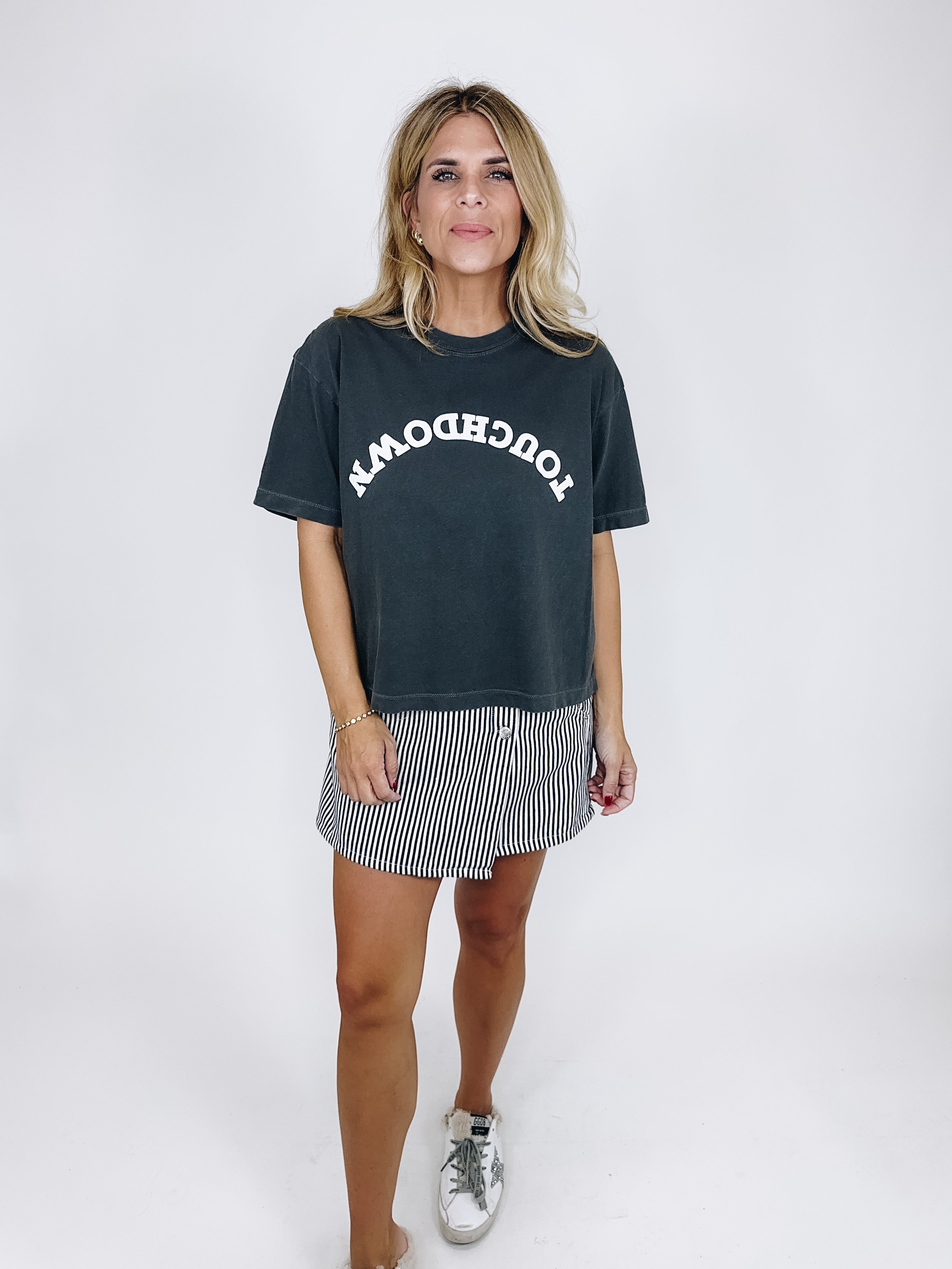 This Cropped tee is the perfect tee for game day. This soft charcoal comfort colors tee features short sleeves, backwards and upside down touchdown graphic and a boxy crop fit. Pair with denim, flats, athletic shorts, leggings and sneakers. Relaxed fit. Fits true to size.