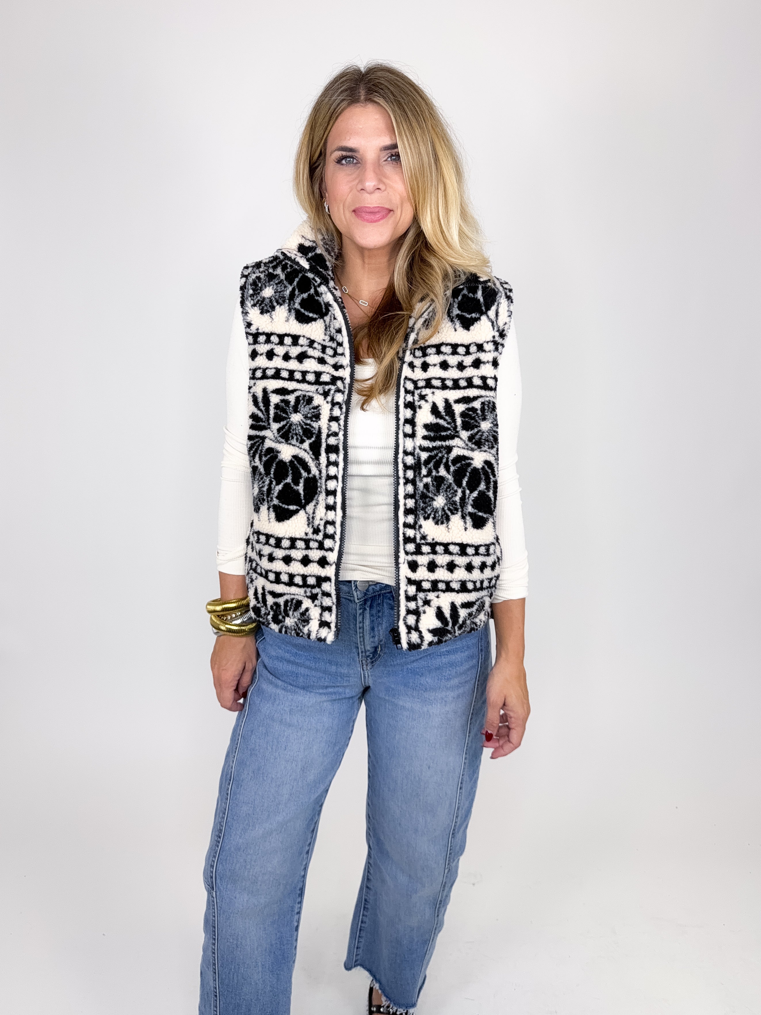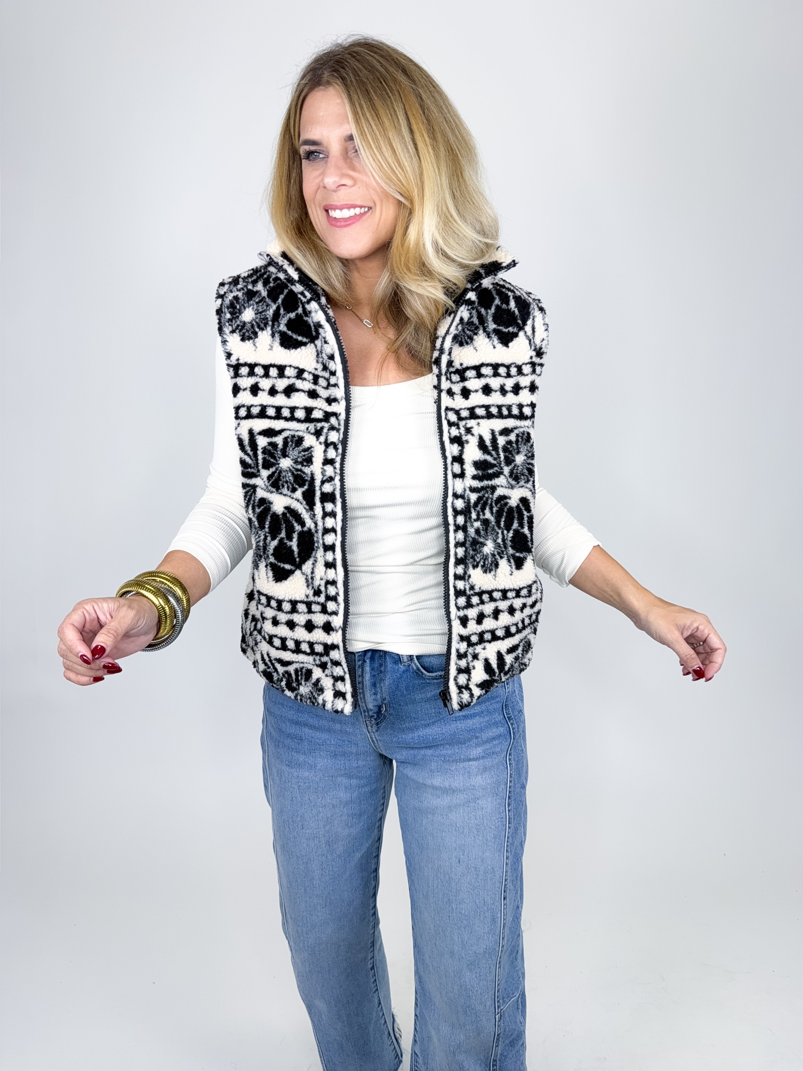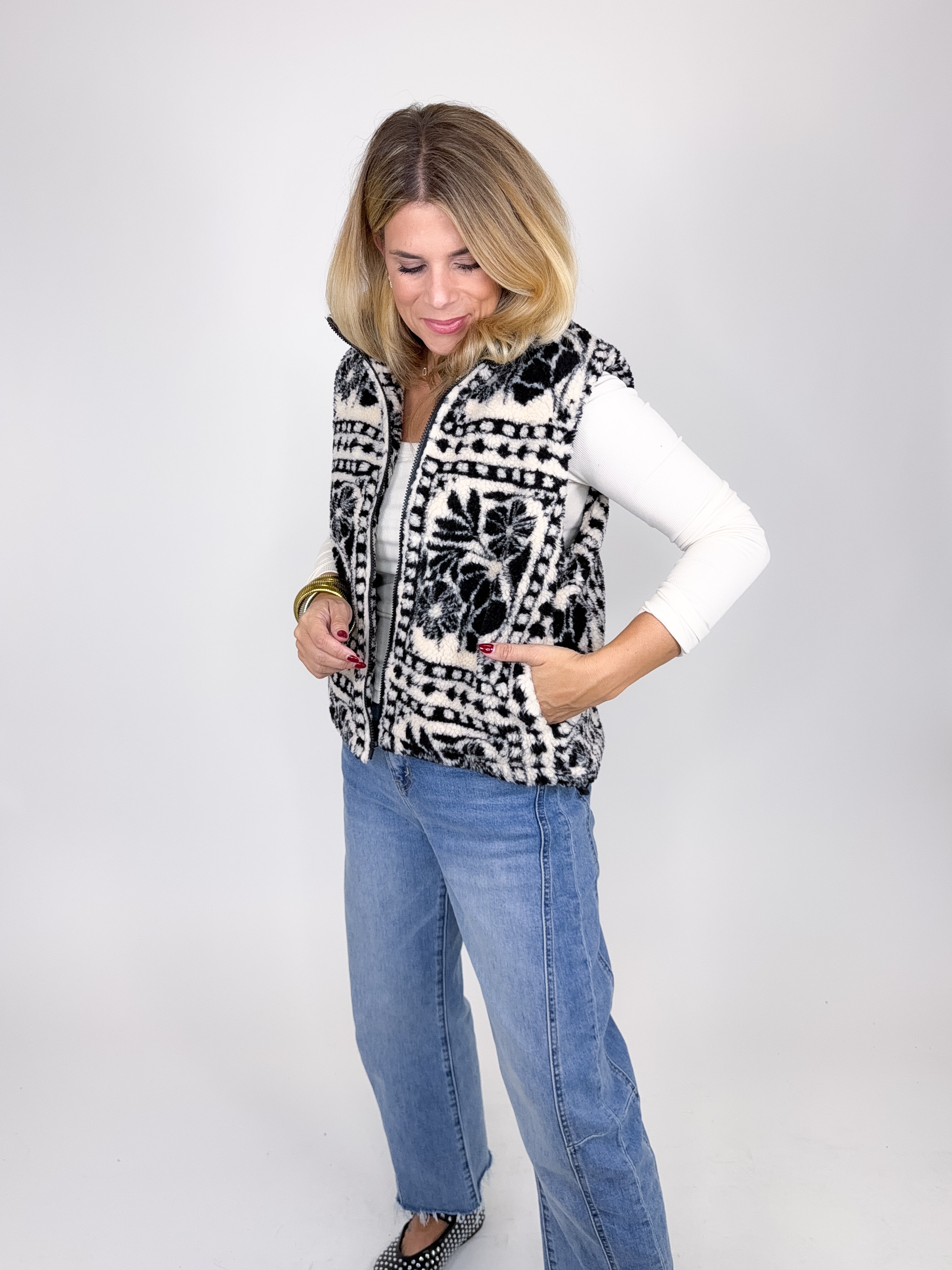 The Wilder Vest is a darling sherpa vest. This black and cream floral pattern vest features a stand up collar with a zipper front and pockets. Wear it over a dress, with tops and denim and athletic gear. Lined. Dress up or down. Fits true to size.