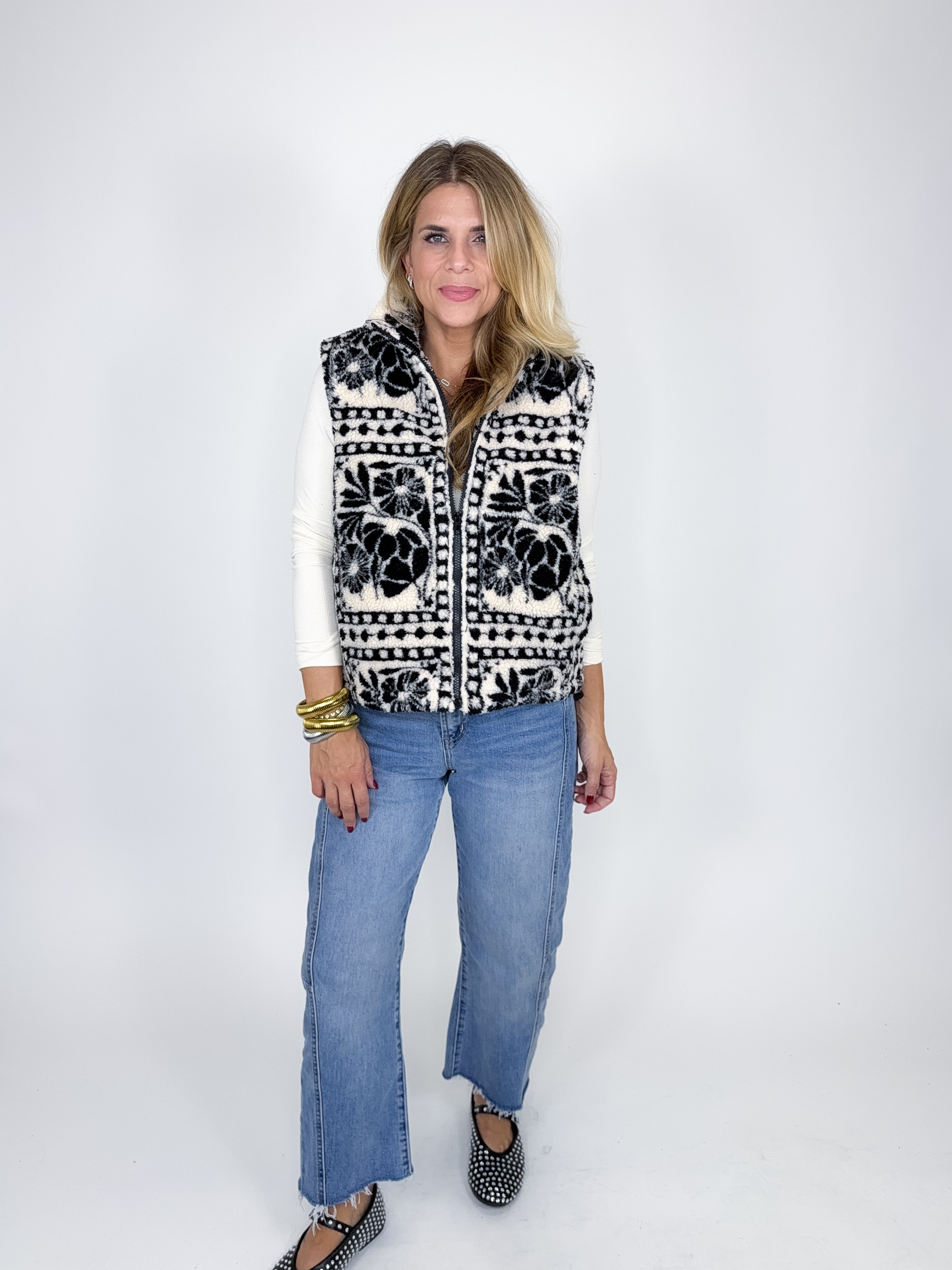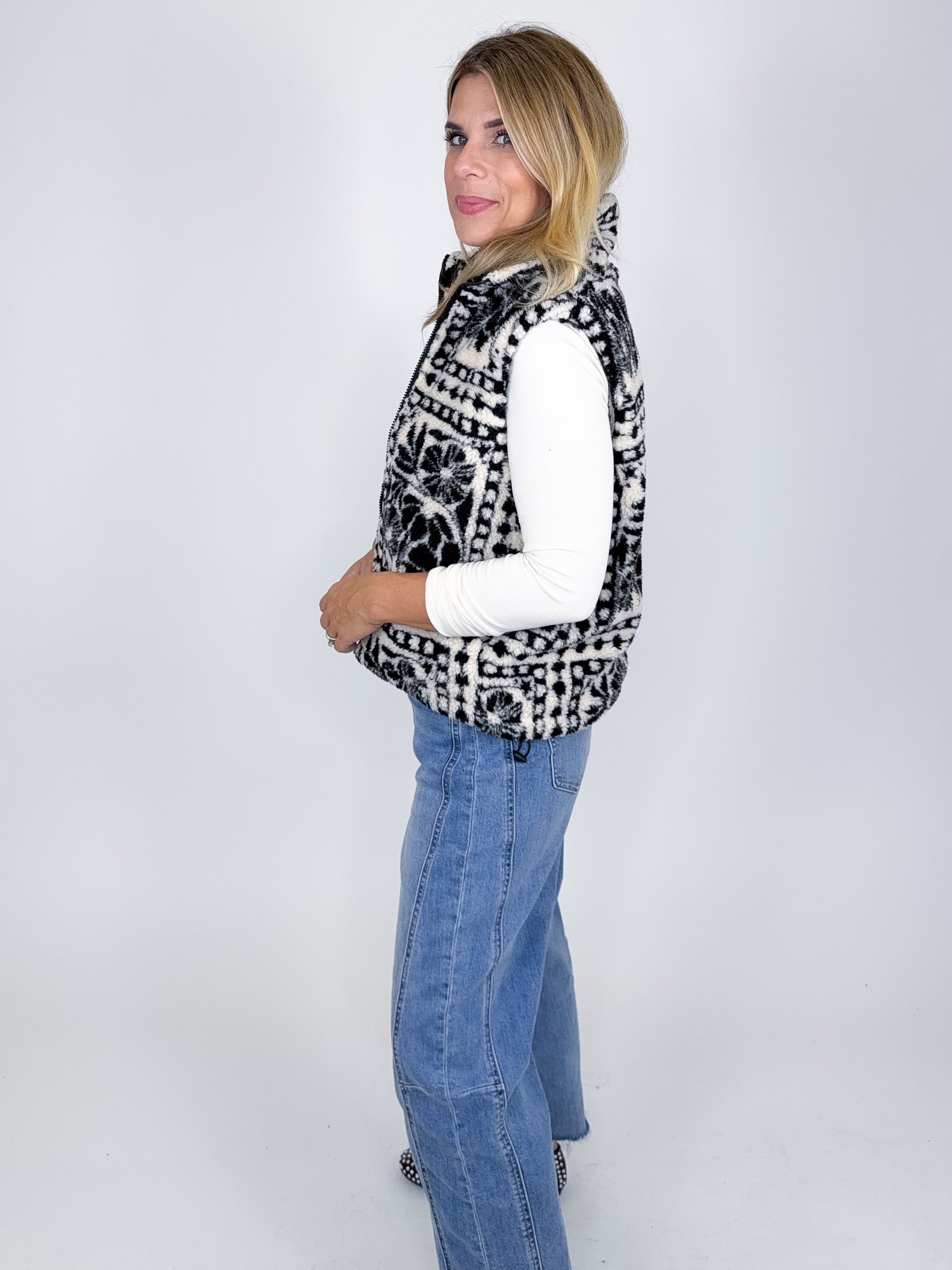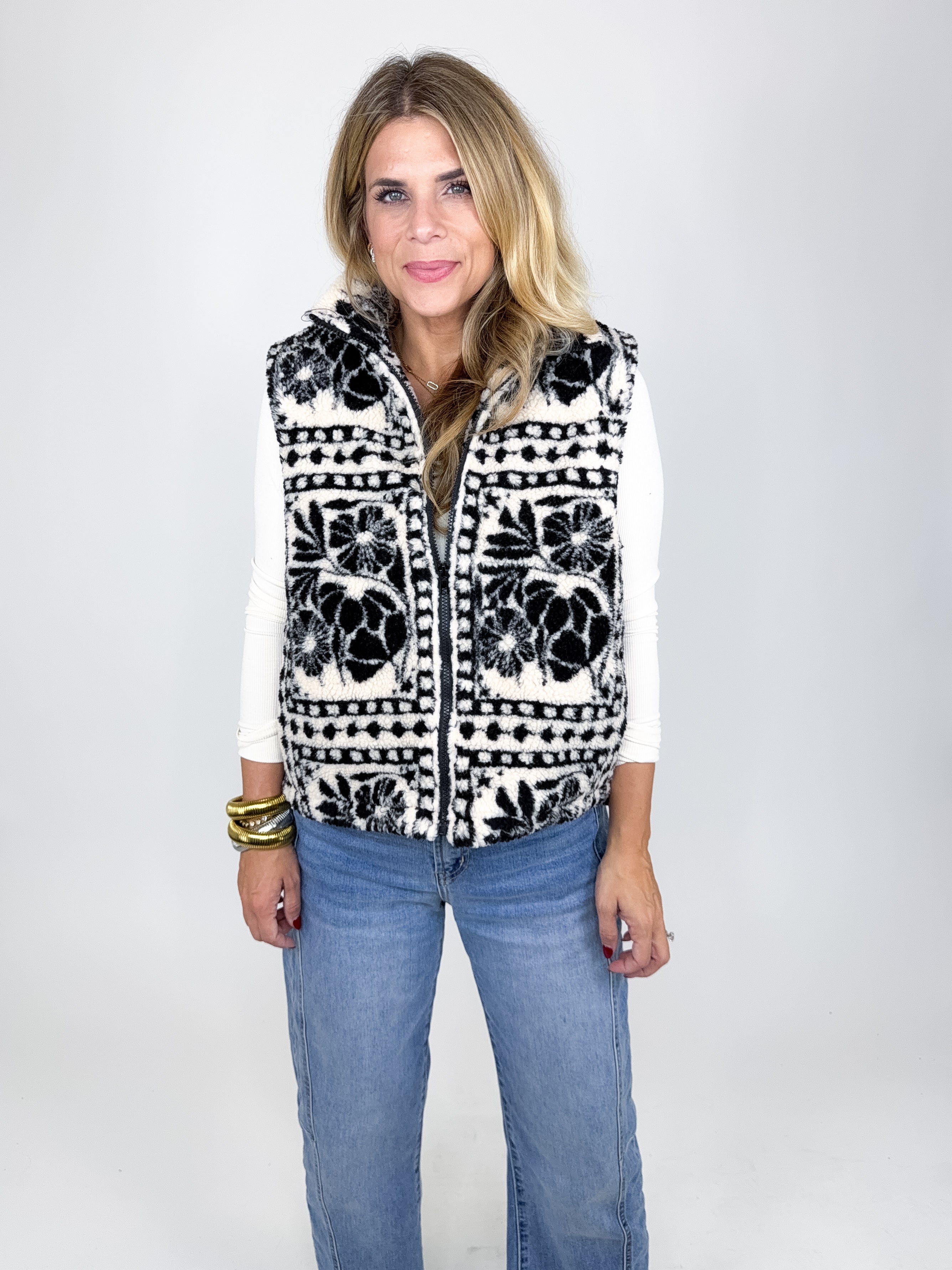 The Wilder Vest is a darling sherpa vest. This black and cream floral pattern vest features a stand up collar with a zipper front and pockets. Wear it over a dress, with tops and denim and athletic gear. Lined. Dress up or down. Fits true to size.