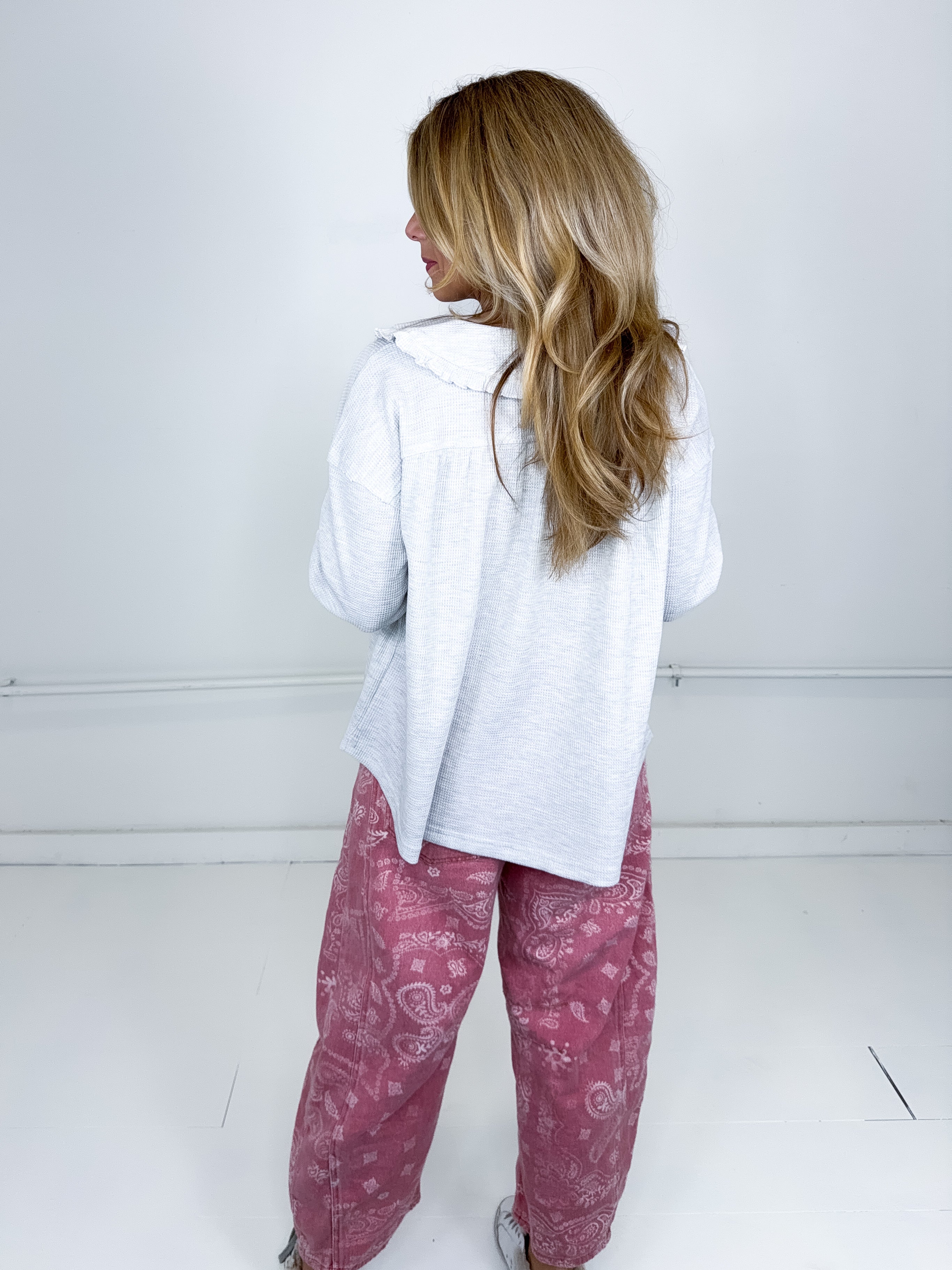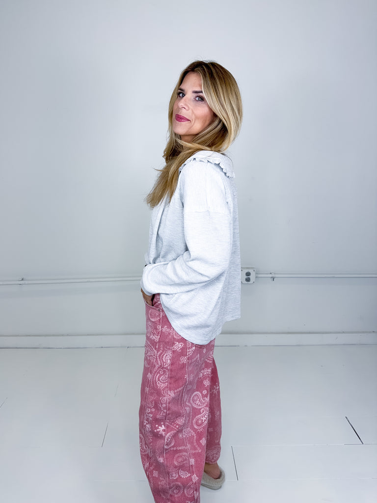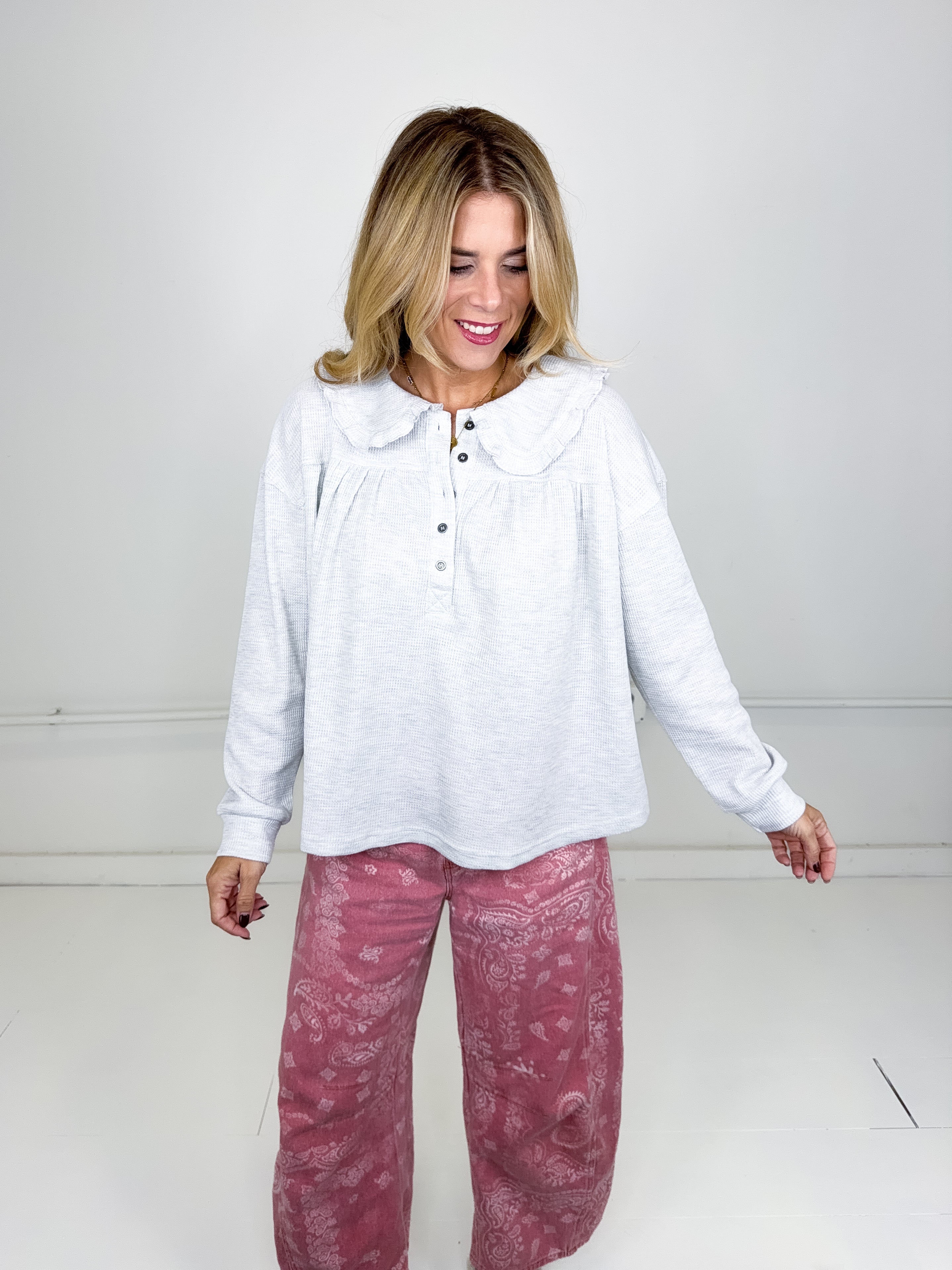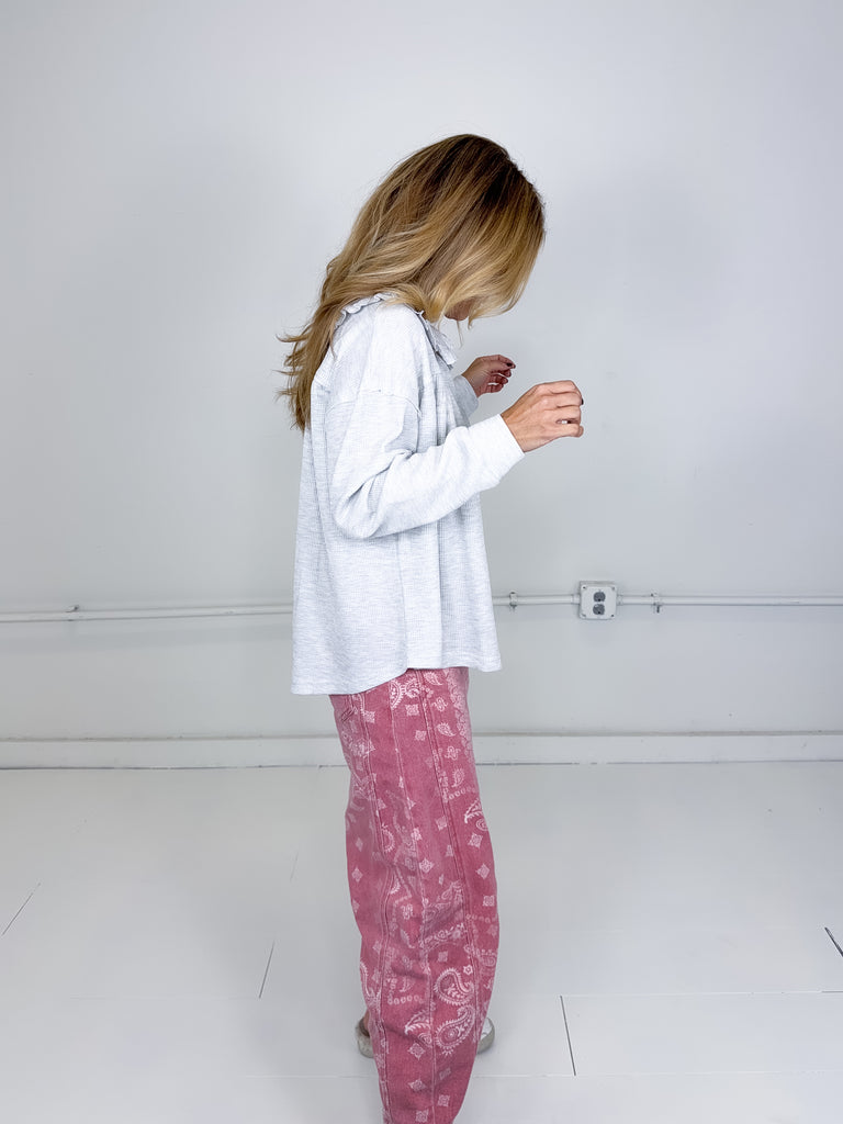 The Wren Top is the perfect everyday top! This grey thermal half button up top features a peter pan collar with ruffle details and long sleeves. Pairs well with everything from denim, flats, heels, skirts and more!