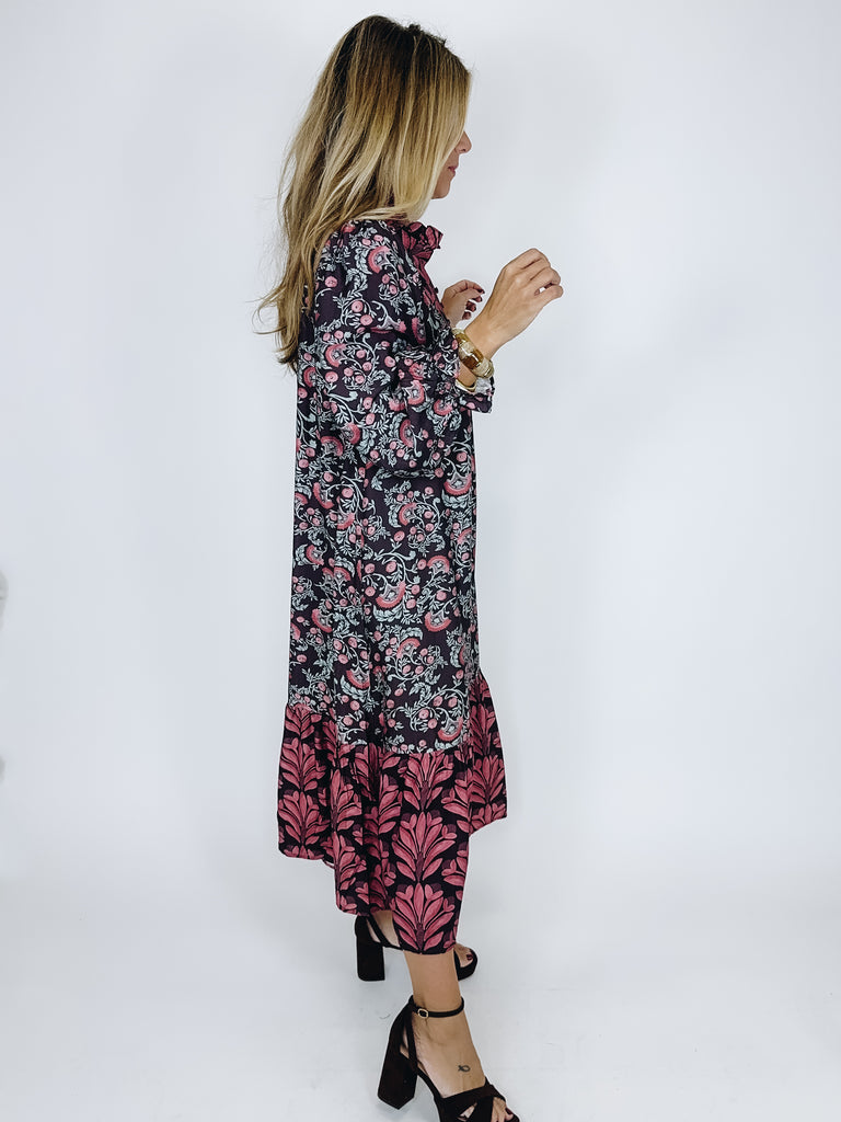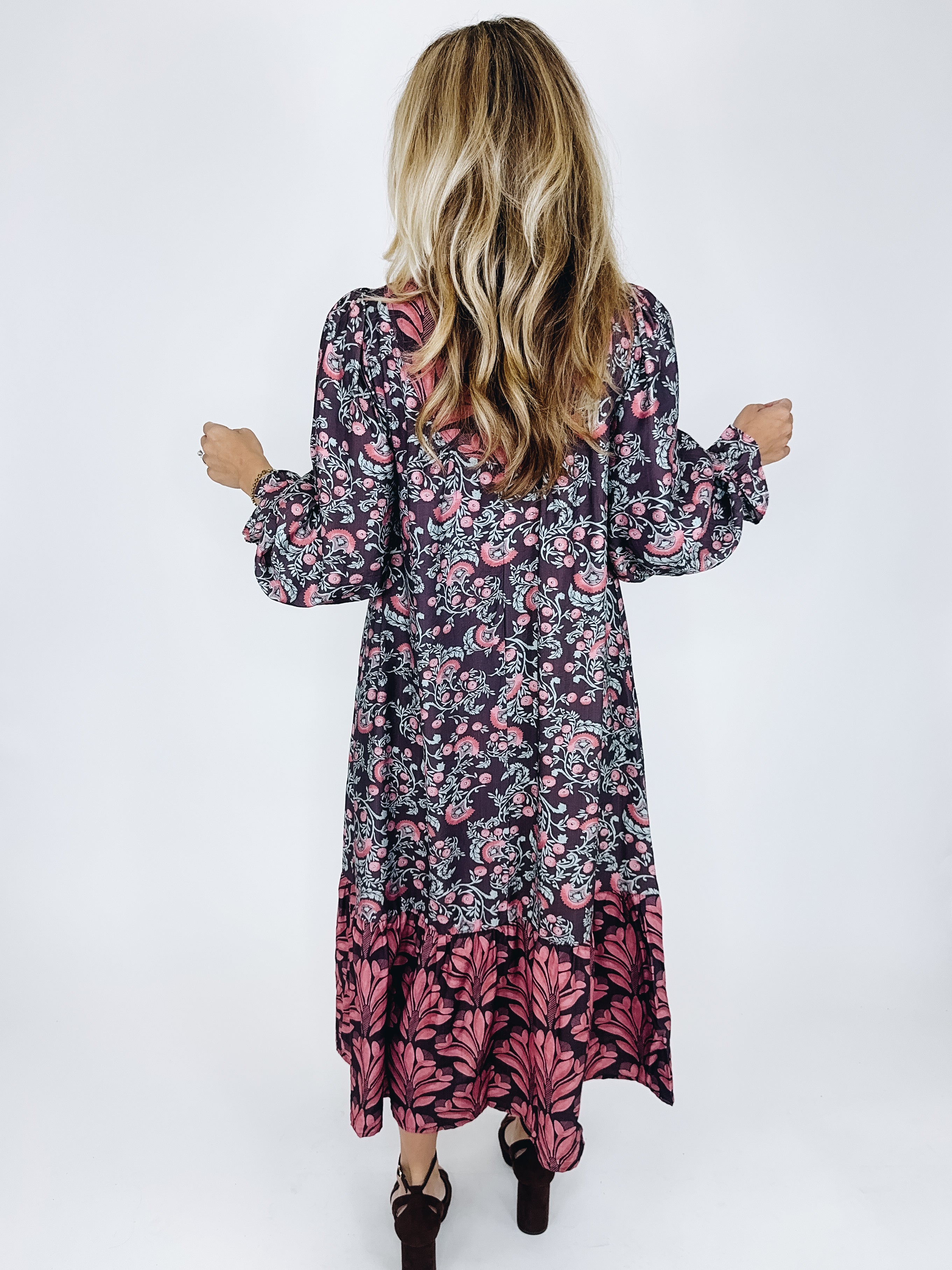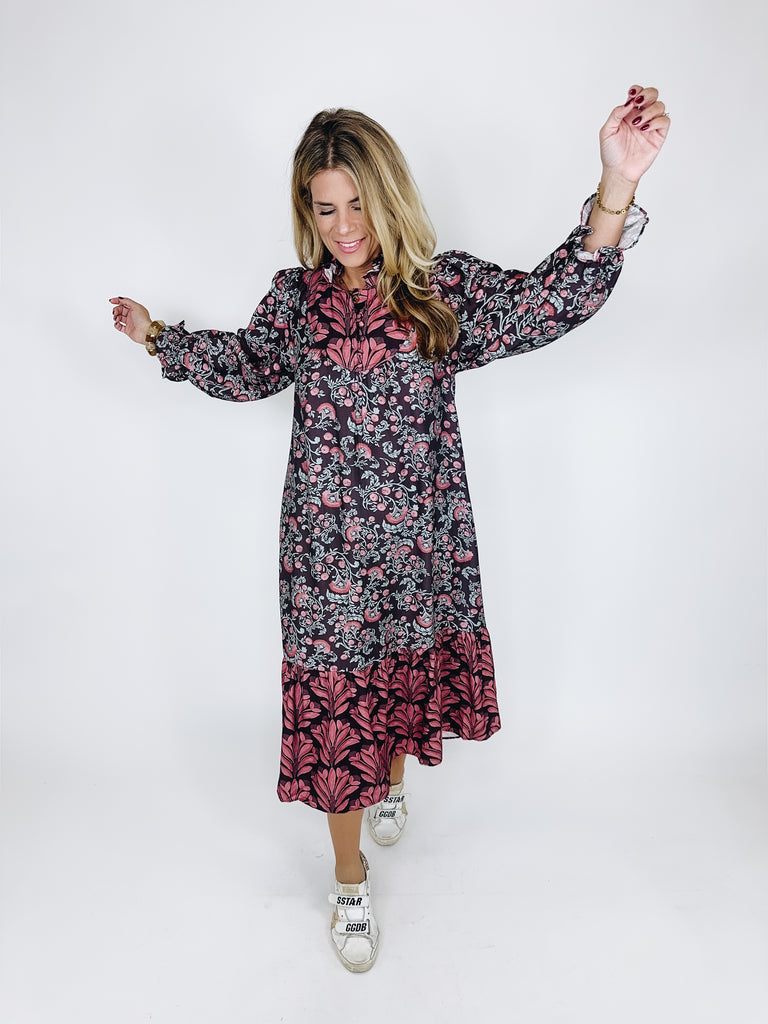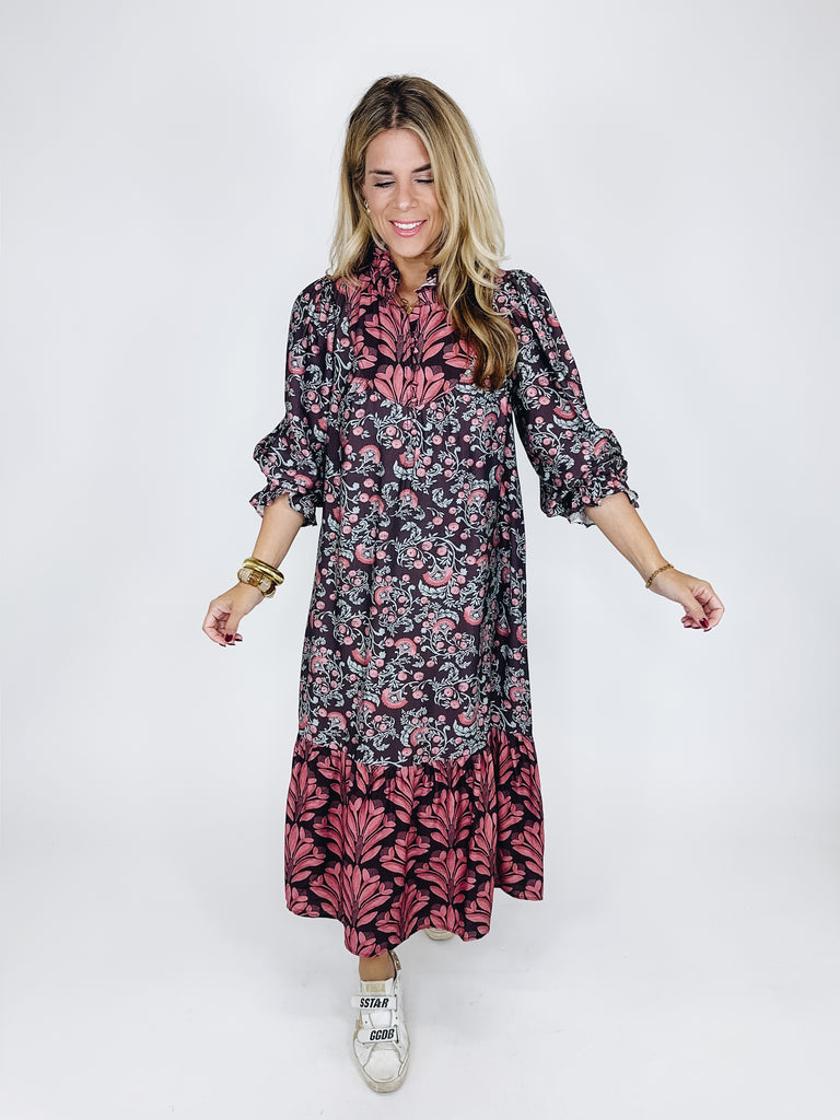 The Wynn Dress is a must have. This pink and brown boho print mix print maxi dress features long sleeves, button front with a ruffle neckline and an easy fit roomy silhouette. Pockets. Style with flats, heels, wedges, boots and sneakers! Fits true to size.