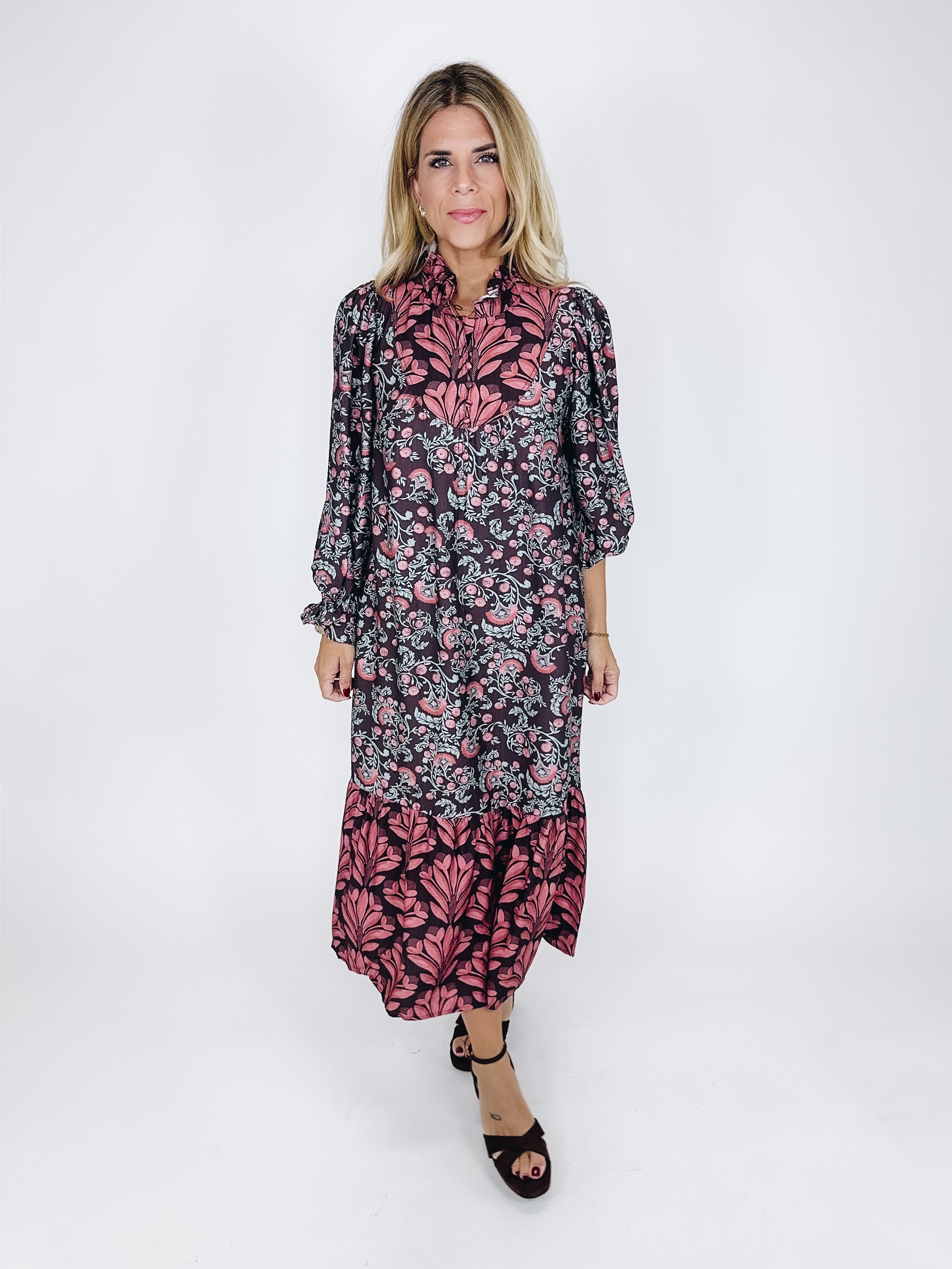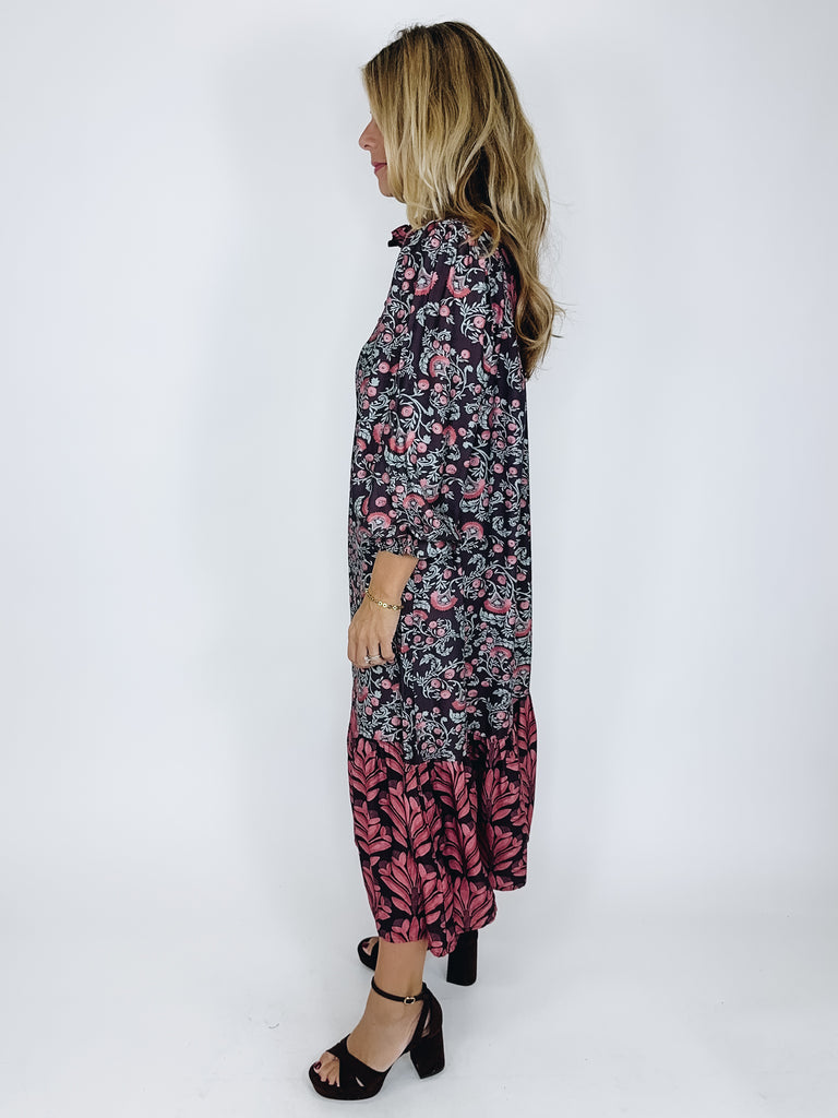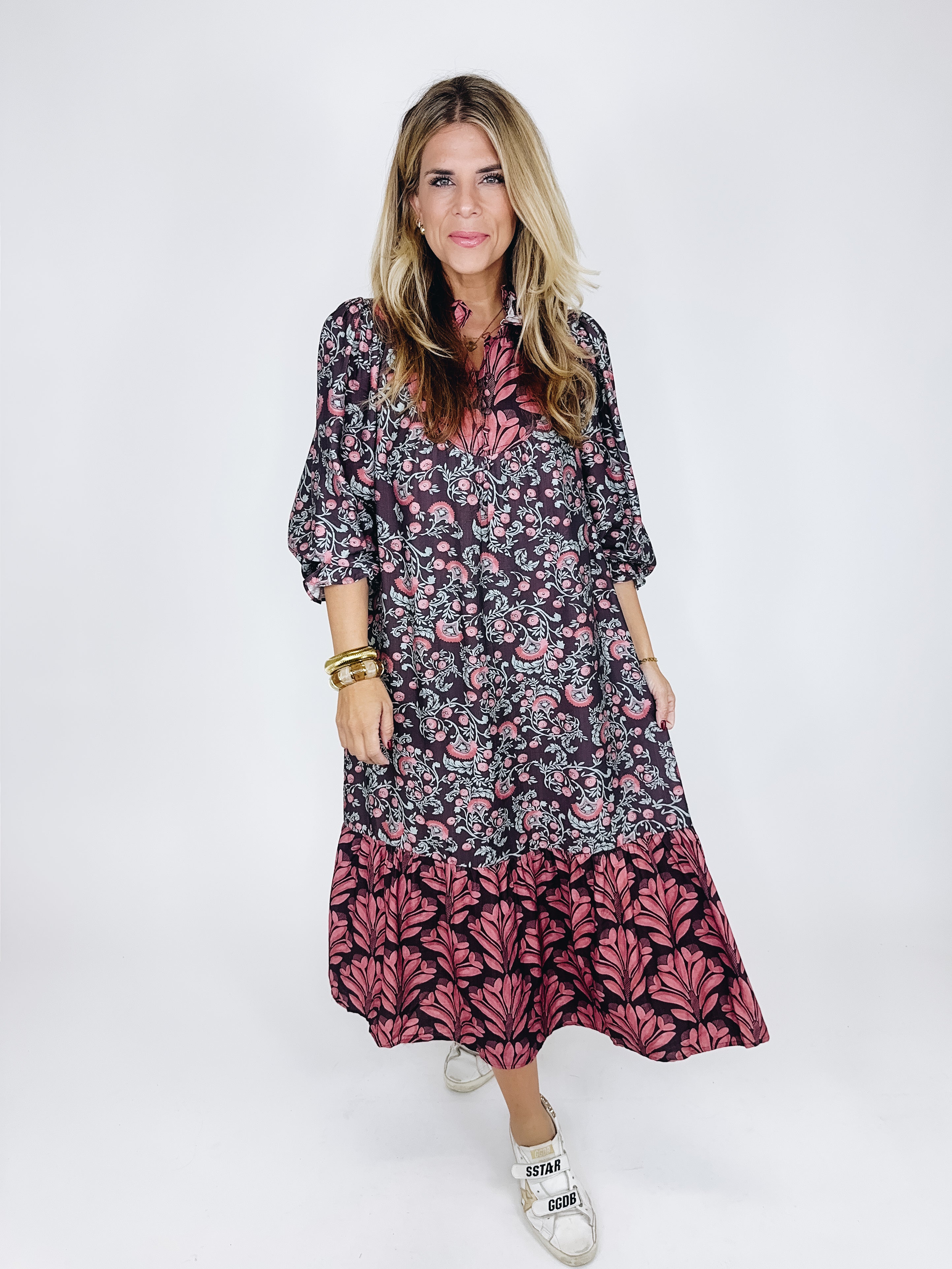 The Wynn Dress is a must have. This pink and brown boho print mix print maxi dress features long sleeves, button front with a ruffle neckline and an easy fit roomy silhouette. Pockets. Style with flats, heels, wedges, boots and sneakers! Fits true to size.
