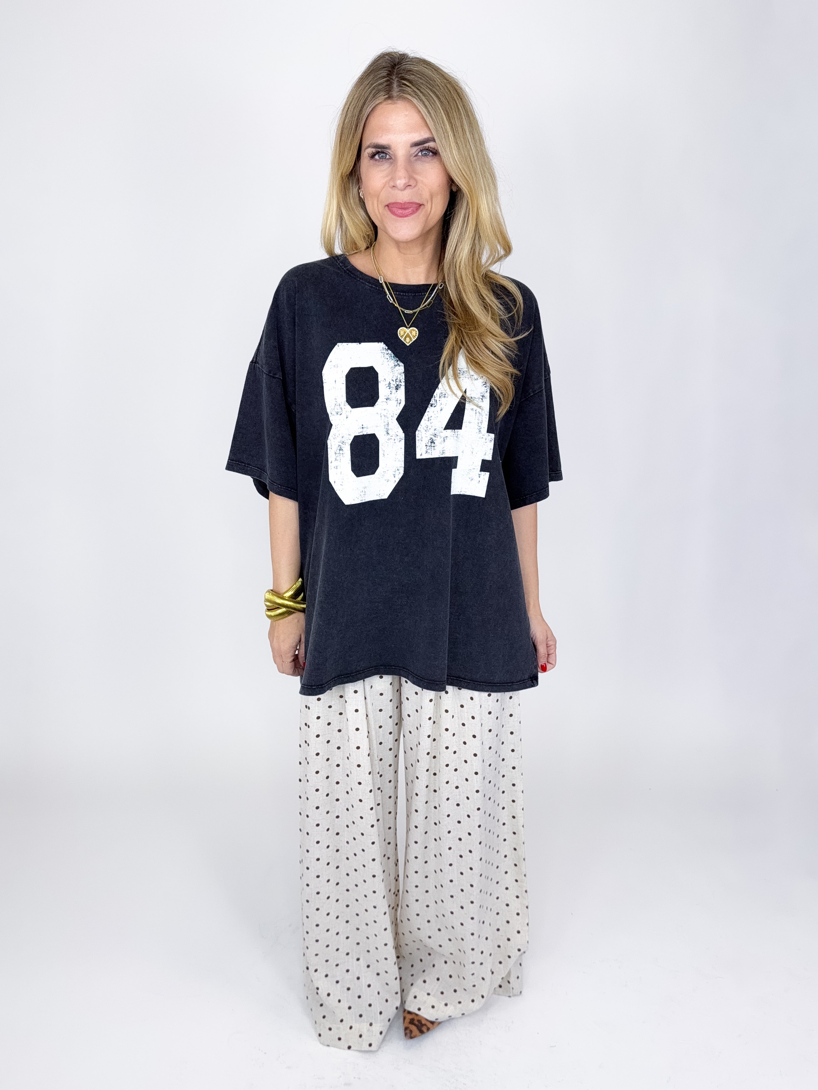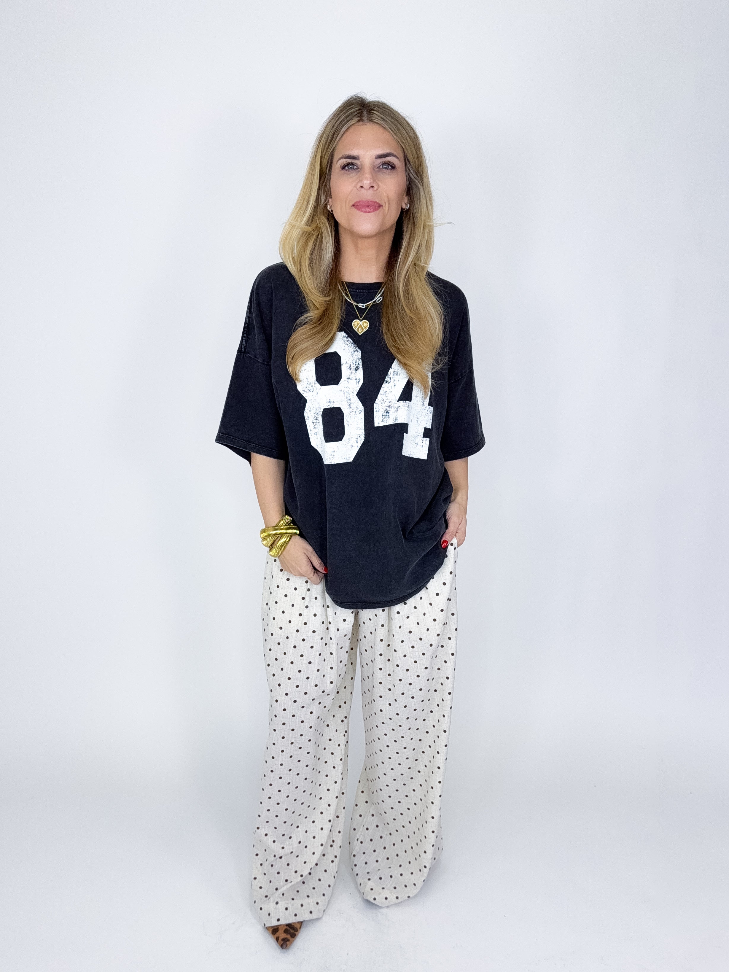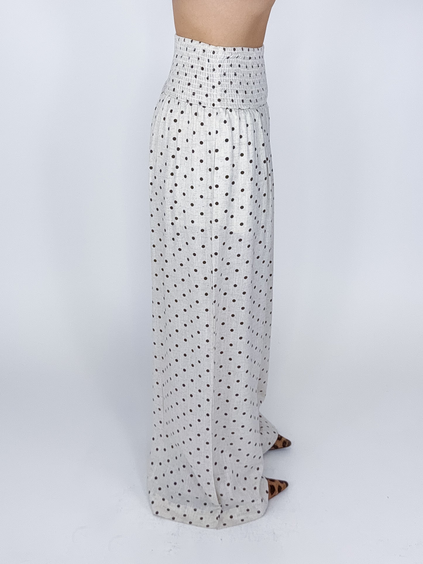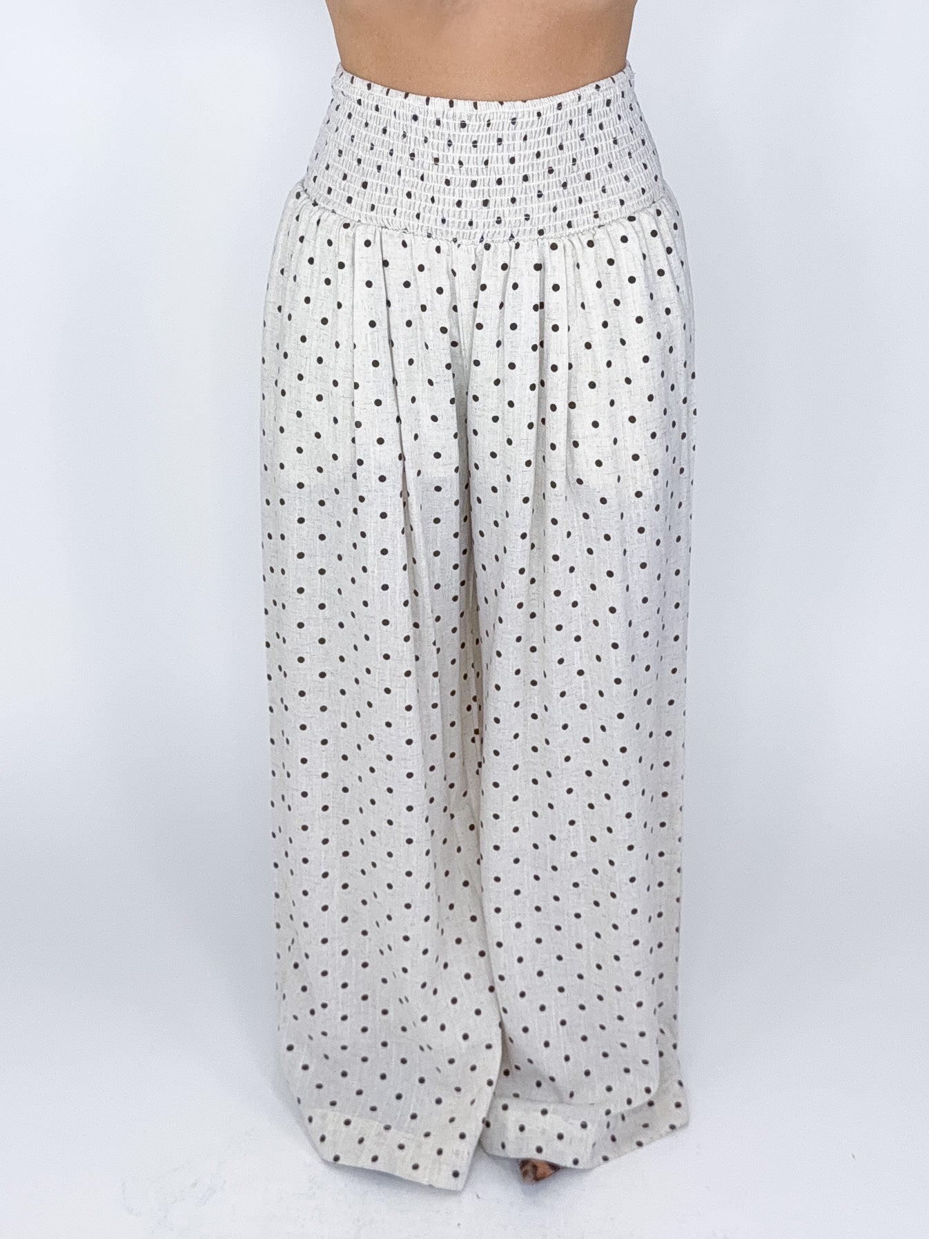 Our Adeline Pants are a tan and chocolate polka dot wide leg pant. They feature a high rise smocked elastic waist. Lined to shorts length. Style with everything from your favorite tee and sneakers to a blouse or a sweater!