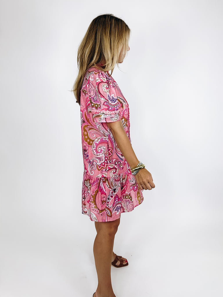 The Allison Dress is a showstopper! This pink paisley print mini dress features a V-neckline, short sleeves, button front and and a ruffle hem with decorative trim details. Lined. Pockets. Style with flats, heels, wedges or sneakers. Fits true to size.