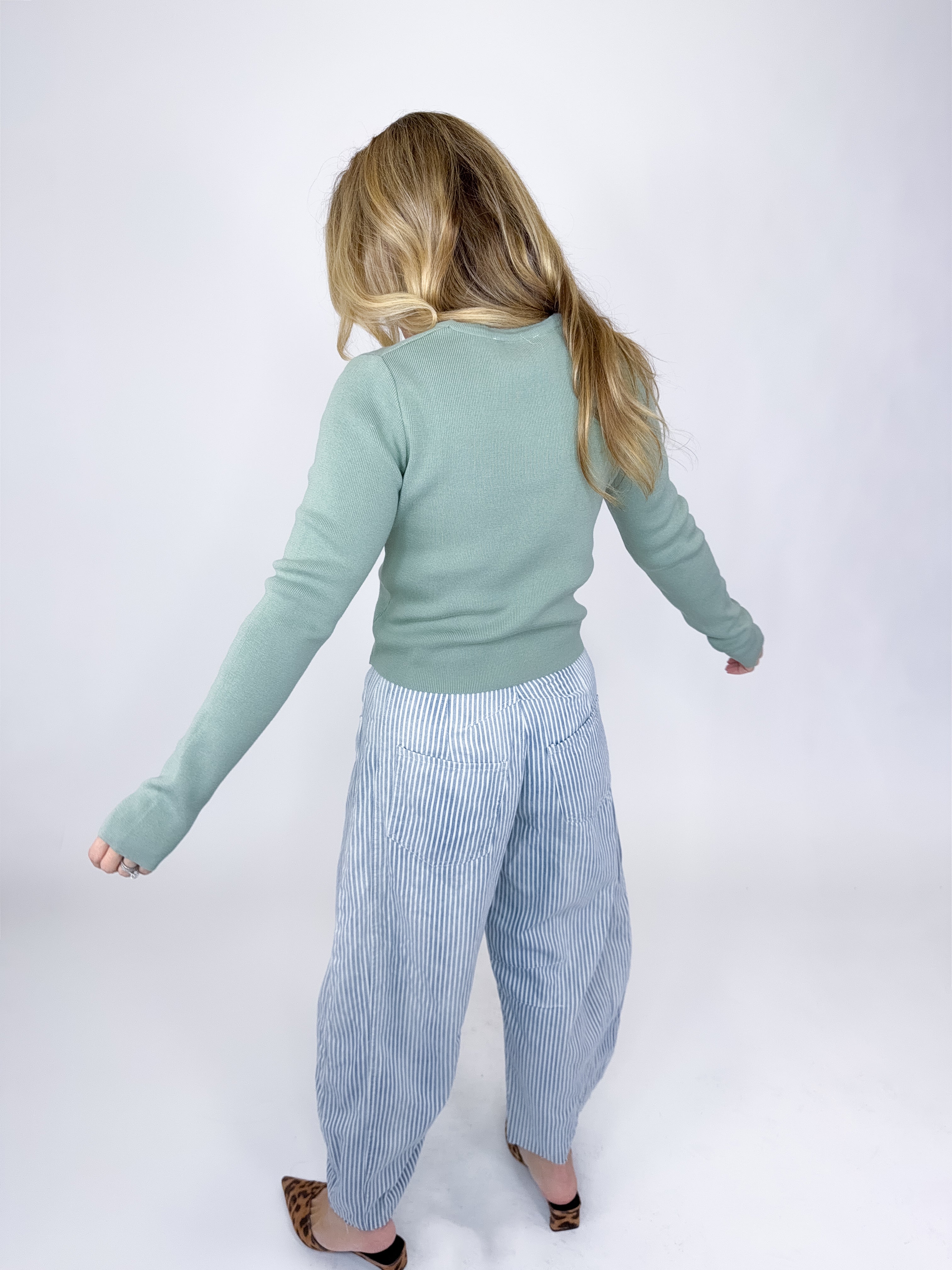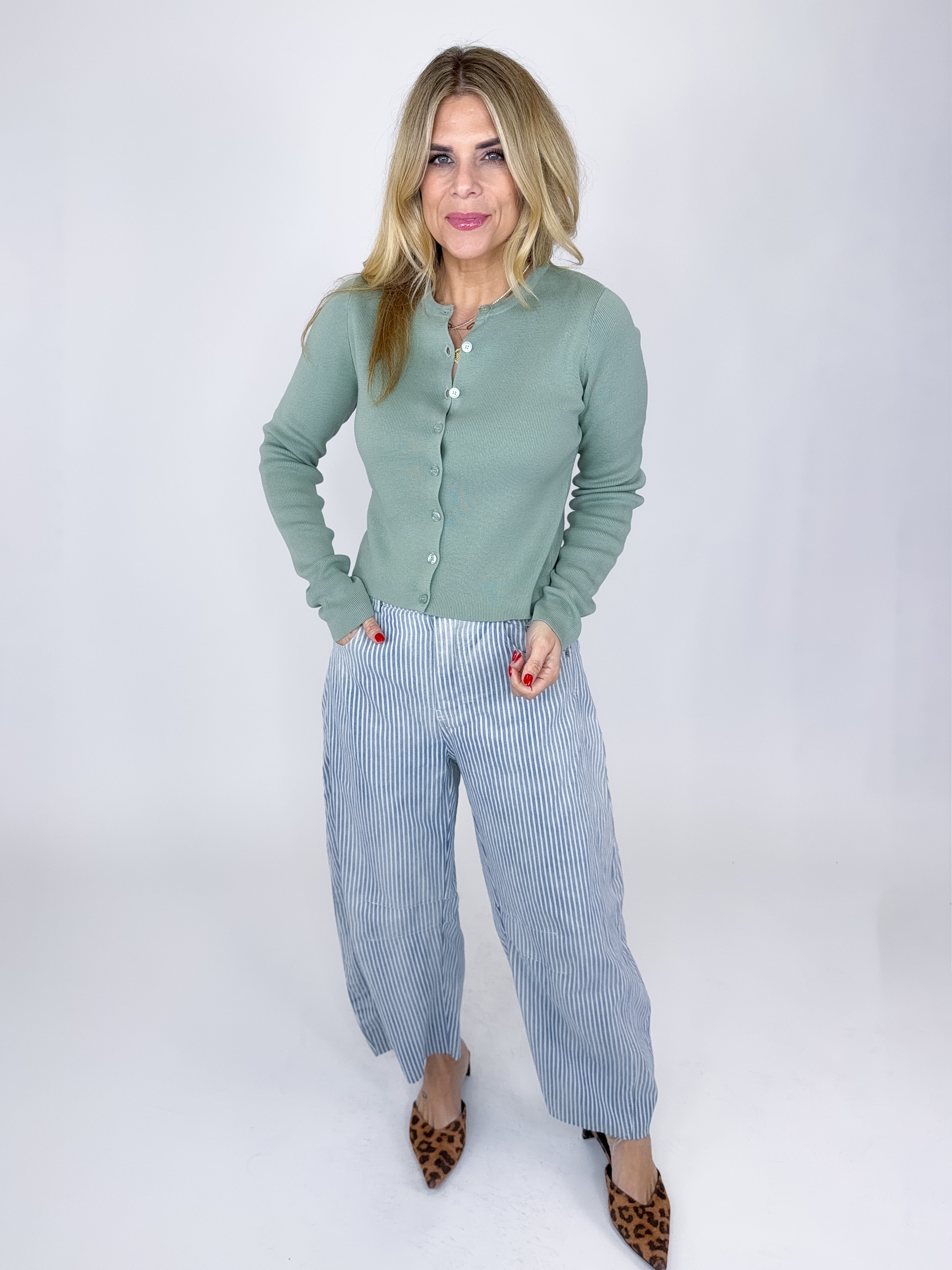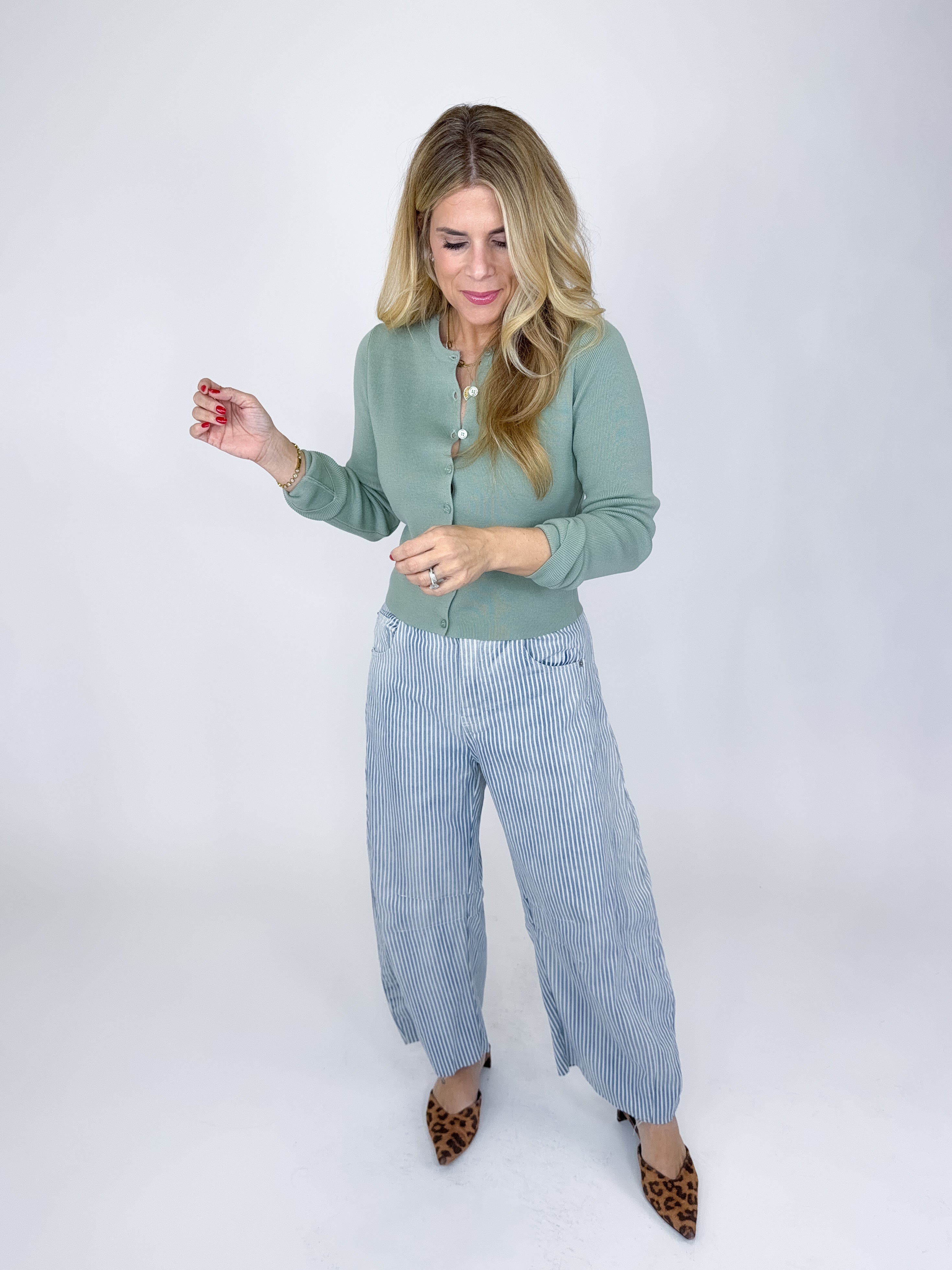 The Aniston Cardigan is the perfect everyday top! This sage green ribbed knit cardigan top, features a crew neck, button front, long sleeves, fitted silhouette and a skimmer length. This one feels so luxe! Pairs well with everything from denim, flats, heels, skirts and more!