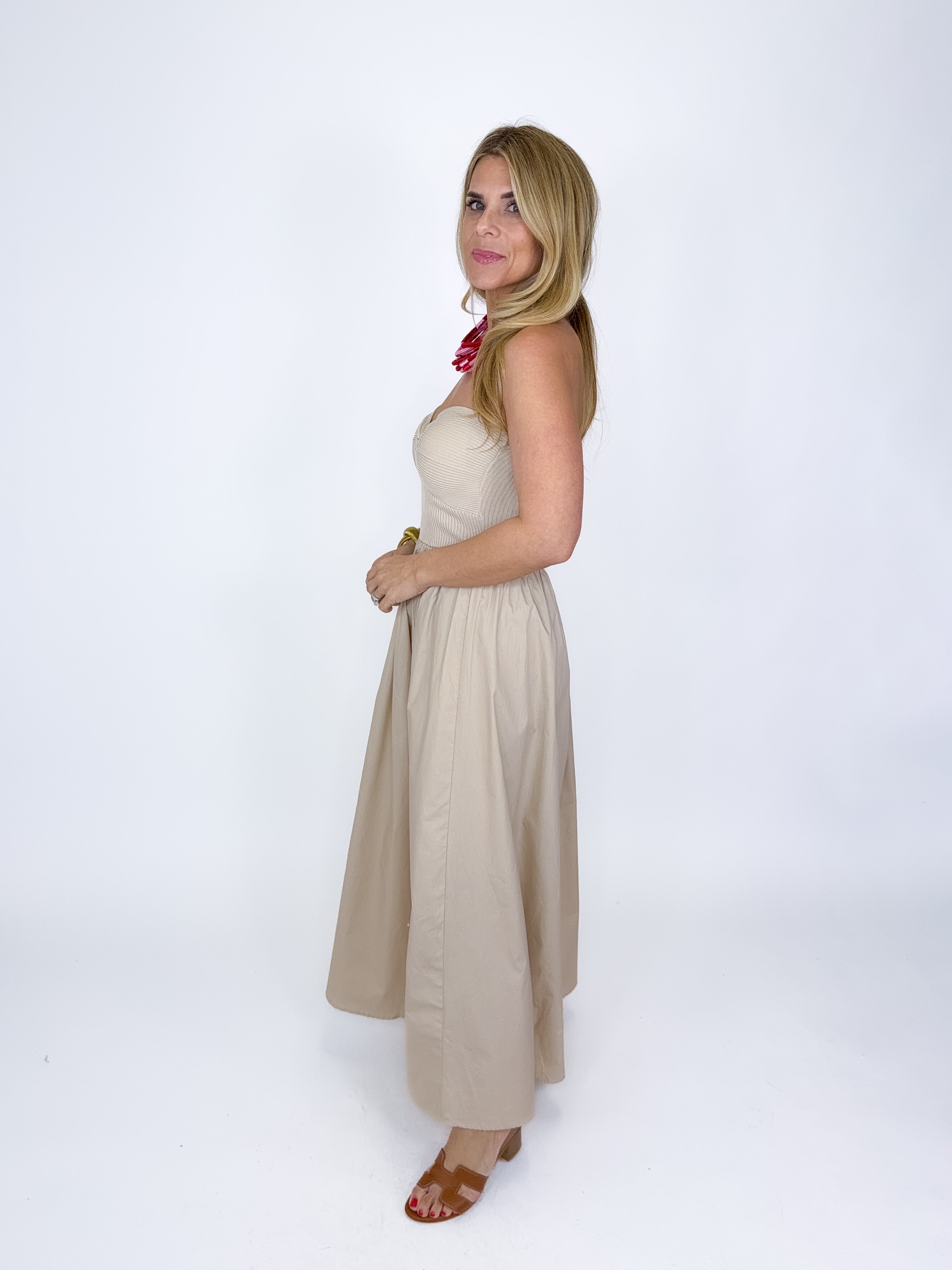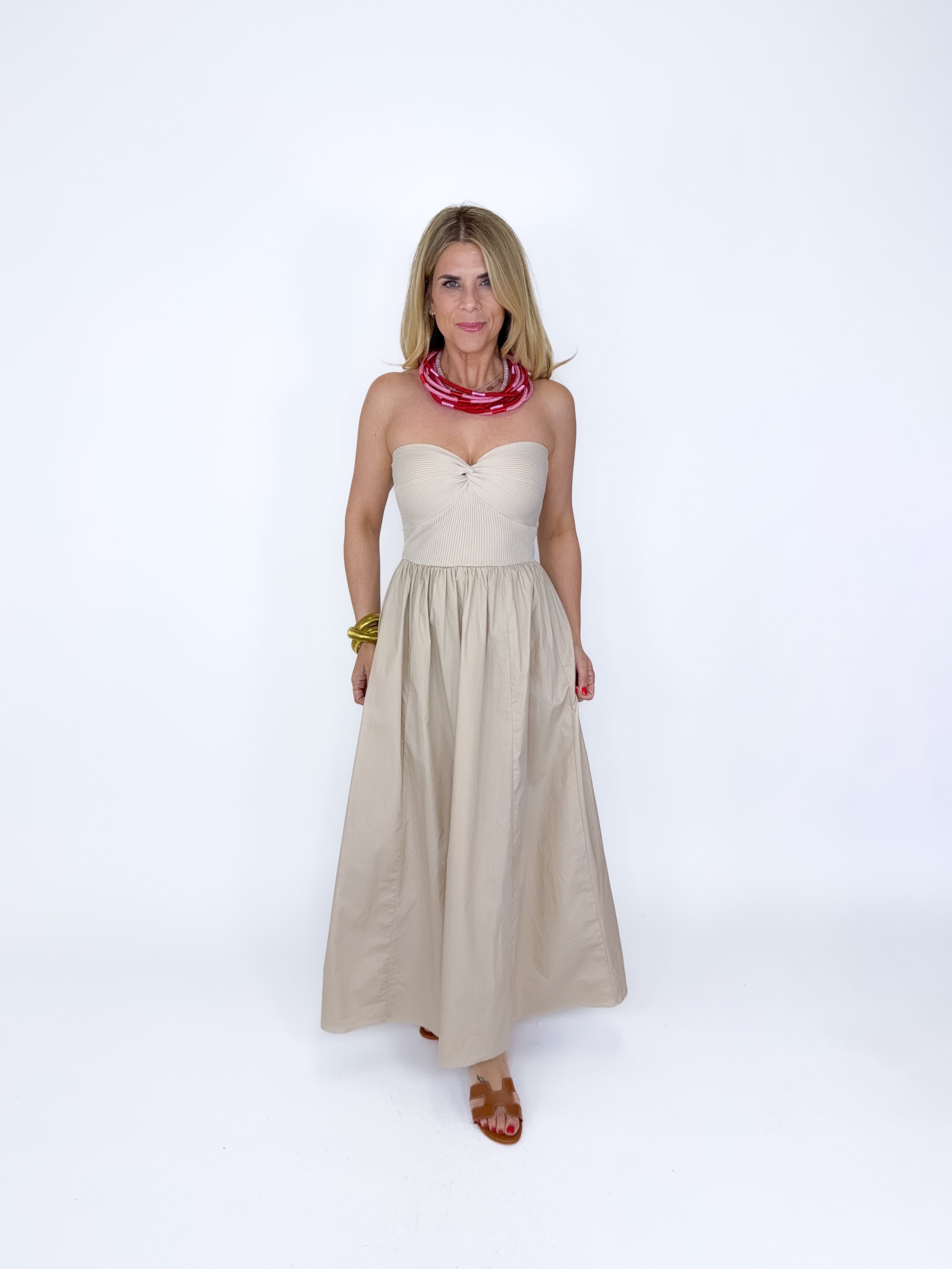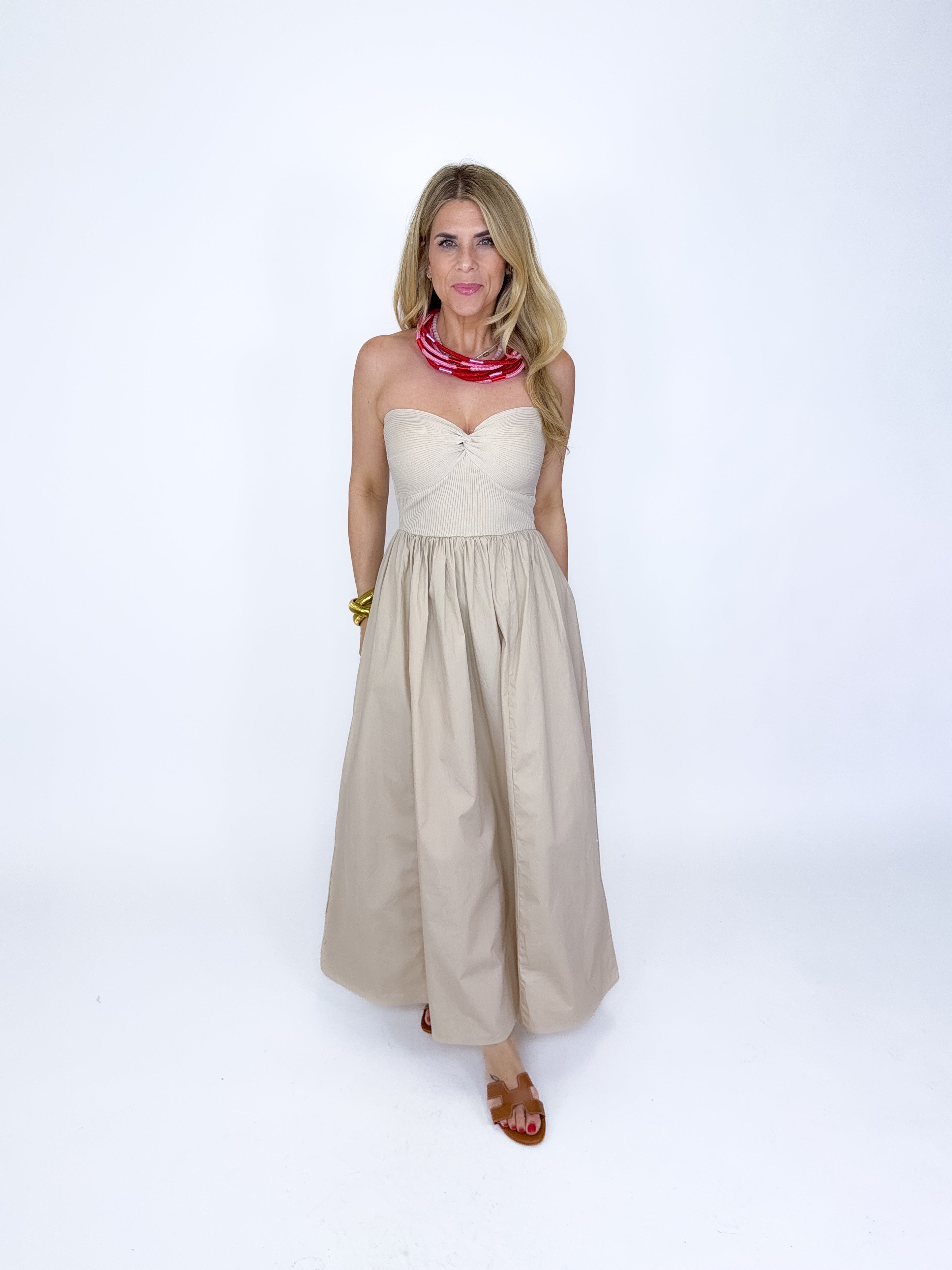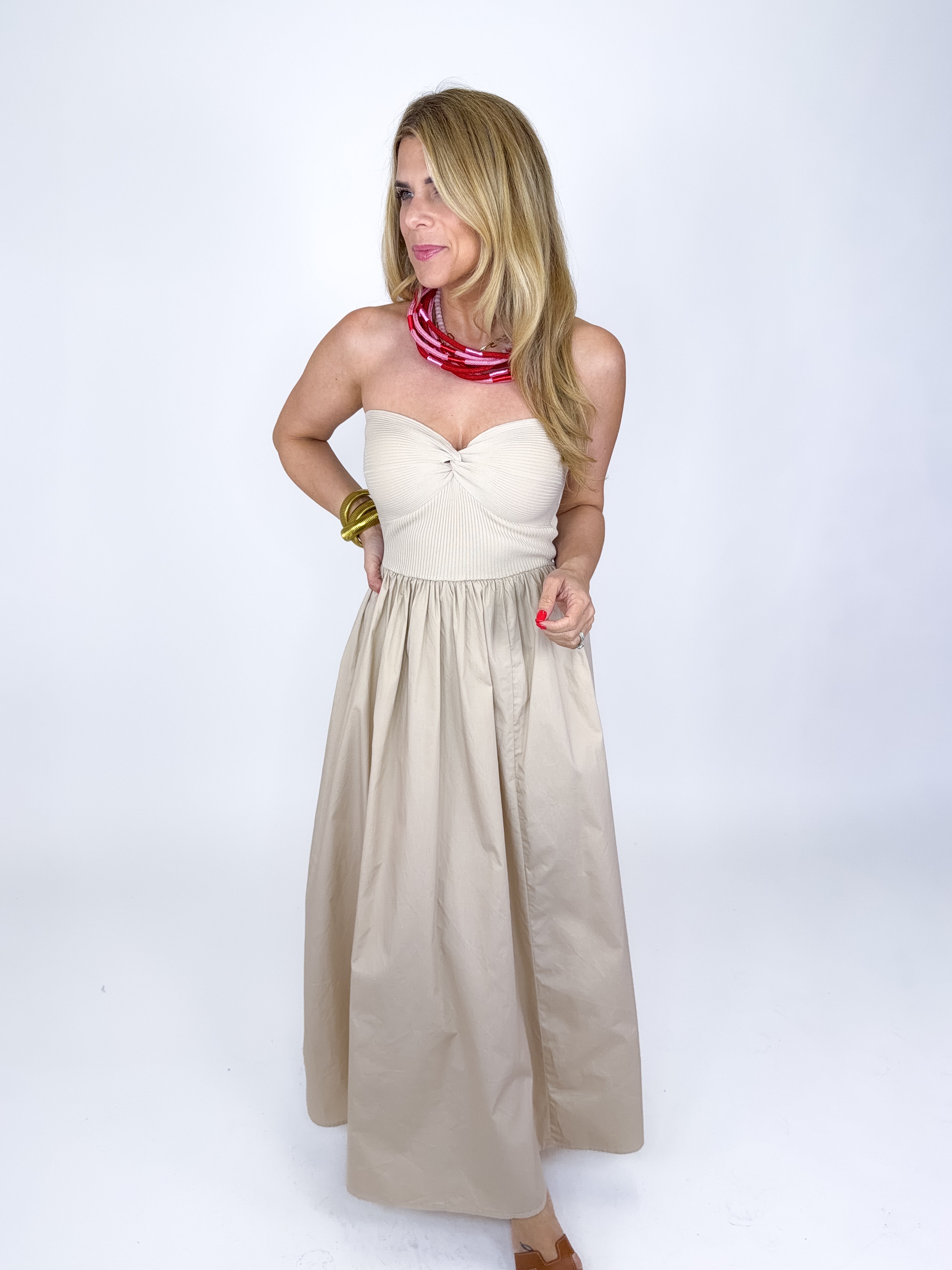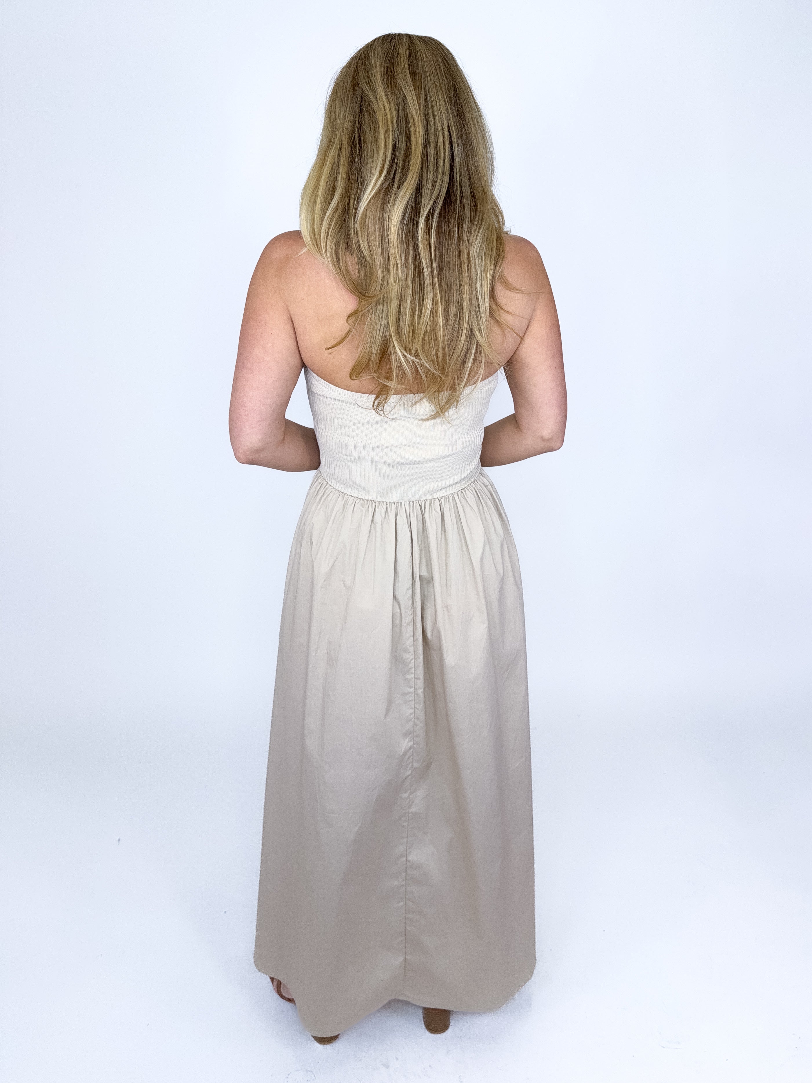 The Annie Dress is so good! This light khaki mixed media strapless maxi dress features sweater ribbed knit bodice with a knot neckline and a flowy gathered poplin skirt. Style with flats, wedges or heels. Fits true to size.