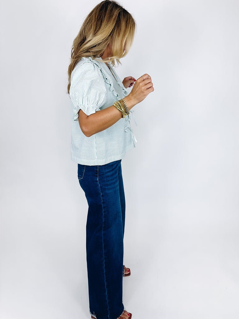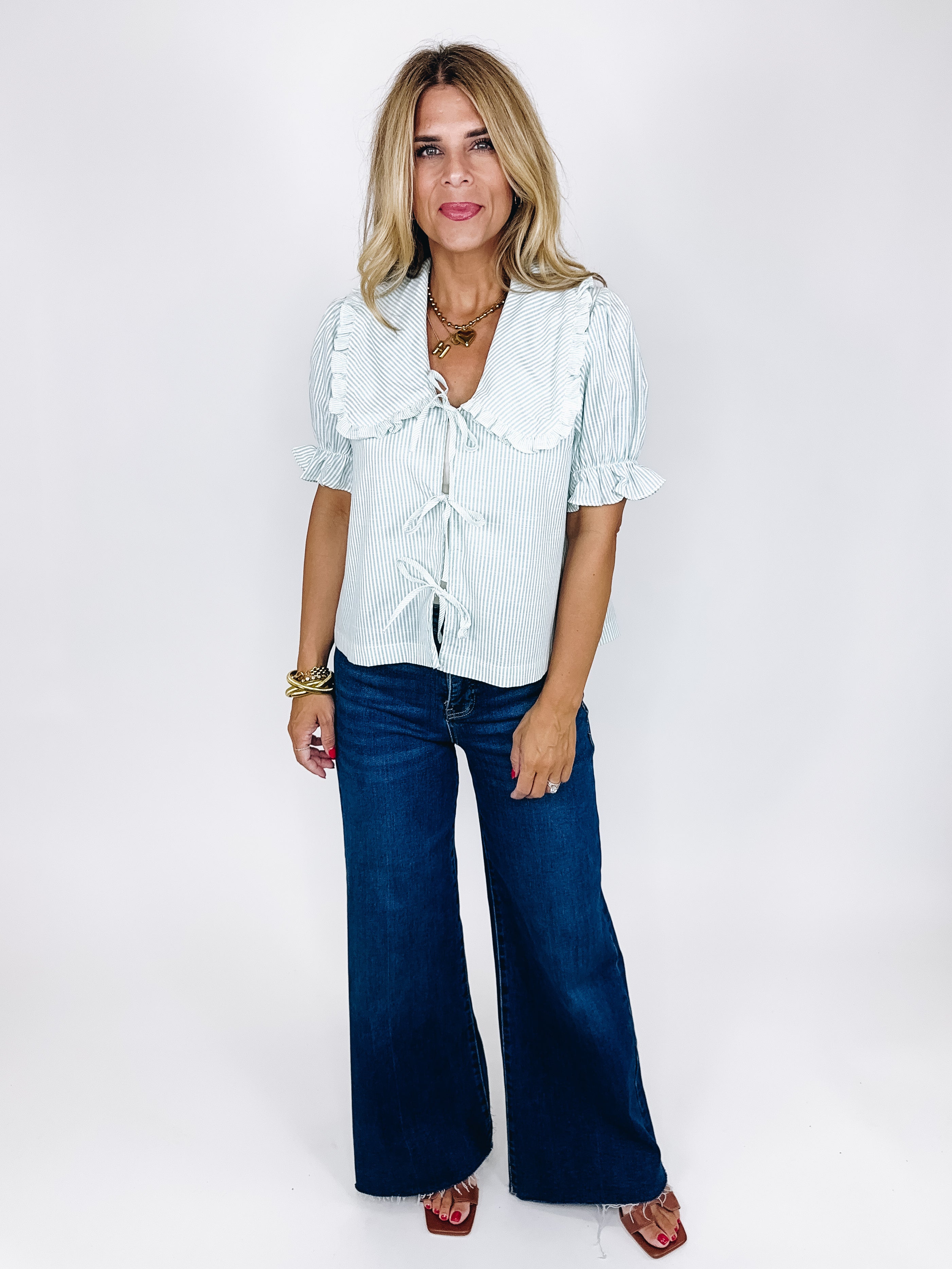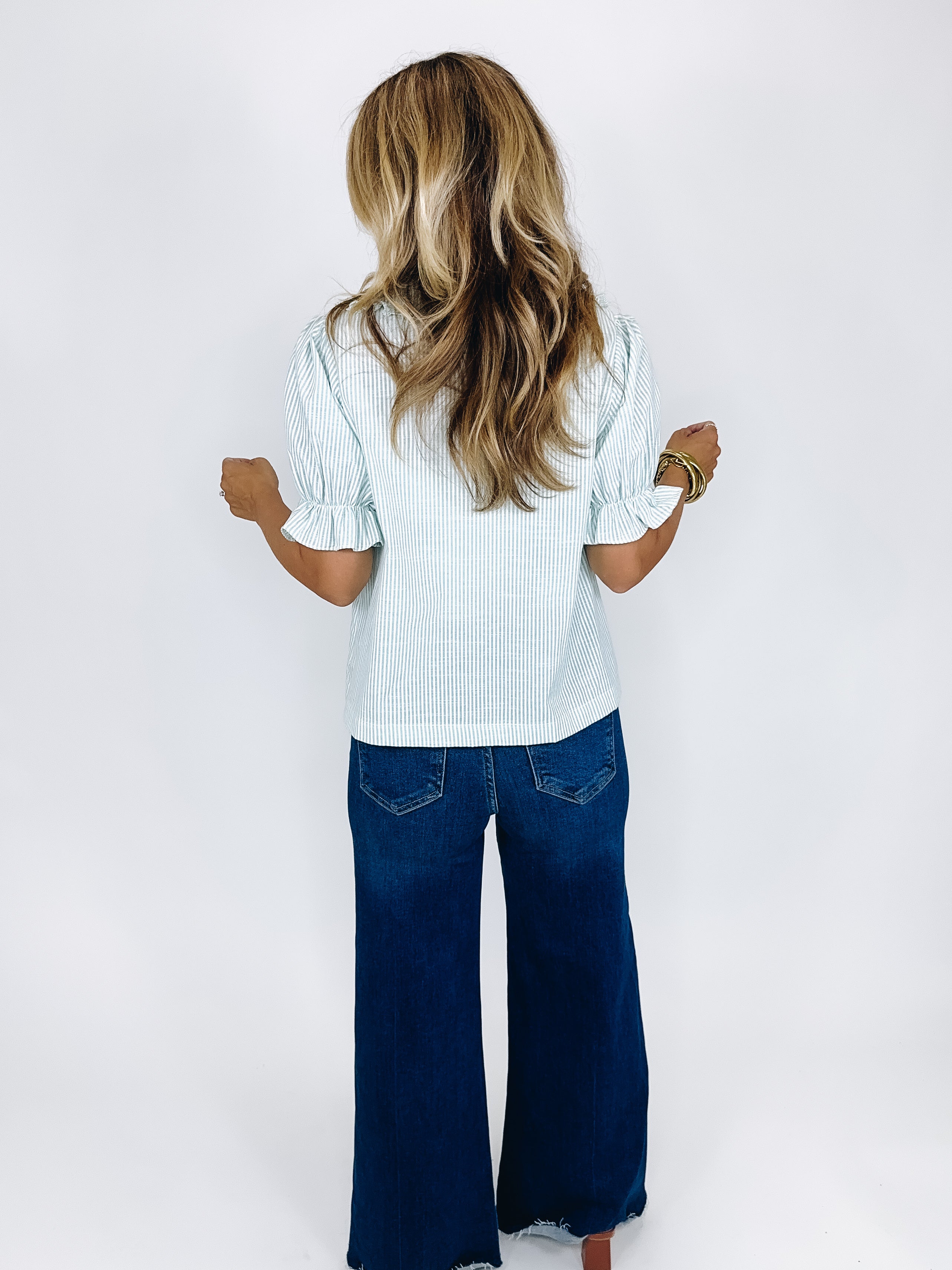 The August Top is such a sweet top! This green and white stripe blouse features a V-neckline with a tie front, short balloon elastic sleeves, ruffle trim baby dollar collar and a skimmer length. Pairs well with everything from denim, flats, heels, dress pants, skirts and more! Fits true to size.