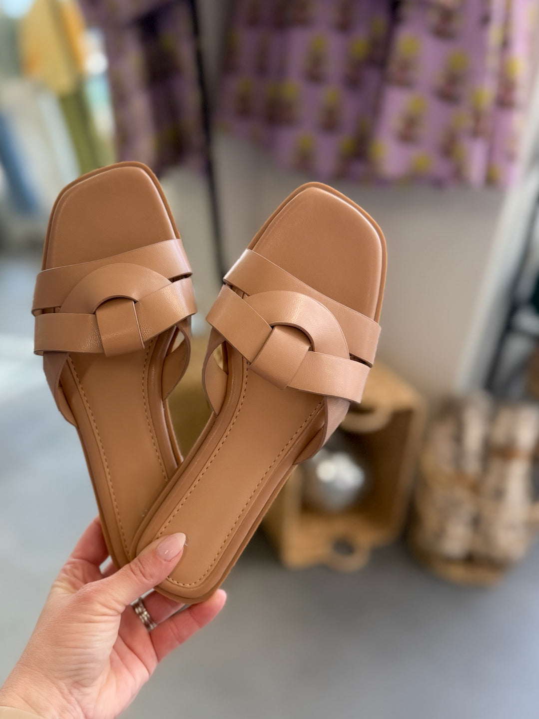 Our Autumn Sandals in camel are the perfect everyday sandal to add to your collection! Pair them with everything from shorts to skirts to jeans to dresses! knot strap detail. Side on. Flat Sandal. Fit True to size.