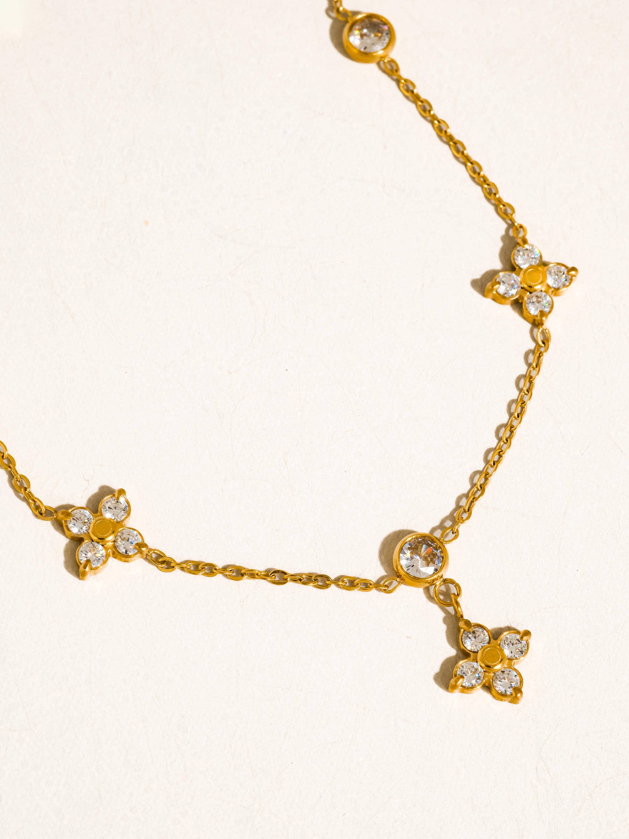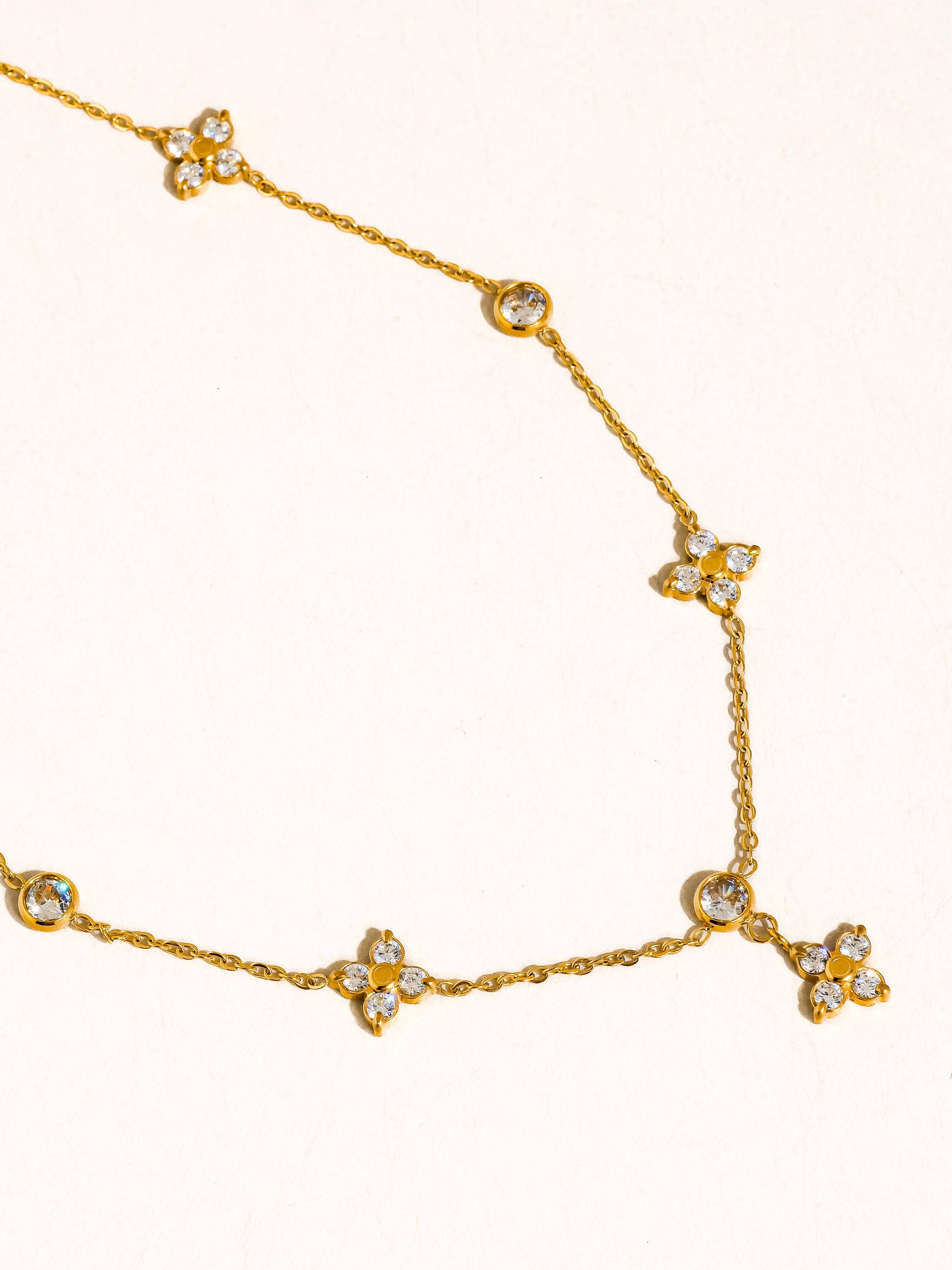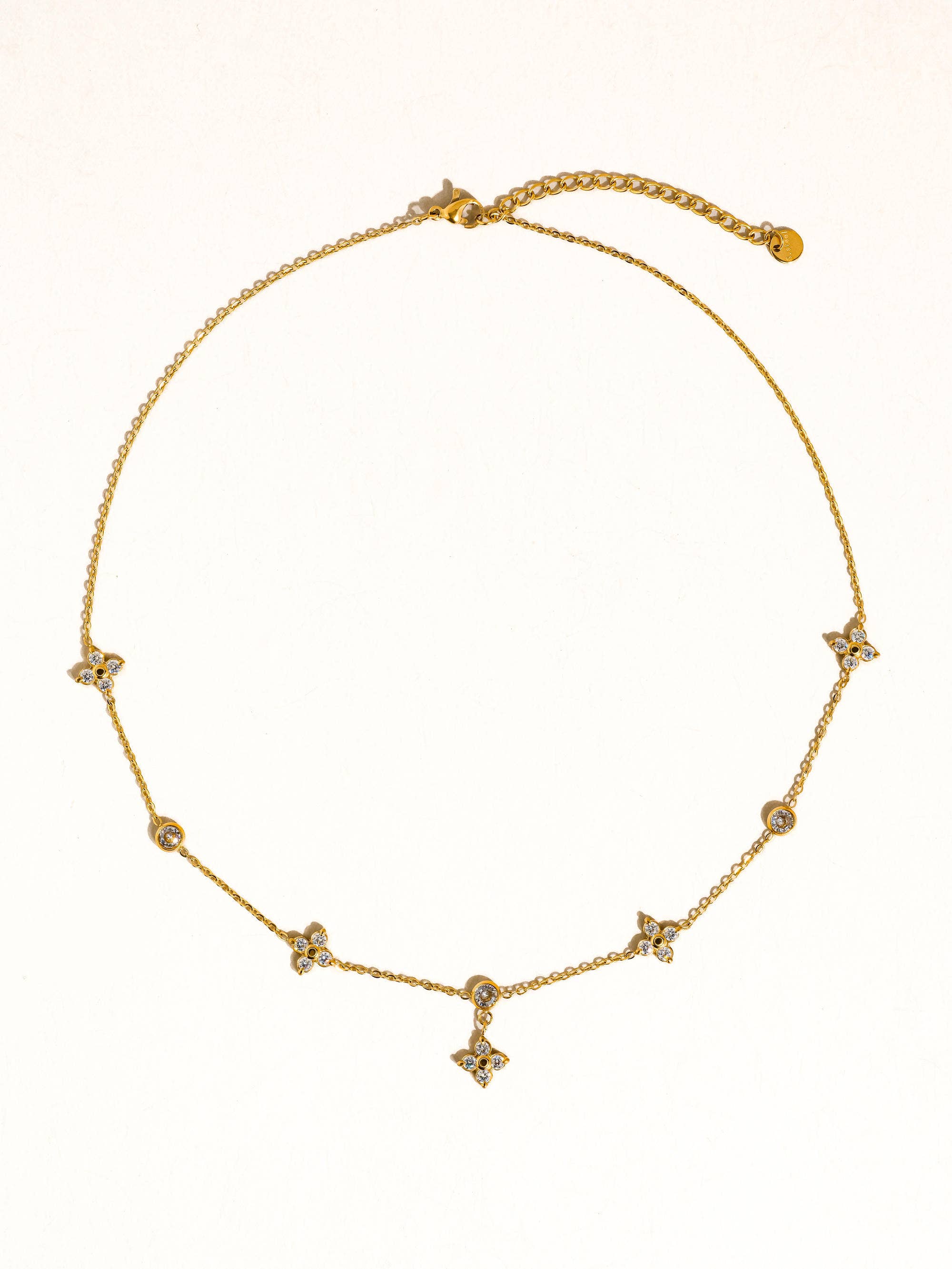 Our Aveline Floral Chain Necklace features a 18" chain + 2" extender with 18K Gold plated Stainless Steal chain. Non-Tarnish. Style alone or stack! Lead and Nickel Free - Hypoallergenic - Water Resistant