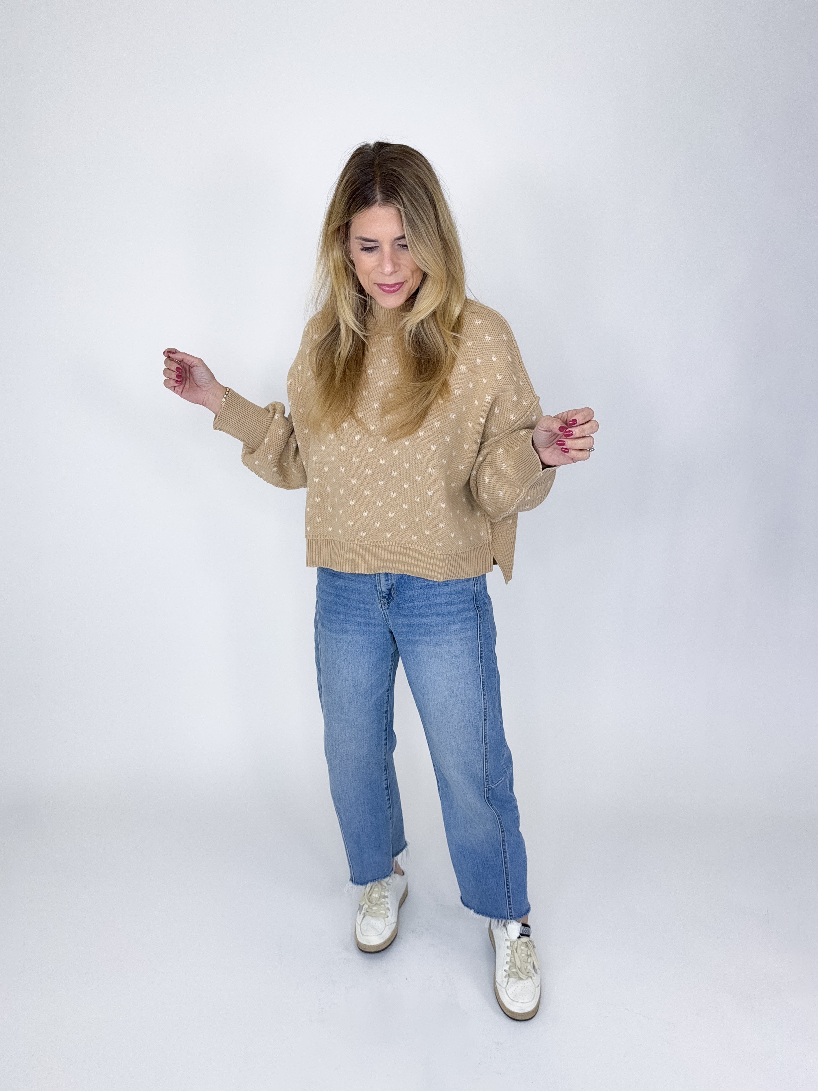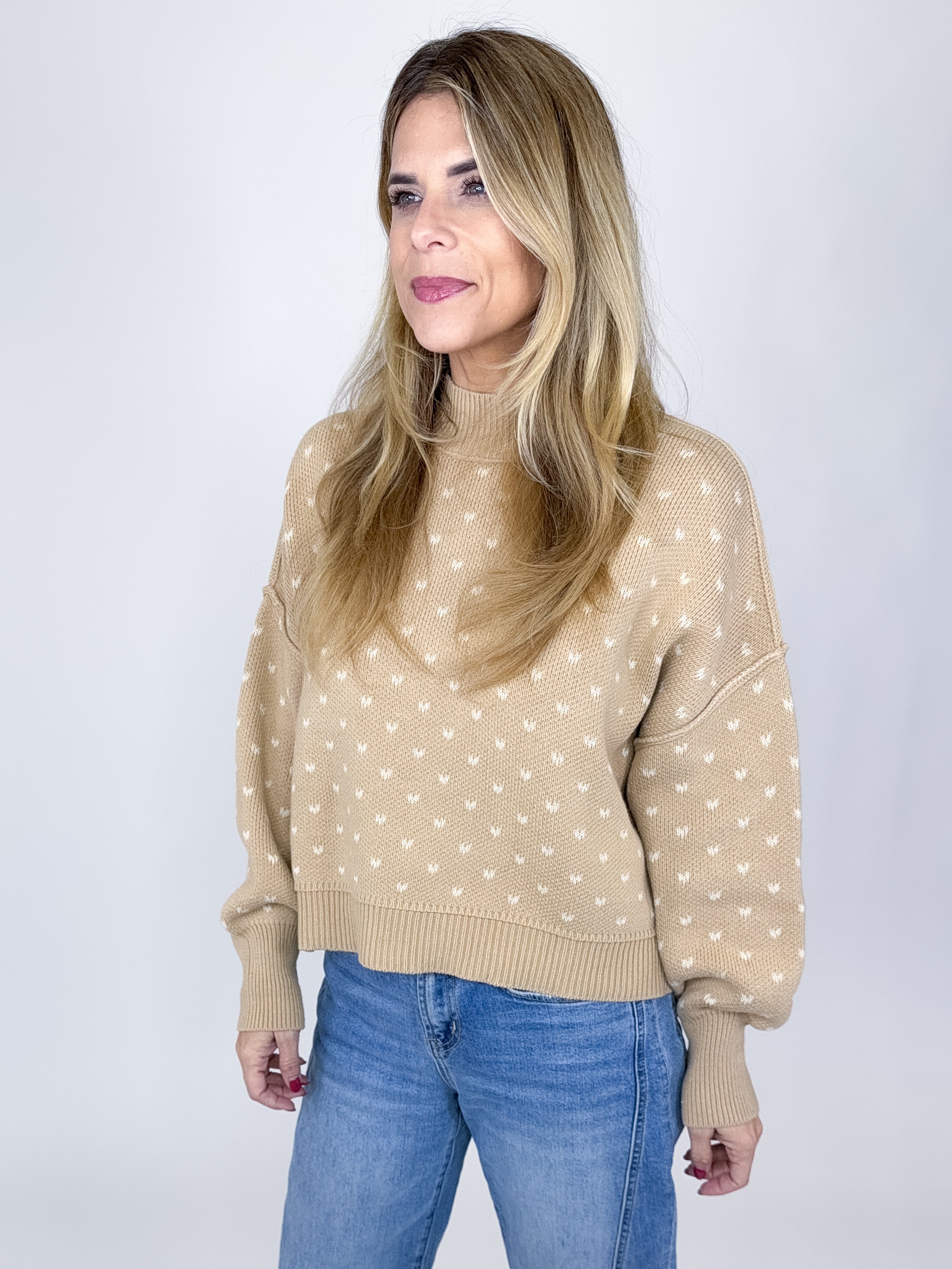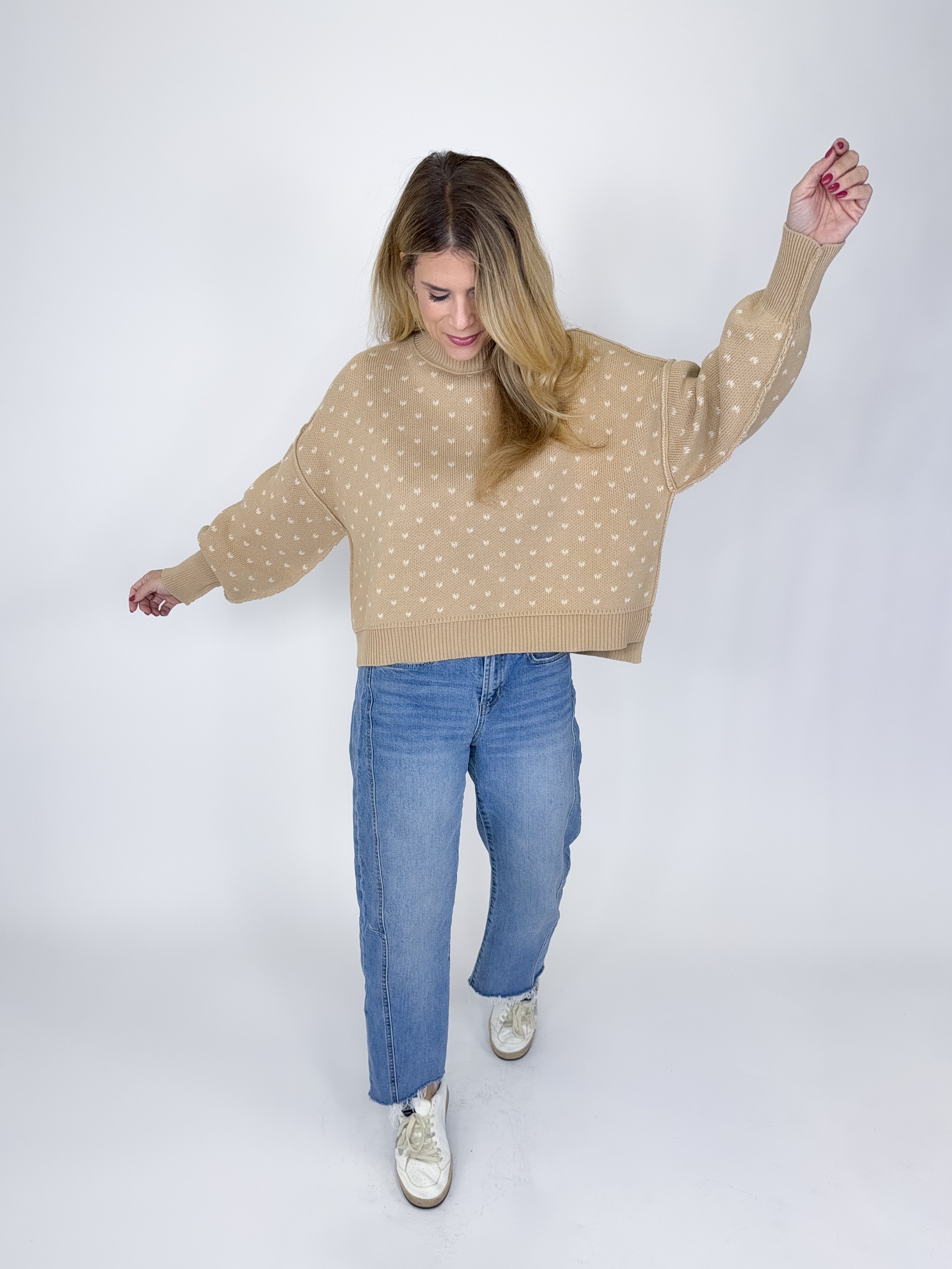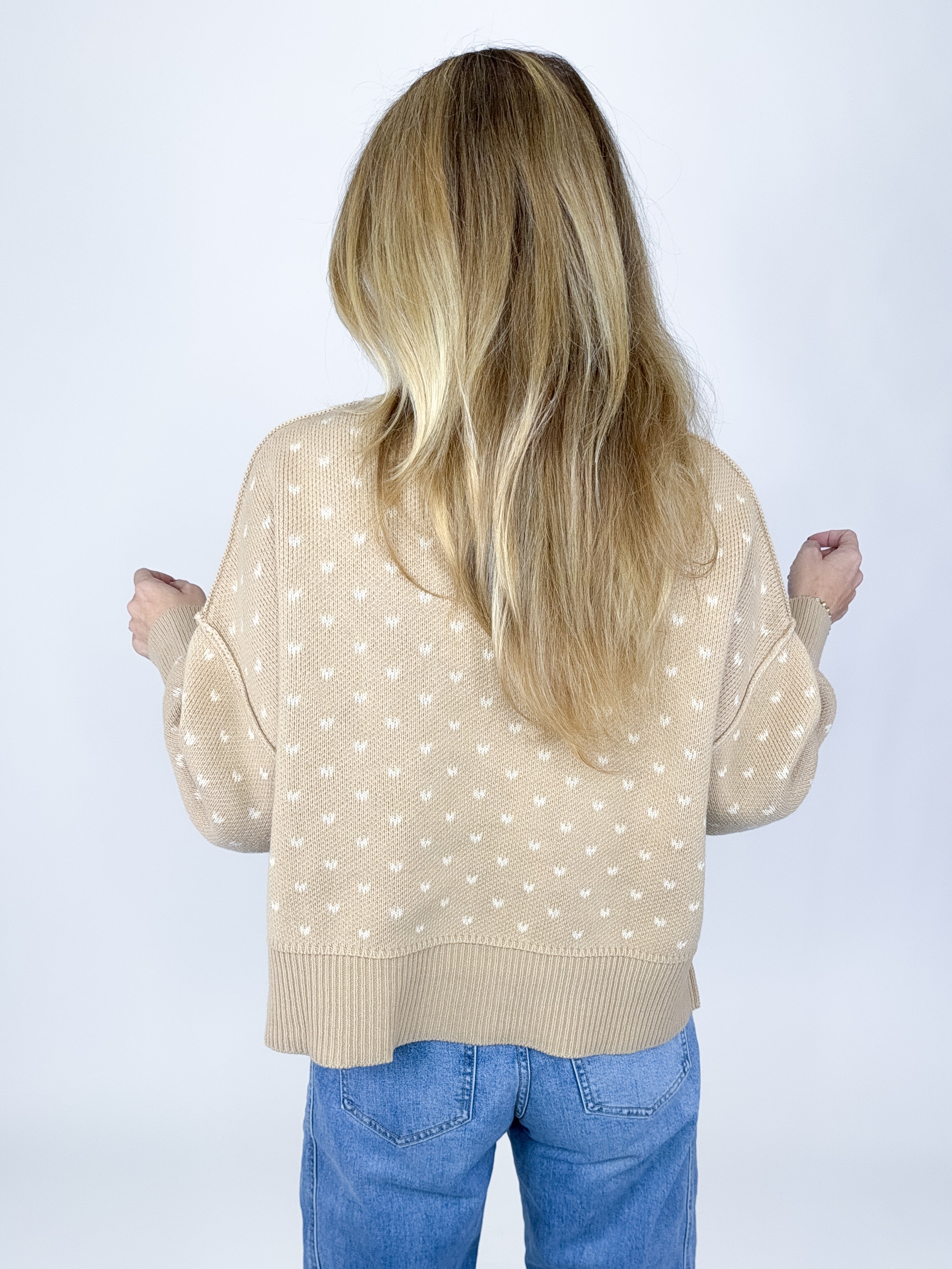 The Averly Sweater is a perfect everyday sweater. This taupe ribbed knit sweater features a crew neck, long sleeves with a wide ribbed cuff, skimmer oversized fit, fun heart pattern and a wide ribbed hem with a side slit. Pair with denim, boots, flats, skirts, dress pants and sneakers. Fits true to size.