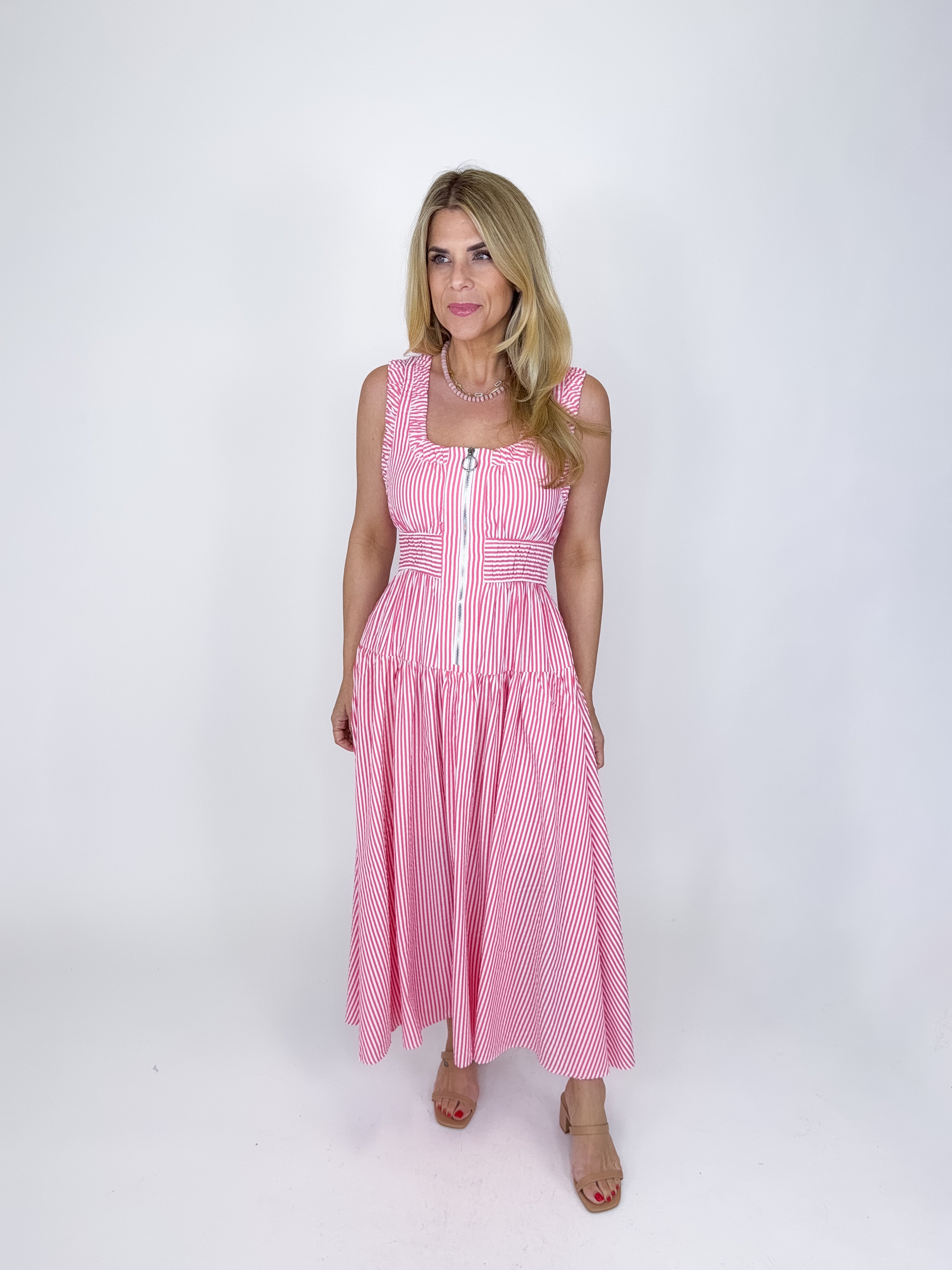 The Berkley Dress is a total stunner! This pink and white stripe midi dress features a square neckline, wide shoulder straps, zipper front and a drop elastic banded waist. Lined. Pockets. Style with flats, heels or sandals. Fits true to size.