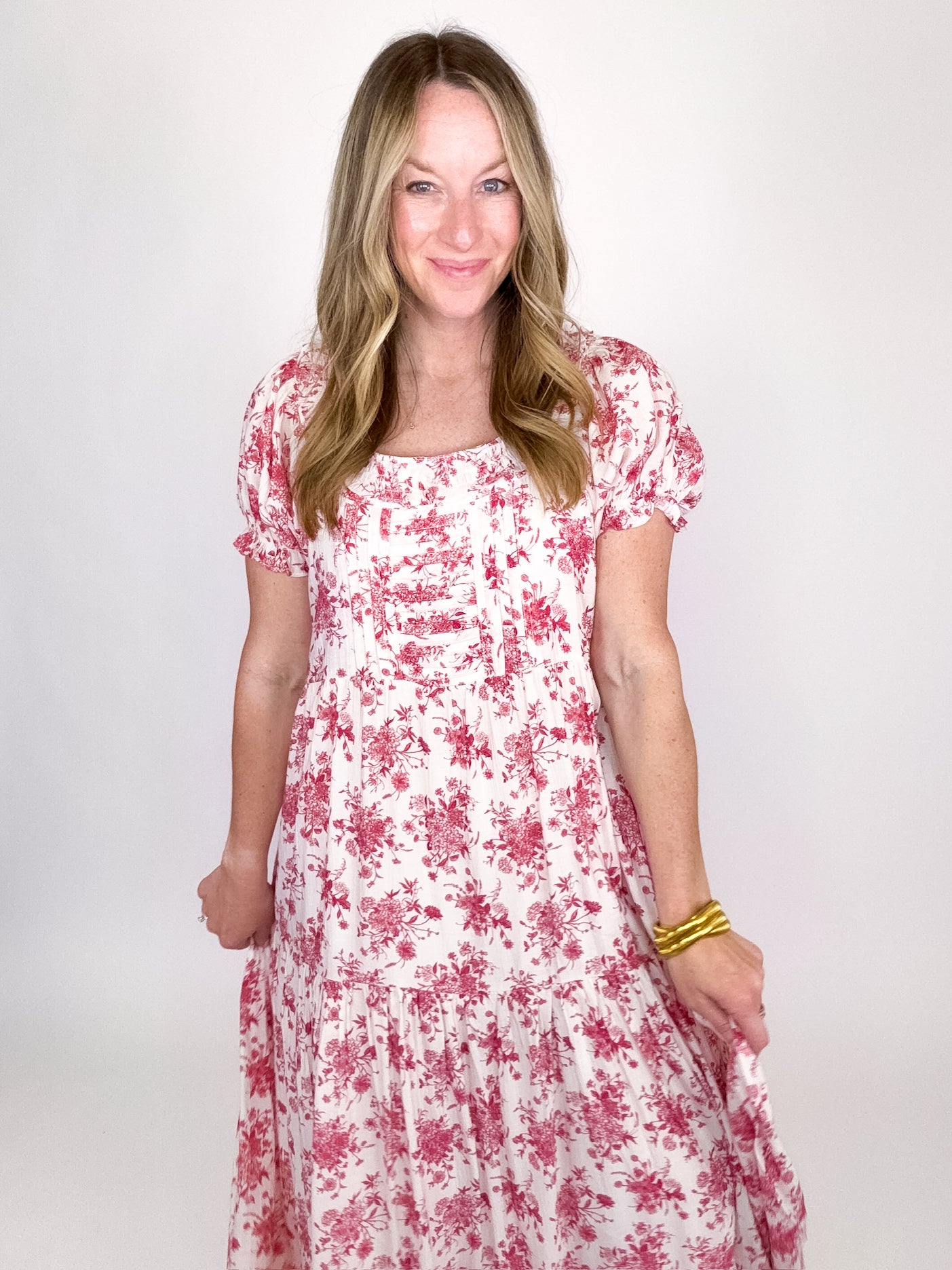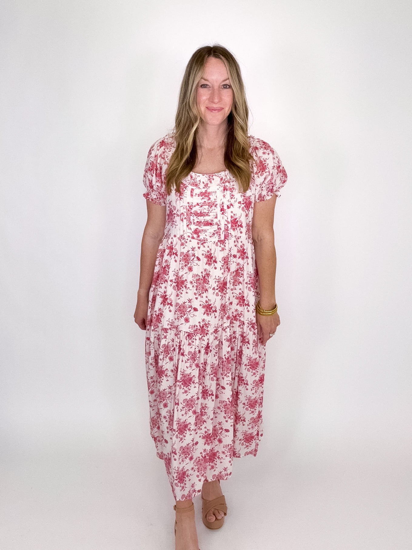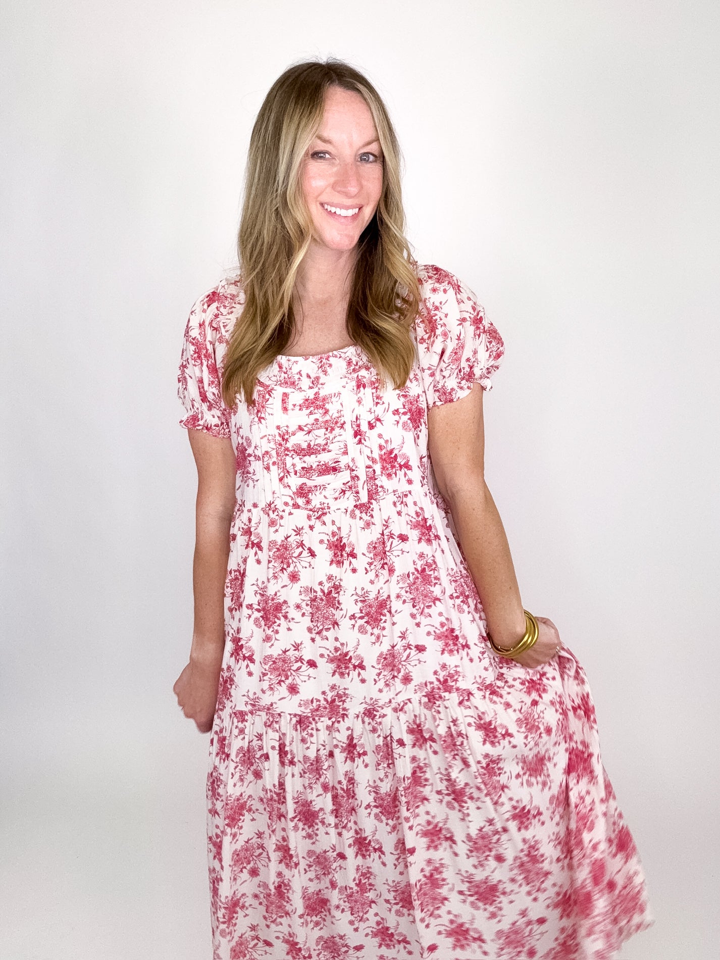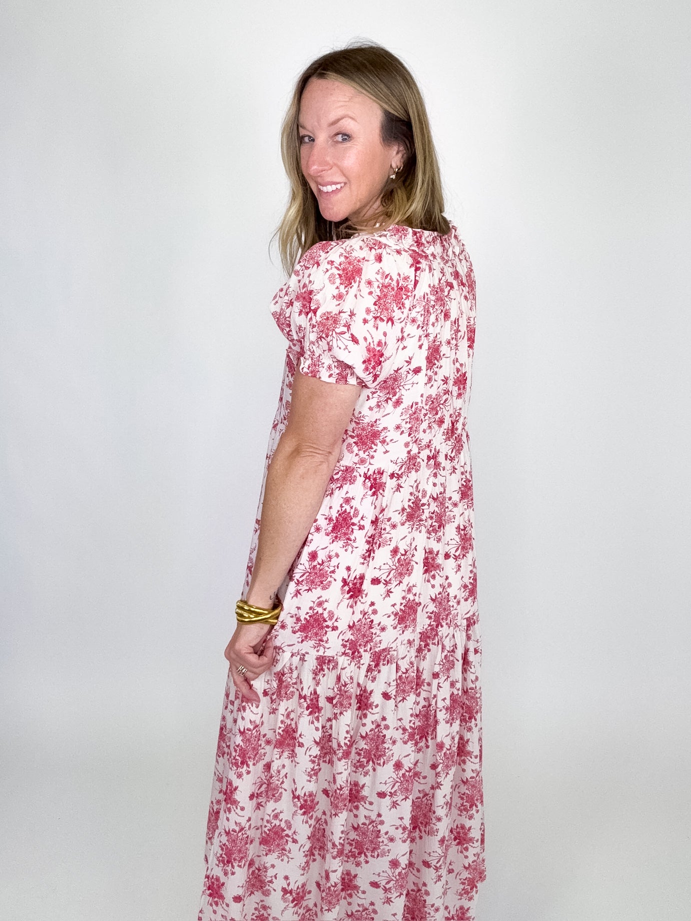 The Brinley Dress is a total stunner! This red floral maxi dress features a scoop neckline with ruffle trim, short puff sleeves with elastic ruffle, pin tuck bodice and a ruffle tier hem. Lined. Style with flats, heels or sandals. Fits true to size.
