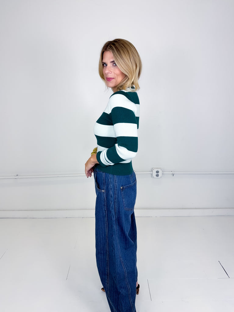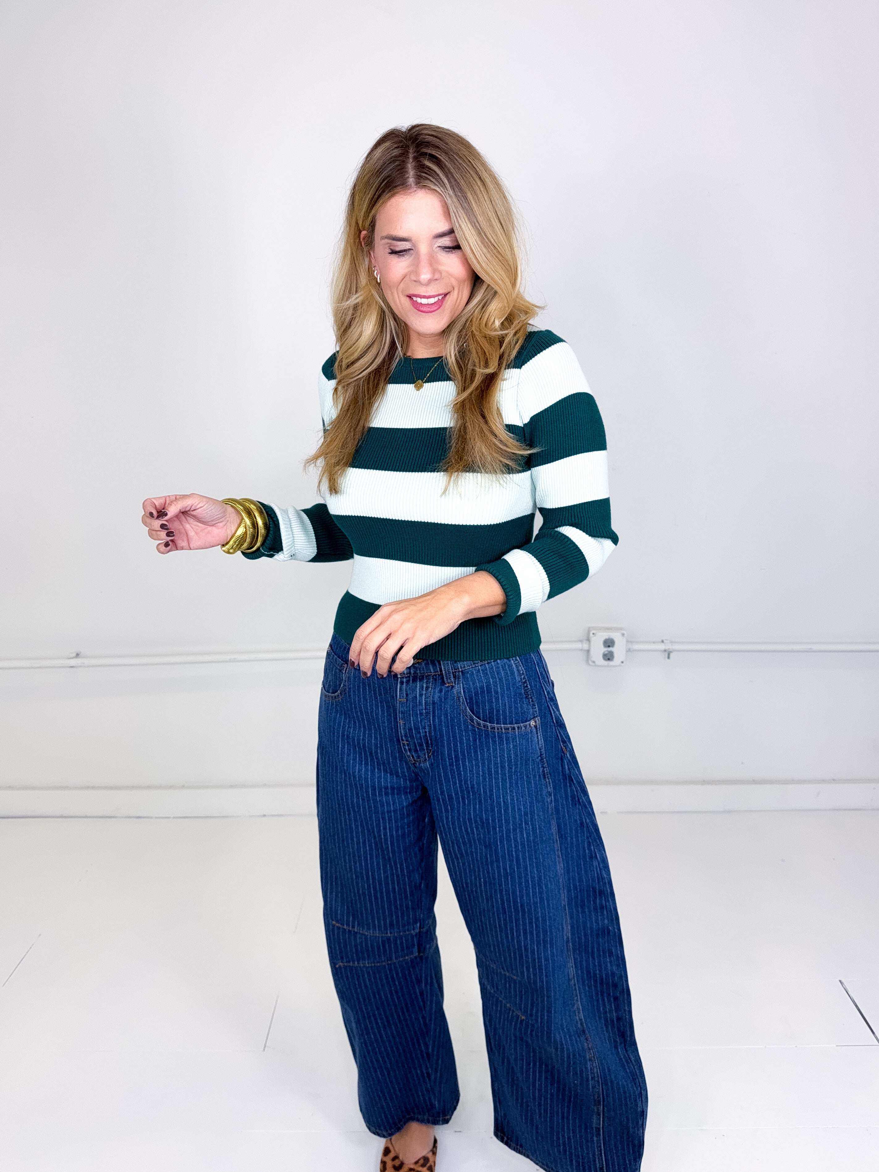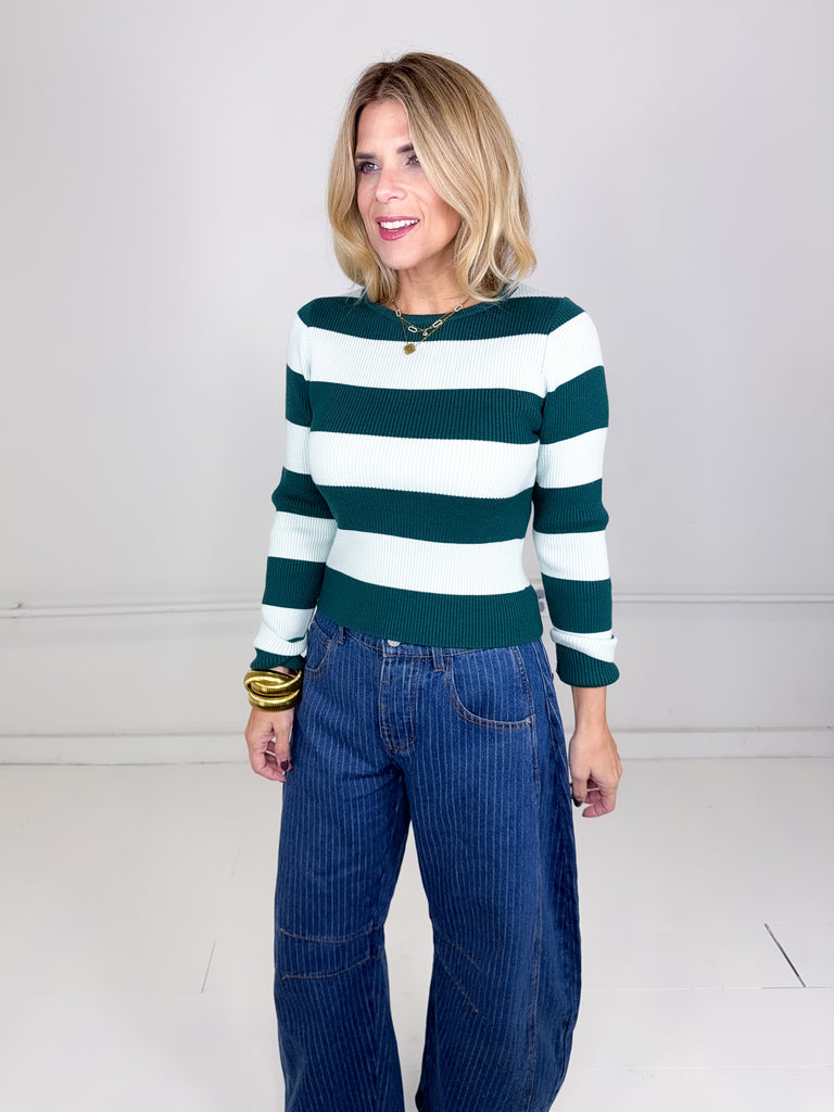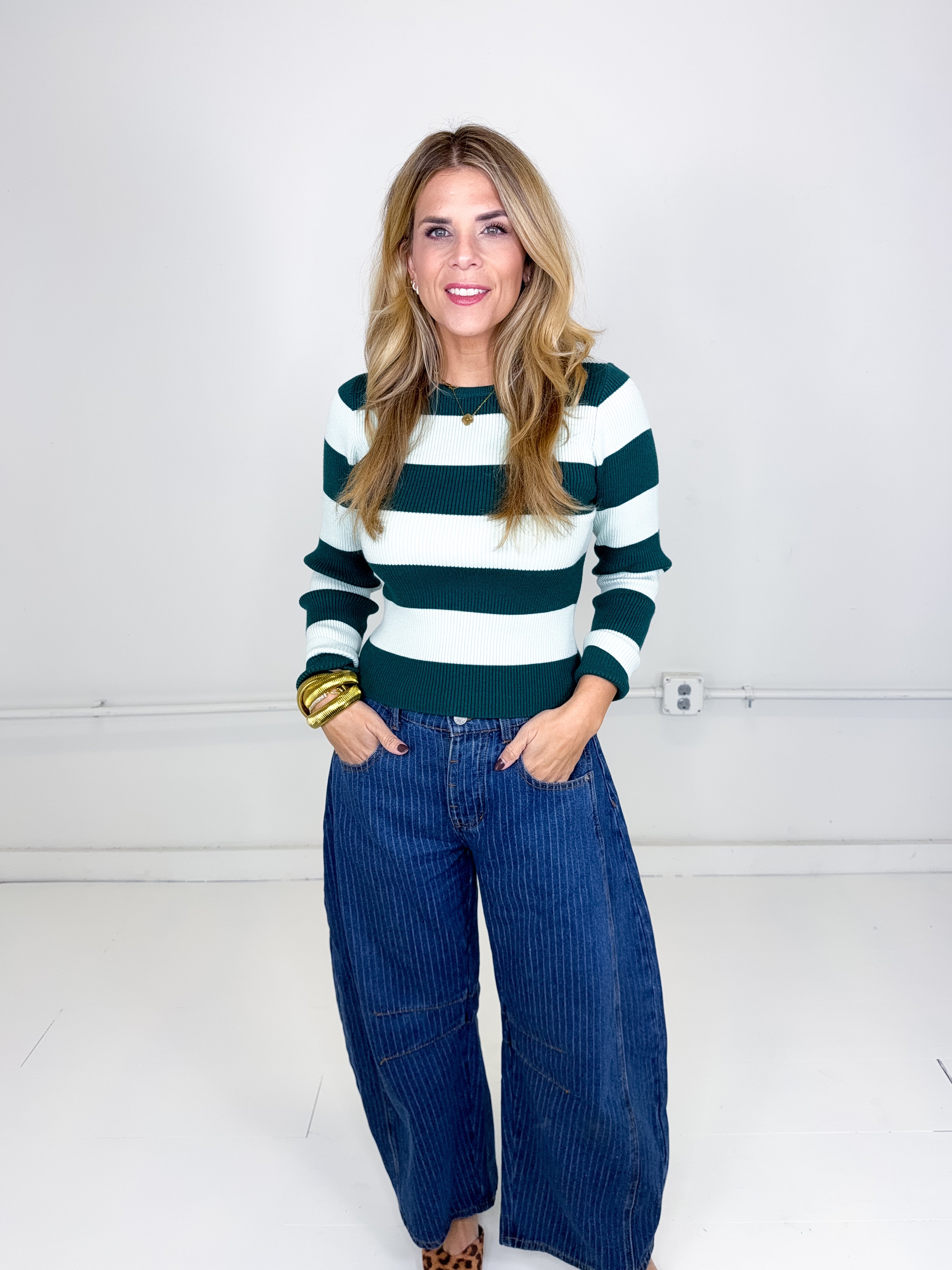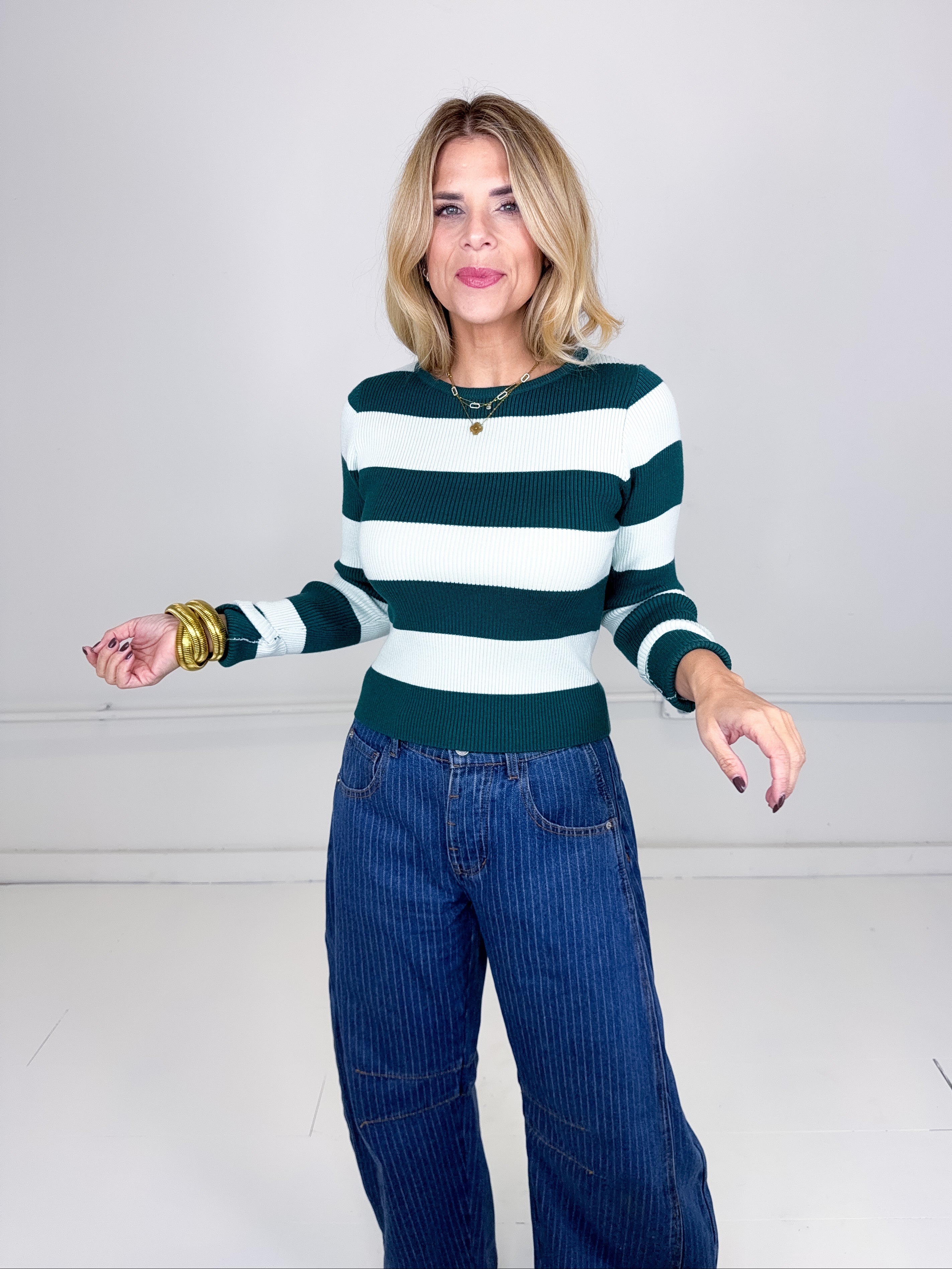 The Calla Top is a perfect everyday top. This beautiful green and mint stripe top features a wide round neck, a ribbed knit material and a skimmer length. Pair with denim, boots, flats, skirts, dress pants and sneakers. Fits true to size.