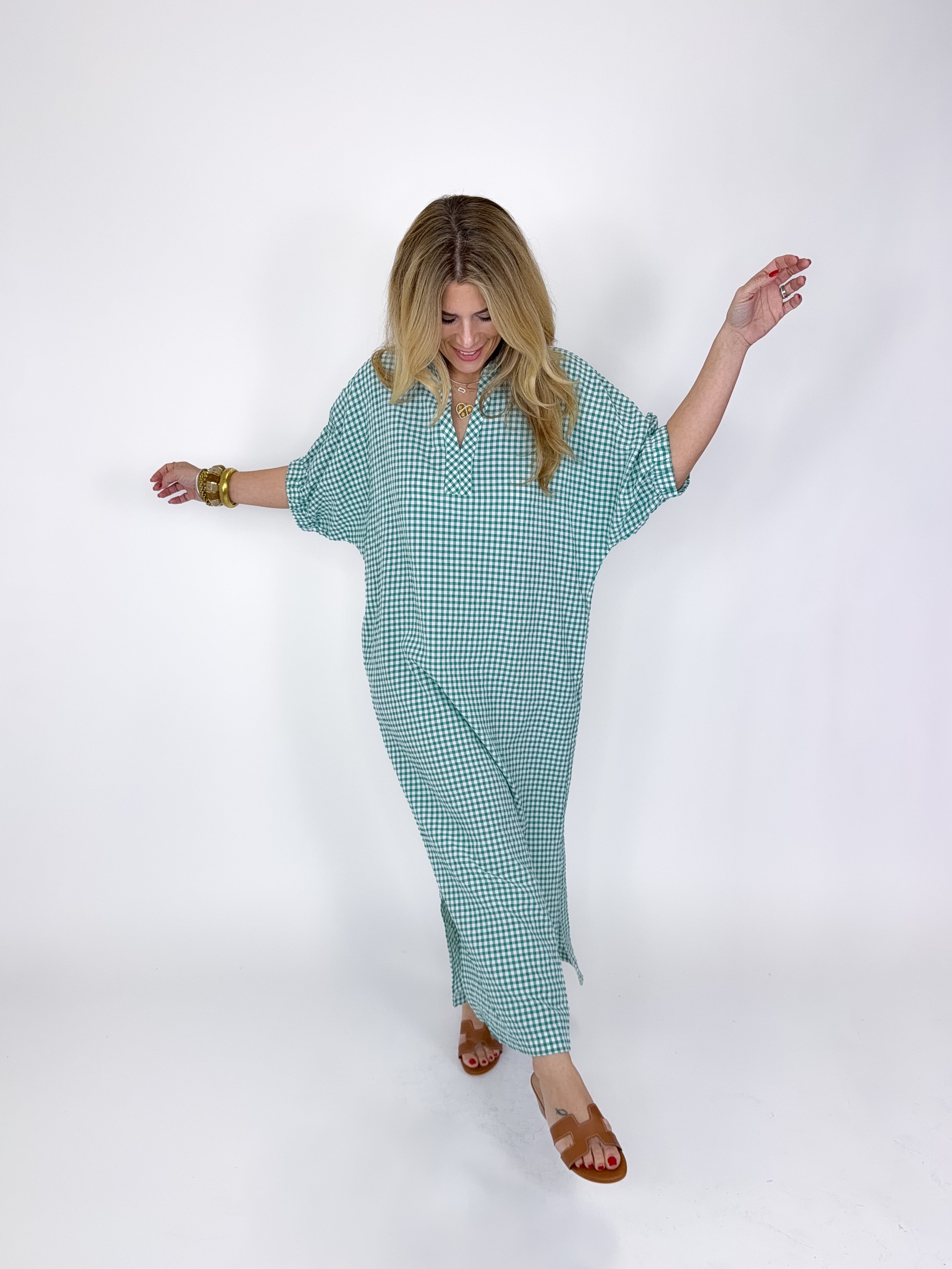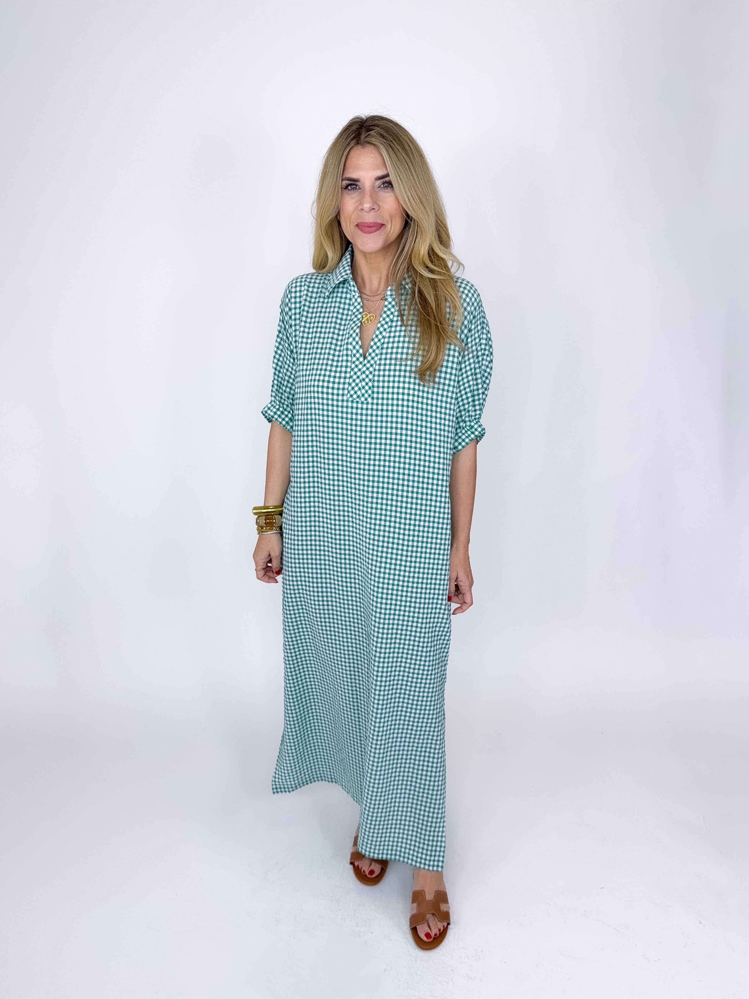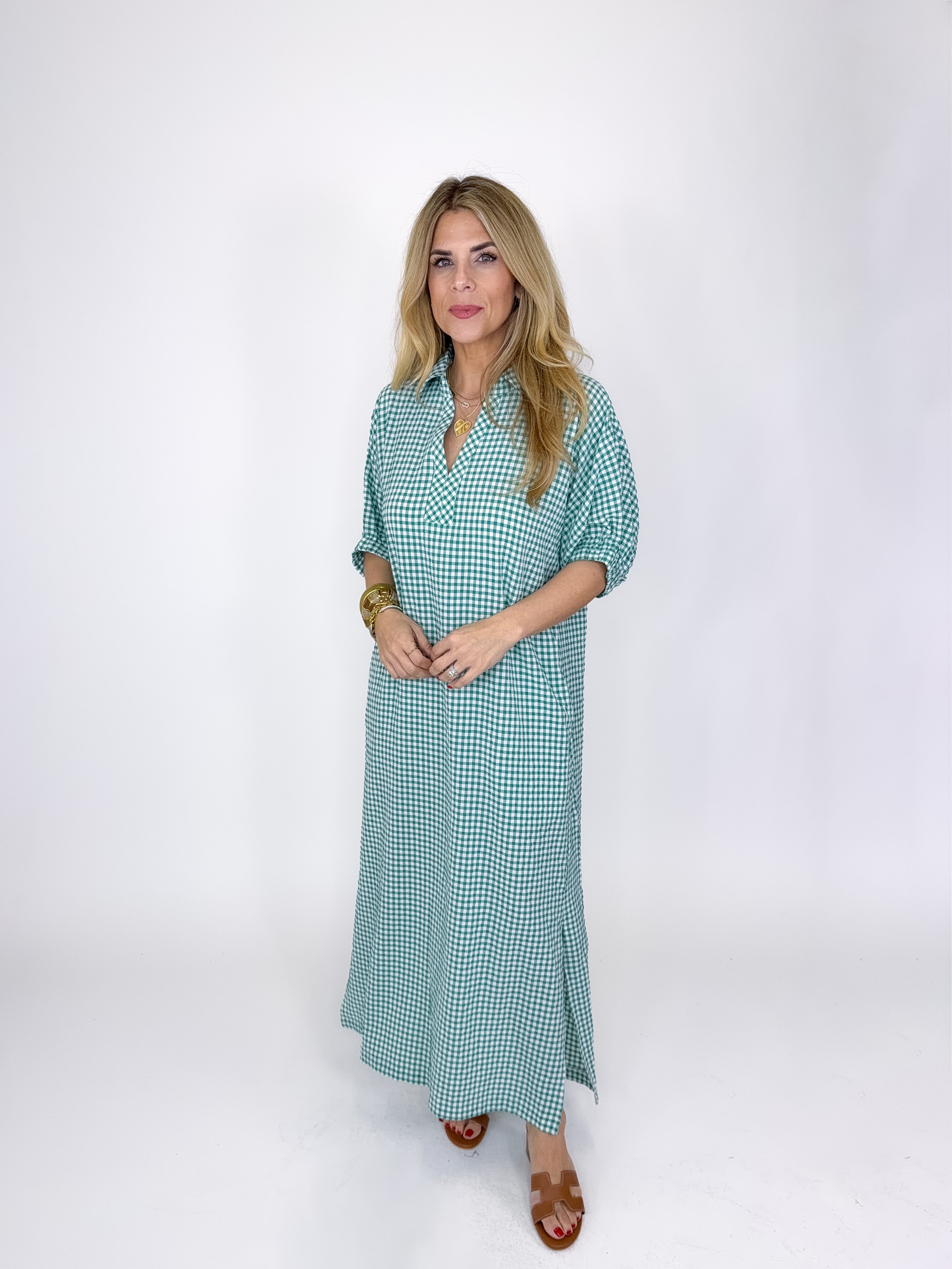 The Callen Dress is a must have. This green gingham print midi dress features short puff sleeves, v-neck with a collar, split hemline and an easy fit roomy silhouette. Pockets. Lined. Style with flats, heels, wedges, boots and sneakers! Fits true to size.