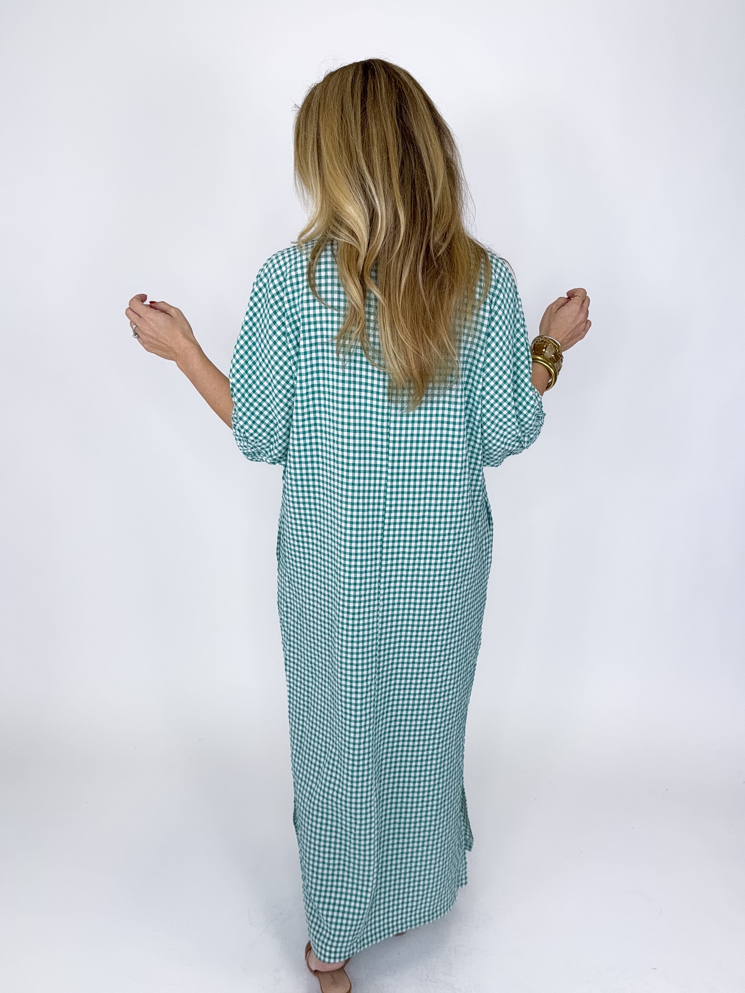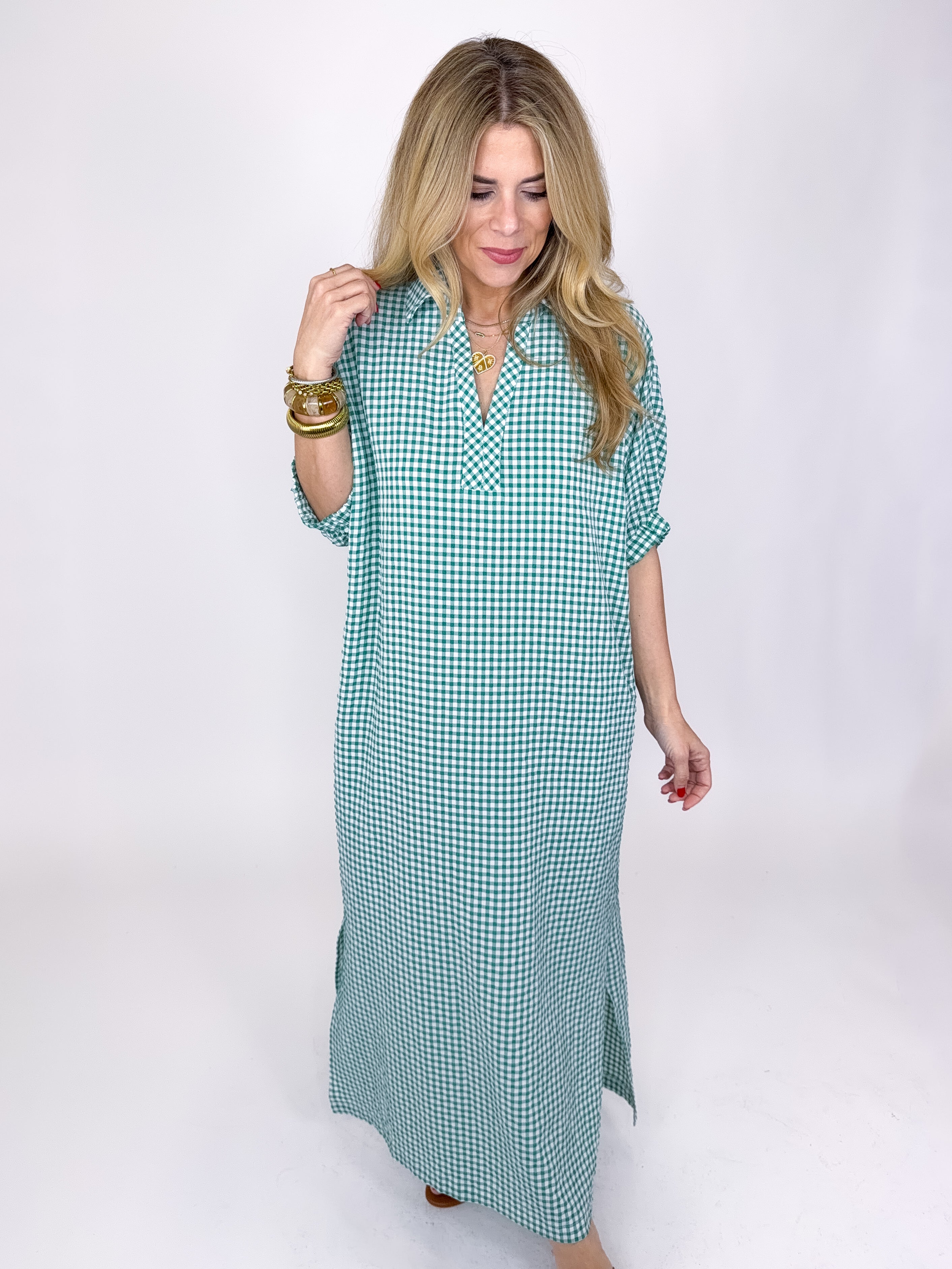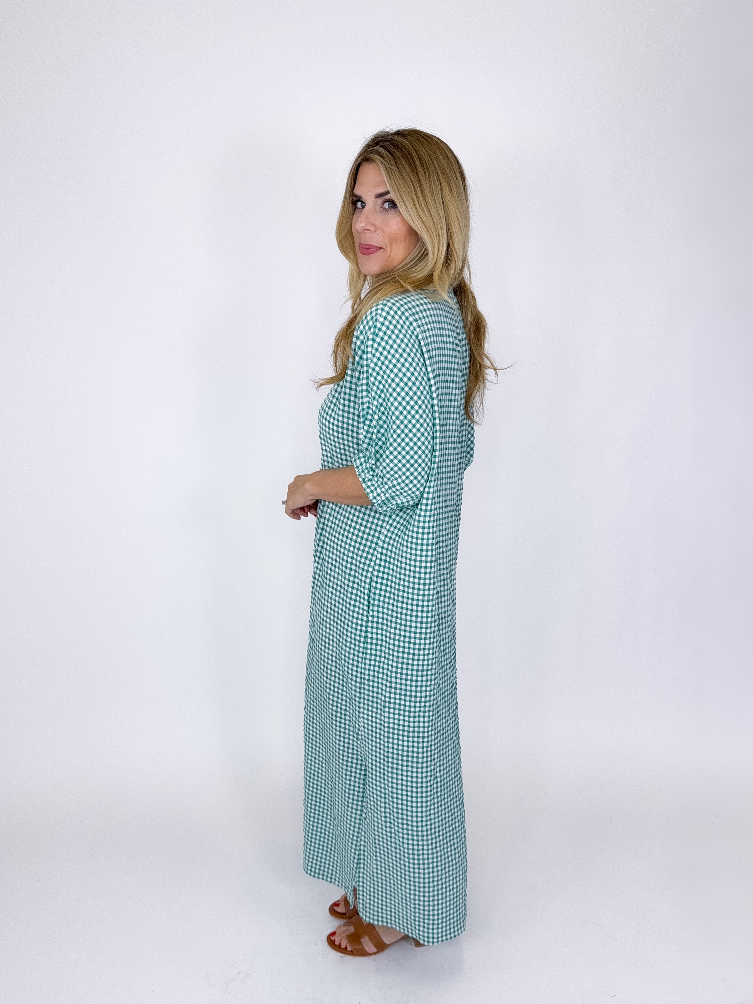 The Callen Dress is a must have. This green gingham print midi dress features short puff sleeves, v-neck with a collar, split hemline and an easy fit roomy silhouette. Pockets. Lined. Style with flats, heels, wedges, boots and sneakers! Fits true to size.