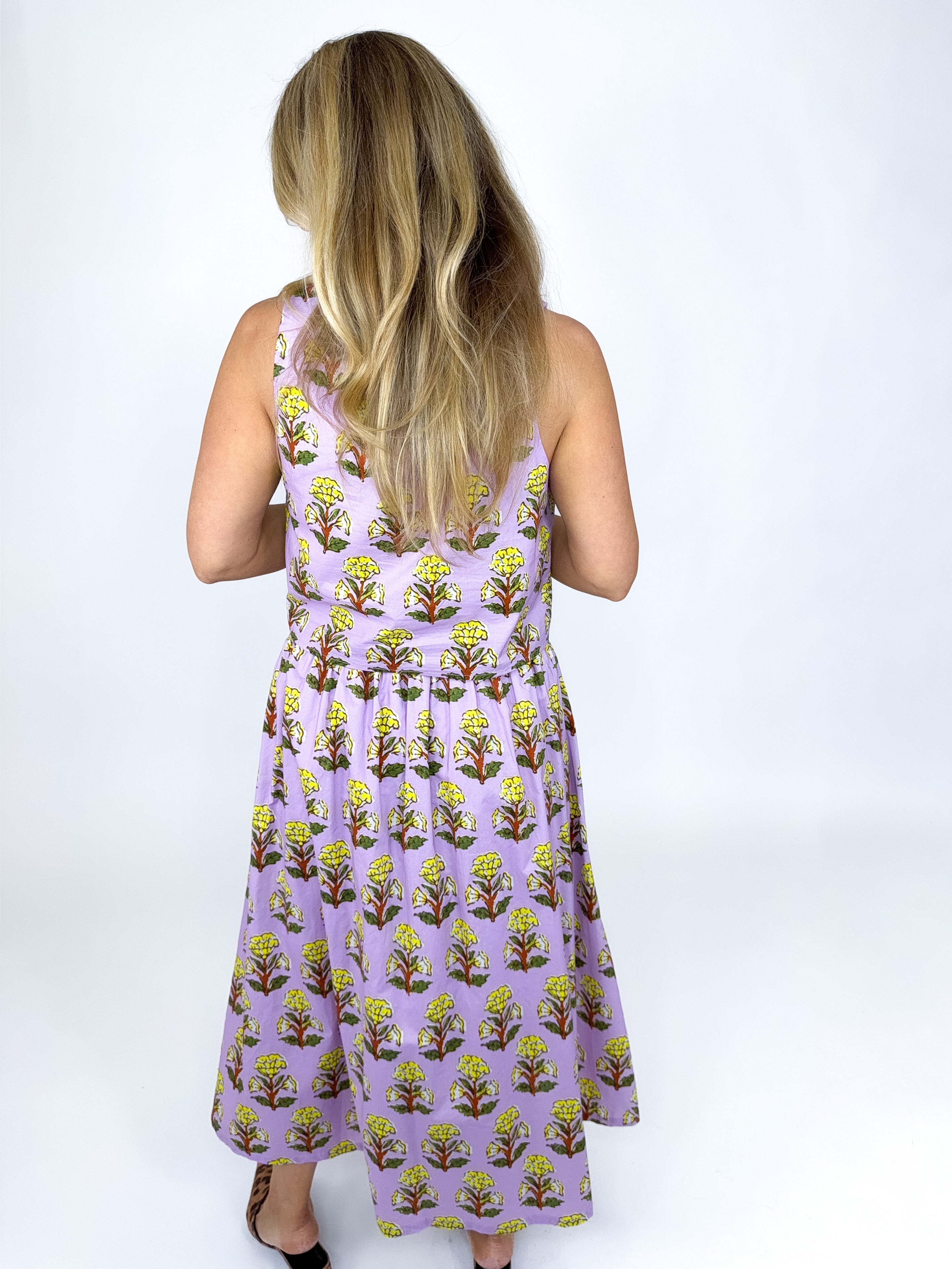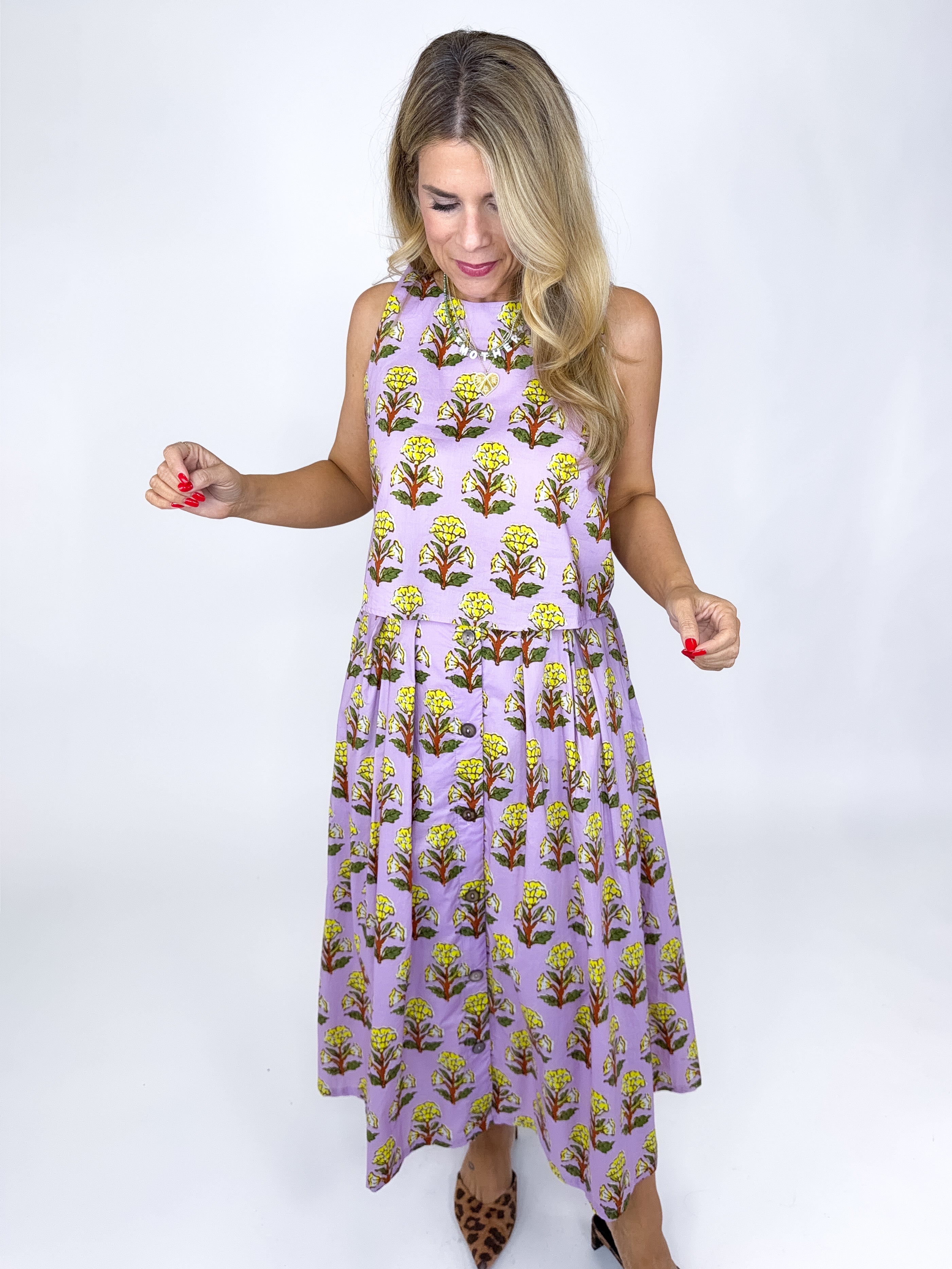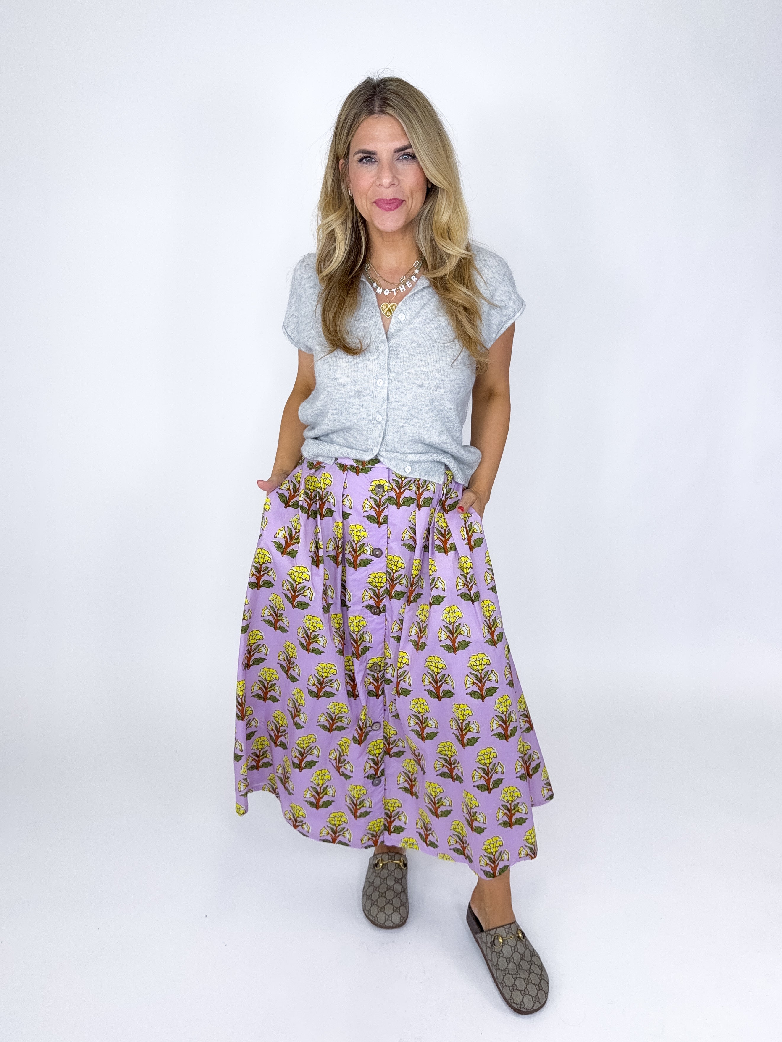 The Cami Skirt is the perfect skirt. This lavender midi skirt features a beautiful floral block pattern, elastic high waist with a button front and a gathered waistline. Dress them up with a fun blouse or down with a tee and flats! Pockets. Lined. We love it paired with our Cami Top! Fits true to size.