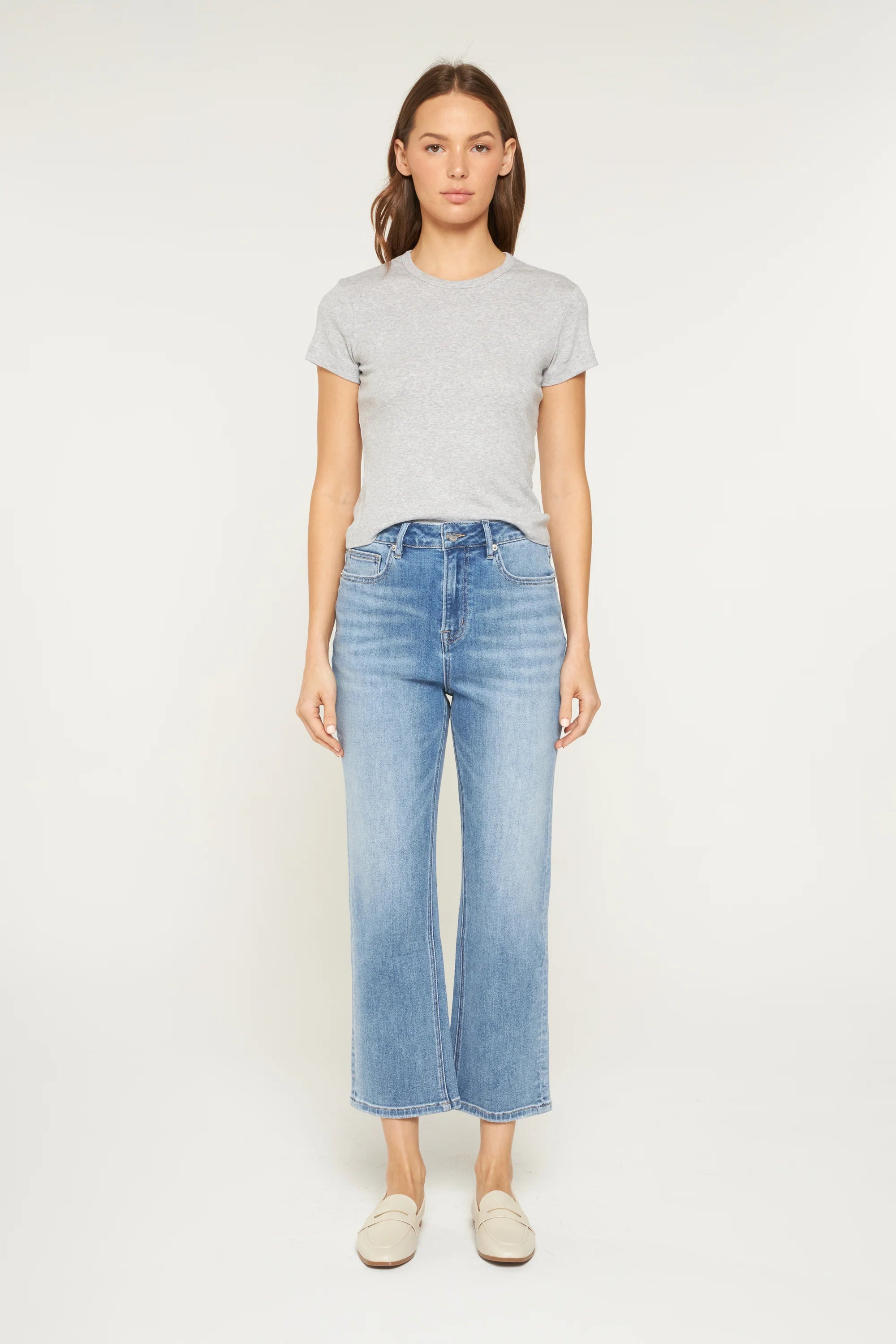 Our Charles Straight Leg Jeans are a high rise, light wash jean. These will be your everyday, go to pair of denim! Style with everything from your favorite tee and sneakers to a fun blouse and heels! Slight distressing. Light distressing on pocket. These 5 pocket jeans offer good stretch. We recommend sizing down one.