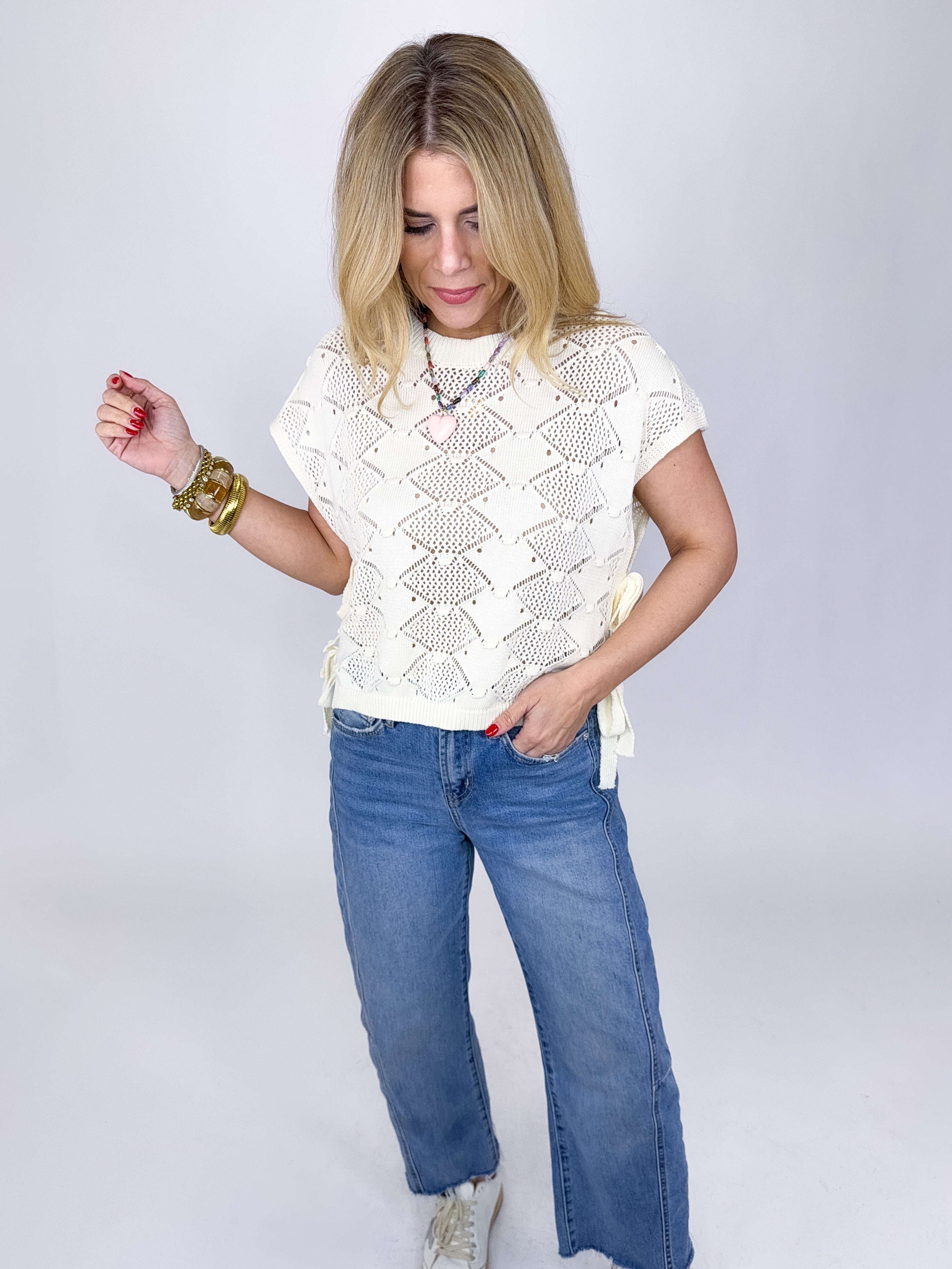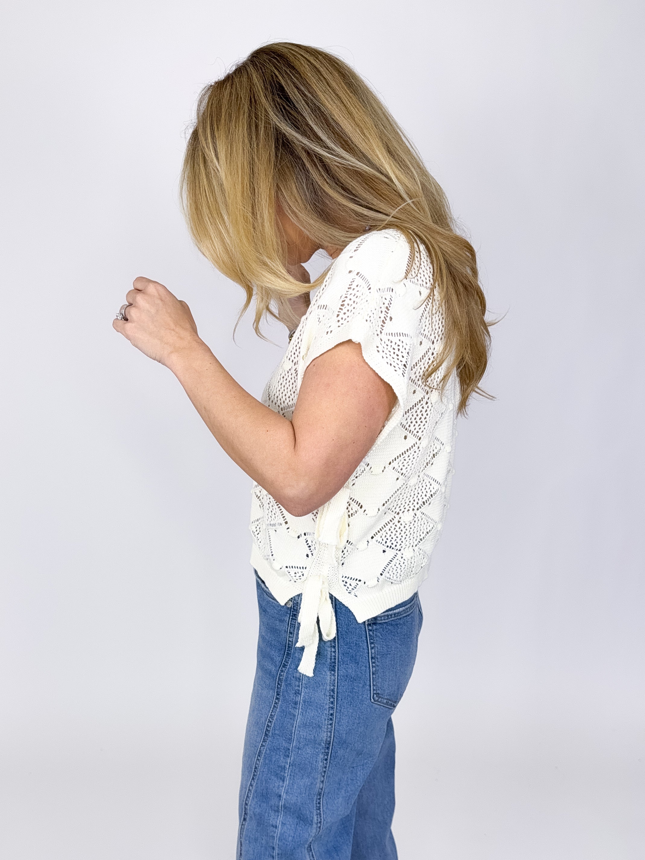 The Claire Sweater in cream is such a fun Spring crochet knit! This lightweight sweater features a crew neck, beautiful crochet knit pattern, short sleeves and side ties. Pair with denim, skirts, shorts and more. Fits true to size.