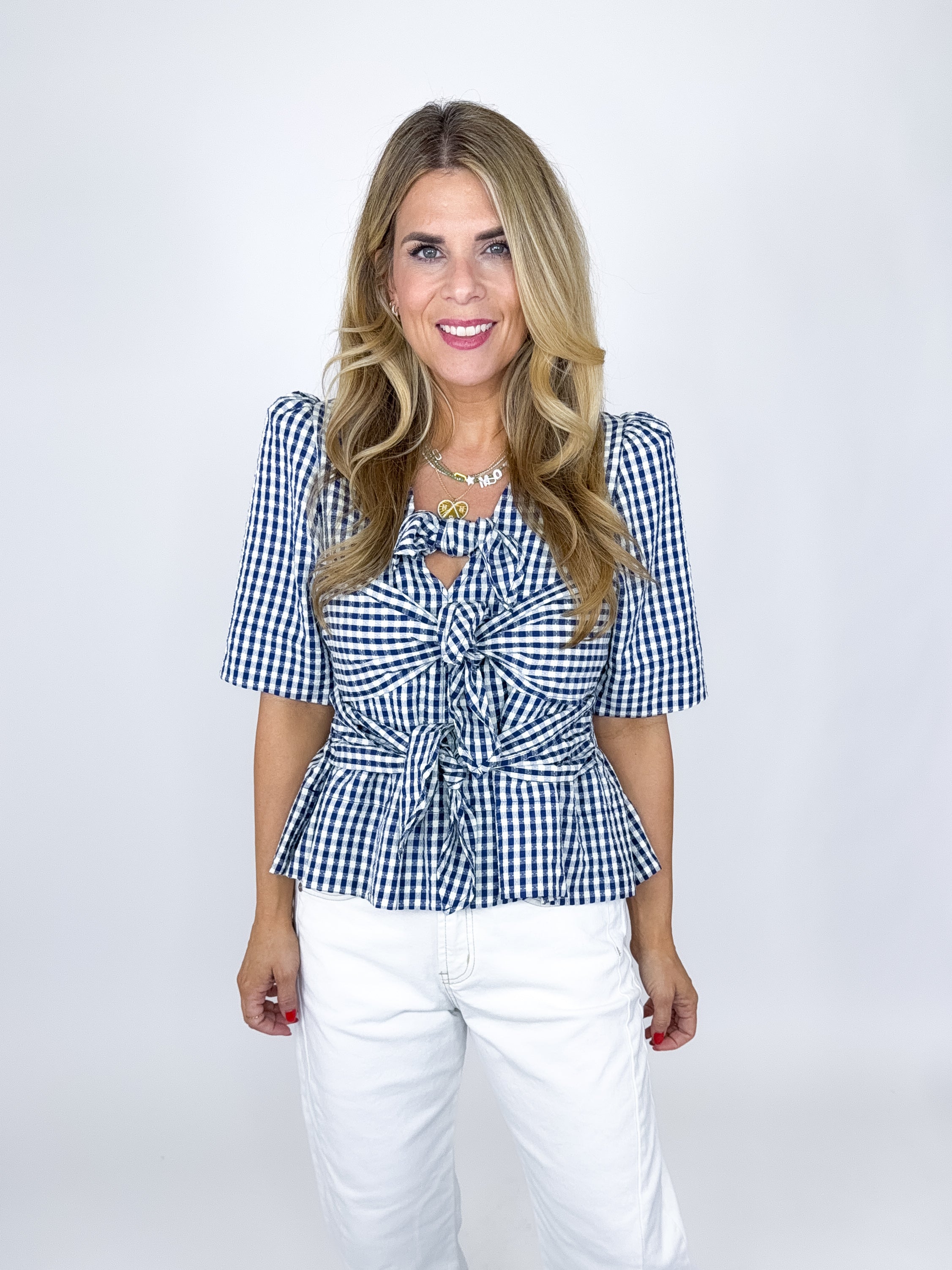 The Dakota Top is gorgeous! This navy gingham print blouse features short puff sleeves, 3 bow ie front closures and a peplum hem. Pairs well with everything from denim, flats, heels, dress pants, skirts and more! Fits true to size.