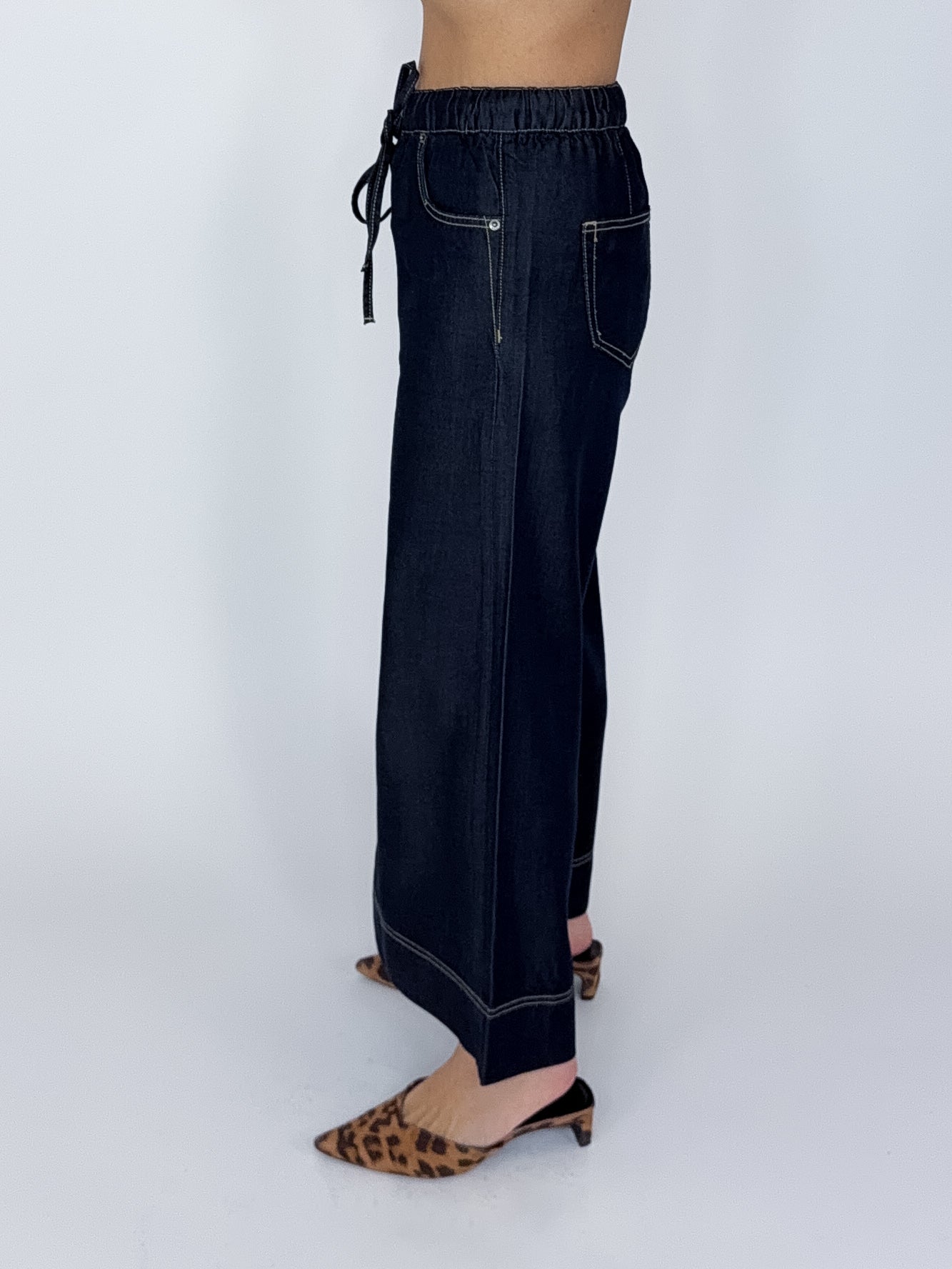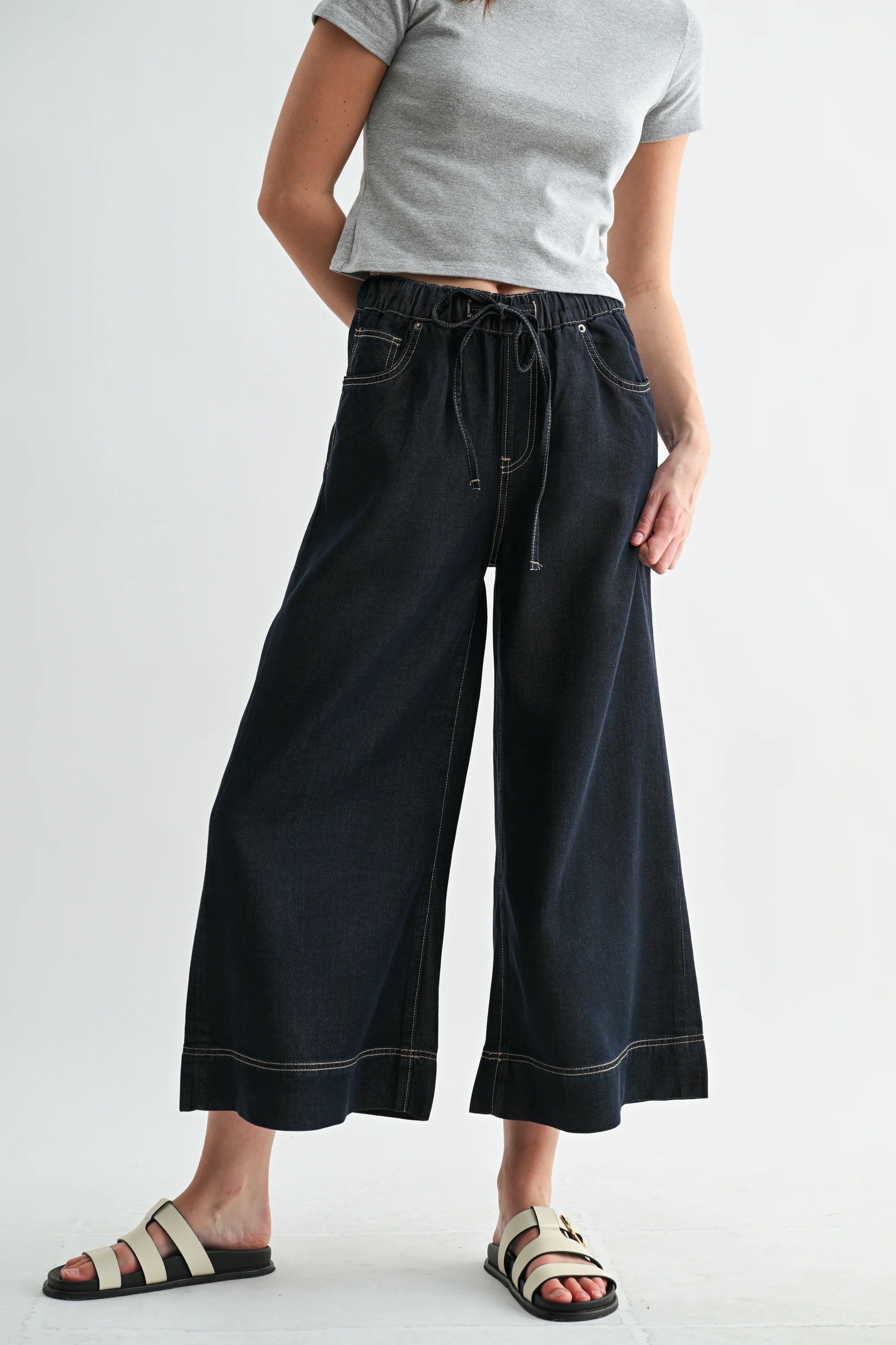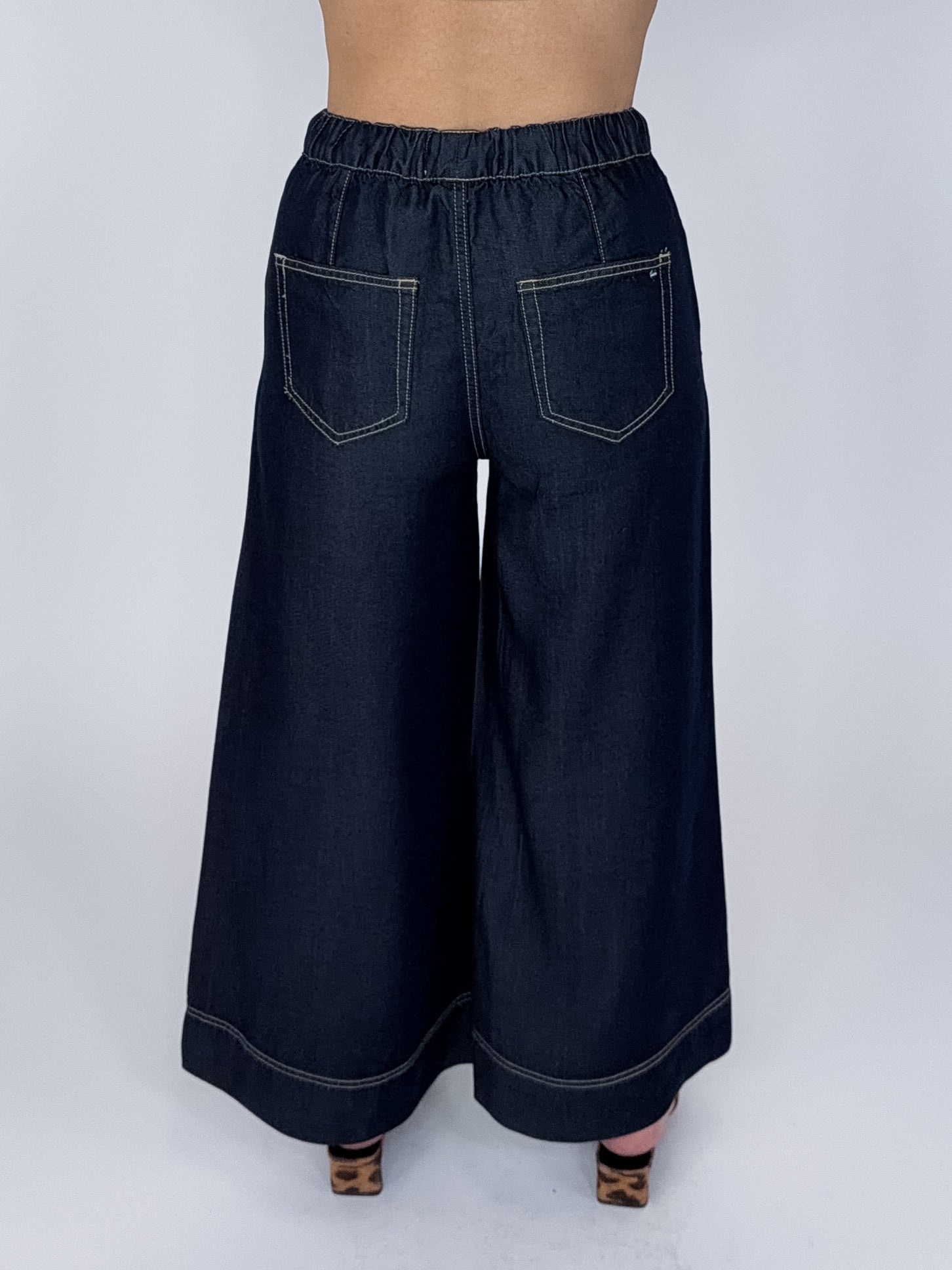 Our Dani Jeans are a high rise, 5 pocket, dark wash, wide leg pull on ankle jean, elastic waist with a drawstring. Style with everything from your favorite tee and sneakers to a fun blouse and heels!