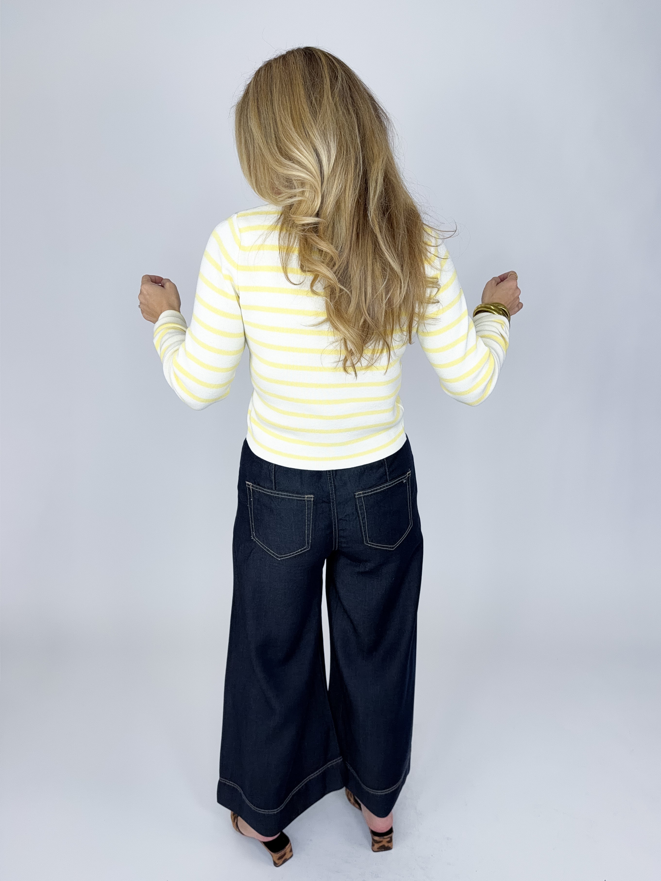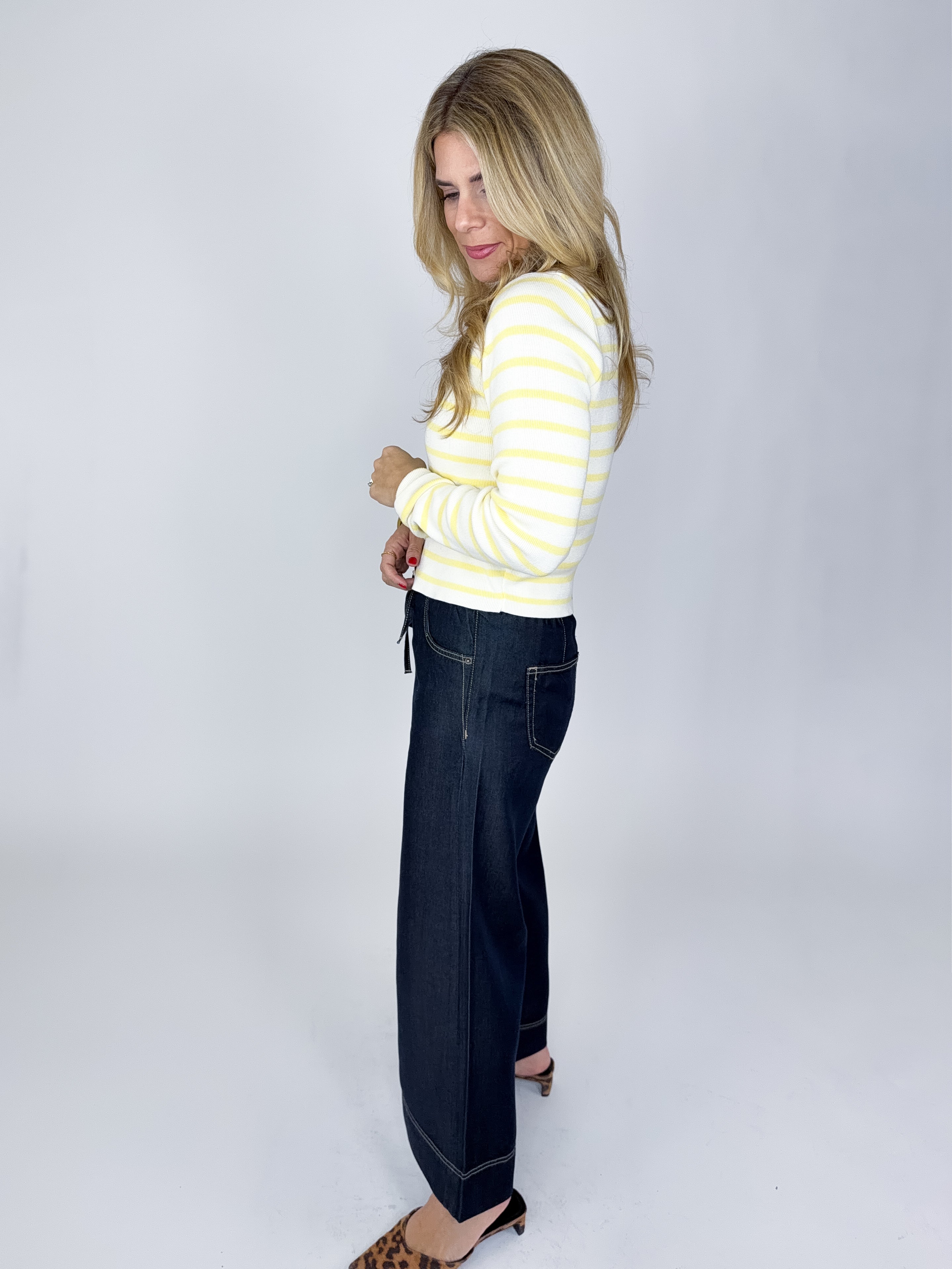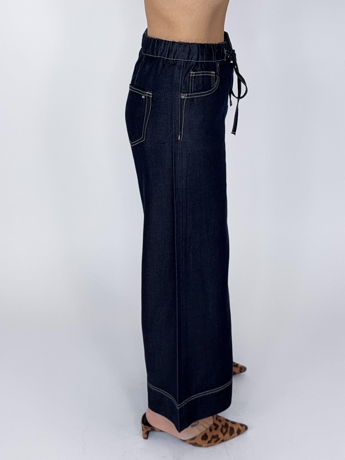 Our Dani Jeans are a high rise, 5 pocket, dark wash, wide leg pull on ankle jean, elastic waist with a drawstring. Style with everything from your favorite tee and sneakers to a fun blouse and heels!