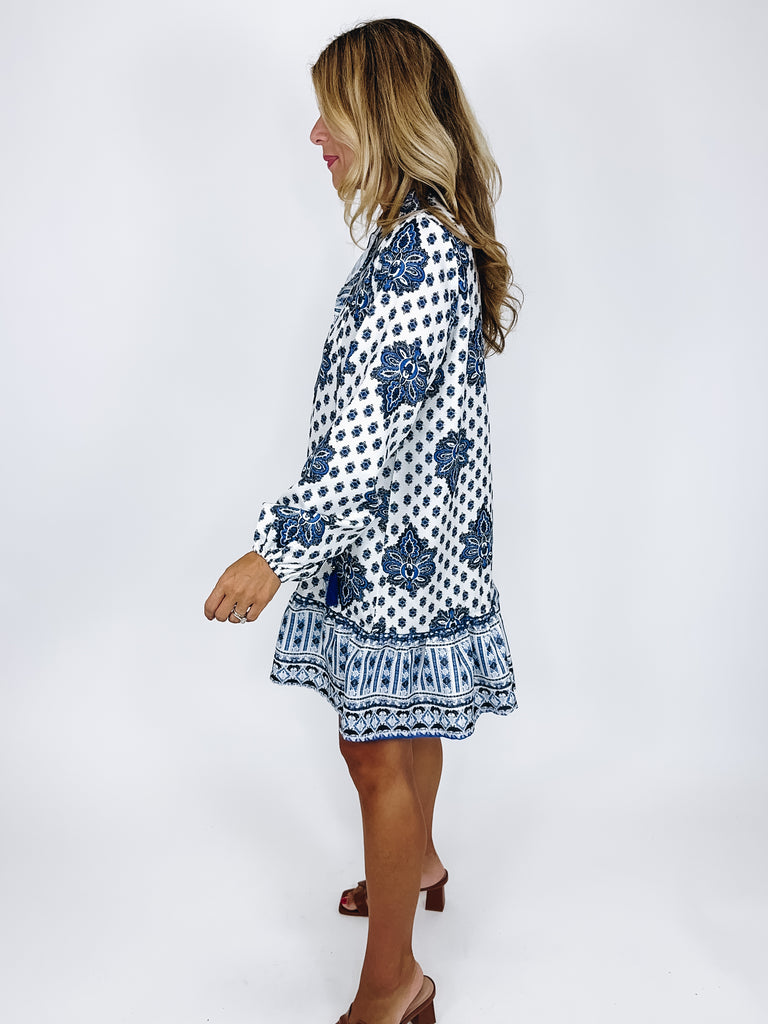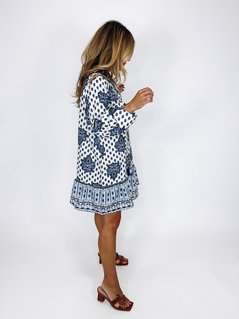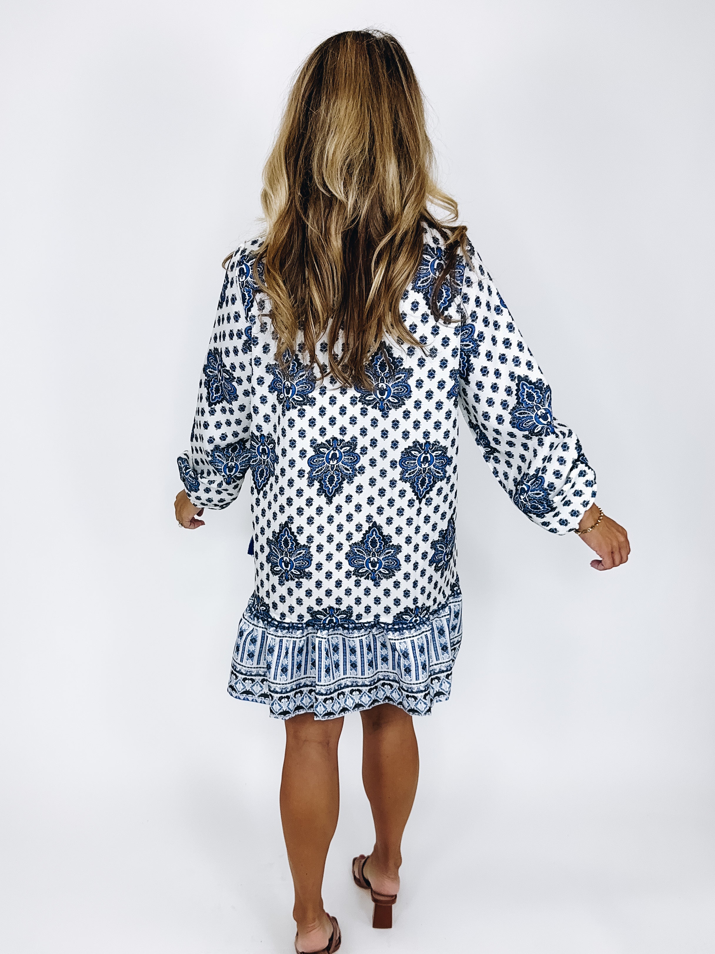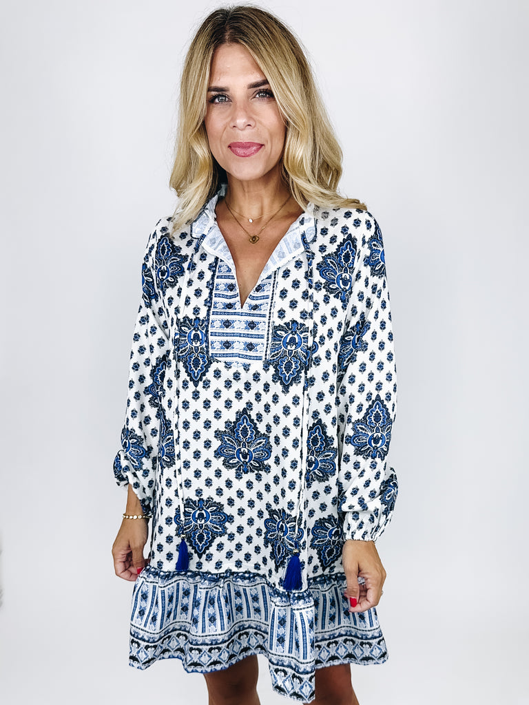 The Demi Dress is a showstopper! This blue and white print midi dress features a  V-neckline with a tie, long sleeves, and a coordinating print tier hem. Style with flats, heels, wedges or sneakers. Fits true to size.