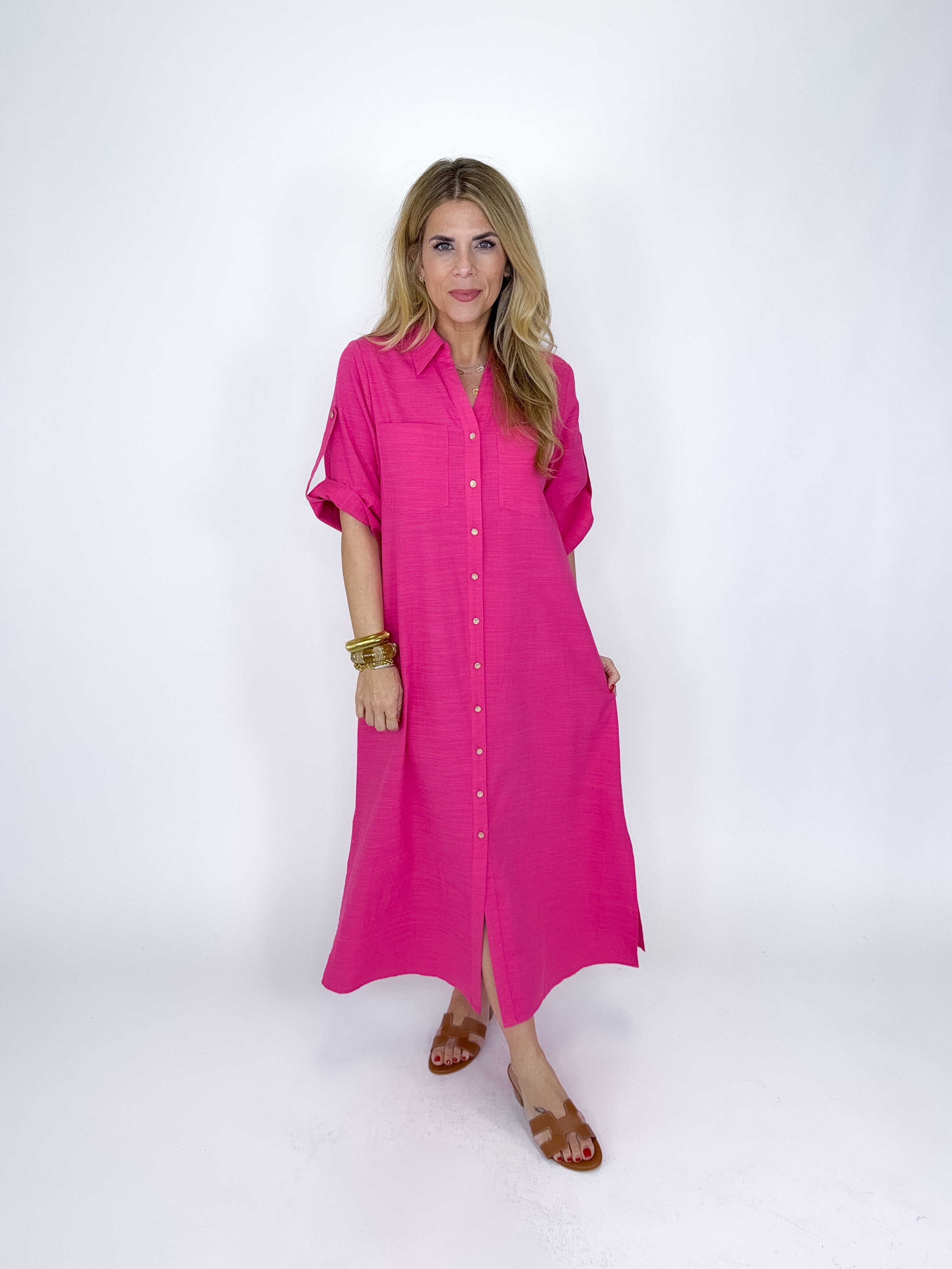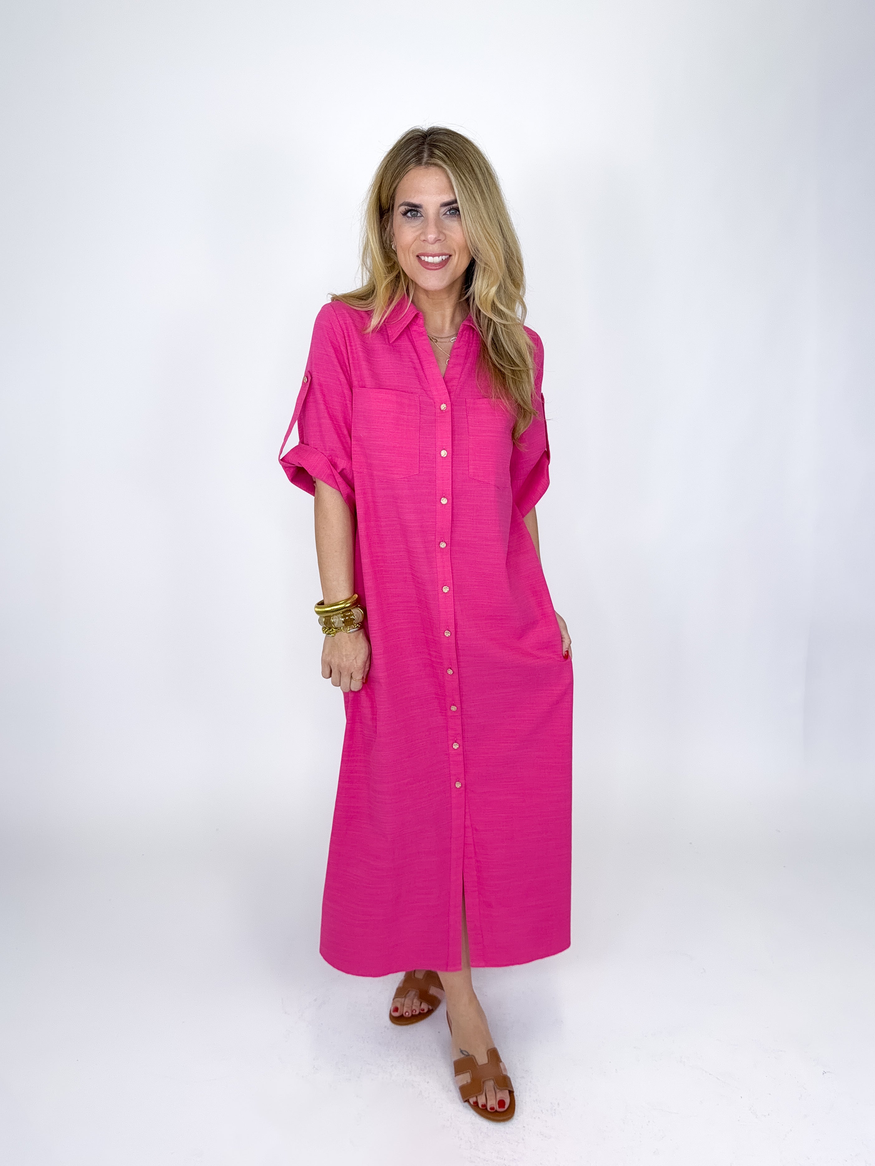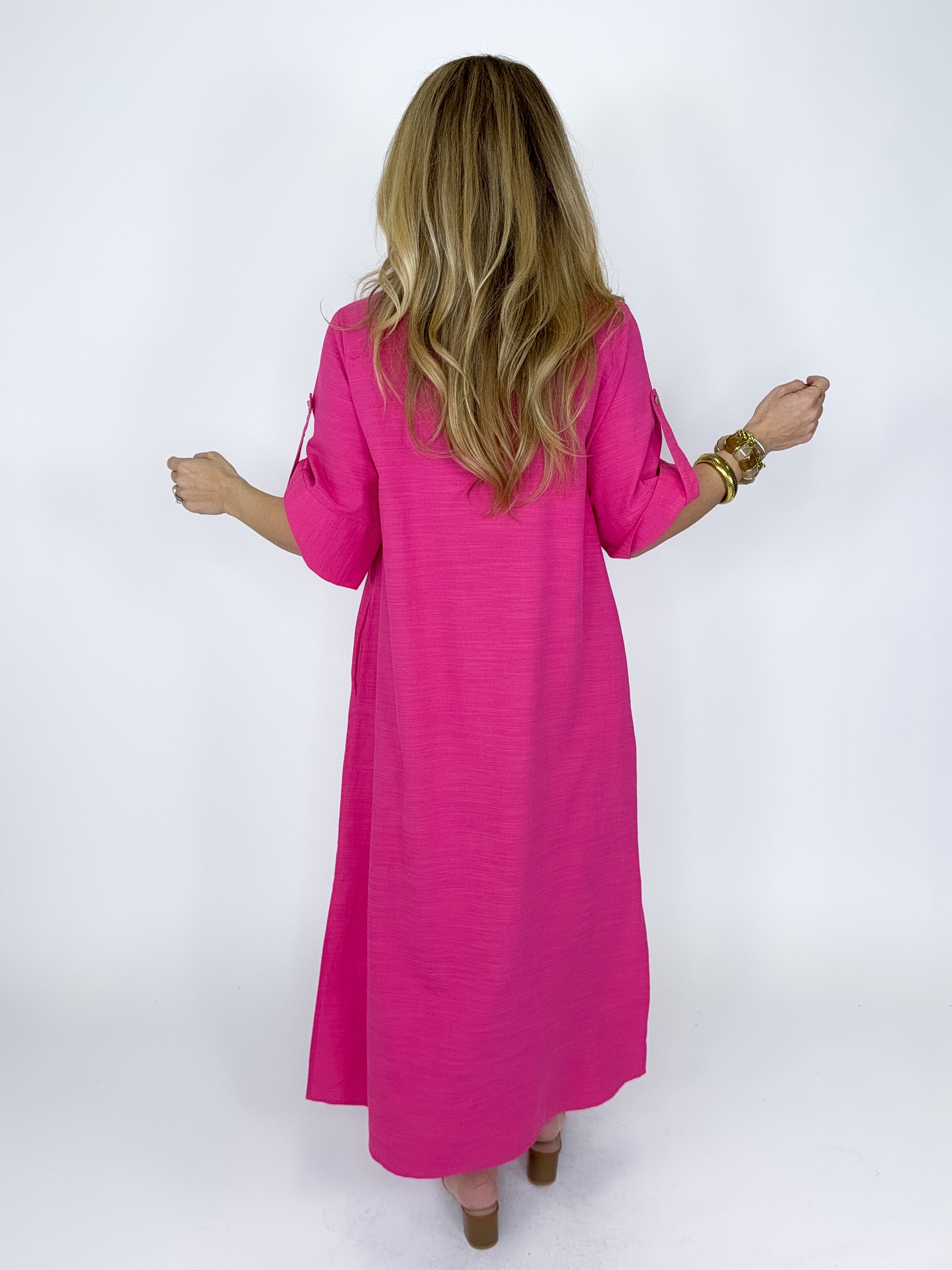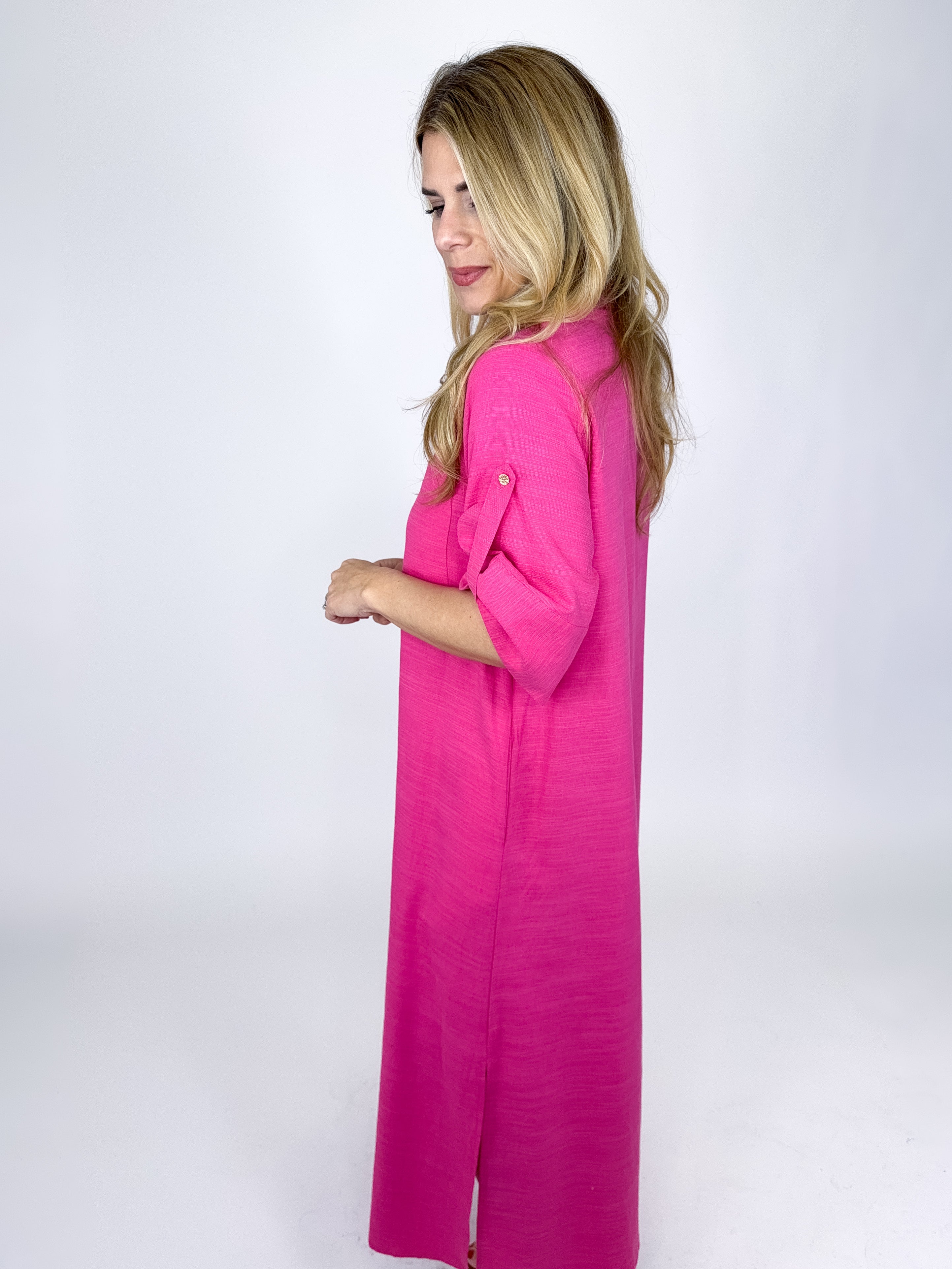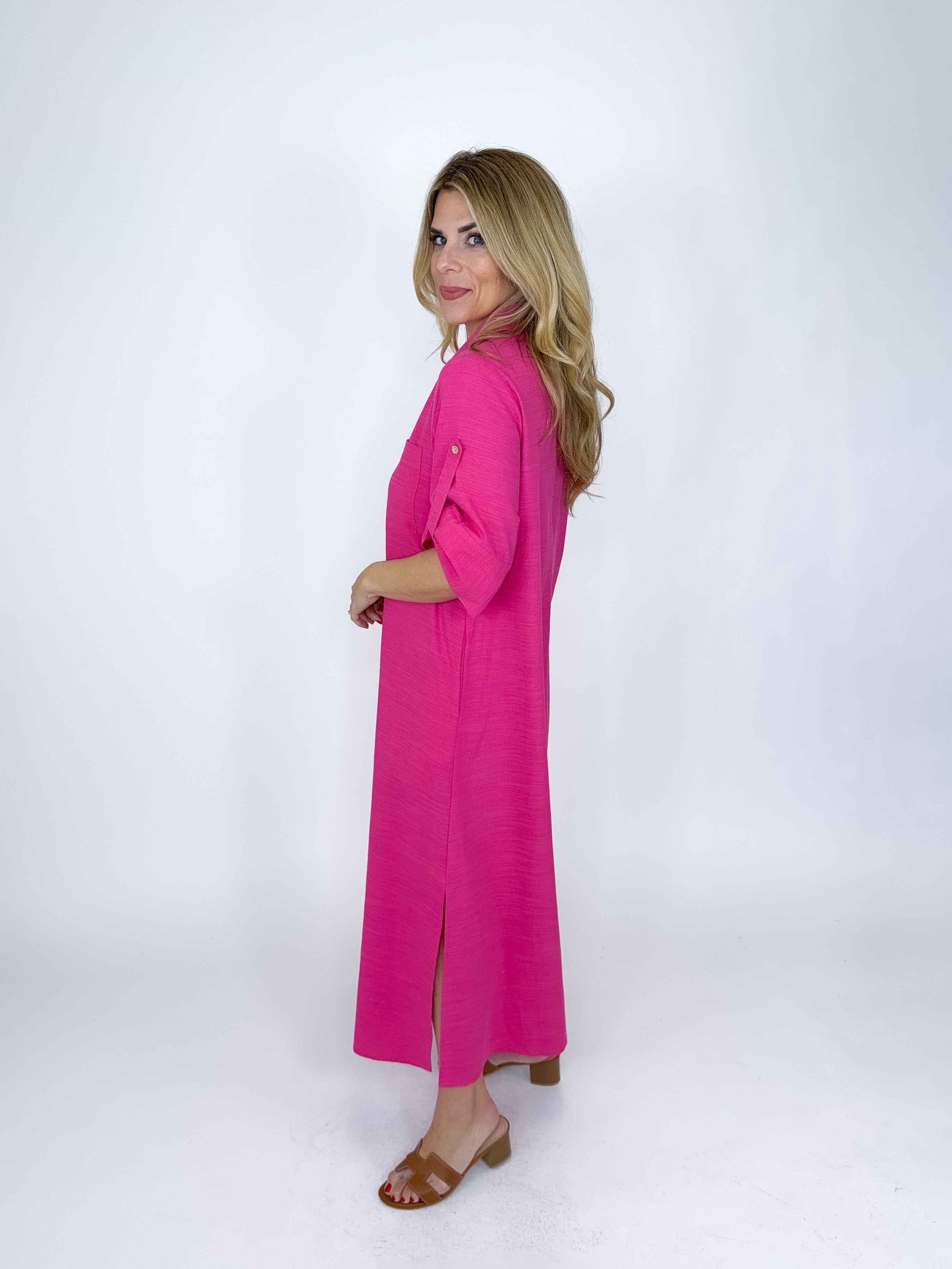 The Eleanor Dress is a must have. This hot pink maxi dress features short sleeves with a strap detail, v- neck with a collar, front bust pockets, gold vintage button front and an easy fit roomy silhouette. Pockets. Style with flats, heels, wedges, boots and sneakers! Fits true to size.