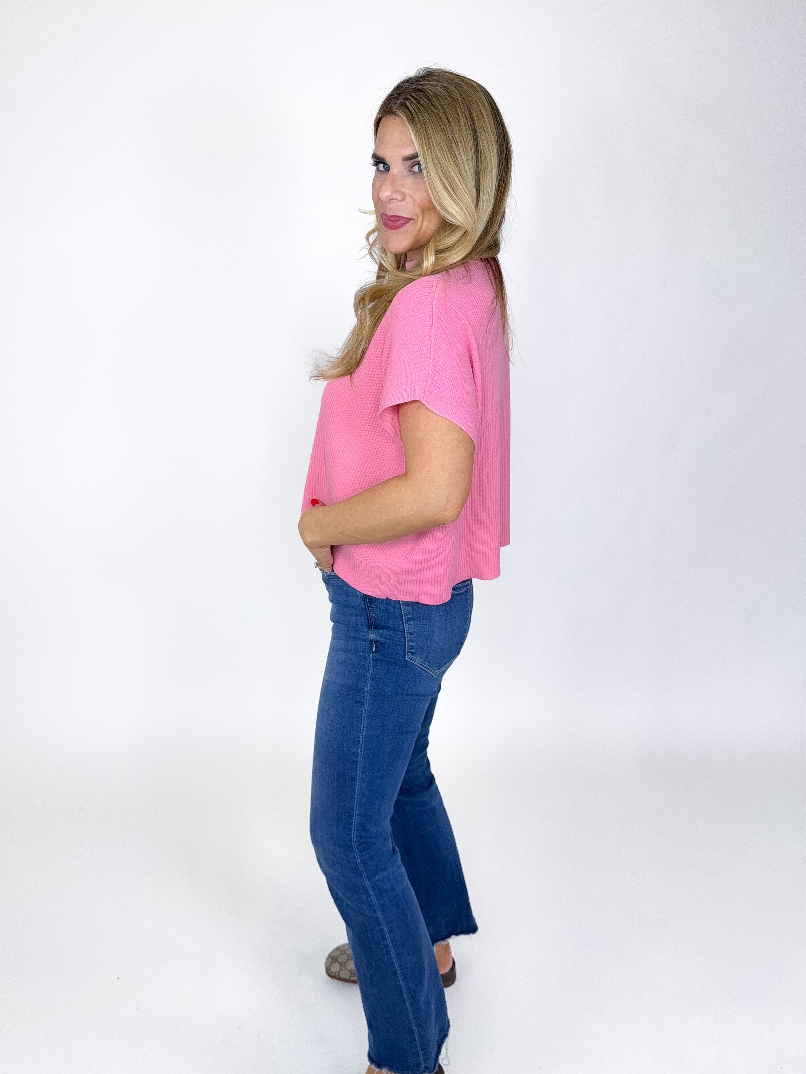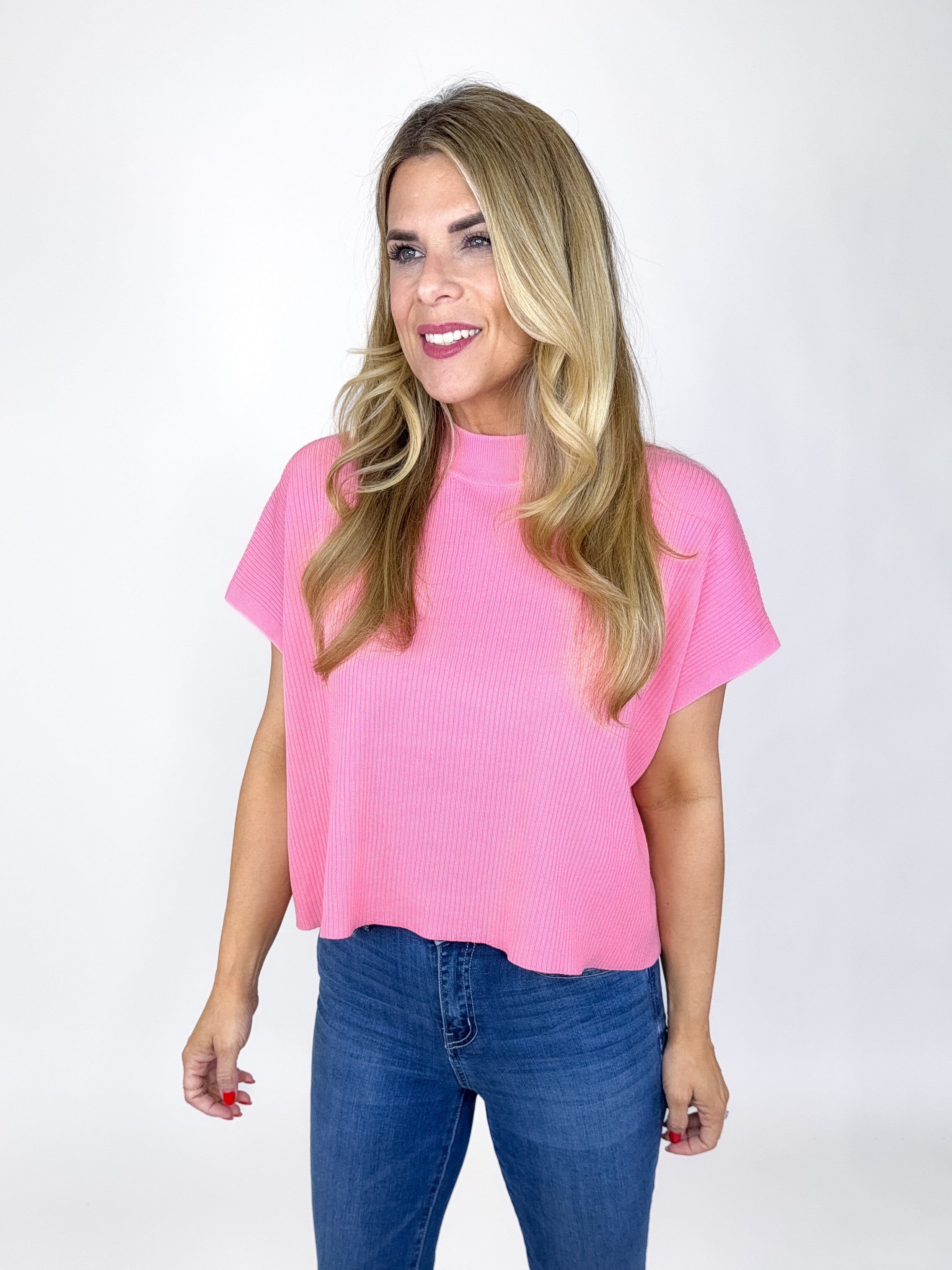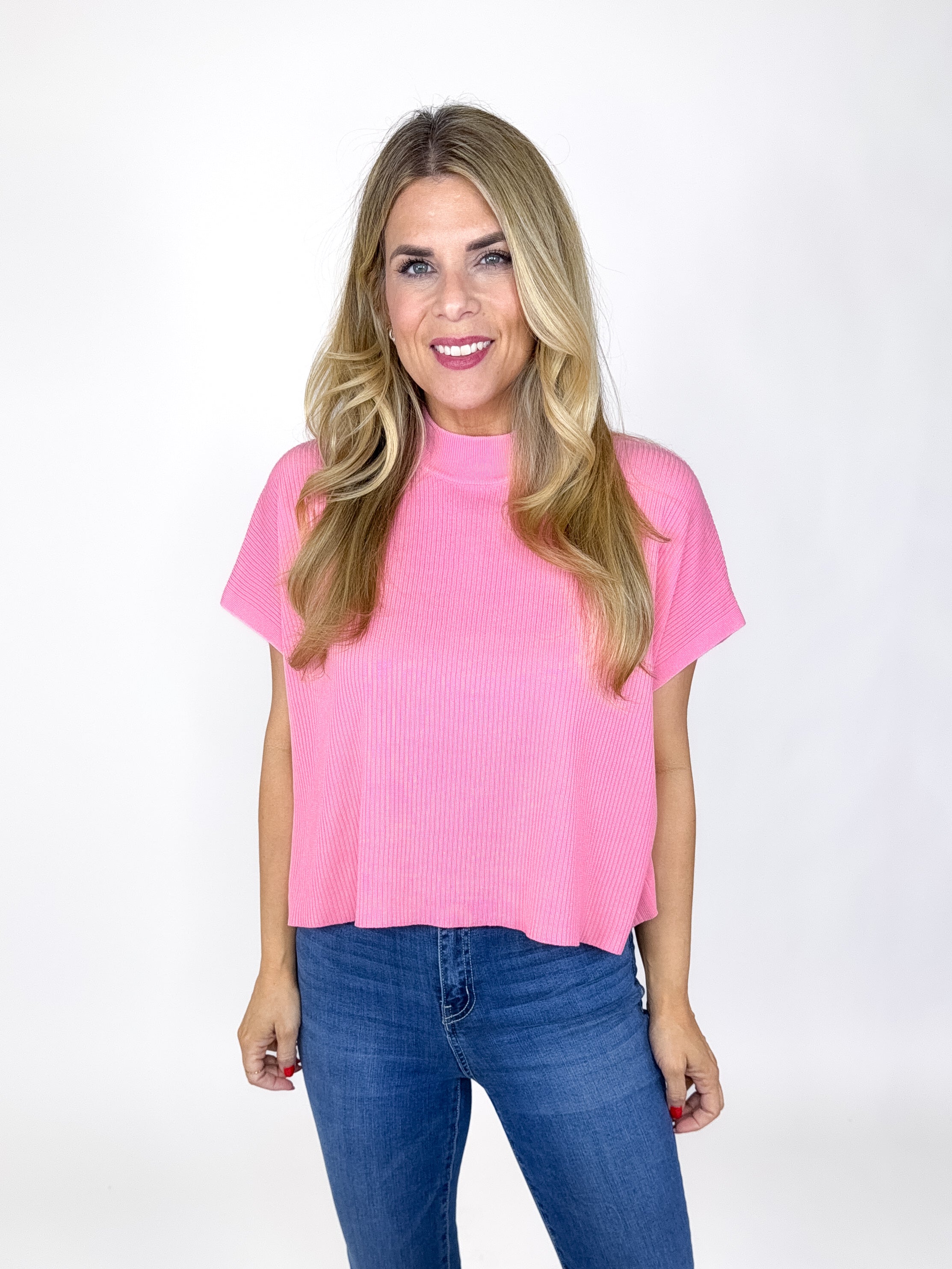 Our Eliza Top is a must have! This pink colored knit top features a mock neck, short sleeves and a boxy skimmer fit. Style with denim, shorts, dress pants and leggings. Dress it up or down.
